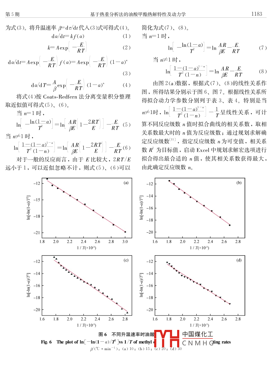 石油學報(石油加工2015年10月ACTA PETROLEI SINICA (PETROLEUM PROCESSING SECTION第31卷第5期文章編號:1001-8719(2015)5-1179-0基于熱重分析法的油酸甲酯熱解特性及動力學王學春2,方建華,陳波水,王九,吳江(1.后勤工程學院軍事油料應用與管理工程系,重慶401311;2.武警杭州士官學校車輛維修系,浙江杭州310007)摘要:釆用熱重分析儀硏究了油酸甲酯和硬脂酸甲酯的熱解特性,獲得了油酸甲酯在不同升溫速率(10、15、2030℃/min-)下的 TG-DTG、DsC曲線,并通過熱分析數(shù)學方法獲得熱解動力學擬合參數(shù)。結果表明,油酸甲酯的熱解過程為簡單的一步分解,相比硬脂酸甲酯具有較差的熱安定性;提高升溫速率,熱解區(qū)間往高溫區(qū)移動,熱解活化能和指前因子具有較好的補償效應;油酸甲酯在不同升溫速率下具有不同的熱解反應機理函數(shù)關鍵詞:油酸甲酯;熱重分析;熱解;動力學中圖分類號:TQ050.4文獻標識碼:Adoi:10.3969小isn.1001-8719.2015.05.022Pyrolysis Characteristics and Kinetics of Methyl Oleate Based on Thermo-Gravimetric AnalysisWANG Xuechun", FANG Jianhua, ChEN BoShui, WANG Jiu, wU Jiang(1. Department of Military Oil Appla diaversagoing 401311, China2.Hu NCO Academy of CA PF. Hangzhou 310007, ChiAbstract: Pyrolysis characteristics of methyl oleate and methyl stearate were conducted in thermgravimetric analyzer to obtain their TG-DTG and DSC curves at different hating rates (10, 15, 2030C/min). Pyrolysis kinetic fittirmethodology. The results showed that py rolysis of methyl oleate was a simple one-stepdecomposition, w hich had a relatively worse stability of pyrolysis, compared with methyl stearateThe main pyrolysis region of methyl oleate shifted to the higher temperature,w hen hating rate wasraised. Moreover, the pyrolysis activation energy and pre-ex ponential factor presented a goodcompensation effect, which also indicated that the py roly sis reaction mechanism function wasdifferent at different heating ratesKey words: methyl oleate; thermo-gravimetric analy sis pyrolysis; kinetics能源消耗量日益増加以及礦物燃料的日趨枯竭,飽和脂肪酸甲酯組成,是多種脂肪酸甲酯的混合物,迫切要求快速發(fā)展新型石油替代能源。生物柴油作其脂肪酸碳鏈通常含有14-18個碳原子;從分子結為一種新型能源,具有清潔、儲量大、可再生和環(huán)構看,生物柴油一般為直鏈分子,除少量飽和脂肪境友好的特點,且具有與石化柴油相近的燃料特性,酸甲酯之外,一般含有1個以上的雙鍵。生物柴油已受到世界各國的普遍關注。從化學組成看,生分子中含有大量的不飽和脂鏈,在高溫下很容易發(fā)物柴油一般由油酸甲酯、亞油酸甲酯、亞麻酸甲酯生熱裂解反應,其裂解小分子產物可誘導發(fā)動機油等不飽和脂肪酸甲酯和軟脂酸甲酯、硬脂酸甲酯等變質中國煤化工、腐蝕性增大、清凈CNMHG收稿日期:2014-05-26基金項目:國家自然科學基金項目(51375491)、重慶市自然科學基金(CSTC,2014 JCYJAA50021)和院創(chuàng)新基金資助項目(YZ13-43703)資助第一作者:王學春,男,碩士硏究生,從事環(huán)境友好潤滑劑及添加劑的硏究通訊聯(lián)系人:方建華,男,教授,博士,主要從事環(huán)境友好潤滑劑及添加劑的研究;F-mal:fangjianhua7123asina.com石油學報(石油加工)第31卷分散性變差,甚至引起燃料系統(tǒng)結膠、過濾器和噴產SDTρ60綜合熱重分析儀對油酸甲酯和硬脂酸油嘴堵塞等問題,因此,研究不飽和脂肪酸甲酯的甲酯進行熱重分析(TG-DSC)。在50mL/min的高熱解特性,對生物柴油的應用具有重要的指導意義。純N2保護下,從室溫以不同速率升溫至600℃,樣目前,已有關于柴油發(fā)動機燃用生物柴油導致品質量5~7mg的發(fā)動機潤滑油性能衰變問題的研究3,但大多局限于從宏觀上描述生物柴油引起的發(fā)動機油常規(guī)理2結果與討論化指標和性能變化,缺乏從單脂肪酸甲酯結構方面2.1油酸甲酯和硬脂酸甲酯熱解特性深入研究其熱解衰變的化學本質。因此,研究生物圖1為硬脂酸甲酯和油酸甲酯在升溫速率(β)柴油中主要不飽和組分的熱解動力學,可以為整個10°℃/min、50mL/minN2氣氛下熱解的TG-DTG、生物柴油的動力學研究提供基于單脂肪酸甲酯熱解DSC曲線,它們的熱重特性參數(shù)列于表1的特性參數(shù),以建立動力學模型或判據(jù)。在本研究由圖1可見,硬脂酸甲酯DTG曲線上的1個峰中,利用熱重分析儀分析油酸甲酯和硬脂酸甲酯的(起始溫度218.88℃,峰值溫度261.12℃)與TG曲熱降解特性,并進行比較,同時在不同升溫速率下線上的1個失重臺階相對應,同時也和DSC曲線上考察油酸甲酯的熱降解特征值;通過 Coats- Redfern的第2個吸熱峰(起始溫度203.65℃,峰值溫度積分法分析油酸甲酯熱解動力學,確定了反映266.53℃)相對應。至于DSC曲線上的第1個吸熱峰其熱解歷程的反應動力學參數(shù)(起始溫度31.91℃,峰值溫度37.99℃)由硬脂酸甲1實驗部分酯的熔融引起,因為硬脂酸甲酯在38℃左右發(fā)生了相變(硬脂酸甲酯的熔點為38℃)。由此可知,在1.1油樣600℃以下硬脂酸甲酯僅發(fā)生簡單的一步熱分解過程油酸甲酯、硬脂酸甲酯均為分析純試劑。同硬脂酸甲酯相似,油酸甲酯的DTG曲線上只有1.2實驗方法1個相當大的失重峰(起始溫度210.58℃,峰值溫度采用美國范德比爾特公司和日本東京旭日公司248.95℃),與TG曲線上只有1個失重臺階相對應。(a)0DTG&80F DTGDSCDSO266.53℃10三工2-1.526l.12℃249.63℃254.36℃100200300400500600-1.510020030040000600圖1硬脂酸甲酯和油酸甲酯在N2氣氛下的 TG-DTG和DSC曲線Fig 1 TG-DTG and dsc curve