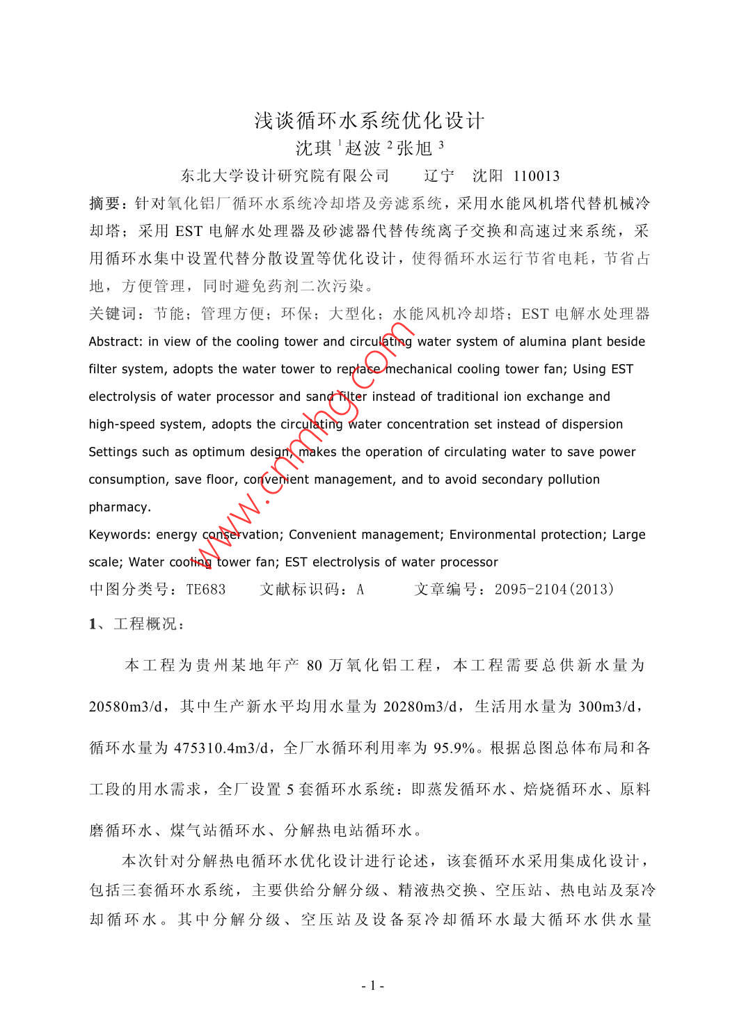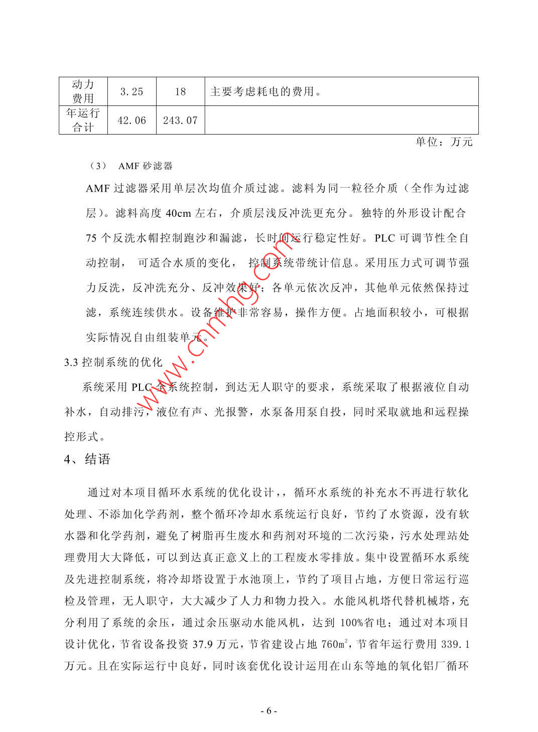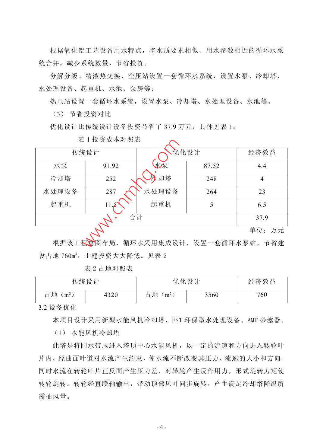 淺談循環(huán)水系統(tǒng)優(yōu)化設(shè)計沈琪趙波2張旭3東北大學(xué)設(shè)計研究院有限公司遼寧沈陽110013摘要:針對氧化鋁廠循環(huán)水系統(tǒng)冷卻塔及旁濾系統(tǒng),采用水能風(fēng)杋塔代替機械冷卻塔;采用EST電解水處理器及砂濾器代替?zhèn)鹘y(tǒng)離子交換和高速過來系統(tǒng),采用循環(huán)水集中設(shè)置代替分散設(shè)置等優(yōu)化設(shè)計,使得循環(huán)水運行節(jié)省電耗,節(jié)省占地,方便管理,同時避免藥劑二次污染關(guān)鍵詞:節(jié)能;管理方便;環(huán)保;大型化;水能風(fēng)機冷卻塔;EST電解水處理器Abstract: in view of the cooling tower and circulating water system of alumina plant besidefilter system adopts the water tower to replace mechanical cooling tower fan; Using ESTelectrolysis of water processor and sand filter instead of traditional ion exchange andhigh-speed system adopts the circulating water concentration set instead of dispersionSettings such as optimum design makes the operation of circulating water to save powerconsumption, save floor, convenient management and to avoid secondary pollutionpharmacyKeywords: energy conservation; Convenient management; Environmental protection; Largescale; Water cooling tower fan; Est electrolysis of water processor中圖分類號:TE683文獻標(biāo)識碼:A文章編號:2095-2104(2013)1、工程概況:本工程為貴州某地年產(chǎn)80萬氧化鋁工程,本工程需要總供新水量為20580m3/d,其中生產(chǎn)新水平均用水量為20280m3/d,生活用水量為300m3/d,循環(huán)水量為475310.4m3/d,全廠水循環(huán)利用率為95.9%。根據(jù)總圖總體布局和各工段的用水需求,全廠設(shè)置5套循環(huán)水系統(tǒng):即蒸發(fā)循環(huán)水、焙燒循環(huán)水、原料磨循環(huán)水、煤氣站循環(huán)水、分解熱電站循環(huán)水。本次針對分解熱電循環(huán)水優(yōu)化設(shè)計進行論述,該套循環(huán)水采用集成化設(shè)計,包括三套循環(huán)水系統(tǒng),主要供給分解分級、精液熱交換、空壓站、熱電站及泵冷卻循環(huán)水。其中分解分級、空壓站及設(shè)備泵冷卻循環(huán)水最大循環(huán)水供水量4100m3/h,供水溫度35°C,供回溫差15°C,壓力回水;熱電站循環(huán)水供水量1550m3/h,供水溫度35°C,供回溫差10°C;精液熱交換循環(huán)水供水量1200m3/h,供水溫度35°C,供回溫差15°C,壓力回水。2、工藝流程工藝流程如圖1所示,分解寬流道板式換熱器冷卻循環(huán)回水、綜合過濾精液板式換熱器冷卻循環(huán)冷卻回水及空壓站壓縮空氣機循環(huán)冷卻回水,通過分水器恒壓后通過冷卻塔冷卻,將水溫為50C循環(huán)水冷卻至35℃C后進入冷水池,再經(jīng)循環(huán)水水泵加壓送至用水點;其中,綜合過濾板式換熱器冷卻循環(huán)回水需經(jīng)減壓后進如分水器恒壓上塔,且在循環(huán)給水系統(tǒng)中,綜合過濾板式換熱器由于供水壓力為0.MPa,故單獨設(shè)置兩臺供水泵一用一備,分解寬流道板式換熱器冷卻水和壓縮空氣機冷卻水共用3臺水泵,二用一備,由于分解根據(jù)不同的氣候,用水量變化,故電機采用變頻電機;熱電站循環(huán)水通過余壓直接上塔,循環(huán)回水經(jīng)冷卻塔將水溫從45循環(huán)水冷卻至35C后進入冷水池,系統(tǒng)配置4臺冷水泵加壓后送至熱電站主廠房,三用一備;為了改善循環(huán)水水質(zhì),特設(shè)兩臺旁濾水泵,一用備王王:.觀50圖3、布置方式、設(shè)備選型及控制系統(tǒng)的優(yōu)化3.1布置方式優(yōu)化(1)傳統(tǒng)設(shè)計分解分級、精液熱交換設(shè)置一套循環(huán)水系統(tǒng),設(shè)置水泵、冷卻塔、水處理設(shè)備、起重機、水池、泵房等;空壓站設(shè)置一套循環(huán)水系統(tǒng),設(shè)置水泵、冷卻塔、水處理設(shè)備、起重機、水池、泵房等;熱電站設(shè)置一套循環(huán)水系統(tǒng),設(shè)置水泵、冷卻塔、水處理設(shè)備、起重機、水池、泵房等。(2)優(yōu)化設(shè)計根據(jù)氧化鋁工藝設(shè)備用水特點,將水質(zhì)要求相似、用水參數(shù)相近的循環(huán)水系統(tǒng)合并,減少系統(tǒng)數(shù)量,節(jié)省投資。分解分級、精液熱交換、空壓站設(shè)置一套循環(huán)水系統(tǒng),設(shè)置水泵、冷卻塔水處理設(shè)備、起重機、水池、泵房等;熱電站設(shè)置一套循環(huán)水系統(tǒng),設(shè)置水泵、冷卻塔、水處理設(shè)備、水池等(3)節(jié)省投資對比優(yōu)化設(shè)計比傳統(tǒng)設(shè)計設(shè)備投資節(jié)省了37.9萬元,具體見表1表1投資成本對照表傳統(tǒng)設(shè)計優(yōu)化設(shè)計經(jīng)濟效益水泵91.92水泵87.524.4冷卻塔252冷卻塔248水處理設(shè)備287水處理設(shè)備26423起重機11.5起重機6.5合計37.9單位:萬元根據(jù)該工程總圖布局,循環(huán)水采用集成設(shè)計,設(shè)置一套循環(huán)水泵站,節(jié)省建設(shè)占地760m2,土建投資大大降低。見表2表2占地對照表傳統(tǒng)設(shè)計優(yōu)化設(shè)計經(jīng)濟效益地4320占地(m2)35607603.2設(shè)備優(yōu)化本項目設(shè)計采用新型水能風(fēng)機冷卻塔、EST環(huán)保型水處理設(shè)備、AMF砂濾器。(1)水能風(fēng)機冷卻塔此塔是將回水帶壓進入塔頂中心水能風(fēng)機,以一定的流速和方向進入轉(zhuǎn)輪葉片內(nèi),經(jīng)曲面葉道對水流產(chǎn)生約束,使水流不斷改變其壓力、流速的大小和方向,同時水流在轉(zhuǎn)輪葉片正反面產(chǎn)生壓力差,對