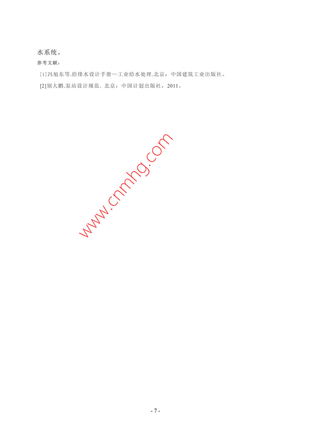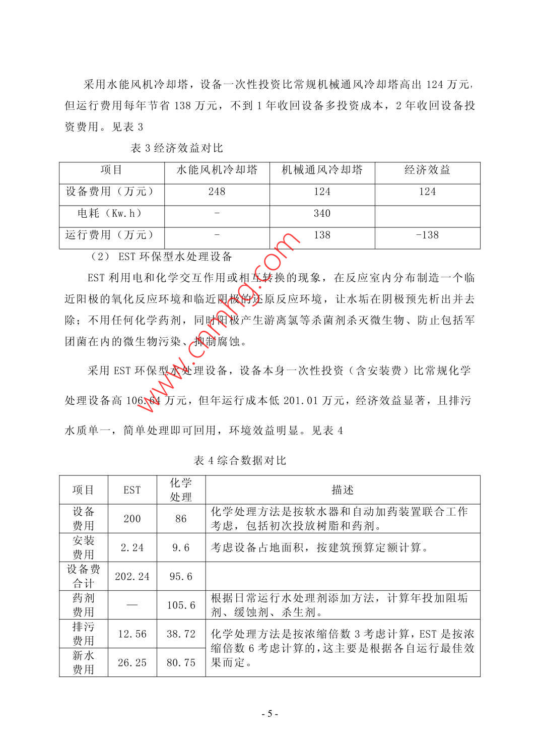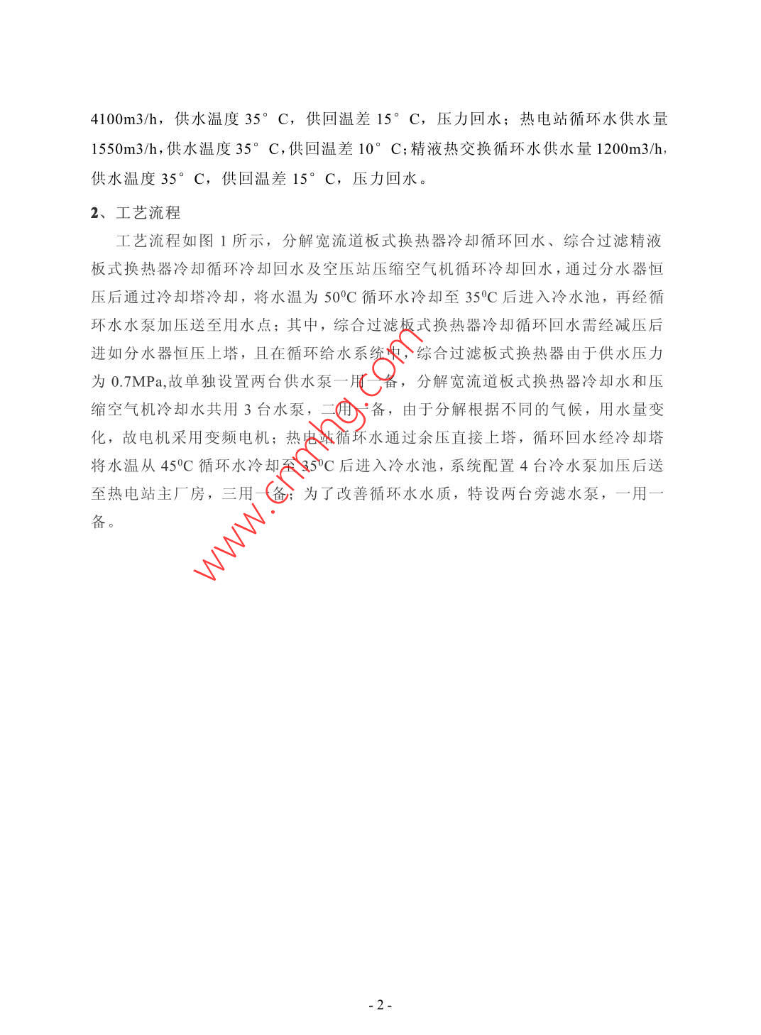 淺談循環(huán)水系統(tǒng)優(yōu)化設(shè)計沈琪趙波2張旭3東北大學(xué)設(shè)計研究院有限公司遼寧沈陽110013摘要:針對氧化鋁廠循環(huán)水系統(tǒng)冷卻塔及旁濾系統(tǒng),采用水能風(fēng)杋塔代替機械冷卻塔;采用EST電解水處理器及砂濾器代替?zhèn)鹘y(tǒng)離子交換和高速過來系統(tǒng),采用循環(huán)水集中設(shè)置代替分散設(shè)置等優(yōu)化設(shè)計,使得循環(huán)水運行節(jié)省電耗,節(jié)省占地,方便管理,同時避免藥劑二次污染關(guān)鍵詞:節(jié)能;管理方便;環(huán)保;大型化;水能風(fēng)機冷卻塔;EST電解水處理器Abstract: in view of the cooling tower and circulating water system of alumina plant besidefilter system adopts the water tower to replace mechanical cooling tower fan; Using ESTelectrolysis of water processor and sand filter instead of traditional ion exchange andhigh-speed system adopts the circulating water concentration set instead of dispersionSettings such as optimum design makes the operation of circulating water to save powerconsumption, save floor, convenient management and to avoid secondary pollutionpharmacyKeywords: energy conservation; Convenient management; Environmental protection; Largescale; Water cooling tower fan; Est electrolysis of water processor中圖分類號:TE683文獻標(biāo)識碼:A文章編號:2095-2104(2013)1、工程概況:本工程為貴州某地年產(chǎn)80萬氧化鋁工程,本工程需要總供新水量為20580m3/d,其中生產(chǎn)新水平均用水量為20280m3/d,生活用水量為300m3/d,循環(huán)水量為475310.4m3/d,全廠水循環(huán)利用率為95.9%。根據(jù)總圖總體布局和各工段的用水需求,全廠設(shè)置5套循環(huán)水系統(tǒng):即蒸發(fā)循環(huán)水、焙燒循環(huán)水、原料磨循環(huán)水、煤氣站循環(huán)水、分解熱電站循環(huán)水。本次針對分解熱電循環(huán)水優(yōu)化設(shè)計進行論述,該套循環(huán)水采用集成化設(shè)計,包括三套循環(huán)水系統(tǒng),主要供給分解分級、精液熱交換、空壓站、熱電站及泵冷卻循環(huán)水。其中分解分級、空壓站及設(shè)備泵冷卻循環(huán)水最大循環(huán)水供水量4100m3/h,供水溫度35°C,供回溫差15°C,壓力回水;熱電站循環(huán)水供水量1550m3/h,供水溫度35°C,供回溫差10°C;精液熱交換循環(huán)水供水量1200m3/h,供水溫度35°C,供回溫差15°C,壓力回水。2、工藝流程工藝流程如圖1所示,分解寬流道板式換熱器冷卻循環(huán)回水、綜合過濾精液板式換熱器冷卻循環(huán)冷卻回水及空壓站壓縮空氣機循環(huán)冷卻回水,通過分水器恒壓后通過冷卻塔冷卻,將水溫為50C循環(huán)水冷卻至35℃C后進入冷水池,再經(jīng)循環(huán)水水泵加壓送至用水點;其中,綜合過濾板式換熱器冷卻循環(huán)回水需經(jīng)減壓后進如分水器恒壓上塔,且在循環(huán)給水系統(tǒng)中,綜合過濾板式換熱器由于供水壓力為0.MPa,故單獨設(shè)置兩臺供水泵一用一備,分解寬流道板式換熱器冷卻水和壓縮空氣機冷卻水共用3臺水泵,二用一備,由于分解根據(jù)不同的氣候,用水量變化,故電機采用變頻電機;熱電站循環(huán)水通過余壓直接上塔,循環(huán)回水經(jīng)冷卻塔將水溫從45循環(huán)水冷卻至35C后進入冷水池,系統(tǒng)配置4臺冷水泵加壓后送至熱電站主廠房,三用一備;為了改善循環(huán)水水質(zhì),特設(shè)兩臺旁濾水泵,一用備王王:.觀50圖3、布置方式、設(shè)備選型及控制系統(tǒng)的優(yōu)化3.1布置方式優(yōu)化(1)傳統(tǒng)設(shè)計分解分級、精液熱交換設(shè)置一套循環(huán)水系統(tǒng),設(shè)置水泵、冷卻塔、水處理設(shè)備、起重機、水池、泵房等;空壓站設(shè)置一套循環(huán)水系統(tǒng),設(shè)置水泵、冷卻塔、水處理設(shè)備、起重機、水池、泵房等;熱電站設(shè)置一套循環(huán)水系統(tǒng),設(shè)置水泵、冷卻塔、水處理設(shè)備、起重機、水池、泵房等。(2)優(yōu)化設(shè)計根據(jù)氧化鋁工藝設(shè)備用水特點,將水質(zhì)要求相似、用水參數(shù)相近的循環(huán)水系統(tǒng)合并,減少系統(tǒng)數(shù)量,節(jié)省投資。分解分級、精液熱交換、空壓站設(shè)置一套循環(huán)水系統(tǒng),設(shè)置水泵、冷卻塔水處理設(shè)備、起重機、水池、泵房等;熱電站設(shè)置一套循環(huán)水系統(tǒng),設(shè)置水泵、冷卻塔、水處理設(shè)備、水池等(3)節(jié)省投資對比優(yōu)化設(shè)計比傳統(tǒng)設(shè)計設(shè)備投資節(jié)省了37.9萬元,具體見表1表1投資成本對照表傳統(tǒng)設(shè)計優(yōu)化設(shè)計經(jīng)濟效益水泵91.92水泵87.524.4冷卻塔252冷卻塔248水處理設(shè)備287水處理設(shè)備26423起重機11.5起重機6.5合計37.9單位:萬元根據(jù)該工程總圖布局,循環(huán)水采用集成設(shè)計,設(shè)置一套循環(huán)水泵站,節(jié)省建設(shè)占地760m2,土建投資大大降低。見表2表2占地對照表傳統(tǒng)設(shè)計優(yōu)化設(shè)計經(jīng)濟效益地4320占地(m2)35607603.2設(shè)備優(yōu)化本項目設(shè)計采用新型水能風(fēng)機冷卻塔、EST環(huán)保型水處理設(shè)備、AMF砂濾器。(1)水能風(fēng)機冷卻塔此塔是將回水帶壓進入塔頂中心水能風(fēng)機,以一定的流速和方向進入轉(zhuǎn)輪葉片內(nèi),經(jīng)曲面葉道對水流產(chǎn)生約束,使水流不斷改變其壓力、流速的大小和方向,同時水流在轉(zhuǎn)輪葉片正反面產(chǎn)生壓力差,對