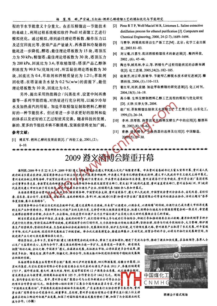 釀酒科技2009年第10期(總第184期)· LIQUOR- MAKING SCIENCE& TECHNOLOGY2009No,10To.184)燃料乙醇精餾工藝的模擬優(yōu)化與節(jié)能研究楊慧,陳礪,嚴(yán)宗誠,王紅林(華南理工大學(xué)化學(xué)與化工學(xué)院,廣東省綠色化學(xué)產(chǎn)品技術(shù)重點(diǎn)實(shí)驗室,廣東廣州510640)摘要:將工業(yè)乙醇生產(chǎn)的一級精餾系統(tǒng)和燃料乙醇生產(chǎn)的加鹽萃取精餾系統(tǒng)合并,在差壓精餾節(jié)能技術(shù)的基礎(chǔ)上,利用過程系統(tǒng)模擬軟件ProⅡ?qū)φ麴s工藝進(jìn)行模擬優(yōu)化。醪塔:最佳理論塔板教為15塊,塔頂壓力為50κPa;精餾塔:最佳理論塔板教為30塊,塔頂壓力為200kPa,回流比為3.4;萃取精餾塔:塔頂產(chǎn)品乙醇體積濃度為998%(優(yōu)級純)時,所需最佳理論塔板數(shù)為30塊,回流比為04,萃取劑和酒精質(zhì)量比為1.2:1;萃取劑回收塔:在塔釜液含水量為02%ww)的前提下,最佳理論塔板數(shù)為10塊,回流比為0.5。另外,采用熱能耦合、閃蒸技術(shù)、設(shè)置中間再沸器等一系列節(jié)能措施,結(jié)合然料乙醇生產(chǎn)的蒸煮工段,對熱量進(jìn)行充分利用,使冷卻水以及加熱蒸汽的用量大大減少。關(guān)鍵詞:燃料乙醇;萃取精餾;模擬優(yōu)化;節(jié)能中圖分類號:TS2622;TS2614;TP27文獻(xiàn)標(biāo)識碼:A文章編號:1001-9286(2009)10-0043-0Research on the Simulation Optimization and Energy Saving ofExtractive Distillation in Fuel Ethanol ProductionYANG Hui, CHEN Li, YAN Zong-cheng and WANG Hong-lin(School of Chemistry and Chemical Engineering, South China University of Technology, Guangzhou, Guangdong 510640, ChinaAbstract: The first-grade distillation system in industrial ethanol production and the salt-added extractive distillation system in fuel ethanol pro-duction were combined together and the distillation process was simulated and optimized by simulation software Proll on the basis of the ener-gy-saving technique of differential pressure distillation. The optimized technical parameters were summed up as follows: prefractionator: the besttheoretical number of trays was 15, and the top pressure was 50 kPa; distillation column: the best theoretical number of trays was 30, the top pres-sure was 200 kPa, and the reflux ratio was 3. 4; extractive distillation column: when the ethanol volume concentration of the top product got 99.8%(superior grade pure), the best theoretical number of trays was 30, and the reflux ratio was 0. 4, the mass ratio of extractant and alcohol was 1.2: 1extractant recovery tower: when water content in the bottom product was 0.2 %(w/w). the best theoretical number of trays was 10, and the refluxratio was 0.5. Besides, a series of energy-saving measures were also adopted such as thermal energy coupling, flash steaming technique, and theinstallment of middle reboiler In combination with the cooking procedures in fuel ethanol production, the heating energy was fully utilized so thatthe consumption of cooling water and heating steam were greatly reducedKey words: fuel ethanol; extractive distillation; simulation and optimization; energy saving隨著經(jīng)濟(jì)的快速發(fā)展,類對能源的需求不斷增大。冷卻水量占總能耗的60%~70%,其中大量的能量被在化石能源日漸匱乏的情況下,發(fā)展可再生能源顯得尤冷卻水、廢液等帶走造成損失。因此,在酒精生產(chǎn)中合理為重要。乙醇是一種可再生能源,可經(jīng)玉米、甘蔗、木薯等使用能源,搞好酒精蒸餾工段的余熱回收,重復(fù)利用余農(nóng)作物發(fā)酵、蒸餾制得。除大量應(yīng)用于制酒業(yè)、化工、醫(yī)療熱,既可節(jié)約能源,又可降低成本,提高企業(yè)經(jīng)濟(jì)效益。外,還可以作為汽車燃料使用燃料乙醇可以有效節(jié)約汽隨著燃料乙醇計劃的實(shí)施,如何高效節(jié)能地制備燃油,降低汽車尾氣污染物排放推廣應(yīng)用車用乙醇汽油已料乙醇成為一個迫切需要解決的問題。本文將工業(yè)乙醇成為我國的一項戰(zhàn)略舉措,它對有效解決陳化糧轉(zhuǎn)化問生產(chǎn)的一級精餾系統(tǒng)和燃料乙醇生產(chǎn)的加鹽萃取精餾系題,穩(wěn)定農(nóng)民收入,減少環(huán)境污染,緩解石油資源緊張的統(tǒng)合并,結(jié)合ProI系統(tǒng)模擬軟件進(jìn)行優(yōu)化,以確定最佳矛盾,都有十分重要的意義。工藝操作參數(shù)和換熱方案。燃料乙醇有以下幾種生產(chǎn)方法:氧化鈣脫水法共沸1精精餾、吸附精餾、滲透汽化、吸附法、萃取精餾法和真空脫水法等。在傳統(tǒng)酒精生產(chǎn)中精餾過程所消耗的蒸汽及HH中國煤化工CNMHG年代在我國用于工業(yè)收稿日期:2009-07-16釀酒科技200年第10期(總第184期) LIQUOR-MAKING SCIENCE& TECHNOLOGY2000ro14萃取劑成熟發(fā)酵醒c叫燃料乙醇廢水萃取精餾塔工業(yè)乙醇≌直接蒸汽回罐圖1燃料乙醇精餾工藝流程圖生產(chǎn)以來,經(jīng)過30多年的積累和完善,已經(jīng)成為我國生操作參數(shù)進(jìn)行優(yōu)化。影響能量損耗的因素很多,包括塔板產(chǎn)燃料乙醇的主要方法。對乙醇-水物系加入鹽類(Ca-數(shù)、塔壓、進(jìn)料位置、回流比等等。采用ProI系統(tǒng)模擬軟Cl,, KAc等)會使乙醇對水的相對揮發(fā)度大大提高體系件可以方便、快捷、較準(zhǔn)確地實(shí)現(xiàn)工藝條件的優(yōu)化。乙醇的恒沸點(diǎn)消失。采用乙二醇作萃取劑,同時在萃取劑中和水均為極性物質(zhì),采用NRTL熱力學(xué)方法模擬。加入醋酸鉀鹽,一方面利用溶鹽提高欲分離組分之間相2.1醪塔對揮發(fā)度的突出性能,克服純?nèi)軇┬懿?