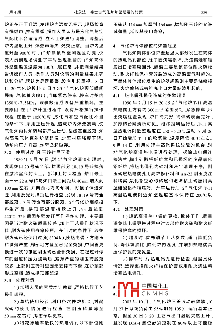 2006年8月.大氛肥Aug. 2006第29卷第4期Large Scale Nitrogenous Fertilizer IndustryVol.29 No.4德士古氣化爐爐壁超溫的對策杜永法(鎮(zhèn)海煉化股份有限公司浙江寧波315207 )摘要以歷年典型超溫事故為實例對德士古氣化爐爐壁超溫現(xiàn)象及其原因進行全面總結和分析,從設備管理、工藝操作優(yōu)化及技術改造等方面提出解決問題的對策。關鍵詞氣化爐超溫對策中圖分類號:TQ113.25文獻標識碼:B.文章編號:1002- 5782( 2006 )04-0227-04德士古渣油氣化爐分上下兩部分上半部為降負荷后爐頸溫度逐漸下降,16:00左右爐頸燃燒室,下半部為激冷室。燃燒室的操作溫度為溫度下降到285C左右。14 日038停3#爐9 001350C操作壓力為8. 53MPa。為防止氣化爐殼左右吊出燒嘴發(fā)現(xiàn)氧氣噴嘴燒損較大縮進量由體失強燃燒室內(nèi)襯耐火襯里。燃燒室殼體材質(zhì)原始的1.85~ 1.97mm增加到3.72 ~ 4.95 mm。o為SCMV3殼體的設計溫度為400C。在燃燒室氧氣噴嘴燒損問題以往也曾發(fā)生,但這次使用時殼體外表面設置有表面熱電偶,對爐體外表溫度間更短。進行監(jiān)測,當壁溫超過302C時就會發(fā)出報警信2004年12月上旬因尿素裝置處理汽提塔問號。自1983年底試車投用,氣化爐爐壁超溫現(xiàn)象題,合成氨裝置低負荷運行3d ,恢復正常負荷時,時有發(fā)生造成裝置減負荷生產(chǎn)甚至停車搶修。2臺氣化爐都出現(xiàn)爐頸部壁溫高報警燒嘴冷卻水回水溫度上升,爐頂部發(fā)出異常聲音。倒爐處1燒嘴原因造成的壁溫異 常理后檢查發(fā)現(xiàn)2臺氣化爐氧氣燒嘴都已燒損。1.1 氧氣噴嘴內(nèi)有異物超溫原因:低負荷時,入爐的物料體積流量大1990年12月28日15 :45 ,在裝置停工檢修幅減少出燒嘴物料的流速急劇降低,火焰黑區(qū)大中2#氣化爐更換錐底和爐口全部耐火襯里投大縮短霧化角度擴大,回流區(qū)縮小燃燒區(qū)上移,料后不久爐拱頂和頸部超溫報警實測溫度達到向火面溫度升高氣化爐上部爐壁溫度隨之升高。330C。經(jīng)檢查各項工藝操作參數(shù)正常耐火襯里同時燒嘴部位溫度升高,低負荷下霧化不好造是新的燒嘴是新修復的。停爐后吊出燒嘴檢查,成燒嘴部位局部過氧,使 氧氣噴嘴燒損。噴嘴燒發(fā)現(xiàn)燒嘴氧氣噴嘴內(nèi)有1個直徑27mm、高度損后霧化狀況進一步惡化,火焰形態(tài)發(fā)生變化,12mm不銹鋼襯環(huán)是氧氣噴嘴端面堆焊高溫合在局部區(qū)域產(chǎn)生過氧超溫。金時襯上的,在噴嘴端面金加工后忘記取掉而遺1.3原料油質(zhì)量差造成噴嘴燒損或結垢.留下來。更換燒嘴后投料運行,-切正常。從2003年下半年開始,氣化爐因燒嘴損壞、1.2低負荷運行造成氧氣噴嘴燒損壁溫超溫等實施的倒爐操作大幅增加,尤其是3*氣化爐大修后于2002年4月12日9 :55中國煤化工到爐就達4次給油氣投料,為配合變換爐催化劑硫化,在低負荷下運YHCNMH G產(chǎn)帶來極大的困難影行。當天多次對氣化爐壁溫進行檢測,未發(fā)現(xiàn)異收稿日期2006-03-23.0常。4月13日4 :00開始加負荷,9 :00左右對氣作者簡介杜永法男高級工程師,1982年畢業(yè)于浙江工業(yè)化爐壁溫進行檢測,筒體壁溫正常,但爐頸部壁溫大學工業(yè)設備腐蝕與防護專業(yè)現(xiàn)在鎮(zhèn)海煉化股份有限公司機動最高達433C ,且四周溫度均高高點溫差不大。處從事靜設備技術管理工作。聯(lián)系電話0574-86445802。228大氛肥2006年第29 卷響到全公司的溶劑脫油瀝青(DOA)平衡和向煉油澆注料的掏空造成爐頸部位竄氣,使爐壁超溫。裝置的供風、供氫、供氮。1990年8月11日2#氣化爐爐頸部超溫靠北側(cè)幾次燒嘴解體均發(fā)現(xiàn)氧氣噴嘴頭部燒損燃實測溫度達到426C其他方向溫度也達到320C.油通道從頭至尾基本被結垢物所堵,燒嘴頭內(nèi)側(cè)左右。1990年8月 13日,對2# 氣化爐進行搶修,清除結垢物后表面光滑,而外側(cè)離端部60~打開.上封頭進行檢查爐口陶纖氈還在靠北側(cè)剛110mm處局部區(qū)域燒損減薄嚴重甚至穿孔。玉封蓋層有- 30 mmx 60mm左右的小孔深度約主要原因:氣化爐使用的原料DOA中灰分過330mm。拆除剛玉封蓋層,發(fā)現(xiàn)北側(cè)和西側(cè)爐口高引起燒嘴油通道局部結垢堵塞,出燒嘴DOA澆注料均已跑空,剩余的澆注料強度很低,有的像偏流造成氧氣噴嘴局部過氧損壞;火焰偏向燃燒灰一樣根本沒有粘接,有的雖然粘接成塊,但用甚至返舔燒嘴,而燃油通道距燒嘴頭部60 ~腳一踩就粉碎。這次2臺氣化爐相繼出現(xiàn)爐頸部110mm范圍是冷卻水管保護不到的區(qū)域,容易被超溫現(xiàn)象原因都是爐口澆注料跑空。從現(xiàn)場爐燒壞;火焰返舔燒嘴和爐膛內(nèi)高溫氣體的返混加.口澆注料拆除的情況分析澆注料跑空的原因則劇使燒嘴冷卻水溫升高,也使爐壁溫度升高。是澆注料的粘接劑一純鋁酸鈣水泥失效造成1.4處理對策1)加強燒嘴投用前的檢查,確保燒嘴的質(zhì)1996年5月6日,停爐拆裝3#爐燒嘴,在拆量避免有問題的燒嘴投入使用。除所有螺母后進行吊裝燒嘴時,爐口內(nèi)發(fā)生小閃2)盡量避免低負荷工況運行。必要時適當.爆燒嘴彈出造成爐磚表面剝落10mm左右,引增加蒸汽量提高物料出燒嘴的流速盡量使高溫起爐口磚松動。5月12日開車5月17日爐頸部火焰遠離噴嘴,以提高噴嘴的使用壽命。壁溫高報警最高曾達410C。5月20日因氮壓3)對溶脫裝置的DOA產(chǎn)量和摻入溶脫裝置機原因停工小修檢查發(fā)現(xiàn)爐口磚松動封