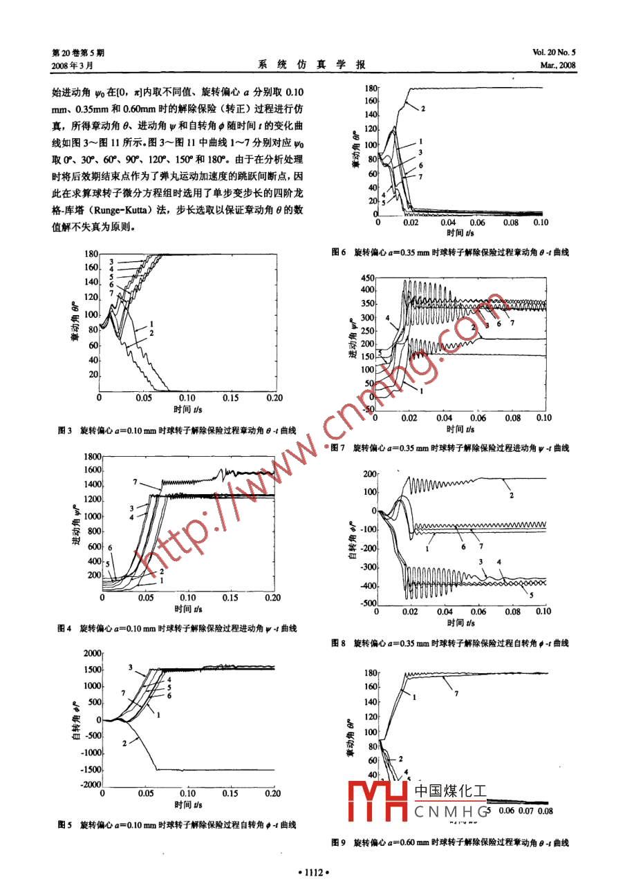 第20卷第5期系統(tǒng)仿真學(xué)報Vol. 20 No 52008年3月Journal of System SimulationMar.2008引信球轉(zhuǎn)子機(jī)構(gòu)動力學(xué)仿真聞泉,王雨時南京理工大學(xué)機(jī)械工程學(xué)院,江蘇南京210094)婜:引信球轉(zhuǎn)子?xùn)i構(gòu)是旋轉(zhuǎn)彈藥引信的典型機(jī)構(gòu)之一除用于隔爆之外,還可實(shí)現(xiàn)延期解除保險.應(yīng)用歐拉剛體動力學(xué)理論,建立了球心質(zhì)心及彈丸旋輪均不重合時球轉(zhuǎn)子解除保險適動過的微分方程紅,在給出了求解放方程血始條件的基油上對某引信球嶺于機(jī)構(gòu)解除保險過程遞行了仿真。所得仿真結(jié)果與工程實(shí)踐的結(jié)果是一致的關(guān)幞詞:引信;球轉(zhuǎn)子;保險與解除保險裝置;延期解除保險;動力學(xué)仿真中圖分類號:T4303文獻(xiàn)標(biāo)識碼:A文章編號:1004731X(2008)05-104Dynamics Simulation for Fuze Rotor DeviceWEN Quan, WANG Yu-shiSchool of Mechanical Engineering, Nanjing University of Science& Technology Nanjing 210094, China)Abstract: The fuze ball rotor is one of typical devices in the fuze for rotating projectile. Fuze ball rotor device not only canensure detonator safety, but also is one of delay arming devices, The Euler dynamics theory was applied to establishcoupled differential equations of the motion of ball rotor whose mass center did not coincide with its geometric center andhad an ofset from spin axis of the projectile. On the basis of initial condition to solve the ball rotor movement differentialequation, the arming process of one type of fuze ball rotor device was simulated. The result suggests that it is coincident withKey words: fuze; ball rotor; safety and arming device; arming delay: dynamics simulation引言理階段,裝有雷管的球轉(zhuǎn)子的極慣性軸線與引信軸線錯開個角度,以防止雷管意外發(fā)火引爆其后直列的傳爆管部件球轉(zhuǎn)子機(jī)構(gòu)發(fā)明于十九世紀(jì)末期,作為一種典型的引信進(jìn)而引爆彈丸主裝藥。彈丸由身管發(fā)射時,形成引信的后坐機(jī)構(gòu),已在各類旋轉(zhuǎn)彈藥中得到了應(yīng)用,其中尤以西方各國和旋轉(zhuǎn)環(huán)境。后坐環(huán)境使引信的后坐保險在最大膛壓點(diǎn)之前的小口徑炮彈引信最為忤遍。近年來隨著引信球轉(zhuǎn)子理論的解除保險,而旋轉(zhuǎn)環(huán)境則使引信的離心保險在膛口附近解除發(fā)展,其應(yīng)用已不僅僅限于滿足隔爆安全性的要求,而將其保險。但由于后坐力約束反力產(chǎn)生摩擦力,故球轉(zhuǎn)子在膛內(nèi)功能拓展到了延期解除保險領(lǐng)域。關(guān)于球轉(zhuǎn)子的動力學(xué)仿幾乎無動作。彈丸飛出膛口后,后坐力逐漸消失。在接近后真,雖然文獻(xiàn)14有所涉及,但由于所用數(shù)學(xué)模型存在諸多效期末,球轉(zhuǎn)子在自身慣性離心力矩的作用下克服摩擦力矩缺陷,故結(jié)果與工程實(shí)踐差異很大。文獻(xiàn)[5]雖也披露了一部逐漸轉(zhuǎn)正(球轉(zhuǎn)子極慣性軸線與引信軸線即彈丸旋轉(zhuǎn)軸線接分仿真結(jié)果,但其數(shù)學(xué)模型及其結(jié)果仍很粗糙,很多重要影近重合)。當(dāng)球轉(zhuǎn)子的極慣性軸線與引信體(彈丸)軸線接響因素均未涉及。筆者在文獻(xiàn)6中建立了形心、質(zhì)心與彈丸近轉(zhuǎn)正時,引信解除保險,處于待發(fā)狀態(tài)旋轉(zhuǎn)軸三者均不重合這種最普遍情況下的引信球轉(zhuǎn)子動力學(xué)模型在文獻(xiàn)門中討論了求解球轉(zhuǎn)子運(yùn)動微分方程組的初始條件,本文的工作是對這種最普遍情形的引信球轉(zhuǎn)子解除保險運(yùn)動進(jìn)行計算機(jī)動力學(xué)仿真,并在此基礎(chǔ)上進(jìn)一步討論了引信球轉(zhuǎn)子機(jī)構(gòu)的設(shè)計問題1引信球轉(zhuǎn)子動力學(xué)模型美國M505A3引信球轉(zhuǎn)子結(jié)構(gòu)示意圖如圖1所示。其中5為球轉(zhuǎn)子,主要由隔離球和其中的爆炸元件組成。勤務(wù)處中國煤化工慣性軸線:4球座管;8—引信體收稿日期:20061207修回日期:2007-0228CNMHG意圖作者筒介:陽泉(1979),男,河南南陽人,博士生,研究方向?yàn)闄C(jī)電系統(tǒng)靈巧化與智能化;王聊時(1962),男,遼寧本溪人,教授研究方向11運(yùn)動參考系選取為引信機(jī)構(gòu)動力學(xué)、引信系統(tǒng)分析與設(shè)計、彈藥安全系統(tǒng)與爆炸序列設(shè)球轉(zhuǎn)子在其腔室內(nèi)的解除保險運(yùn)動為繞形心(球心)的·1110·第20卷第5期2008年3月聞泉,等:引信球轉(zhuǎn)子機(jī)構(gòu)動力學(xué)仿真定點(diǎn)轉(zhuǎn)動。如圖2所示,可建立動參考系o水和定參考系ME=M+M +Mu+MMc+Maxz。其中。點(diǎn)為球轉(zhuǎn)子的球心,動參考系固連于球轉(zhuǎn)子Mn=M兩+M+Mn+MMn+Msn記為(o,e1,e2,e3),o軸取為雷管軸線,球轉(zhuǎn)子上過oM;=+MotM軸的對稱面取為om,oc軸和Om軸的方向與彈丸飛行方向其中M、M兩和Mx為后坐力或爬行力主矩在動參考系夾角均為銳角或Om軸方向與彈丸飛行方向相同,o軸的方0575中的投影,M、M和Mx為離心慣性力主矩在動向則由軸和m軸按右手法則確定。定參考系oxz固連參考系o5中的投影,Mt、M和M4為哥氏慣性力主于彈丸(引信),記為(o,i,b),az軸與彈丸旋轉(zhuǎn)軸矩在動參考系o5中的投影,Mm、MM和Ma為球軸線方向平行且指向相同,彈丸旋轉(zhuǎn)軸軸線方向記為oz,轉(zhuǎn)子與其腔室下接觸點(diǎn)M處摩擦力矩在動參考系o5m中在不考慮彈丸章動的情況下其指向?yàn)閺椡璧娘w行速度方向,的投影,Mm2、Mm