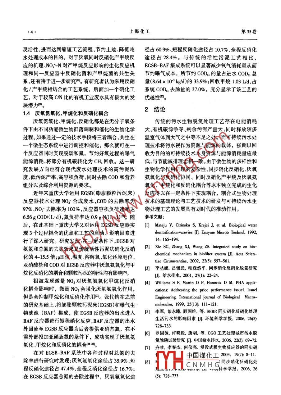 上海化工Vol.35 No.1●2.Shanghai Chemical IndustryJan. 2010環(huán)境保護(hù)耦合式污水脫氮技術(shù)的研究進(jìn)展耿亮朱勇何巖林劍波黃民生華東師范大學(xué)資源與環(huán)境科學(xué)學(xué)院(上海200062)簡要基于微生物的協(xié)同作 用概述了耦合式污水脫 氨技術(shù)的研究現(xiàn)狀,主要包括同步硝化反硝化,厭氧氨氧化與反硝化協(xié)同,同時反硝化產(chǎn)甲烷,厭氧氨氧化.甲烷化和反硝化耦合等,并且闡述了這些過程的原理、實現(xiàn)工藝及特點,以期為實現(xiàn)污水的有效脫氮提供參考。關(guān)鍵詞同步硝化反硝化 厭氧氨氧化與反硝化協(xié)同同時反硝化產(chǎn)甲烷 厭氧氨氧化 .甲烷化和反硝化耦合中圖分類號X 703.1完全硝化、反硝化所需的時間。目前常用的同步硝0引言化反硝化工藝的性能比較具體見表1。在眾多的水體生物脫氮技術(shù)中,生物法是運(yùn)用國外對SND的研究已逐漸從實驗室走向污水極其廣泛的一種脫氮技術(shù)。傳統(tǒng)的生物脫氮是由硝廠的實踐階段,在荷蘭、德國等國家已有利用同步硝化過程和反硝化過程兩部分組成,利用好氧硝化缺化反硝化脫氮工藝的污水處理廠在運(yùn)行。氧反硝化來達(dá)到脫氮目的。但傳統(tǒng)的工藝往往存在1.2 厭氧氨氧化與反硝化協(xié)同著耗能多、耗時長、占地面積大、有機(jī)負(fù)荷較低等缺厭氧氨氧化反應(yīng)(ANAMMOX)是在嚴(yán)格缺氧的點。近年來以研究能耗低、處理時間短、能源回收為條件下,以NH為電子供體,以NO2為電子受體,將目的可持續(xù)脫氮技術(shù)而成為研究熱點,目前主要利.NH4*、NO2-轉(zhuǎn)化為N2的過程"0%。用微生物代謝特性,在同-反應(yīng)器和同- -反應(yīng)系統(tǒng)有研究者在進(jìn)行垃圾滲濾液同步硝化反硝化脫中實現(xiàn)兩種或兩種以上污水處理過程的耦合技術(shù)。氮時發(fā)現(xiàn),一部分不知去向的氮可能是在ANOM-MOX過程中去除的"。這就說明在同- -反應(yīng)器系統(tǒng)1耦合式生物處理工藝技術(shù).中實現(xiàn)厭氧氨氧化與反硝化脫氮協(xié)同作用的可能1.1同步硝化反硝化性,而且對生物脫氮新技術(shù)的開發(fā)具有重要意義。周傳統(tǒng)的脫氮理論認(rèn)為脫氮需經(jīng)硝化和反硝化兩少奇|推導(dǎo)厭氧氨氧化和有機(jī)環(huán)境下以葡萄糖為碳個不同的過程。反硝化菌是異養(yǎng)兼性厭氧菌,只有在.源時反硝化脫氮的電子計量學(xué)方程式,分析結(jié)果表無分子氧而同時存在硝酸和亞硝酸離子的條件下,明:厭氧氨氧化菌可將反硝化產(chǎn)生的CO2作為無機(jī)它們才能夠利用這些離子中的氧進(jìn)行呼吸,使硝酸碳源;反硝化菌可以利用厭氧氨氧化過程中產(chǎn)生的鹽還原。但是近幾年的研究表明,硝化和反硝化可NO5。隨后很多研究者進(jìn)行了一系列在實際工藝中在同一反應(yīng)器中同時發(fā)生,許多實際運(yùn)行中的好氧實現(xiàn)ANAMMOX和反硝化協(xié)同的研究。周少奇、張硝化池中也常常發(fā)現(xiàn)有總氮損失,這一現(xiàn)象被稱為鴻郭等通過UASB(上流式厭氧污泥床)生物反應(yīng)器同步硝化反硝化現(xiàn)象(Simultaneous Nitrification and發(fā)現(xiàn)在有機(jī)環(huán)境下,UASB反應(yīng)器中可以實現(xiàn)厭氧Denirification,簡稱SND)。氨氧化與反硝化的協(xié)同作用,并且在厭氧氨氧化活SND意味著在同一反應(yīng)器內(nèi)相同的操作條件性穩(wěn)定階段( 120 d開始),氨氮和亞硝氮的平均去除下,硝化、反硝化應(yīng)能同時進(jìn)行,如果能夠保證在好率分別高達(dá)94.79%和98.17% ,CODc最高去除率可氧池中一定效率的反硝化與硝化反應(yīng)同時進(jìn)行,那達(dá)51.68%,平均去除率23.51%1%。么對于連續(xù)運(yùn)行的SND工藝污水處理廠,可以省去朱明石等采用厭氧氨氧化工藝的UASB-生物缺氧池的費(fèi)用,或至少減少其容積。對于僅由一個反膜反中國煤化工在反應(yīng)器中連續(xù)加應(yīng)池組成的序批式反應(yīng)器來講,SND能夠降低實現(xiàn)人有MYHCN M HG-N和N都取得基金項目:上海市建設(shè)與交通委員會重大科技攻關(guān)項目(重科2007-007)第一作者簡介:耿亮女1986年生 在讀碩士研究生 研究方向為水污染控制工程第1期耿亮等:耦合式污水脫氮技術(shù)的研究進(jìn)展.3.表1各種利用同步硝化反硝化工藝的效果工藝實現(xiàn)方式處理效果特點TN去除率:60%左右好氧膨脹顆粒污泥床(SND)NH,-N去除率:95%左右沉降性能好.污泥代謝活性高,既可以利用外源溶解性COD去除率:95%左右基質(zhì)又可以利用胞內(nèi)儲存物質(zhì)為碳源進(jìn)行缺氧反硝化SVI值:32.5左右TN去除率:74%-82%/抗沖擊負(fù)荷強(qiáng)、反應(yīng)器內(nèi)生物多樣性和生物量豐富、占序批式生物膜法(SBBR)NH-N去除率:85%-92%地面積小、節(jié)省基建投資、適合中小城鎮(zhèn)污水處理TN去除率:75%左右脫氮除磷功能強(qiáng)、出水水質(zhì)穩(wěn)定、自動化水平高、投資新型環(huán)流污水處理技術(shù)(0GO)NH;-N去除率:81.1%-83.8%1省和占地少TN的去除率:80%~95%mNH4-N去除率:81.2%-98.9%出水水質(zhì)好、占地面積小、污泥停留時間(SRT)長、剩余膜生物反應(yīng)器( MBR)COD去除率:90%以上污泥量少;但是膜污染嚴(yán)重SND率:45%-~50%還具有一-定的除P效果NH,-N去除率:90%左右COD去除率:85%以上具有較優(yōu)的同步脫氮除磷能力;但過高的污泥濃度會一體式膜生物反應(yīng)器(SMBR)T