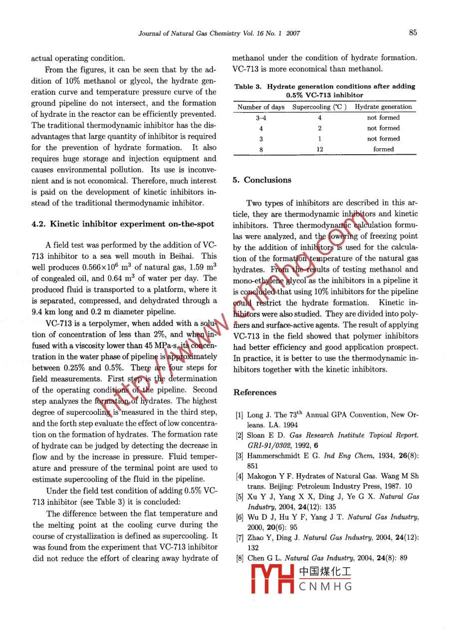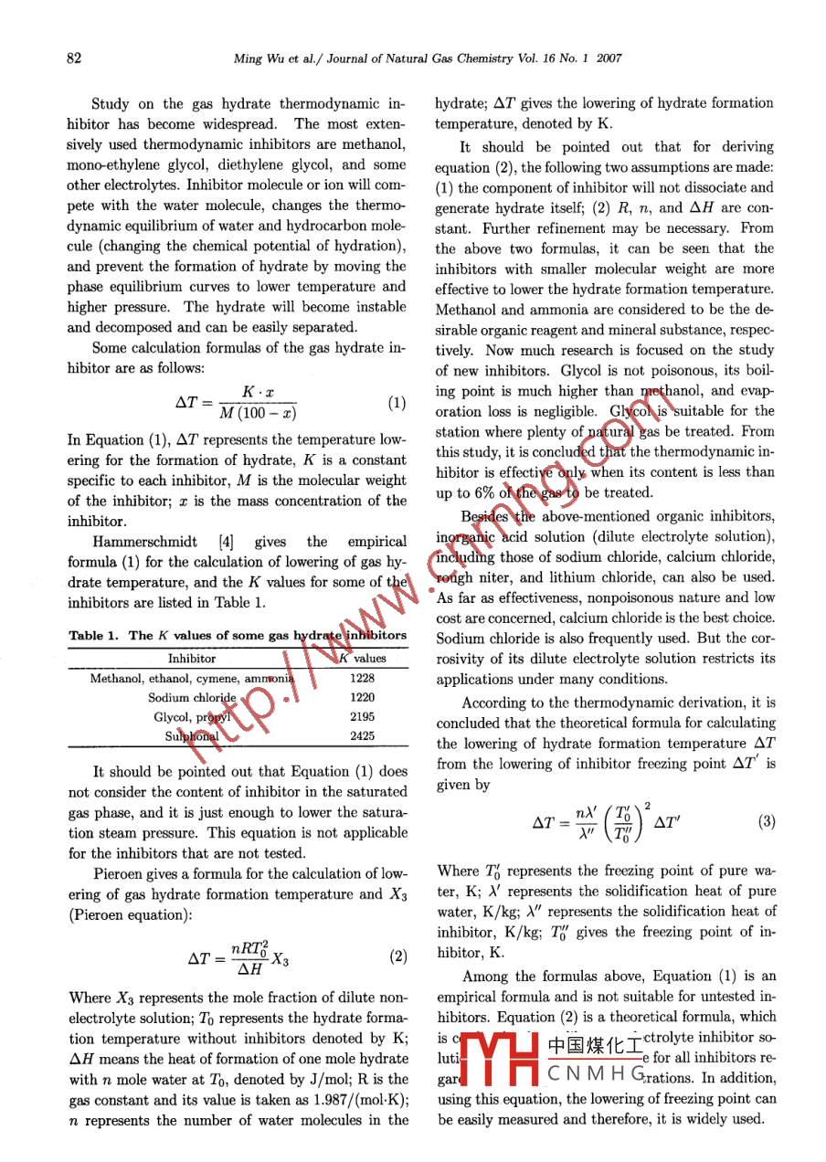 Availableonlineatwww.sciencedirect.comScienceDirectJoumal of Natural Gas CemistryJournal of Natural Gas Chemistry 16(2007)81-85SCIENCE PRESSArticlea Study on Inhibitors for the Prevention of HydrateFormation in Gas Transmission pipelineMing Wu, Shumiao Wang, Hongbo Liu1. Department of Storage and Architecture Engineering, Liaoning University of Petroleum and Chemical Technology,Fushun 113001, Liaoning, China; 2. R &D Center, Xinao Group Langfang 065001, Hebei, China; 3. ChinaPetroleum Pipeline Engineering Corporation, Langfang 065000, Hebei, ChinaManuscript received August 18, 2006; revised October 27, 2006Abstract: Gas Hydrate is usually formed during the transportation and treatment of oil and gasresulting in the plugging of gas pipeline and equipment. Three thermodynamic calculation formulas areanalyzed to deal with this problem. The lowering of the freezing point of the inhibitors AT is used tocalculate the formation temperature of natural gas hydrates. This is considered to be a good approachbecause it is not limited by what kind and what concentration of inhibitors one uses. Besides, the rate oflowering of the freezing point could be easily measured. The result of testing methanol and mono-ethyleneglycol in a reactor shows that adding 10% inhibitors to the reactor can prevent the hydrates formationKinetic inhibitors are favored in the present research. They are divided into two types, polymer andsurface-active agents. Their characteristics, mechanisms, and application prospect are separately discussedPolymer inhibitors exhibit better efficiency. The result of field application of vC- 713 inhibiter is also givenin this article. In practice, the combination of thermodynamic inhibitors and kinetic inhibitors gives betterKey words: natural gas hydrate; thermodynamic inhibitor; kinetic inhibitor; polymer; surface-active1. Introductionin the offshore pipeline. Gas hydrate may also beformed during the liquefied separation process underGas hydrate is easily formed during the trans-ultralow temperature. Therefore, the investigation onportation of oil and gas when it contains a certain an effective method for preventing and eliminatingamount of water, resulting in the damage to the oilthe formation of gas hydrate has aroused significantand gas industry (1, 2]. Since Hammerschmidt(3) dis- erescovered in 1934 that gas hydrate would block the gasIn this article, different types of inhibitors, theirpipeline, the prevention of hydrate formation has be- characteristics, and their effect on hydrate forma-come an important matter. At present, researches on tion are described. The capacity of methanol andgas hydrate inhibitors have been performed in many mono-ethylene glycol as gas hydrate thermodynamicountries. During the transportation and processingespecially when the product gases contain saturated that the addition of 10% inhibitors to the reactor canwater steam and under cold weather conditionsprevent the formation of hydrate. The field applicahydrate will plug the pipeline, valve, and equipment凵中國煤化工 en in this artiThe miscible fluid of oil and gas will be transporteCNMHGto certain distance before it is subjected to dehy. 2L ammar and calculationdration and thus, the gas hydrate is easily formed formula of natural gas hydrate(NGH)orrespondingauthorEr-mail:wuming0413@sohu.comMing Wu et al. Journal of Natural Gas Chemistry Vol. 16 No. I 2007Study on the gas hydrate thermodynamic in- hydrate; AT gives the lowering of hydrate formationhibitor has become widespread. The most exten- temperature, denoted by Ksively used thermodynamic inhibitors are methanolIt should be pointed out that for derivingmono-ethylene glycol, diethylene glycol, and some equation(2), the following two assumptions are madeother electrolytes Inhibitor molecule or ion will com-(1) the component of inhibitor will not dissociate andpete with the water molecule, changes the thermo- generate hydrate itself; (2)R, n, and AH are con-dynamic equilibrium of water and hydrocarbon mole- stant. Further refinement may be necessary.Fromcule(changing the chemical potential of hydration), the above two formulas, it can be seen that theand prevent the formation of hydrate by moving the inhibitors with smaller molecular weight are morephase equilibrium curves to lower temperature and effective to lower the hydrate formation temperatrurehigher pressure. The hydrate will become instable Methanol and ammonia are considered to be the de-and decomposed and can be easily separatedsirable organic reagent and mineral substance, respecSome calculation formulas of the gas hydrate in- tively. Now much research is focused on the studyhibitor are as followsof new inhibitors. Glycol is not poisonous, its boil-△TM(100-x)(1) mg point is much higher than methanol, and evap-oration loss is negligible. Glycol is suitable for theIn Equation( 1), AT represents the temperature low- station where plenty of natural gas be treated. Fromering for the formation of hydrate, K is a constant this study, it is concluded that the thermodynamic inspecific to each inhibitor, M is the molecular weighteffective only when its content is less thanof the inhibitor: r is the mass concentration of the upof the gas to be treatedinhibitorabove-mentioned organic inhibitorsHammerschmidt [4 gives the empirical morganIcolution(dilute electrolyte solutionformula(1)for the calculation of lowering of gas hyincluding those of sodium chloride, calcium chloridedrate temperature and the K values for some of the rough niter, and lithium chloride, can also be usedinhibitors are listed in Table 1As far as effectiveness, nonpoisonous nature and lowcost are concerned, calcium chloride is the best choiceTable 1. The K values of some gas hydrate inhibitors Sodium chloride is also frequently used. But the cor-Inhibitorrosivity of its dilute electrolyte solution restricts itsMethanol, ethanol, cymene, ammoniaapplications under many conditionsSodium chlorideAccording to the thermodynamic deriv