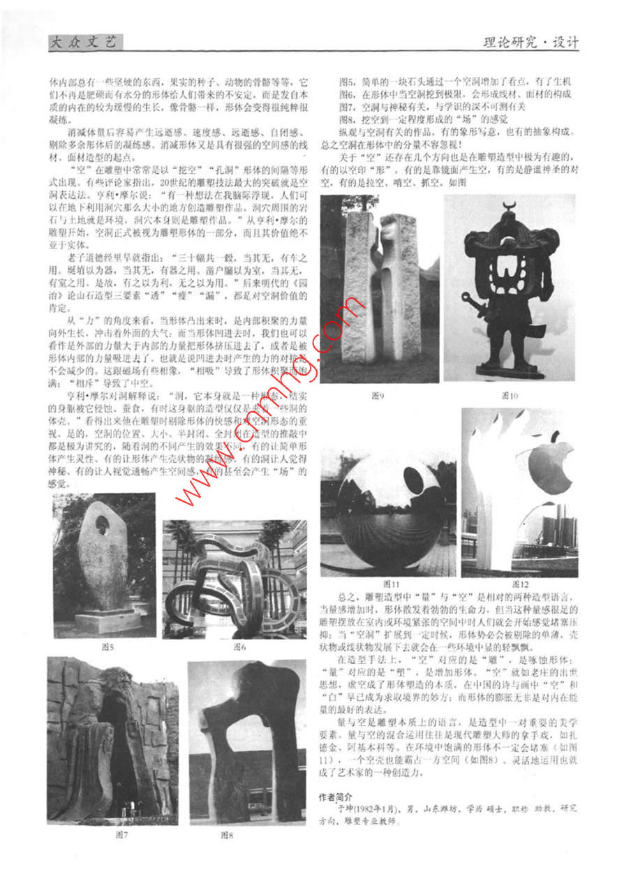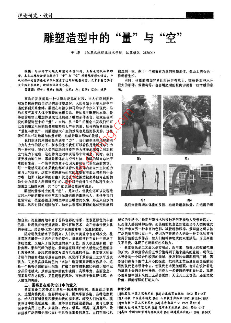 理論研究·設(shè)計(jì)雕塑造型中的“量”與“空”于坤(江蘇農(nóng)林職業(yè)技術(shù)學(xué)院江蘇鎮(zhèn)江212000摘要:形體語(yǔ)言問(wèn)題是雕塑的本質(zhì)問(wèn)題,尤其是現(xiàn)代抽象雕被洗刷一空,剩下一個(gè)積蓄著力量的完整形體,像山上的石頭塑。本文從雕塑逵型上揭示了“量”與“空”兩種雕塑形體語(yǔ)言,并樣繃著生長(zhǎng)從對(duì)形體的真實(shí)感受中深入探索了這兩種造型語(yǔ)言。文章本著忠實(shí)于同時(shí),體量的增加容易讓形體更有活力,哪怕是那些水分大自然生長(zhǎng)規(guī)則,破譯形體語(yǔ)言藝術(shù)很大的形體,像葡萄等,也會(huì)用肥碩的贅肉訴說(shuō)著一些滑稽的意關(guān)鍵詞:形體;量感;飽溝;生長(zhǎng);力;孔洞;空白;境界事物的發(fā)展都是一種認(rèn)識(shí)與反思的過(guò)程,當(dāng)人們看到羅丹那發(fā)自情感的血肉浮動(dòng)的形體塑造時(shí),人們開(kāi)始不再受人體中嚴(yán)謹(jǐn)?shù)慕馄赎P(guān)系束縛,雕塑在布德?tīng)柡婉R約爾手中步入了現(xiàn)代。馬約爾放棄真實(shí)人體中繁瑣的光影關(guān)系,開(kāi)始找尋雕塑的本質(zhì),最終他的雕塑以增加體量成功地加強(qiáng)了雕塑形體語(yǔ)言。這就是我所說(shuō)的雕塑造型中的“量”。當(dāng)然,從“量”的概念出發(fā)我們還可以看到增加形體的數(shù)量和雕塑放大產(chǎn)生的量。形體的數(shù)量也就是“重復(fù)與漸變”;而雕塑放大產(chǎn)生的效果也是顯而易見(jiàn)的。這里我們單從相對(duì)地增加體量來(lái)說(shuō),也就是增加形體的量感我們生活的周?chē)幪幊錆M著“力”,我們都生活在地球的引力力與大氣的浮力下。樹(shù)木的生長(zhǎng)我們可以看作是掙脫地球引力的一種對(duì)抗,我們?nèi)祟?lèi)的活動(dòng)同樣要在努力擺脫地球引力和對(duì)抗空氣阻力下完成,這在體育運(yùn)動(dòng)中表現(xiàn)得非常明顯;同時(shí),我們還要橫向地生長(zhǎng),那就是形體在與空氣對(duì)抗,飽滿的肌肉總比干癟的有生命,一個(gè)簡(jiǎn)單的方盒子會(huì)因?yàn)榕蛎浂a(chǎn)生生命的感覺(jué)每一個(gè)量感很足的水果我們都可以看作是形體內(nèi)部向外生長(zhǎng)的力在與大氣抗衡。這就不難理解馬約爾的雕塑有著那么強(qiáng)烈的生命力啦,他那《被束縛的自由》就是在表達(dá)雖然被束縛但內(nèi)在的勃生命力是敵人所捆綁不住的。而且對(duì)于向外生長(zhǎng)的這種生命力如果加以捆綁束縛,其“力”的表述會(huì)更清晰強(qiáng)烈。雕塑的量感對(duì)應(yīng)的是“塑”,是加法。但我們還可以發(fā)現(xiàn)經(jīng)過(guò)河水沖刷的鵝卵石也常常以光滑飽滿的量感示人,無(wú)怪乎我們也常常在一些量感很足的雕塑中讀出雕鑿的快感,那是來(lái)自水的圖雕鑿、風(fēng)和時(shí)間的剔除加工。如此以來(lái)那些繁瑣的起伏變化就都我們來(lái)看看增加體量的反例,也就是消弱體量。在飽滿的形加自主,而且很好地豐富了首飾色彩的譜系。景泰藍(lán)顏色的豐富械式的生活中,長(zhǎng)期與新技術(shù)的接觸不但不能給人類(lèi)帶來(lái)活力,色彩,讓現(xiàn)代首飾更顯妖嬈?,F(xiàn)代首飾藝術(shù),是在繼承傳統(tǒng)文化反而使人感到精神壓抑,而美麗的景秦藍(lán)卻能給當(dāng)今人類(lèi)機(jī)械式的基礎(chǔ)上,結(jié)合現(xiàn)代文化和藝術(shù)思潮的影響下發(fā)展起來(lái)的的生活帶來(lái)另一種豐富的色彩,減輕精神壓抑。景泰藍(lán)之所以被隨著現(xiàn)代生活水平的提高,人們的審美觀念也有所改變,往廣泛的用與現(xiàn)代設(shè)計(jì)中,是因?yàn)樗鼈鬟f給人的是一種文化欣賞與往喜歡收藏帶一點(diǎn)古色古香的擺件。景泰藍(lán)擺件在設(shè)計(jì)中繼承了使用價(jià)值的藝術(shù)作品,使人們精神和物質(zhì)的雙重滿足,而且高雅傳統(tǒng)文化,又融入了現(xiàn)代先進(jìn)的生產(chǎn)工藝,給人以造型新顆、古又不昂貫,體現(xiàn)了它所獨(dú)有藝術(shù)魅力卜典雅、豪華氣派的感覺(jué)。景泰藍(lán)花瓶擺件給人感覺(jué)花色艷麗并景泰藍(lán)既是工藝品又是實(shí)用品。近年來(lái),隨著人們收藏范圍且古樸典雅,是現(xiàn)代饋贈(zèng)親友或自己收藏的佳品。景泰藍(lán)大師設(shè)的擴(kuò)大,景泰藍(lán)珍品的藝術(shù)價(jià)值得到了越來(lái)越高的重視。現(xiàn)代藝計(jì)制作的故宮水缸形景泰藍(lán)擺件,既發(fā)揮了景泰藍(lán)工藝水平及表術(shù)設(shè)計(jì)是一個(gè)綜合性較強(qiáng)的領(lǐng)域,涉及到的知識(shí)面相當(dāng)廣闊,需現(xiàn)力,又把故宮極具特色的“水缸”造型圖案表現(xiàn)在作品中。這要我們?cè)诟鱾€(gè)細(xì)節(jié)上用心的探索。把傳統(tǒng)工藝品景李藍(lán)靈活的運(yùn)是一個(gè)極有價(jià)值的設(shè)計(jì)創(chuàng)新,打破了原樣仿制按比例縮小制作紀(jì)用到現(xiàn)代藝術(shù)設(shè)計(jì)中去,使現(xiàn)代藝術(shù)更加新顆。也許在設(shè)計(jì)前進(jìn)念品的老模式。景泰藍(lán)擺件的色彩魂麗、高雅華貴、富麗堂皇,的道路上會(huì)遇到種種挫折。但作為一名普通的平面設(shè)計(jì)者,我衷圖案具有東方韻致,又呈現(xiàn)現(xiàn)代風(fēng)采,在傳統(tǒng)中兼具現(xiàn)代感,給心地希望中國(guó)未來(lái)的工藝品會(hu
