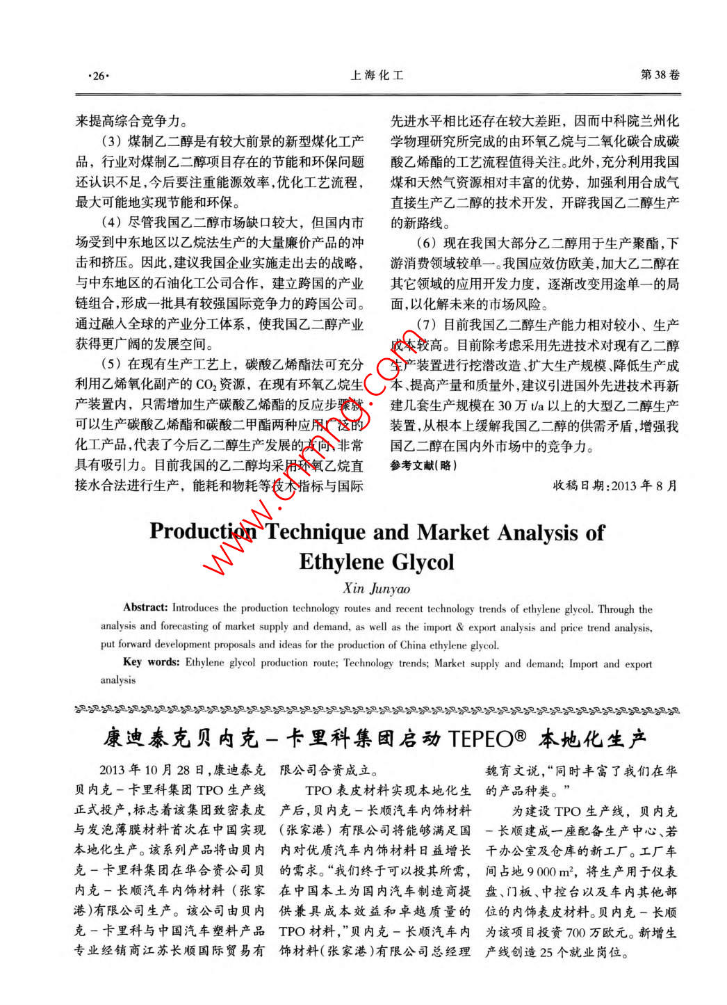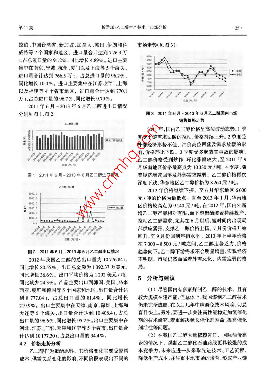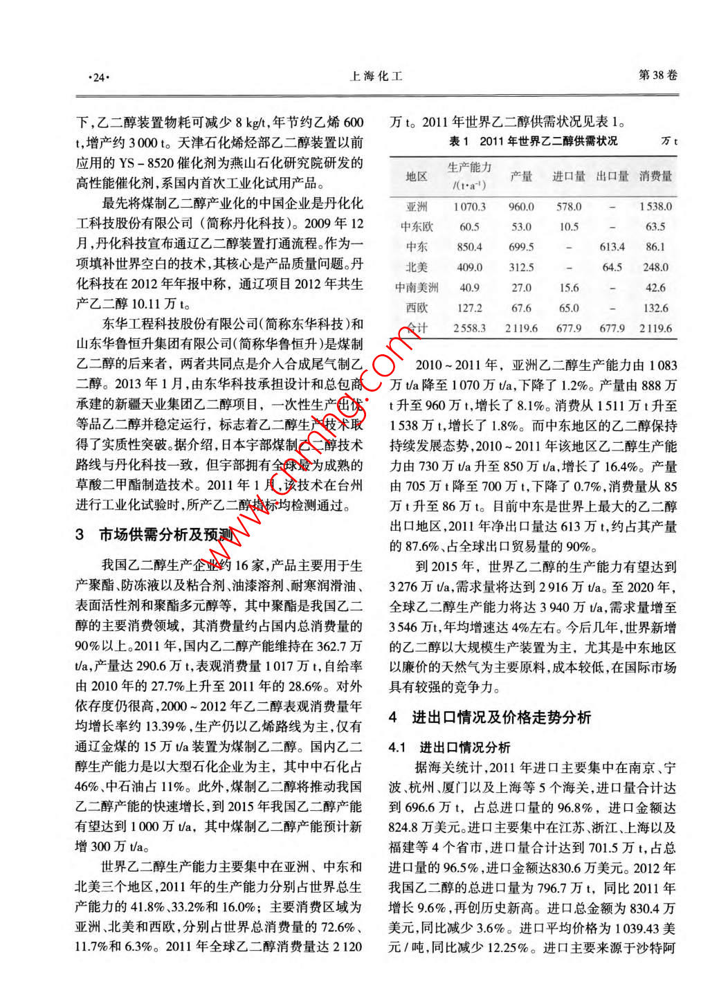 上?;ol 38 No 11Shanghai Chemical IndustryNov.2013乙二醇生產(chǎn)技術(shù)與市場分析忻君瑤上海市化工科學技術(shù)情報研究所(上海200030)摘要介紹了乙二醇生產(chǎn)技術(shù)路線和近期技術(shù)發(fā)展動態(tài),并通過對乙二醇市場供需的分析和預(yù)測,以及對進出口、價格走勢的剖析,提出了我國乙二醇生產(chǎn)的發(fā)展建議和思路。關(guān)鍵詞乙二醇生產(chǎn)路線技術(shù)動態(tài)市場供求進出口分析中圖分類號TP223.1620概述乙二醇的主要方法,該工藝是將環(huán)氧乙烷和水按摩爾比1:20~1:22配成混合水溶液,在管式反應(yīng)器乙二醇(MEG)又名甘醇、乙撐二醇,是一種重要中于190~220℃、10~25MPa下反應(yīng),環(huán)氧乙烷的石油化工基礎(chǔ)有機原料,主要用于生產(chǎn)聚酯纖維、全部轉(zhuǎn)化為混合醇,生成的乙二醇水溶液含量大約防凍劑、不飽和聚酯樹脂、潤滑劑、增塑劑、非離子表在10%(質(zhì)量分數(shù))左右,然后經(jīng)過多效蒸發(fā)器脫水面活性劑以及炸藥涂料油墨等。近年來隨著我國提濃和減壓精餾分離得到乙二醇和副產(chǎn)物二乙二醇聚酯工業(yè)的快速發(fā)展,我國乙二醇的消費量不斷增(DEG)、三乙二醇(TEG)等。加。而5年來國內(nèi)乙二醇的自給率一直徘徊在25%1.2碳酸乙烯酯法30%之間。2011年中國乙二醇進口量為727萬t碳酸乙烯酯法合成乙二醇是先由二氧化碳和環(huán)比2010年增長95%。2012年進口量為7967萬t,氧乙烷在催化劑作用下反應(yīng)生成碳酸乙烯酯,碳酸比2011年增長96‰%。而2013年1~6月進口量為乙烯酯再經(jīng)水解制得乙二醇。碳酸乙烯酯法又可分417萬t,按這個趨勢2013年比2012年將有較大為乙二醇和碳酸二甲酯聯(lián)產(chǎn)法、碳酸乙烯酯水解法增長。兩種生產(chǎn)方法。1生產(chǎn)技術(shù)路線分析1.2.1乙二醇和碳酸二甲酯聯(lián)產(chǎn)法乙二醇和碳酸二甲酯聯(lián)產(chǎn)法主要過程分兩步進隨著聚酯纖維、聚酯塑料和防凍液等對乙二醇行,首先是二氧化碳和環(huán)氧乙烷在催化劑作用下合的需求,人們致力于乙二醇合成技術(shù)的研究和開發(fā)成碳酸乙烯酯,然后碳酸乙烯酯和甲醇反應(yīng)生成碳工作。英荷殼牌公司、美國聯(lián)合碳化物公司(以下簡酸二甲酯和乙二醇,兩步反應(yīng)都屬于原子利用率稱“聯(lián)碳公司”)等相繼開發(fā)了環(huán)氧乙烷直接水合法100%的反應(yīng)。制乙二醇生產(chǎn)技術(shù);美國 Halcon-SD、陶氏,日本觸陶氏公開了催化酯交換烷烯碳酸酯的專利技媒化學、三菱化學等公司相繼開發(fā)了碳酸乙烯酯術(shù)。該技術(shù)采用堿金屬或堿金屬衍生物作催化劑,在(EC)法制乙二醇生產(chǎn)技術(shù)。另外,由于世界石油資200℃下反應(yīng)4h,碳酸乙烯酯轉(zhuǎn)化率為45%。隨后源的短缺和天然氣資源相對豐富,美國聯(lián)碳公司和陶氏在研究中發(fā)現(xiàn),通過及時移走反應(yīng)生成的碳酸日本宇部興產(chǎn)等公司開展了由合成氣制乙二醇新工二甲酯和甲醇共沸物,可以提高碳酸乙烯酯的轉(zhuǎn)化藝的研究和開發(fā)工作。其中,環(huán)氧乙烷直接水合法和率,生成的碳酸二甲酯和乙二醇可以通過冷卻結(jié)晶碳酸乙烯酯法被認為是最有發(fā)展前景的乙二醇工業(yè)和萃取精餾的方法進行分離。由于均相催化劑回收化生產(chǎn)方法。2007年12月,我國煤制乙二醇工藝由困難,所以乙二醇和碳酸二甲酯聯(lián)產(chǎn)技術(shù)催化劑的中科院開發(fā)成功,并獲得多項專利開發(fā)主要側(cè)重于非均相催化劑。1.1環(huán)氧乙烷直接水合法中科院蘭州化學物理研究所完成了由環(huán)氧乙烷環(huán)氧乙烷直接水合法是目前國內(nèi)外工業(yè)化生產(chǎn)與二氧化碳合成碳酸乙烯酯,經(jīng)甲醇酯交換合成乙作者簡介:忻君瑤女1%61年生工程師主要從事情報調(diào)研與化工科技信息管理工作第11期忻君瑤:乙二醇生產(chǎn)技術(shù)與市場分析23二醇聯(lián)產(chǎn)碳酸二甲酯的全流程工藝開發(fā)。該技術(shù)針所依托20多年的技術(shù)積累與江蘇丹化集團、上海金對聚酯合成對乙二醇產(chǎn)品質(zhì)量高的要求,開發(fā)了適煤化工新技術(shù)有限公司聯(lián)手合作,開發(fā)出萬噸級“煤于規(guī)模化生產(chǎn)的管式循環(huán)反應(yīng)工藝、分離耦合工藝制乙二醇”裝置并打通全流程,于2009年5月通過和乙二醇產(chǎn)品催化精制技術(shù),為低成本、工業(yè)化生產(chǎn)鑒定?!懊褐埔叶肌奔夹g(shù)又稱“萬噸級CO氣相催化乙二醇和廉價碳酸二甲酯提供了技術(shù)支撐。合成草酸酯和草酸酯催化加氫合成乙二醇”技術(shù),該1.22碳酸乙烯酯水解合成法工藝采用工業(yè)級CO、NO、氫氣、氧氣和醇類等作為美國 Halcon-SD公司、日本觸媒公司、日本三原料,顯著降低了生產(chǎn)成本,符合循環(huán)經(jīng)濟“減量化、菱化學公司等于20世紀70年代相繼開發(fā)出碳酸乙再利用、資源化”三原則,獲得了多項中國發(fā)明專利烯酯水解合成乙二醇的工藝技術(shù)。形成了具有中國自主知識產(chǎn)權(quán)的全新工藝和核心催美國 Halcon-SD的工藝首先由乙烯、氧反應(yīng)生化劑制備技術(shù),為產(chǎn)業(yè)化奠定了基礎(chǔ)。成環(huán)氧乙烷,經(jīng)第一吸收塔和汽提塔后,在第二吸收塔內(nèi)用含碳酸乙烯酯、乙二醇和碳酸化催化劑的溶2國內(nèi)技術(shù)發(f