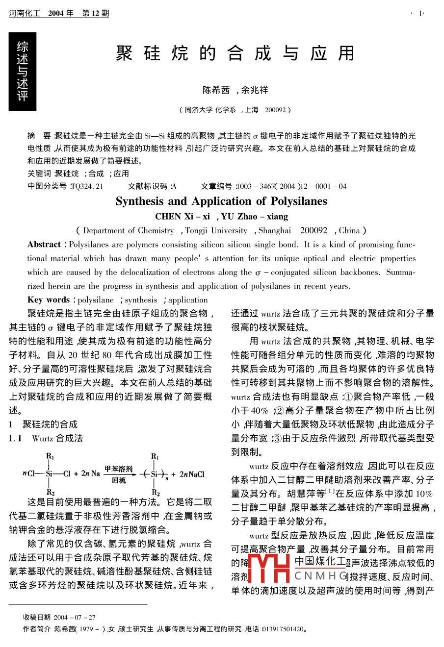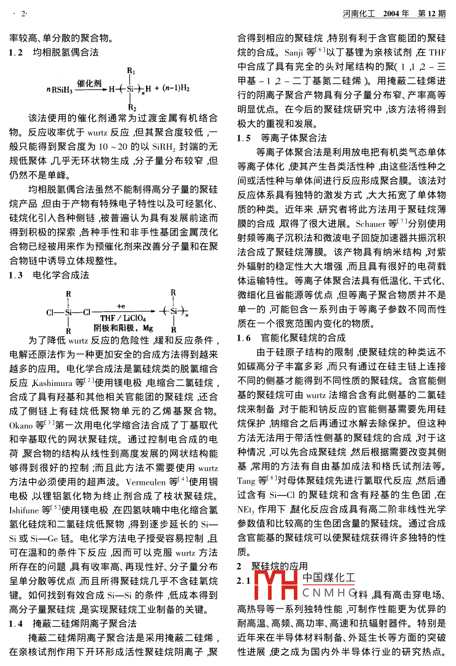 河南化工2004年第12期綜聚硅烷的合成與應用述與述評陳希茜,余兆祥(同濟大學化學系,上海200092)摘要服硅烷是一種主鏈完全由Sⅰ-S組成的高聚物其主鏈旳σ鍵電子旳非定堿作用賦予了聚硅烷獨特旳光電性質(zhì)從而使其成為極有前途的功能性材料引起廣泛的研究興趣。本文在前人總結(jié)的基礎上對聚硅烷的合成和應用的近期發(fā)展做了簡要概述。關(guān)鍵詞聚硅烷;合成;應用中圖分類號Q324.21文獻標識碼A文章編號:003-34672004)2-001-04Synthesis and Application of polysilanesCHEN Xi-xi YU Zhao-xiangDepartment of Chemistry Tongji University Shanghai 200092 ChinaAbstract: Polysilanes are polymers consisting silicon silicon single bond. It is a kind of promising functional material which has drawn many people's attention for its unique optical and electric propertieswhich are caused by the delocalization of electrons along the g-conjugated silicon backbones. Summa-rized herein are the progress in synthesis and application of polysilanes in recent years.Key words polysilane i synthesis i application聚硅烷是指主鏈完全由硅原子組成的聚合物,還通過wutz法合成了三元共聚的聚硅烷和分子量其主鏈的σ鍵電子的非定域作用賦予了聚硅烷獨很高旳枝狀聚硅烷。特的性能和用途使其成為極有前途的功能性高分用wurz法合成的共聚物,其物理、機械、電學子材料。自從20世紀80年代合成岀成膜加工性性能可隨各組分單元的性質(zhì)而變化灘難溶的均聚物好、分子量高的可溶性聚硅烷后激發(fā)了對聚硅烷合共聚后會成為可溶的,而且各均聚體的許多優(yōu)良特成及應用研究的巨大興趣。本文在前人總結(jié)的基礎性可轉(zhuǎn)移到其共聚物上而不影響聚合物的溶解性。上對聚硅烷的合成和應用的近期發(fā)展做了簡要概wurz合成法也有明顯缺點沏聚合物產(chǎn)率低,般述。小于40%②高分子量聚合物在產(chǎn)物中所占比例1聚硅烷的合成小伴隨著大量低聚物及環(huán)狀低聚物由此造成分子1.1 Wurtz合成法量分布寬③由于反應條件激烈所帶取代基類型受到限制wut反應中存在著溶劑效應因此可以在反應Cl +2n Na甲苯溶劑:Si+ 2n NaCl流體系中加入二甘醇二甲醚助溶劑來改善產(chǎn)率、分子量及其分布。胡慧萍等在反應體系中添加10%這是目前使用最普遍的一種方法。它是將二取二甘醇二甲醚聚甲基苯乙基硅烷的產(chǎn)率明顯提高代基二氯硅烷置于非極性芳香溶劑中在金屬鈉或分子量趨于單分散分布。鈉鉀合金的懸浮液存在下進行脫氯縮合。除了常見的僅含碳、氫元素的聚硅烷 wurtz合wut型反應是放熱反應因此降低反應溫度可提高聚合物產(chǎn)量改善其分子量分布。目前常用成法還可以用于合成雜原子取代芳基的聚硅烷、烷氧苯基取代的聚硅烷、堿溶性酚基聚硅烷、含側(cè)硅銍的「中國煤化工召聲波選擇沸點較低的溶劑CNMH攪拌速度、反應時間或含多環(huán)芳烴的聚硅烷以及環(huán)狀聚硅烷。近年來單體的滴加速度以及超聲波的使用時間等得到產(chǎn)收稿日期2004-07-27作者簡介陳希莤(199-)女頑士研究生從事傳質(zhì)與分離工程的研究電話03917501420。河南化工2004年第12期率較高、單分散的聚合物。合得到相應的聚硅烷特別有利于含官能團的聚硅1.2均相脫氬偶合法烷的合成。Sam等6以丁基鋰為親核試劑在THF中合成了具有完全的頭對尾結(jié)構(gòu)的聚(1,12甲基-12-二丁基氮二硅烯)。用掩蔽二硅烯進n RSiH3催化劑H+,H+(m1H2行的陰離子聚合產(chǎn)物具有分子量分布窄、產(chǎn)率高等明顯優(yōu)點。在今后的聚硅烷研究中,該方法將得到該法使用的催化劑通常為過渡金屬有機絡合極大的重視和發(fā)展。物。反應收率優(yōu)于wutz反應但其聚合度較低般只能得到聚合度為10~20的以SiRH2封端的無1.5等離子體聚合法等離子體聚合法是利用放電把有機類氣態(tài)單體規(guī)低聚體幾乎無環(huán)狀物生成分子量分布較窄但仍然不是單峰等離子體化使其產(chǎn)生各類活性種由這些活性種之間或活性種與單體間進行反應形成聚合膜。該法對均相脫氫偶合法雖然不能制得高分子量的聚硅反應體系具有獨特的激發(fā)方式大大拓寬了單體物烷產(chǎn)品但由于產(chǎn)物有特殊電子特性以及可經(jīng)氫化、質(zhì)的種類。近年來研究者將此方法用于聚硅烷薄硅烷化引入各種側(cè)鏈被普遍認為具有發(fā)展前途而膜的合成取得了很大進展。 Schauer等η分別使用得到積極的探索各種手性和非手性基團金屬茂化射頻等離子沉積法和微波電子回旋加速器共振沉積合物已經(jīng)被用來作為預催化劑來改善分子量和在聚合物鏈中誘導立體規(guī)整性。法合成了聚硅烷薄膜。該產(chǎn)物具有納米結(jié)構(gòu)對紫外輻射的穩(wěn)定性大大增強而且具有很好的電荷載1.3電化學合成法體運輸特性。等離子體聚合法具有低溫化、干式化、R微細化且省能源等優(yōu)點但等離子聚合物質(zhì)并不是TF/LCO4°+$單一的可能包含一系列由于等離子參數(shù)不同而性陰極和陽極質(zhì)在一個很寬范圍內(nèi)變化的物質(zhì)。為了降低wut反應的危險性緩和反應條件,1.6官能化聚硅烷的合成電解還原法作為一種更加安全的合成方法得到越來由于硅原子結(jié)構(gòu)的限制使聚硅烷的種類遠不越多的應用。電化學合成法是氯硅烷類的脫氯縮合如碳高分子豐富多彩而只有通過在硅主鏈上連接反應 Kashimura等21使用鎂電極電縮合