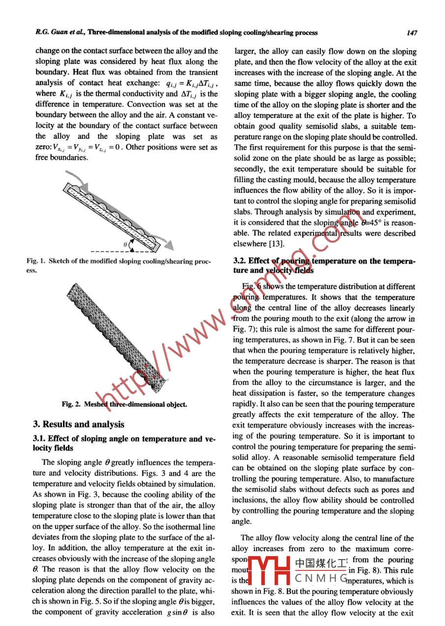 Journal of University of Science and Technology BejingMaterialsVolume 14, Number 2, April 2007, Page 146Three- dimensional analysis of the modified sloping cooling/shearing processRenguo Guan), Luolian Thang"), Chao Wang,", Jinglin Wen", and Jianzhong Cui2)1) College of Materials and Matallurgy, Northeastern University, Shenyang 10004, China2) Key Laboratory for Electromagnetic Processing of Materials, Northeasterm University, Shenyang 10004, China(Received 2006-05-28)Abstract: A self- designed setup of modified sloping cooling/shearing process was made to prepare the semisolid Al-3wt%Mg alloy. Athree dimensional simulation model was established for the analysis of preparing the semisolid Al-3wt%Mg alloy. Through simulationand experiment, it is shown that the sloping angle of the plate greatly afects temperature and velocity distributions, and the temperatureand velocity of the alloy at the exit of the sloping plate increase with the increase of the sloping angle. The alloy temperature decreaseslinearly from the pouring mouth to the exit. The alloy temperature at the exit increases obviously with the increase of pouringtemperature. To prepare the semisolid Al-3wt%Mg alloy with good quality, the sloping angle 0=45° is reasonable, and the pouringtemperature is suggested to be designed above 650-660°C but under 700eC.Key words: semisolid aloy; modified sloping cooling/shearing process; simulation; temperature; velocity[This work was financially supported by the National Natural Science Foundation of China (No.50604007) and the Natural ScienceFoundation of Liaoning Province, China (No.20062016).]1. Introductionlated by the finite element software of ANSYS pro-gram. Through simulation and experiment, pouringSemisolid forming has been studied for more thantemperature and sloping angle were optimized.thirty years,' and now it has been applied in automobile,electronic, and many other fields [1-9]. As a relative2. Modelnovel metal forming process, semisolid forming has2.1. Study objectbecome sophisticated in many western countries, butThe sketch of the modified sloping cooling/shearingits application in other countries is not successful [1-process is shown in Fig. 1. Molten alloy is poured on a13]. One of the problems is that semisolid forming issloping plate with wavelike surface, and is cooled andmore complicated than conventional forming processes,sheared by the plate and evolves to semisolid alloy.and the solidification process is not easy to accuratelyFlowing alloy in a steady state in the process was thecontrol. So it is more difficult to apply in industry.research object. Because heat dissipates rapidly fromSloping cooling/shearing process have been used toAl-3wt%Mg alloy to the sloping plate and the air, themanufacture finer grain materials in the past, but it hasalloy temperature decreases gradually. Material ther-been considered to be a new way of semisolid formingmal properties change gradually along with tempera-proposed in recent years [10-13]. It is simple for pre-ture decreasing. The specific heat capacity and thermalparing the semisolid alloy, and can be easily applied inconductivity of the alloy were considered to changeindustry. Nowadays, it has already been used to preparewith nonlinear style. The size of the research object is 2semisolid slabs of aluminum and magnesium basedmmx10 mmx60 mm, and the curvature radius of thealloys, but the microstructure formation and its relatedwaves is 0.5 mm. The three-dimensional object meshedthermal/fluid fields have not been studied yet [10-13].by FI中國煤化工Fig. 2.These problems are very important factors for pre-paring semisolid slabs. In this article, the sloping plate2.2.THCNMHGwas modified to be a new one with wavelike surfaceA constant pourng temperature on the pouring[14]. A modified sloping cooling/shearing process formouth of the sloping plate was set and was equal topreparing the semisolid Al-3wt%Mg alloy was simu-pouring temperature T:T(x,y,z,t)=To. Heat ex-Corre啊嗍數(shù)塘hor: Renguo Guan, E-mail: guanrenguo@ 126.comAlso available online at www sciencedirect.comRG. Guan et al, Three dimensional analysis of the modifhed sloping cooling/shearing process147change on the contact surface between the alloy and thelarger, the alloy can easily flow down on the slopingsloping plate was considered by heat flux along theplate, and then the flow velocity of the alloy at the exitboundary. Heat flux was obtained from the transientincreases with the increase of the sloping angle. At theanalysis of contact heat exchange: qi.j = K.jSTI.s,same time, because the alloy flows quickly down thewhere K,j is the thermal conductivity and OTrj is thesloping plate with a bigger sloping angle, the coolingdifference in temperature. Convection was set at thetime of the alloy on the sloping plate is shorter and theboundary between the alloy and the air. A constant ve-alloy temperature at the exit of the plate is higher. Tolocity at the boundary of the contact surface betweenobtain good quality semisolid slabs, a suitable tem-he alloy and the sloping plate was set asperature range on the sloping plate should be controlled.zero:Vx =Vym =Vzu =0. Other positions were set asThe first requirement for this purpose is that the semi-free boundaries.solid zone on the plate should be as large as possible;secondly, the exit temperature should be suitable forfilling the casting mould, because the alloy temperatureinfluences the flow ability of the alloy. So it is impor-tant to control the sloping angle for preparing semisolidslabs. Through analysis by simulation and experiment,it is considered that the sloping angle θ =459 is reason-able. The related experimental results were describedelsewhere [13].Fig. 1. Sketch of the modified sloping cooling/shearing proc-3.2. Effect of pouring temperature on the tempera-ess.ture and velocity fieldsFig. 6 shows the temperature distribution at differentpouring temperatures. It shows that the temperaturealong the central l