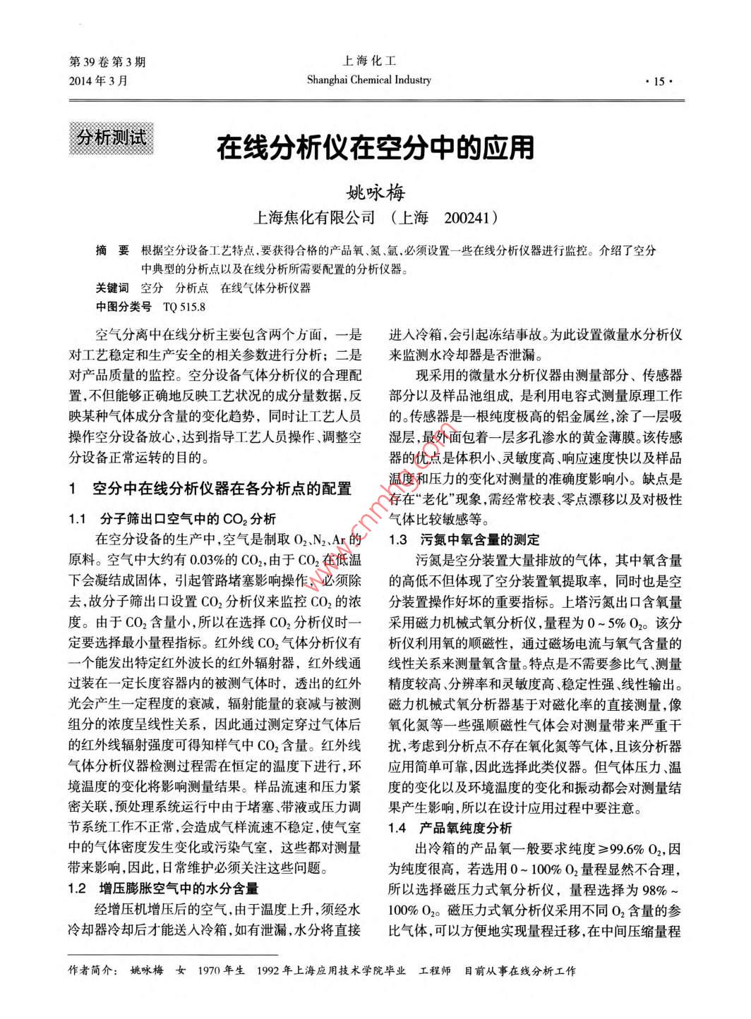 第39卷第3期上?;?014年3月Shanghai Chemical Industry分析測試在線分析儀在空分中的應(yīng)用姚詠梅上海焦化有限公司(上海200241)摘要根據(jù)空分設(shè)備工藝特點,要獲得合格的產(chǎn)品氧、氮、氬,必須設(shè)置一些在線分析儀器進(jìn)行監(jiān)控。介紹了空分中典型的分析點以及在線分析所需要配置的分析儀器關(guān)鍵詞空分分析點在線氣體分析儀器中圖分類號TQ5158空氣分離中在線分析主要包含兩個方面,一是進(jìn)入冷箱,會引起凍結(jié)事故。為此設(shè)置微量水分析儀對工藝穩(wěn)定和生產(chǎn)安全的相關(guān)參數(shù)進(jìn)行分析;二是來監(jiān)測水冷卻器是否泄漏。對產(chǎn)品質(zhì)量的監(jiān)控。空分設(shè)備氣體分析儀的合理配現(xiàn)采用的微量水分析儀器由測量部分、傳感器置,不但能夠正確地反映工藝狀況的成分量數(shù)據(jù),反部分以及樣品池組成,是利用電容式測量原理工作映某種氣體成分含量的變化趨勢,同時讓工藝人員的。傳感器是一根純度極高的鋁金屬絲,涂了一層吸操作空分設(shè)備放心,達(dá)到指導(dǎo)工藝人員操作、調(diào)整空濕層,最外面包著一層多孔滲水的黃金薄膜。該傳感分設(shè)備正常運轉(zhuǎn)的目的。器的優(yōu)點是體積小、靈敏度高、響應(yīng)速度快以及樣品1空分中在線分析儀器在各分析點的配置溫度和壓力的變化對測量的準(zhǔn)確度影響小。缺點是存在“老化”現(xiàn)象,需經(jīng)常校表、零點漂移以及對極性1.1分子篩出口空氣中的CO2分析氣體比較敏感等。在空分設(shè)備的生產(chǎn)中,空氣是制取O2、N2、Ar的13污氮中氧含量的測定原料??諝庵写蠹s有0.03%的CO2,由于CO2在低溫污氮是空分裝置大量排放的氣體,其中氧含量下會凝結(jié)成固體,引起管路堵塞影響操作,必須除的高低不但體現(xiàn)了空分裝置氧提取率,同時也是空去,故分子篩出口設(shè)置CO2分析儀來監(jiān)控CO2的濃分裝置操作好壞的重要指標(biāo)。上塔污氮出口含氧量度。由于CO2含量小,所以在選擇CO2分析儀時一采用磁力機(jī)械式氧分析儀,量程為0~5%O2。該分定要選擇最小量程指標(biāo)。紅外線CO2氣體分析儀有析儀利用氧的順磁性,通過磁場電流與氧氣含量的一個能發(fā)出特定紅外波長的紅外輻射器,紅外線通線性關(guān)系來測量氧含量。特點是不需要參比氣、測量過裝在一定長度容器內(nèi)的被測氣體時,透出的紅外精度較高、分辨率和靈敏度高、穩(wěn)定性強(qiáng)、線性輸出。光會產(chǎn)生一定程度的衰減,輻射能量的衰減與被測磁力機(jī)械式氧分析器基于對磁化率的直接測量,像組分的濃度呈線性關(guān)系,因此通過測定穿過氣體后氧化氮等一些強(qiáng)順磁性氣體會對測量帶來嚴(yán)重干的紅外線輻射強(qiáng)度可得知樣氣中CO2含量。紅外線擾,考慮到分析點不存在氧化氮等氣體,且該分析器氣體分析儀器檢測過程需在恒定的溫度下進(jìn)行,環(huán)應(yīng)用簡單可靠因此選擇此類儀器。但氣體壓力、溫境溫度的變化將影響測量結(jié)果。樣品流速和壓力緊度的變化以及環(huán)境溫度的變化和振動都會對測量結(jié)密關(guān)聯(lián),預(yù)處理系統(tǒng)運行中由于堵塞、帶液或壓力調(diào)果產(chǎn)生影響,所以在設(shè)計應(yīng)用過程中要注意節(jié)系統(tǒng)工作不正常,會造成氣樣流速不穩(wěn)定,使氣室14產(chǎn)品氧純度分析中的氣體密度發(fā)生變化或污染氣室,這些都對測量出冷箱的產(chǎn)品氧一般要求純度≥996%O2,因帶來影響,因此,日常維護(hù)必須關(guān)注這些問題。為純度很高,若選用0~100%O2量程顯然不合理,1.2增壓膨脹空氣中的水分含量所以選擇磁壓力式氧分析儀,量程選擇為98%經(jīng)增壓機(jī)增壓后的空氣,由于溫度上升,須經(jīng)水100%O2。磁壓力式氧分析儀采用不同O2含量的參冷卻器冷卻后才能送入冷箱,如有泄漏,水分將直接比氣體,可以方便地實現(xiàn)量程遷移,在中間壓縮量程作者簡介:姚詠梅女1970年生1992年上海應(yīng)用技術(shù)學(xué)院畢業(yè)工程師目前從事在線分析工作上?;さ?9卷內(nèi),可有效提高測量的精度。一般選用零點遷移型的析器調(diào)試應(yīng)注意:(1)儀器必須在通氣的情況下預(yù)儀器,由于易受大氣壓力變化的影響,需要壓力補(bǔ)熱,否則會燒壞敏感組件;(2)儀器必須在預(yù)熱穩(wěn)定償后再進(jìn)行調(diào)試或校準(zhǔn),通常必須在熱導(dǎo)檢測器加熱1.5氬餾分中氬含量分析至恒溫狀態(tài)時,才可以進(jìn)行測試;(3)儀器的樣氣流氬餾分是制造粗氬的原料氣,掌握氬餾分的成量應(yīng)保持穩(wěn)定,測試時應(yīng)調(diào)節(jié)在規(guī)定的流量值內(nèi)。分組成,對調(diào)整粗氬塔的正常工作,指導(dǎo)氬塔和主塔1.6粗氬中氧含量分析的操作十分重要。粗氬塔出口的氣體成分組成是:Ar≥98.5%、氬餾分由Ar、O2和N2三種氣體組成。氬餾分中N2≤1.5%產(chǎn)品氬含量是重要的工藝控制指標(biāo),一般的氬并不是含量越高越好,在氬餾分中氬含量提高控制在O2≤2×106。氧化鋯氧分析儀的優(yōu)點是測量的同時,氮含量也會提高;而氮含量的提高會破壞氬范圍比較寬,壽命比較長,但由于其在測量特別小的塔的正常工作,嚴(yán)重時會引起氮塞,所以必須控制好氧含量時容易受到還原性氣體成分的干擾而產(chǎn)生測其成分組成。根據(jù)工
