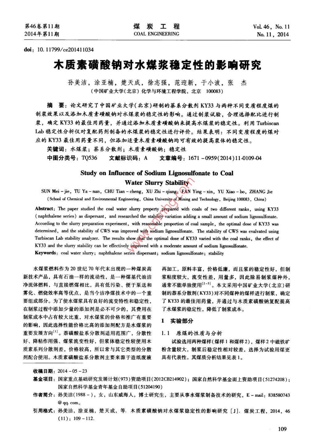 木質(zhì)素磺酸鈉對水煤漿穩(wěn)定性的影響研究