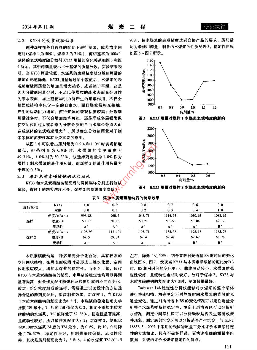第46卷第11期煤炭工程VoL 46. No. 112014年第11期COAL ENGINEERINGNo.11,2014doi:10.11799/c201411034木質(zhì)素磺酸鈉對水煤漿穩(wěn)定性的影響研究孫美潔,涂亞楠,楚天成,徐志強,范迎新,于小波,張杰(中國礦業(yè)大學(北京)化學與環(huán)境工程學院,北京100083)摘要:論文研究了中國礦業(yè)大學(北京)研制的萘系分散劑KY33與兩種不同變質(zhì)程度煤的制漿效果以及添加木質(zhì)素磺酸鈉對水煤漿的穩(wěn)定性的影響。通過制漿試驗,合理選擇配比進行制漿,確定KY3的最佳用藥量,并通過添加木質(zhì)素磺酸鈉來提高水煤漿的穩(wěn)定性。利用 TurbiscanIab穩(wěn)定性分析儀對復配藥劑制備的水煤漿的穩(wěn)定性進行評價。結(jié)果表明:不同變質(zhì)程度的煤對應的KY33最佳用藥量不同,但添加適量木質(zhì)素磺酸鈉均可有效的提高漿體的穩(wěn)定性。關鍵詞:水煤漿;蔡系分散劑;木質(zhì)素磺酸鈉;穩(wěn)定性中圖分類號:TQ536文獻標識碼:A文章編號:1671-0959(2014)114010904Study on Influence of Sodium Lignosulfonate to CoalWater Slurry StabilitySUN Mei-jie, TU Ya-nan, CHU Tian-cheng, XU Zhi-qiang, FAN Ying-xin, YU Xiao-bo, ZHANG Jie( School of Chemical and Environmental Engineering, China University of Mining and Technology, Beijing 100083, China)Abstract: The paper studied the coal water slurry property prepared with coals of two different ranks, using KY33(naphthalene series)as dispersant, and researched the stability variation adding a small amount of sodium lignosulfonateAccording to the slurry preparation experiment, with reasonable proportion of coal sample, the optimal dose of KY33 wasdetermined, and the stability of CWS was improved with sodium lignosulfonate. The stability of CWS was evalvated usingTurbiscan Lab stability analyzer. The results show that the optimal dose of KY33 varied with the coal ranks, the effect ofKY33 and the slurry stability can be effectively improved with a moderate amount of sodium lignosulfonateKeywords: coal water slurry; naphthalene series dispersant; sodium lignosulfonate; stability水煤漿燃料作為20世紀η0年代末出現(xiàn)的一種煤炭高再加工,原料豐富,價格低廉,而且漿的穩(wěn)定性好,但制新技術產(chǎn)品,具有石油一樣的流動性,是一種煤基代油潔漿粘度較大,流變性差,用量多,因此除易制漿煤種外,凈流體燃料,與直接燃煤相比,具有低污染、便于泵送和通常不能單獨使用2。本文采用中國礦業(yè)大學(北京)研霧化、燃燒效率高等優(yōu)點,是當今潔凈煤技術中的一個重制的萘系分散劑(KY33)對不同煤種的煤樣進行制漿,確定要組成部分。為了使水煤漿具有良好的流變特性和穩(wěn)定性,了KY33的最佳用藥量,并通過與木質(zhì)素磺酸鈉復配提高在制漿過程中添加少量的添加劑是必不可少的,其費用在了水煤漿的穩(wěn)定性,降低了制漿成本。制漿成本中占有較大比重,對水煤漿的價格和推廣有重要的影響,因此選擇性能價格比高的添加劑配方是水煤漿的1實驗部分重要發(fā)展方向。萘磺酸鹽系分散劑適用范圍廣,分散性1.1原煤的性質(zhì)與分析好、降粘作用強、煤漿流變性好,但漿體穩(wěn)定性較使用木試驗選用兩種煤樣(煤樣1和煤樣2),煤樣2中磁鐵礦質(zhì)素系列分散劑差,價格較高,所以常與其它類型的分散粉含量較大,制漿后穩(wěn)定性相對較差,選擇為試驗用煤更劑配合使用。木質(zhì)素磺酸鹽系分散劑主要來源于造紙廢液具有代表性。其煤質(zhì)分析結(jié)果見表1。收稿日期:2014-05-23基金項目:國家重點基礎研究發(fā)展計劃(973)資助項目(2012CB2l4902);國家自然科學基金面上資助項目(51274208);國家自然科學基金青年基金自助項目(51204190)作者簡介:孫美潔(1988-),女,山東威海人,博士研究生,主要從事水煤漿制備技術的研究,E-mail:838580743qq como引用格式:孫美潔,涂亞楠,楚天成,等.木質(zhì)素磺酸鈉對水煤漿穩(wěn)定性的影響研究[J].煤炭工程,2014,4(11):109-112研究探討煤炭工程2014年第11期表1煤樣的工業(yè)分析和元素分析煤樣煤樣119.1051.100.67煤樣21.1310.5338.74.015.76l.241.2試驗主要儀器下的水煤漿粘度值,采用計算機軟件計算并繪制流變曲線試驗主要儀器有顎式破碎機、自制球磨機,LS-C(1)判定水煤漿的流變特性,取剪切速率為100時的粘度為型歐美克激光粒度儀,自制高扭力攪拌器, Sartorius ma35表觀粘度,且低于1200mPa·s的水煤漿作為合格產(chǎn)品。型全自動水分儀,NXS11-B型旋轉(zhuǎn)粘度計, Turbiscan Lab3)水煤漿的流動性。水煤漿的流動性采用目測法,根型全能的分散穩(wěn)定性分析儀。據(jù)其流動狀態(tài),分為A、B、C、D四個等級,劃分標準為:1.3煤樣的制備及粒度分析A一不間斷流動;B一間斷流動,呈稠流狀;C一間斷流動試驗所用煤樣均釆用顎式破碎機破碎后,給入球磨機呈稀糊狀;D不流動。根據(jù)水煤漿流動性的具體情況,可進行粉磨,磨制不同時間的煤樣分別作為粗樣和細樣。為以細分為“+”,“-”級別。保證水煤漿制備的粒度要求,粒度不大于0.3mm,又避免4)水煤漿的穩(wěn)定性。水煤漿的穩(wěn)定性采用全能的穩(wěn)定粗樣過磨造成粒度過細,影響堆積效果,制備粗樣時需給性分析儀 Turbiscan Lab測定,將制備的水煤漿倒入配套的入0.3m篩進行篩分,+0.3m粒度級含量低于2%時,樣品瓶中,樣品高度約為45mm,利用背散射光檢測器和近停止粉磨,并將篩下物作為粗樣。采用激光粒度儀對煤樣紅外光源(波長880mm)在55m長度的樣品瓶上每40m掃的粒度進行分析,并計算堆積效率評價指標E。在一定范描一