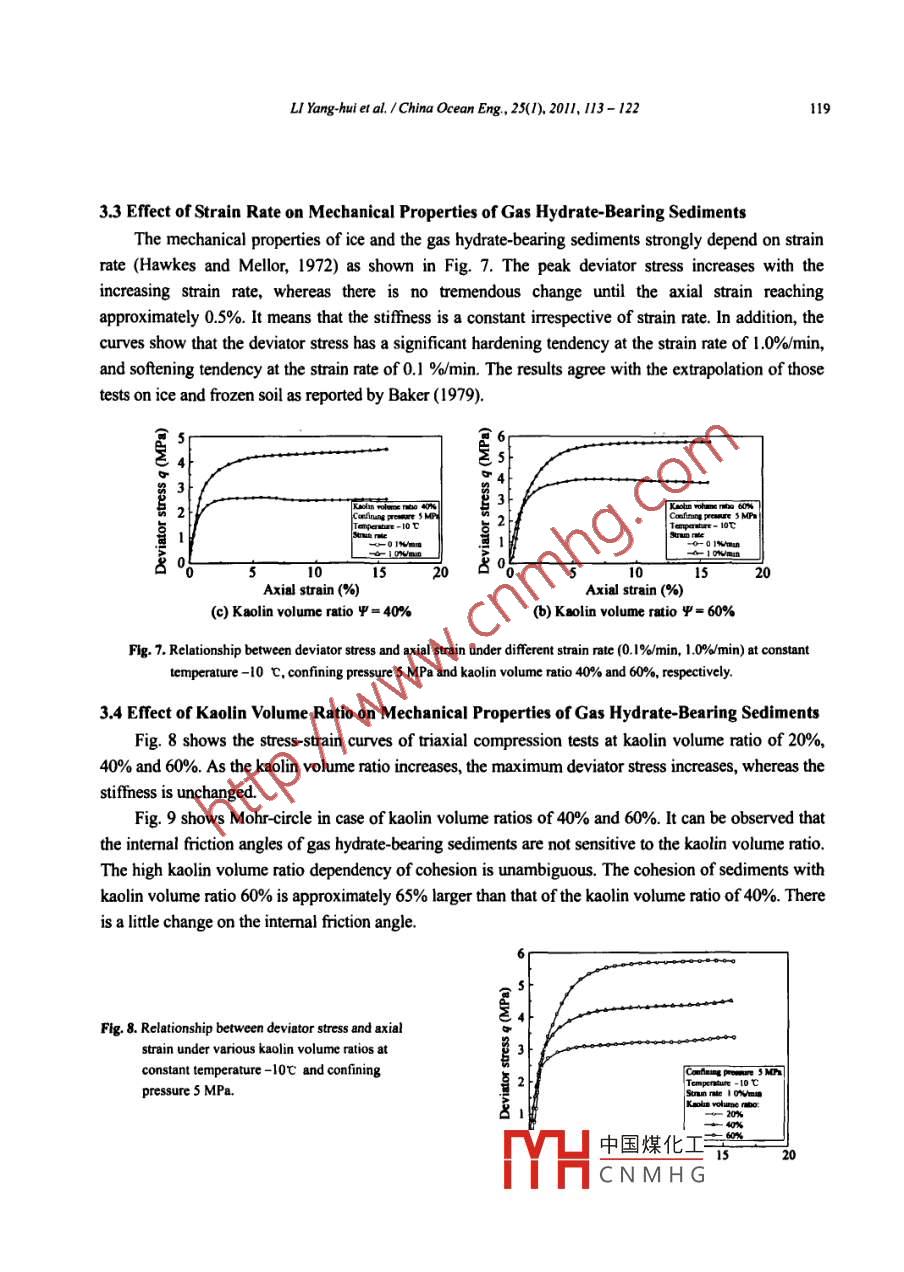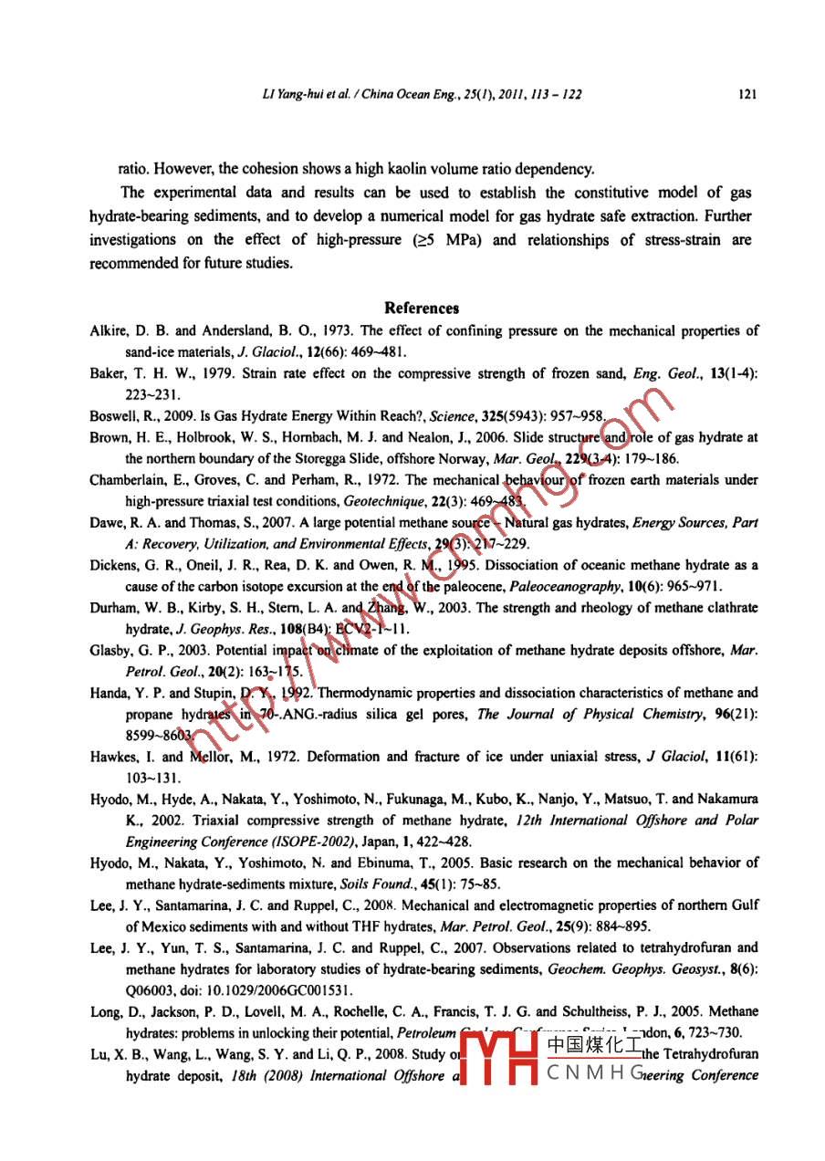 China Ocean Eng. Vol.25, No.1, pp.113- 122。2011 Chinese Occan Engincering Society and Springr-Verlag Berlin HeidelbergDOI 10.1007/513344-0110009-6Experimental Study on Mechanical Properties of Gas Hydrate-BearingSediments Using K aolin Clay'LI Yang-hui (李洋輝), SONG Yong-chen (宋永臣), YU Feng(于鋒), .LIU Wei-guo (劉衛(wèi)國(guó)) and ZHAO Jia-fei (趙佳飛)Key Laboratony of Ocean Energy Utilization and Energy Conservation of Ministry of Education,Dalian University of Technology, Dalian 116024, China(Received 21 January 2010; received revised form 10 September 2010; accepted 8 October 2010)ABSTRACTA triaxial system is designed with a temperature range from -20 C to 25 C and a pressure range from 0 MPa to 30MPa in order to improve the understanding of the mechanical properties of gas hydrate-bearing sediments. The mechanicalproperties of synthetic gas hydrate-bearing sediments (gas hydrate-kaolin clay mixture) were measured by using curentexperimental apparatus. The results indicate that: (1) the failure strength of gas hydrate-bearing sediments strongly dependson the temperature. The sediment' s strength increases with the decreases of temperature. (2) The maximum deviator stessincreases linearly with the confining pressure at a low-pressure stage. However, it fuctuates at a high-pressure stage. (3)Maximum deviator stress increases with increasing strain rate, whereas the stan-stress curve has no remendous changeuntil the axial strain reaches approximately 0.5%. (4) The intemal friction angles of gas hydrate-bearing sediments are notsensitive to kaolin volume ratio. The cohesion shows a high kaolin volume ratio dependency.Key words: gas hydrate; mechanical properies; marine sediment; triaxrial testing; safe extraction1. IntroductionIn recent years the extraction of gas hydrate as a potential resource of hydrocarbon energy isbeing investigated (Long et al, 2005; Pierce, 2005; Boswell, 2009), and a large amount of gas hydratein the permafrost and marine sediments has been estimated (Milkov, 2004; Dawe and Thomas, 2007).Gas hydrate is an ice-like crystalline substance that is essentially frozen methane. Its structureconsists of a gas molecule surrounded by a cage of water molecules (Ripmeester et al, 1987; Sloan,1998). It is stable under conditions of low temperature and high pressure. While drilling forexploration and exploitation, temperature and/or pressure changes can modify the gas hydrateequilibrium conditions and induce gas production. Gas may alter significantly the mechanical strengthof the marine sediments (Vanoudheusden et al, 2004), which can initiate landslides on the slope andrise, then lead to tsunami and methane leak which may influence the global climate (Dickens et al,1995; Glasby, 2003; Brown el al, 2006). Therefore, experimental test on mechanical properties of gas●This work was supported by the National High Technology Research a中國(guó)煤化工63 Progem, Crant No.2006AA09A209) the Major National S&T Program (Grant No. 20082Research DevelopmentPrugram of China (973 Program, Grant No.2009CB219507) and theMYHCNMHGhofChinCranNo.91010015).1 Coresponding author. E-mail: songyc@dlut.edu.cnLI Yang-hui et al. / China Ocean Eng. 25(1), 2011, 113-122hydrate-bearing sediments plays an important role in the safe extraction of gas hydrate.Considerable researches on the physical/chemical properties have been conducted previously inorder to allow a safe extraction of gas hydrate (Ripmeester and Ratlffe, 1988; Handa and Stupin,1992). The impact of tetrahydrofuran (THF) which is used to simulate gas hydrate on the mechanicalstrength of host sediments has long been investigated in the geotechnical literatures (Lee et al, 2007,2008; Yun et al, 2007). Although THF hydrate has many physical properties similar to those ofmethane hydrates, it is still a“proxy" for methane hydrate. Researchers further investigated themechanical properties of gas hydrate-bearing sediments using both synthetic and actual marinesediments (Stem et al, 1996; Durham et al, 2003; Vanoudheusden et al, 2004; Hyodo et al, 2005).They indicated that the mechanical properties of methane hydrate are very different from those ofwater ice. Some uniaxial compression tests have been carried out under a series of low temperatureconditions (Stern et al, 1996; Durham et al, 2003). However, it is vital to study the mechanicalproperties of gas hydrate under various conditions such as temperature, confining pressure, strain rateand saturation. Researchers used triaxial testing apparatus to measure mechanical properties of actualand synthetic gas hydrate or gas hydrate-bearing sediments with limited success (Hyodo et al, 2002,2005; Masui et al., 2007, 2008a, 2008b). Further exploration of mechanical properties is required inorder to assess the stability of gas hydrate-bearing sediments.In this study, a puposely designed low-temperature and high-pressure triaxial testing system wassetup for the mechanical property measurements. Tests on synthetic gas hydrate-bearing sedimentcores, which were used to simulate marine sediments, were conducted and its mechanical propertiesunder various conditions were investigated.2. ExperimentThe schematic diagram of the triaxial testing system is shown in Fig. 1. The system can simulatein situ pressure and temperature conditions in a cylindrical sediment sampler (50 mm in diameter and100 mm in height). Triaxial compression tests can be carried out in the temperature ranging from-20C to 25C (normal loading capacity 60 kN, and lateral pressure loading capacity 30 MPa).Confining pressure and axial load are contolled automatically by using two EDC (Extemal DigitalController, made in DOLI Co. of Germany). The temperature of the specimen placed in pressurechamber is adjusted by circulating cell liquid from thermostatic bath and heat exchanger. Thethermocouple (with accuracy of 0.5"C) and the pressure sensor (with accuracy of0.01 MPa) are in thepressure chamber to measure the tempera