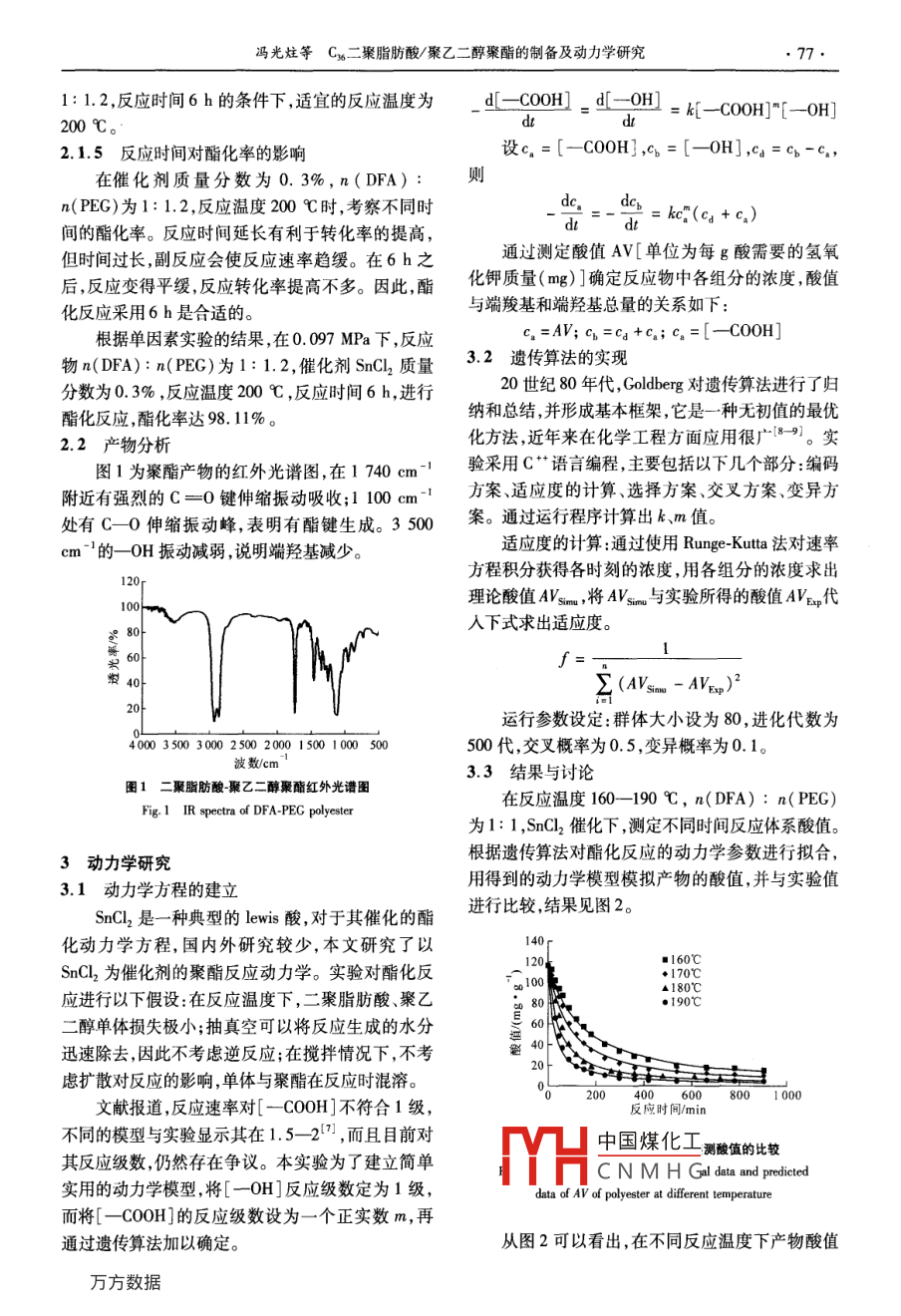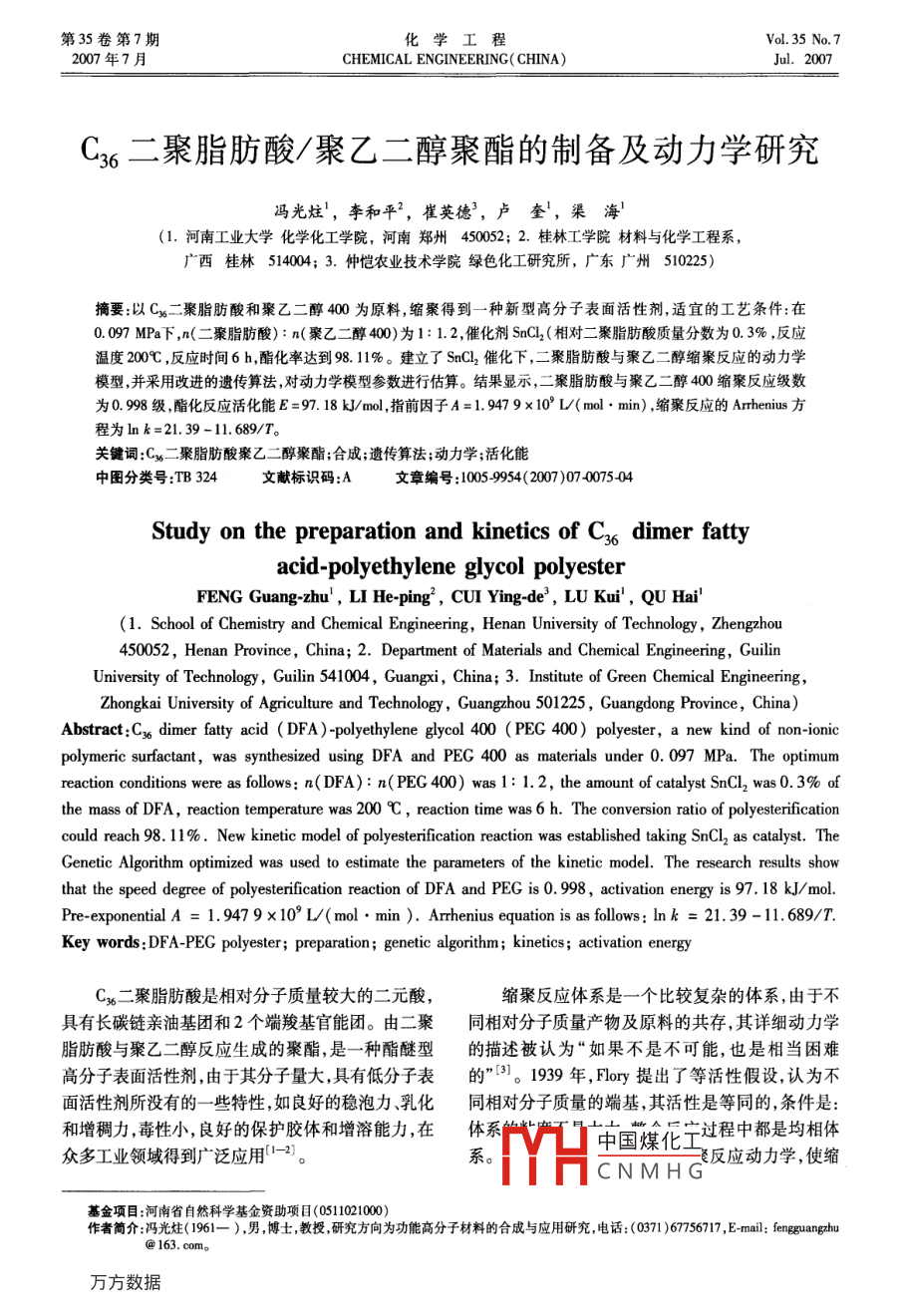 第35卷第7期化學(xué)工程Vol. 35 No.72007年7月CHEMICAL ENGINEERING( CHINA)Jul. 2007C36二聚脂肪酸/聚乙二醇聚酯的制備及動(dòng)力學(xué)研究馮光炷',李和平”,崔英德,盧奎',渠海'(1. 河南工業(yè)大學(xué)化學(xué)化工學(xué)院,河南鄭州450052; 2.桂林工學(xué)院材料與化學(xué)工程系,廣西桂林514004; 3.仲愷農(nóng)業(yè)技術(shù)學(xué)院綠色化工研究所,廣東廣州510225)摘要:以Cx二聚脂肪酸和聚乙二醇400為原料,縮聚得到一種新型高分子表面活性劑,適宜的工藝條件:在0.097 MPa下,n(二聚脂肪酸): n(聚乙二醇400)為1: 1.2,催化劑SnCl2(相對二聚脂肪酸質(zhì)量分?jǐn)?shù)為0. 3% ,反應(yīng)溫度200C ,反應(yīng)時(shí)間6 h,酯化率達(dá)到98.11%。建立了SnCl2 催化下,二聚脂肪酸與聚乙二醇縮聚反應(yīng)的動(dòng)力學(xué)模型,并采用改進(jìn)的遺傳算法,對動(dòng)力學(xué)模型參數(shù)進(jìn)行估算。結(jié)果顯示,二聚脂肪酸與聚乙二醇400縮聚反應(yīng)級數(shù)為0.998級,酯化反應(yīng)活化能E =97.18 kJ/mol,指前因子A=1.9479x 10% L/( mol . min) ,縮聚反應(yīng)的Arrhenius 方程為ln k=21.39 -11.689/T。關(guān)鍵詞:Cx二聚脂肪酸聚乙二醇聚酯;合成;遺傳算法;動(dòng)力學(xué);活化能中圖分類號(hào):TB 324文獻(xiàn)標(biāo)識(shí)碼:A文章編號(hào):005-954(2007 )07 0075-04Study on the preparation and kinetics of C36 dimer fattyacid-polyethylene glycol polyesterFENG Guang-zhu' , LI He-ping2 , CUI Ying-de' , LU Kui' , QU Hai'(1. School of Chemistry and Chemical Engineering, Henan University of Technology , Zhengzhou450052, Henan Province, China; 2. Department of Materials and Chemical Engineering, GuilinUniversity of Technology , Guilin 541004, Guangxi , China; 3. Institute of Green Chemical Engineering,Zhongkai University of Agriculture and Technology , Guangzhou 501225 , Guangdong Province ,China)Abstract:C36 dimer fatty acid ( DFA )-polyethylene glycol 400 ( PEG 400) polyester, a new kind of non-ionicpolymeric surfactant, was synthesized using DFA and PEG 400 as materials under 0. 097 MPa. The optimumreaction conditions were as follows: n( DFA): n(PEG 400) was1: 1. 2, the amount of catalyst SnCl2 was 0.3% ofthe mass of DFA, reaction temperature was 200 C, reaction time was 6 h. The conversion ratio of polyesterificationcould reach 98.11 %. New kinetic model of polyesterification reaction was established taking SnCl2 as catalyst. TheGenetic Algorithm optimized was used to estimate the parameters of the kinetic model. The research results showthat the speed degree of polyesterification reaction of DFA and PEG is 0. 998, activation energy is 97. 18 kJ/ mol.Pre-exponential A = 1. 947 9x10° L/( mol●min ). Arhenius equation is as fllows: Ink = 21. 39 -11.689/T.Key words:DFA-PEG polyester; preparation; genetic algorithm; kinetics ; activation energyC%二聚脂肪酸是相對分子質(zhì)量較大的二元酸,縮聚反應(yīng)體系是一一個(gè)比較復(fù)雜的體系,由于不具有長碳鏈親油基團(tuán)和2個(gè)端羧基官能團(tuán)。由二聚同相對分子質(zhì)量產(chǎn)物及原料的共存,其詳細(xì)動(dòng)力學(xué)脂肪酸與聚乙二醇反應(yīng)生成的聚酯,是一種酯醚型的描述被認(rèn)為“如果不是不可能,也是相當(dāng)困難高分子表面活性劑,由于其分子量大,具有低分子表.的”[3]。1939 年, Flory提出了等活性假設(shè),認(rèn)為不面活性劑所沒有的-些特性,如良好的穩(wěn)泡力、乳化同相對分子質(zhì)量的端基,其活性是等同的,條件是:和增稠力,毒性小,良好的保護(hù)膠體和增溶能力,在體系廣中國煤化寧過程中都是均相體眾多工業(yè)領(lǐng)域得到廣泛應(yīng)用1-2。系。(反應(yīng)動(dòng)力學(xué),使縮MYHCNMHG基金項(xiàng)目:河南省自然科學(xué)基金資助項(xiàng)目(0511021000)作者簡介:馮光炷(1961- ), 男,博士,教授,研究方向?yàn)楣δ芨叻肿硬牧系暮铣膳c應(yīng)用研究,電話: (0371 )67756717 , E mail: fengguangzhu@ 163. com。●76●化學(xué)工程2007 年第35卷第7期聚反應(yīng)的動(dòng)力學(xué)可以被當(dāng)作簡單酯化反應(yīng)來處理。反應(yīng)體系后,可有效降低副反應(yīng)的發(fā)生,提高酯化通過該假設(shè)推導(dǎo)出的動(dòng)力學(xué)模型稱為Flory方程,在率。比較后實(shí)驗(yàn)選用SnCl2作為催化劑。甲苯磺酸為催化劑,總反應(yīng)級數(shù)為2的情況下,其動(dòng)力學(xué)方程如下:表1不同催化劑對酯化反應(yīng)的影響dc_Table l Effect of catalyst on esterification ratio= k'[ 0H][ CO0H]Ht加人質(zhì)量分?jǐn)?shù)/%酯化率/%色澤本文根據(jù)Flory等活性假設(shè),以二聚脂肪酸和聚無63.71透明淺黃濃硫酸0.394.02黑色乙二醇縮聚為研究對象,對酯化反應(yīng)動(dòng)力學(xué)方程加對甲苯磺酸94.38透明深紅色以改進(jìn),采用優(yōu)化的遺傳算法(4),對動(dòng)力學(xué)參數(shù)進(jìn)氯化亞錫93.85透明亮黃行估算,測定酯化縮聚反應(yīng)活化能。2.1.2催化劑 質(zhì)量分?jǐn)?shù)對酯化率的影響1實(shí)驗(yàn)部分固定反應(yīng)溫度200 C,反應(yīng)時(shí)間5 h,.1 主要試劑及儀器n(DFA): n( PEG)為1: 1.2,不同時(shí)間取樣分析酸C36二聚脂肪酸,浙江永在化學(xué)化工有限公司;值,計(jì)算酯化率,實(shí)驗(yàn)結(jié)果見表2,可以看出,催化劑聚乙二醇400,天津博迪化工有限公司;氯化亞錫,相對二聚脂肪酸質(zhì)量分?jǐn)?shù)達(dá)到0.3%時(shí),酯化率達(dá)中國醫(yī)藥公司北京采購供應(yīng)站。到98.01% ,再增大質(zhì)量分?jǐn)?shù),酯化率不再提高,故Prestige-21 型紅外光譜儀,日本島津。催