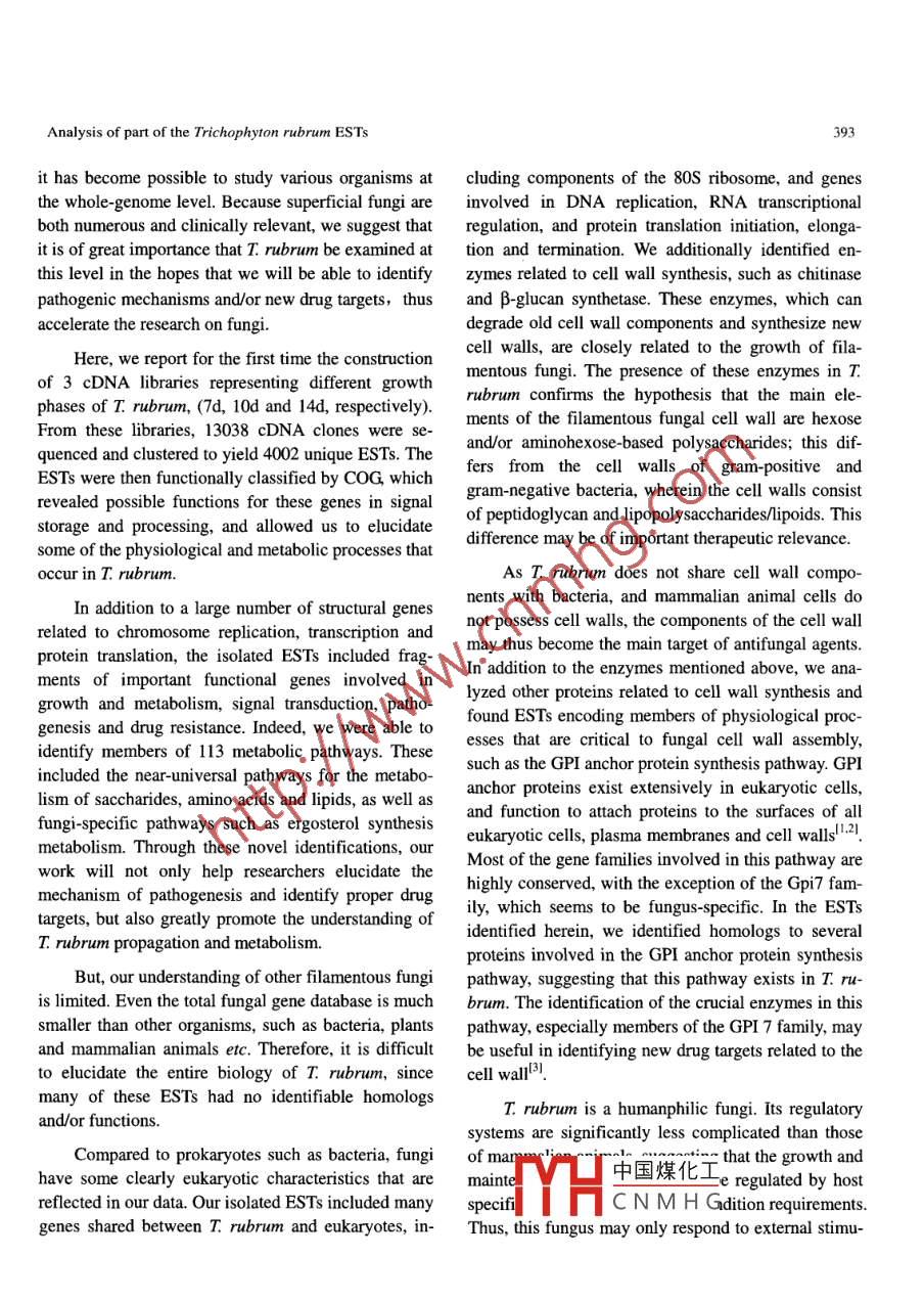 Science in China Ser. C Life Sciences 2004 Vol.47 No.5 389- -395389Analysis of part of the Trichophyton rubrum ESTsWANG Lingling', MA Li", LENG Wenchuan', YANG Jian2, ZHU Junping', DONG Jie',XUE Ying', WAN Zhe', LI Ruoyu3 & JIN Qi11. State Key Laboratory For Molecular Virology and Genetics Enginering, Beijing 100176, China;2. Chinese National Human Genome Center, Beijing, Beijing 100176, China;3. Research Centre for Medical Mycology, Beijing 100034, ChinaCorrespondence should be addressed to Jin Qi (email: zdsys @ sina.com)Received May 30, 2003; revised August 30, 2003Abstract Trichophyton rubrum (T. rubrum) is the most common of the superficial fungi. In aneffort to better understand the genetic and biochemical makeup of T. rubrum, we generatedcDNA libraries from 3 growth stages and used these to isolate 4002 unique expressed sequencetags (ESTs). Sequence comparisons with the Genbank database allowed 1226 of the ESTs to beassigned putative functions or matched with homologs from other organisms. Of the remainingESTs, 989 were only weakly similar to known sequences and 1787 had no identifiable functions,suggesting that they represent novel genes. We further analyzed the presence of several im-portant genes involved in the growth, metabolism, signal transduction, pathogenesis and drugresistance in T. rubrum. This information was used to newly elucidate important metabolic path-ways in T. rubrum. Taken together, our results should form the molecular basis for continued re-search on the physiological processes and pathogenic mechanisms of T. rubrum, and may leadto a better understanding of fungal drug resistance and identification of new drug targets.Keywords: Trichophyton rubrum, functional genomics, cDNA library, expressed sequence Tags, drug targets.DOI: 10.1360/03yc0107Superficial fungi are the etiologic pathogens ofclinical drugs are not particularly effective; therefore itvarious dermatophytoses, such as tinea capitis, tineais important that we study the pathogeneses of super-corporis, tinea inguinalis, tinea manus, tinea unguiumficial fungi and use this data to develop new therapeu-and tinea pedis. These widespread infections affect uptic agents and identify novel drug targets.to 25% of the world's population, a percentage thathas continued to increase in recent years. T. rubrum is .To date, functional fungal genomics have notthe most common superficial fungus, accounting for atbeen extensively studied; fungal genomes containleast 60% of all infections of this type. T. rubrum canvarious non-coding regions, including regulatoryinduce dermatophytoses in different parts of the hu-components, introns and repeat sequences, makingman skin, and can also cause deeper infections such asthese genomes much larger and more complicated thankerion, abscesses and granulomas. Superficialthose of bacteria. Thus, the sequencing of entire fungalfungi-induced dermatophytoses are obstinate andgenomes has not proven sufficient for elucidation ofreadily relapse and re-infect. The commonly usedthe o\中國煤化工and expression pa-YHCNMHG* These authors contributed equally to this work.tPresent address: Institute of Molecular Immunology, the First Military Medical University, Guangzhou 510515. China.Copyright by Science in China Press 2004390Science in China Ser. C Life Sciencestterns of these organisms.The mixtures were centrifuged and the supermatantAdams et al. used EST analysis as a new apwas discarded. The pelleted mycelia were washedproach for studying the functions of genes in organ-twice with PBS.isms, including those with completely sequenced ge-1.3 Isolation and purification of total RNA andnomes. With the continued progress of the human gmRNAnome project, the use of EST technology has spread toTotal RNA and mRNA were isolated and purifiedmany fields, including homolog identification, genefollowing the protocols of the RNeasy Plant Mini Kitexpression profiling and novel gene detection. ESTand the Oligotex mRNA Mini Kit, respectivelyanalysis techniques have accelerated the identification(QIAGEN). .and analysis of novel genes, hence facilitating researchon various eukaryotic organisms.1.4 Construction of the cDNA libraryHere, we report the construction and analysis of 3The cDNA libraries were constructed followingT. rubrum cDNA libraries derived from various de-the protocols of the SUPERSCRIPT M Plasmid Sys-velopmental stages. We obtained 4002 first-passtem with GATEWAYTM Technology for cDNA Syn-unique ESTS and used sequence analysis and databasethesis and Cloning (Invitrogen).searching to identify known genes, define putative1.5 Isolation and purification of plasmids, and se-novel genes, and propose some possible metabolicquencing of clonesnetworks present in this superficial fungus. These re-The cDNA plasmids were isolated by the Milli-sults may provide the molecular basis for further re-search on the metabolism, pathogenesis and drug re-pore method using MADV filter plates. Sequencingwas performed with a generic T7 primer located 5'sistance of T. rubrum.upstream of the inserted segments, following the pro-1 Methods and materialstocol of the PRISM Big Dye Terminator Kit on an.1 Preparation of strains and materialsABI3700 automated sequencer.T. rubrum (strain BMU01672) was isolated from1.6 Bioinformatic analysesnail scraps of a patient suffering from tinea unguium.(i) Sequence data processing. The trace filesThe patient was seen at a clinic in the West City Sec-from the sequencer were basecalled by Phred with thetion of Beijing, China, in October of 2000. Strain ref-quality value set at >Q15. Then, the cross_ matcherence samples were stored at the Research Centre forsoftware from the Phrap package (ttp://www.phrap.Medical Mycology, Beijing. The strain was confirmedorg) was used to remove vector sequences. The polyAas T rubrum by morphologic identification, as well astails were clipped from some of the ESTs with thby PCR amplification and sequencing of the 18S ri-Trimmest program from the EMBOSS pa