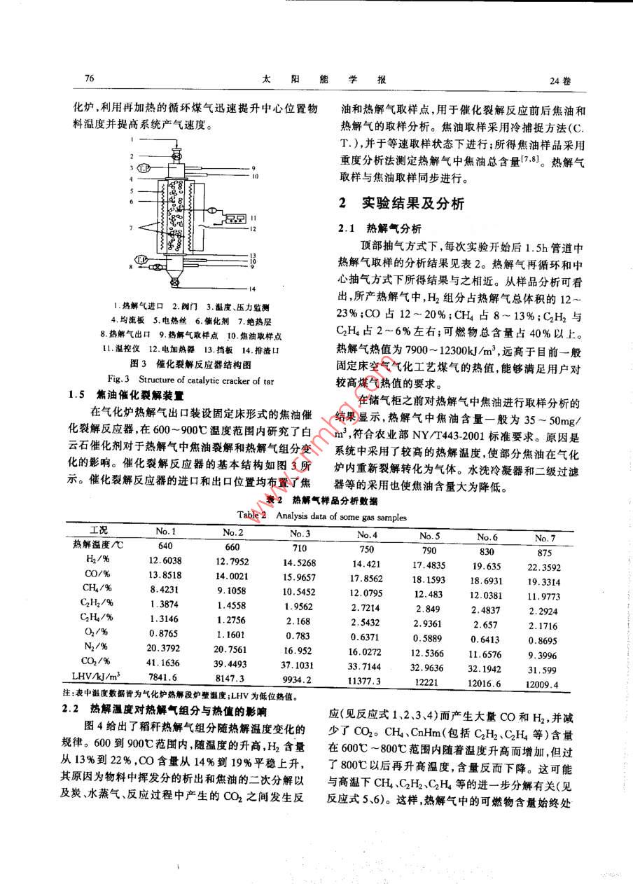 第24卷第1期太陽能學(xué)報Vol.24,No.12003年2HACTA FENERGIAE SOLARIS SINICAFeb. ,2003文章編號:0254 0962003)01 0074.06生物質(zhì)中熱值氣化技術(shù)中試實驗張曉東,周勁松,駱仲泱,王鐵柱,許明,岑可法(能源潔凈利用與環(huán)境L積教育部重點實驗室,浙江大學(xué)熱能上程研究所,杭州31002)摘妻:利用浙江大學(xué)熱能工程研究所開發(fā)的 -種新型生物質(zhì)熱解氣化中試實驗臺研究了帽稈熱解過程。通過對熱解氣組分和熱值等的分析,研究熱解溫度、抽氣方式箏因索對熱解氣和熱解過程的影響。針對目前有關(guān)楣稈熱解氣中焦油的研究數(shù)據(jù)較少的情況,實驗中采用白云石為催化朗,在固定床反應(yīng)器上對熱解氣中焦油的催化裂解進行了研究,焦油縮減效率可達(dá)80~-90%,并提高了熱解氣品質(zhì)。關(guān)鍵詞:生物質(zhì);氣化;中熱值;焦油;催化裂解中圈分類號:TK6文獻(xiàn)標(biāo)識碼:A發(fā)生干餾裂解,以產(chǎn)生較為潔凈的中熱值熱解氣。0引言同時,將氣化和燃燒過程有機結(jié)合,采用內(nèi)加熱方式由于能源利用與環(huán)境保護等方面的原因,生物提升氣化爐溫度,而不需要額外的加熱設(shè)備,使系統(tǒng)質(zhì)能源利用技術(shù)已成為目前研究的熱點。我國生物得以簡化。質(zhì)資源豐富,在廣大的農(nóng)村地區(qū),每年產(chǎn)生大量的各熱解氣中的焦油對于氣化系統(tǒng)和用氣設(shè)備的運種農(nóng)林廢棄物,僅農(nóng)作物秸稈年產(chǎn)量就達(dá)6億多噸行都有著非常不利的影響,其含量是評價熱解氣質(zhì)(其中稻麥稈2.5億噸)川。合理開發(fā)利用生物質(zhì)能量的一個重要指標(biāo)。目前常見的通過水洗、物理吸這一清潔可再生能源,改變傳統(tǒng)的能源生產(chǎn)和消費附和過濾等物理方式脫除焦油的方法難以滿足民用方式,具有重要的經(jīng)濟和社會意義。和工業(yè)應(yīng)用中對熱解氣焦油含量的較高要求,而且生物質(zhì)熱解氣化技術(shù)屬于生物質(zhì)化學(xué)轉(zhuǎn)換技術(shù)還存在著含焦油的廢水、廢渣等難以處理的問題。的一種,一般為使生物質(zhì)物料中的有機物質(zhì)等發(fā)生針對目前有關(guān)稻稈熱觶氣中焦油的研究數(shù)據(jù)較少的熱分解,析出揮發(fā)性物質(zhì)(常溫下為液態(tài)或氣態(tài)),并情況,實驗中采用催化裂解方法,對熱解氣中焦油縮形成固態(tài)的半焦或焦炭(2,3]。不同的熱解氣化工減進行了研究,并取得了一些具有指導(dǎo)意義的結(jié)果。藝,采用不同的裝置與技術(shù)路線,所獲得的熱解產(chǎn)品1實驗裝置與方法中固、液、氣三者的比例有很大差別3.41。目前,國內(nèi)在該方面的研究主要有中科院廣州能源所的上吸實驗采用的生物質(zhì)中熱值氣化中試系統(tǒng)的主體式和循環(huán)流化床氣化、山東省能源所的空氣氣化大部分布置如圖1所示。整個系統(tǒng)包括氣化爐與燃燒連環(huán)科院的中溫氣化裂解、中國農(nóng)業(yè)機械化科學(xué)研加熱系統(tǒng)、煤氣冷凝與凈化、物料切割輸運、運行監(jiān)究院等的技術(shù)。針對現(xiàn)有秸稈氣化技術(shù)普遍存在的測與控制及煤氣儲存與輸配系統(tǒng)等。熱觶氣熱值偏低、對稻草等軟秸桿適應(yīng)性不強等缺1.1實驗原料點,浙江大學(xué)熱能工程研究所開發(fā)出一種新型中熱采用我國南方農(nóng)村較為常見的稻稈作為熱解物值熱解氣化技術(shù),并建立了針對100戶村級規(guī)模應(yīng)料,其成分分析見表1。用的中試實驗臺。采用固定床反應(yīng)器使稻稈等物料1.2氣化爐主體機構(gòu)收稿日期:2001-12-12基金項目:國家杰出青年基金資助項目(50025618)1期張曉東等:生物質(zhì)中熱值氣化技術(shù)中試實驗75化2氣化爐冷凝器J執(zhí)行機構(gòu)一田煤4風(fēng)機L排灰圖1生物質(zhì)中熱值氣化中試系統(tǒng)布置圖Fig.1 Sketch map of the pilot scale biomass gasification system for medium calorific gas褰1稠稈分析數(shù)據(jù)Table 1 Analysis data of rice straw元素分析工業(yè)分析C/%H/%OF/%N/%S/%Fe'/%A'/%V/%M:/%QAkJ.kg36.44. 1032.570.46 .0.116.08.6661.3413.9114.675A向爐內(nèi)鼓入空氣,使半焦于內(nèi)膛燃燒,迅速提升爐(隨轉(zhuǎn)90CW. 放大)溫,使熱解段溫度達(dá)到物料熱解所需溫度水平。然后,將物料從料斗加入氣化爐,并有部分物料儲于料斗中。開啟煤氣風(fēng)機,將氣化爐密封,使物料在隔絕空氣情況下熱解。熱解過程主要在溫度較高的熱解段進行。熱解產(chǎn)生的半焦堆積密度遠(yuǎn)大于稻稈堆積密度,故隨著熱解的進行,下部物料熱解完畢,即有上部物料落至熱解段繼續(xù)熱解,保證整個熱解過程的連續(xù)進行。熱解過程中,如下部半焦較多,可將部分半焦下放至半焦箱。氣化過程中,對爐內(nèi)壓力情1.料斗2. 煙道(內(nèi)為填料) 3. 氣化爐爐膛況進行連續(xù)監(jiān)測,并通過煤氣風(fēng)機調(diào)整抽氣流量,以4.耐火材料及保溫層5.刮板軸 6.半焦箱保持爐內(nèi)的微正壓狀態(tài)。圖2氣化爐結(jié)構(gòu)簡圖從氣化妒抽出的熱解氣經(jīng)冷凝器將粗煤氣中的Fig.2 Structure of the gasier氣化爐系多層磚砌結(jié)構(gòu),氣化爐內(nèi)膛尺寸1600液態(tài)產(chǎn)物特別是大部分焦油冷凝下來,之后再經(jīng)過x400mm,由高鋁磚砌起的內(nèi)壁面圍成,起到蓄熱裝有半焦的兩級過濾器,除掉剩余焦油,最終得到的作用。內(nèi)膛最下段,即圖