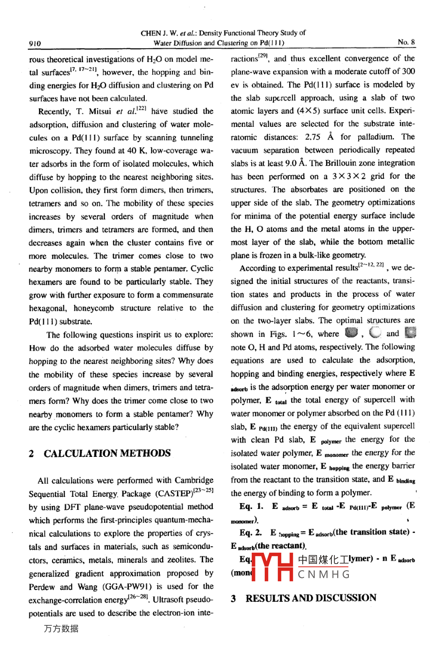 25卷8期結(jié)構(gòu)化學(xué)(JIEGOU HUAXUE)Vol. 25,No. 82006. 8Chinese J. Struct. Chem.909-914Density Functional Theory Study ofWater Diffusion and Clustering on Pd(111)PCHEN Jin-Wen*.C TU Xue- Yan2TIAN Kaia,b@ DAI Shu-Shan*"(School of Chemical Science and Technology, Yunnan Universiry, Kunming 650091, China)"(School of Chemistry and Biotechnology, Yunnan Nationalities Universiy, Kunming 650031, China)《(School of Chemistry and Chemical Engineering, Hunan Universityof Science and Technology, Xiangtan 411201, China)ABSTRACTThe intemal structures as well as adsorption and hopping energies of monomers,dimers, trimers, tetramers, pentamers and hexamers of water on Pd(111) have been studied bydensity functional theory (DFT) plane-wave pseudopotential method which performs the first-principles quantum-mechanical calculations to explore the properties of crystals and surfaces inmaterials. Based on the calculations, we suppose that their absorption is via one water molecule formonomers, dimmers and trimers, but three water molecules for pentamers and hexamers. Moreover,there is one water molecule bonding with Pd atom by O atom in pentamers and hexamers, whichexplains why pentamers and hexamers are stable. The binding energies of polymers may be used toexplain why the trimer comes close to two nearby monomers to form a stable pentamer instead oftetramer. And the difference of mobility of small water clusters is due to their different hoppingenergies.Keywords: density functional theory, Pd(111) surface, water diffusionand clustering, binding energy, hopping energy1 INTRODUCTIONSTMI-~12! It is well known that the water moleculeforms a singleton-like monomer or dimer moleculeThe interaction of water molecules with metal sur-on metal surfaces under low coverage at low tem-faces plays a vital role in a number of important pro-peraturesl- !. At the saturation coverage of water oncesses, such as corrosion, heterogeneous catalysis,M(111) (M = Pt, Rh, Pd, Cu, Ni) and Ru(001) atelectrochemical processes in aqueous solutions,relatively higher temperature, a hexagonal close-hydrogen production, etc." The structure and pro-packed structure extends over the surfaces~".perties of water adsorbed on well defined metal sur-Many studies have now demonstrated that DFT canfaces have been the subject of numerous experi-accurately predict the adsorption and diffusion pro- ,mental and theoretical investigations. There haveperties of atoms and molecules on metal surfaces'[13, 14been a number of experimental studies of water onFurther it has been shown that excellent agreementmetal surfaces through LEED, ESDIAD, infraredbetwe中國煤化工y determined dif-reflection absorption spectroscopy (IRAS), XAS andfusiorHCN MH C°1 Despite nume-Received 7 December 2005: acepted 18 January 2006①Supporned by the Natural Science Foundation of Yunnan Province (No.2004B0003M)②Corresponding author. Tian Kai, male, bom in 1971. lcturer, majoring in quantum chermistry. E mail: tiankai2@21cn.comCHEN J. W. et al: Density Functional Theory Study of910Water Difusion and Clustering on Pd(11)No.8rous theoretical investigations of H2O on model mne~ ractions'and thus excellent convergence of thetal surfaces', 17~21), however, the hopping and bin-plane-wave expansion with a moderate cutoff of 300ding energies for H2O diffusion and clustering on Pdev is obtained. The Pd(1I) surface is modeled bysurfaces have not been calculated.the slab supercell approach, using a slab of twoRecently, T. Mitsui et al.!21 have studied theatomic layers and (4X5) surface unit cells. Experi-adsorption, diffusion and clustering of water mole-mental values are selected for the substrate inte-cules on a Pd(11I) surface by scanning tunnelingratomic distances: 2.75 A for palladium. Themicroscopy. They found at 40 K, low-coverage wa-vacuum separation between periodically repeatedter adsorbs in the form of isolated molecules, whichslabs is at least 9.0 A. The Brillouin zone integrationdiffuse by hopping to the nearest neighboring sites.has been performed on a 3X3X2 grid for theUpon collision, they first form dimers, then trimers,structures. The absorbates are positioned on thetetramers and so on. The mobility of these speciesupper side of the slab. The geometry optimizationsincreases by several orders of magnitude whenfor minima of the potential energy surface includedimers, trimers and tetramers are formed, and thenthe H, 0 atoms and the metal atoms in the upper-decreases again when the cluster contains five ormost layer of the slab, while the bottom metallicmore molecules. The trimer comes close to twoplane is frozen in a bulk-like geometry.nearby monomers to form a stable pentamer. CyclicAccording to experimental results2-12.22 , we de-hexamers are found to be particularly stable. Theysigned the initial structures of the reactants, transi-grow with further exposure to form a commensuratetion states and products in the process of waterhexagonal, honeycomb structure relative to thediffusion and clustering for geometry optimizationsPd(11) substrate.on the two-layer slabs. The optimal structures areThe following questions inspirit us to explore: .shown in Figs. 1~6, where ,0 andHow do the adsorbed water molecules diffuse bynote O, H and Pd atoms, respectively The followinghopping to the nearest neighboring sites? Why doesequations are used to calculate the adsorption,the mobility of these species increase by severalhopping and binding energies, respectively where Eorders of magntude when dimers, trimers and tetra-dsorb is the adsorption energy per water monomer ormers form? Why does the trimer come close to twopolymer, E ou the total energy of supercell withnearby monomers to form a stable pentamer? Whywater monomer or polymer absorbed on the Pd(1I1)are the cyclic hexamers particularly stable?slab, E Ppa(11) the energy of the equivalent supercellwith clean Pd slab, E polymer the energy for the2 CALCULATION METHODSisolated water polymer, E monomer the energy for