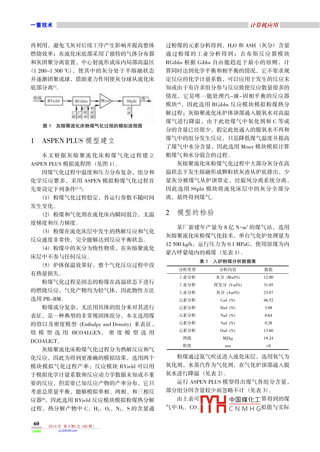計算機應(yīng)用CFHI TECHNOLOGY10396/j.issn.1673- 3355.2014.04.017灰熔聚流化床粉煤氣化模擬褚宏達(dá),唐升連2商要:灰熔聚流化床粉煤氣化技術(shù)是中科院煤化所開發(fā)的一種新型的粉煤氣化技術(shù),采用ASPEN PLUS模擬,可以比較準(zhǔn)確地計算氣化產(chǎn)物中H、CO、N2、HS、H0的含量。通過ASPEN PLUS模擬計算得出,如果希望提高氣化產(chǎn)物中有效組分H2和C0的含量,應(yīng)盡量減小氧氣和水蒸氣的流量。關(guān)鍵詞:灰熔聚流化床粉煤i化; ASPEN PLUS;模擬中圖分類號: TQ546.2; TP391.9 文獻(xiàn)標(biāo)識碼: A文章編號: 1673-3355 (2014) 04- 0017-03Simulation of Fluid -Bed Pulverized Coal Gasification with Ash Fusion AgglomerationZhe Hongda, Tang LianshengAbst ract: Fluid -bedpulverized coal gasification with ash fusion agglomeration is a new pulverized coal gasificationtechnology developed by Institute of Coal Chemistry, Chinese Academy of Sciences. By simulating the gasification processwith ASPEN PLUS, the content of H2, CO, N2 HsS and H2O in the production of gasification can be calculated accurately Thsimulation calculation with ASPEN PLUS indicates the flow of oxygen and steam should be reduced as low as possible inorder to increase the content of active components ( H2 and CO) in the production of fluid-bed coal gasification with ashfusion agglomeration.Key words: fluid-bed pulverized coal gasification with ash fusion agglomeration; ASPEN PLUS; simulation灰熔聚流化床粉煤氣化以粉煤為原料,以空C+H2O=CO+H2.氣、富氧或氧氣為氧化劑,以水蒸氣作氣化劑。粉C+CO2=2CO煤由氮氣吹送至氣化爐底部,氣化劑和氧化劑以適C+2H2= CH4.當(dāng)?shù)牧魉俅?,人流化床,使床層?nèi)的粉煤處于沸騰狀H2+ 1/202=H20態(tài),氣固兩相充分混合,粉煤在流化床層內(nèi)一次實此外,煤炭中含有的少量硫和氮會在氣流床中現(xiàn)破粘、脫揮發(fā)分、氣化、灰熔聚及分離等過程。發(fā)生下列反應(yīng):粉煤進(jìn)人流化床層后迅速升溫,其中的殘余水S+O2= -SO2分快速蒸發(fā)生成水蒸氣,同時粉煤快速熱分解,其SO2+1/202=SO3中揮發(fā)分被迅速脫除,生成C、H2、O2、N2、S、S+H=H2SH20和ASH (灰分) 及碳?xì)浠衔顲mHn等。H2S+CO=H2+COS分解后的產(chǎn)物和氣化劑在高溫環(huán)境下迅速發(fā)生N2+O2=2NO以下氧化及還原反應(yīng):N+O2=NOzCmHn+ (m+n/4) O2=mCO2+ (n/2) H2O在流化床頂部首先通人脫氧水用以降低出爐煤C+O2=CO2.氣的溫度,流化床中粉煤和氣化劑處于沸騰狀態(tài),C+ 1/202=CO有利于煤氣化反應(yīng)的充分進(jìn)行,但是也使煤氣中夾CO+ 1/202=CO2帶大量未反應(yīng)的碳和飛灰,因此灰熔聚氣化流程在CO+H2O=CO2+H2氣化爐后端設(shè)置旋風(fēng)分離器負(fù)責(zé)收集飛灰中的碳以中國煤化工1.一重集團(tuán)大連設(shè)計研究院有限公司助理工程師,遼寧大連1166002.一重集團(tuán)大連設(shè)計研究院有限公司高級工程師,遼寧大連16600MHCNMH G2014年第4期(總160期)59yzjsechi.comCFHI一重技術(shù)| 計算機應(yīng)用|再利用,避免飛灰對后續(xù)工序產(chǎn)生影響并提高整體過粉煤的元素分析得到,H20 和ASH (灰分)含量燃燒效率;在流化床底部采用了獨特的氣體分布器通過粉煤的工業(yè)分析得到;吉布斯反應(yīng)器模塊和灰團(tuán)聚分離裝置,中心射流形成床內(nèi)局部高溫區(qū)RGibbs根據(jù)Cibbs自由能趨近于最小的原則,計(1200~1 300 C),使其中的灰分處于半熔融狀態(tài)算同時達(dá)到化學(xué)平衡和相平衡的情況,它不要求規(guī)并逐漸團(tuán)聚成球,借助重力作用使灰分球從流化床定反應(yīng)的化學(xué)計量系數(shù),可以應(yīng)用于發(fā)生的反應(yīng)未底部分離凹"。知或由于有許多組分參與反應(yīng)致使反應(yīng)數(shù)量很多的情況,它是唯一能處理汽-液-固相平衡的反應(yīng)器模塊甲,因此選用RGibbs反應(yīng)模塊模擬粉煤熱分解過程;灰熔聚流化床爐體頂部通人脫氧水對高溫圖1灰熔聚流化床 粉煤氣化過程的模擬流程圖煤氣進(jìn)行降溫,由于此處煤氣中氧化劑和C等成分的含量已經(jīng)很少,假定此處通人的脫氧水不再和1 ASPEN PLUS模型建立煤氣中的組分發(fā)生反應(yīng),只是降低煤氣溫度并提高了煤氣中水分含量,因此選用Mixer模塊模擬計算本文根據(jù)灰熔聚流化床粉煤氣化過程建立粗煤氣和水分混合的過程。ASPEN PLUS模擬流程圖(見圖1)?;胰劬哿骰卜勖簹饣^程中大部分灰分在高因煤氣化過程中溫度和壓力分布復(fù)雜,組分和溫狀態(tài)下發(fā)生熔融形成顆粒狀灰渣從爐底排出,少化學(xué)反應(yīng)繁多,采用ASPEN模擬粉煤氣化過程首量灰分被煤氣從爐頂帶走,經(jīng)旋風(fēng)分離系統(tǒng)分離,先要設(shè)定下列條件2.3!:因此選用SSplit模塊將流化床層中的灰分全部分(1)粉煤氣化過程穩(wěn)定,各運行參數(shù)不隨時間離,最終得到煤氣。發(fā)生變化。(2)粉煤和氣化劑在流化床內(nèi)瞬間混合,無溫2模型的檢驗度梯度和壓力梯度。(3)粉煤在流化床層中發(fā)生的熱解反應(yīng)和氣化某廠新建年產(chǎn)量為8億N.m3的煤氣站,選用反應(yīng)速度非??欤耆軌蜻_(dá)到反應(yīng)平衡狀態(tài)?;胰劬哿骰卜勖簹饣夹g(shù),單臺氣化爐處理量為(4)粉煤中的灰分為惰性物質(zhì),在灰熔聚流化12 500 kg/h,運行壓力為0.1 MPaG,使用原煤為內(nèi)蒙古呼蒙境內(nèi)的褐煤(見表 1)。床層中不參與任何反應(yīng)。表1入爐粉煤分析數(shù)據(jù)表(5)爐體保溫效果好,整個氣化反應(yīng)過程中沒分析類型,分析內(nèi)容