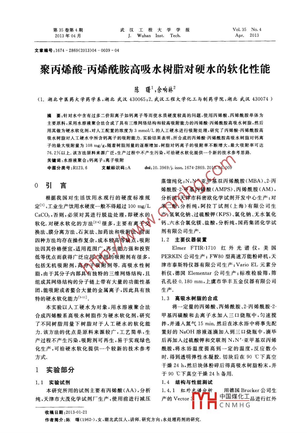 第35卷第4期武漢工程大學(xué)學(xué)報Vol.35 No. 42013年04月. Wuhan Inst. Tech.Apr. 2013文章編號:1674 - 2869(2013)04 - 0039 -04聚丙烯酸-丙烯酰胺高吸水樹脂對硬水的軟化性能陳曙',余響林2(1.湖北中醫(yī)藥大學(xué)藥學(xué)系,湖北武漢430065;2.武漢工程大學(xué)化工與制藥學(xué)院,湖北武漢430074 )摘要:針對水中含有過多二價陽離子如鈣離子等而使水質(zhì)硬度較高的問題,使用丙烯酸、丙烯酰胺單體為主要原料,采用水溶液聚合法合成了具有三維網(wǎng)絡(luò)結(jié)構(gòu)和較高吸附能力的丙烯酸丙烯酰胺高吸水樹脂,然后用其做為硬水軟化劑,對人工配置的濃度為3mmol/L的人工硬水進(jìn)行吸附處理,研究了丙烯酸丙烯酰胺高吸水樹脂對人工硬水中所含鈣離子的吸附能力.實驗結(jié)果表明:所合成的丙烯酸丙烯酰胺高吸水樹脂對鈣離子的最大吸附量為108mg/g,隨著樹脂用量的逐漸增加,樹脂對鈣離子的吸附率不斷增大,最大吸附率可達(dá)76. 2%以上.該方法原料來源廣泛,生產(chǎn)過程中不產(chǎn)生污染,可給硬水軟化提供- -個新的技術(shù)參考思路.關(guān)鍵詞:水溶液聚合;鈣離子;離子吸附中圖分類號:R123.6文獻(xiàn)標(biāo)識碼:Adoi: 10.3969/i. issn. 1674- 2869.2013. 04. 009蒸餾純化;N,N'-亞甲基雙丙烯酰胺(MBA)、2-丙0引言烯酰胺-2-甲基丙磺酸(AMPS)、丙烯酰胺(AM),根據(jù)我國對生活飲用水現(xiàn)行的硬度標(biāo)準(zhǔn)規(guī)分 析純,天津市科密歐化學(xué)試劑開發(fā)中心生產(chǎn);對定中,工業(yè)生產(chǎn)飲用水硬度-般不得超過100 mg/L苯 二酚,分析純,阿拉丁試劑(上海)有限公司生CaCO3,否則,必須對其進(jìn)行脫鹽處理,即硬水的產(chǎn);氫氧化鈉、過硫酸鉀(KPS)、氯化鈉、無水氯化軟化.對硬水軟化的方法[24]很多,主要有離子交鈣、六水合氯化鎂、鹽酸,分析純,國藥集團化學(xué)試換法、膜分離方法、石灰法、加藥法和吸附法,前面劑有限公司生產(chǎn)四種方法均存在操作復(fù)雜,成本較高等缺點,吸附1.2主要儀器裝置法因其價格便宜,適用范圍廣,再生能力強和投資Elmer FTIR-1710 紅外光譜儀,美國低等優(yōu)點而獲得廣泛應(yīng)用.常用的吸附劑有很多,PERKIN公司生產(chǎn); FW80型高速萬能粉碎機,天包括無機吸附劑,高分子吸附劑等.高吸水性樹津市泰斯特儀器有限公司生產(chǎn);Vario EL元素分脂,由于其分子內(nèi)部具有獨特的三維網(wǎng)絡(luò)結(jié)構(gòu),且析儀,德國Elementar 公司生產(chǎn);標(biāo)準(zhǔn)檢驗篩,篩組成其網(wǎng)絡(luò)結(jié)構(gòu)的分子鏈上帶有大量的功能性基孔孔徑0.180mm,上虞市華豐五金儀器有限公司團,能吸附或者螯合大量的金屬離子,因此具有獨生產(chǎn).特的硬水軟化能力[11.1.3高吸水樹脂的合 成本實驗以人工硬水為對象,用水溶液聚合法將一定量的丙烯酸、丙烯酰胺、2-丙烯酰胺-2-合成丙烯酸系高吸水樹脂作為硬水軟化劑,研究甲基丙磺酸和去離子水加人三口燒瓶中,勻速攪了不同樹脂用量下樹脂對于人工硬水的軟化能拌,并通人氮氣15min.然后在冰水浴中將事先配力.該方法的優(yōu)點是原料來源較廣,工藝簡單,生置好的 NaOH溶液逐滴加人到三口燒瓶中,滴畢產(chǎn)過程不產(chǎn)生污染,吸附劑可再生,易于實現(xiàn)綠色后再加人過硫酸鉀和交聯(lián)劑N,N'-亞甲基雙丙烯化生產(chǎn),可給硬水軟化提供一個較新的技術(shù)參考酰胺,將水浴溫度提高到一定的溫度,反應(yīng)數(shù)小方式.時.得到透明彈性水凝膠.切塊后在90 C下真空干燥24h,然后塊體粉碎后得高吸水樹脂粉末,并1實驗部分于90 C下真空干燥24 h備用.1.1實驗試劑1.4結(jié)構(gòu)與性能測試本研究所用的試劑主要有丙烯酸(AA),分析1.4.1紅外光譜 分析用德國Brucker公司生純,天津市大茂化學(xué)試劑廠生產(chǎn),使用前進(jìn)行減壓產(chǎn)的 Vector .中國煤化工品進(jìn)行紅外.MYHCNMH G收稿日期:2013-01-21作者簡介:陳曙(1962-),女 ,湖北武漢人,講師.研究方向:水處理藥劑的研究..40武漢工程大學(xué)學(xué)報第35卷光譜分析,用溴化鉀壓片測試,掃描范圍為500~進(jìn)行成功,所形成的共聚物為PAA-AM-AMPS共4 000cm~'.聚物.1.4.2樹脂軟化硬水性能的測試a. 3 mmol/L161134483079人工硬水的配制.稱取0. 441 g二水氯化鈣CaCl2●29431670 14322H2O,溶于少量蒸餾水,移入1 000 mL容量瓶,并用蒸餾水稀釋至刻度,搖勻備用,配好的溶液放4)置時間不超過48 h.謝3)b.樹脂軟化硬水測試.稱取一定量的樹脂于茶燒杯中,加人200 mL 3 mmol/L的含鈣離子的鹽溶液,攪拌均勻,靜置一定時間,使其吸附達(dá)到飽1)和后過濾,稱取凝膠質(zhì)量,測量濾液體積和濾液中000 3500 3000 2500 2000 1500 1000 500鈣鎂離子濃度.按下面的公式(1)和(2)分別計算波數(shù)/cm”樹脂對鈣離子的吸附量和吸附率:圖1不同樣 品的紅外譜圖CV.-C,V,'XMX1 000(1)Fig. 1 IR spectra of the different samplesm注: (1)AA;(2) AM;(3) AMPS;(4) PAA-AM AMPS.A=C,V。-C,(2)2.2高吸水樹脂軟化處理硬水v二GVx 100%由于硬水中主要含的是鈣離子,鈣離子濃度式中:q-樹脂對鈣離子的吸附量,mg/g;Co-吸附前溶液中鈣離子濃度,mol/L;遠(yuǎn)超其他離子濃度,因此選取鈣離子為研究對象.C.-吸附后溶液中鈣離子濃度,mol/L;選用一種樹脂,該樹脂的合成條件為:AA用量17. 3 mL.AM用量5. 98 g、AMPS用量8.69 g.引V。-吸附前鈣離子溶液的體積,L;發(fā)劑KPS用量0.118g.交聯(lián)劑MBA用量0.012g,V.-吸附后鈣離子溶液的體積,L;中和度為70%,在程序升溫下50 C反應