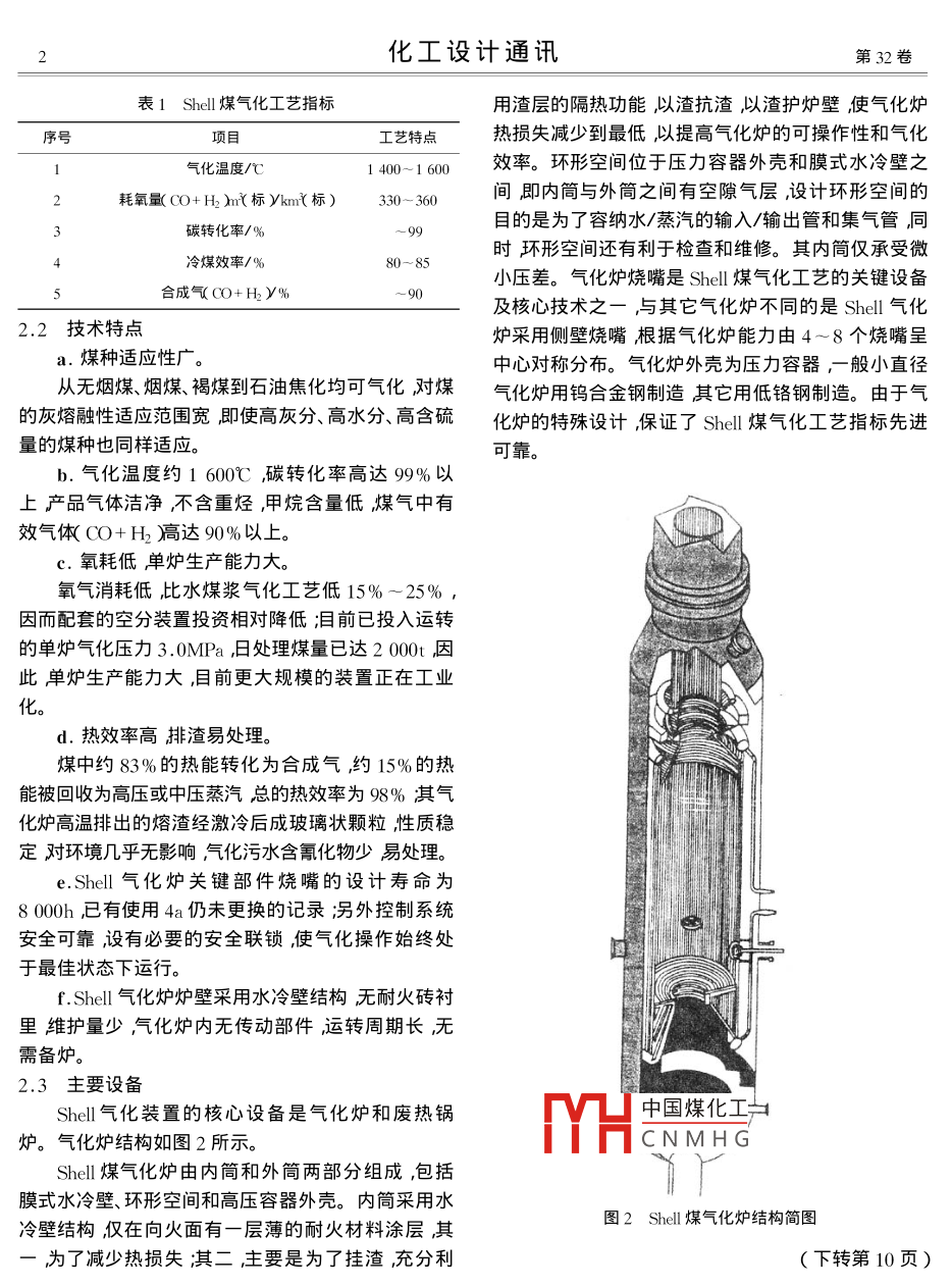 第32卷第2期化工設(shè)計(jì)通訊Vol 32 No. 22006年6月Chemical Engineering Design CommunicationsJun.2006Shel煤氣化技術(shù)吳迎(中國五環(huán)化學(xué)工程公司武漢430079)摘要炌介紹氣化效率高、有利于環(huán)保、具有一定競爭力的She!煤氣化工藝原理、技術(shù)特點(diǎn)及關(guān)鍵設(shè)備。建議盡快實(shí)現(xiàn)關(guān)鍵技術(shù)和設(shè)備的國產(chǎn)化。關(guān)鍵詞She煤氣化江藝原理技術(shù)特點(diǎn)莊要設(shè)備中圖分類號:TQ54文獻(xiàn)標(biāo)識碼:A文章編號:1003-6490(200602-0001-03概述2 Shell煤氣化工藝原理、技術(shù)特點(diǎn)及主要設(shè)備謝爾粉煤加壓氣化工藝(簡稱She煤氣化工藝)是荷蘭殼牌公司開發(fā)的一種先進(jìn)的煤氣化技術(shù),2.1Shl!煤氣化工藝原理與先進(jìn)的德士古 Texaco冰煤漿加壓氣化技術(shù)相比,Shell煤氣化過程是在高溫高壓下進(jìn)行的 ShellShell煤氣化具有對煤質(zhì)要求低合成氣中有效組分煤氣化屬氣流床氣化。粉煤、氧氣及水蒸汽在加壓條αO+H>90%浛量高原煤和氧氣消耗低環(huán)境污件下并流進(jìn)入氣化爐,在極為短暫的時間(3~10s)染小和運(yùn)行費(fèi)用低等特點(diǎn)已成為近年來國內(nèi)外設(shè)計(jì)內(nèi)完成升溫、揮發(fā)分脫除、裂解、燃燒及轉(zhuǎn)化等一系單位和生產(chǎn)廠家首選的氣化工藝列物理和化學(xué)過程其工藝流程如圖1所示氣化工我國正在設(shè)計(jì)和建設(shè)中的洞庭氮肥廠、柳州化學(xué)藝指標(biāo)如表1所示。工業(yè)公司等廠家已將該技術(shù)應(yīng)用于合成氨生產(chǎn)。湖助氨冷氣循環(huán)北化肥廠和安慶化肥廠也準(zhǔn)備將該技術(shù)用于本廠的〃油改煤"制氨流程。湖北雙環(huán)科技股份有限公司引壓蒸汽進(jìn)Shll公司基礎(chǔ)設(shè)計(jì)由我院做工程設(shè)計(jì)正在建設(shè)氧氣規(guī)模為800/(相當(dāng)于20萬t/a的工業(yè)示范裝置即中壓蒸汽L斑爆化合成氣將投運(yùn)。 Shell煤氣化技術(shù)是我國建設(shè)大型煤化工項(xiàng)確酸飛灰[濕洗]凈化目或中氮肥改造的主要方向。 Shell工藝雖屬先進(jìn),但投資偏高一般企業(yè)不易接受建議盡快實(shí)現(xiàn)關(guān)鍵氧氣處理][堿同以技術(shù)和設(shè)備的國產(chǎn)化。中國煤化工CNMHG圖1Shll煤氣化工藝流程示意圖收稿日期2005-11-10作者簡介吳巡1973-),女1906年畢業(yè)于武漢化工學(xué)院工程師。從事管道設(shè)計(jì)及化學(xué)工程工藝系統(tǒng)工作。化工設(shè)計(jì)通訊第32卷表1Shl煤氣化工藝指標(biāo)用渣層的隔熱功能以渣抗渣以渣護(hù)爐壁使氣化爐序號項(xiàng)目工藝特點(diǎn)熱損失減少到最低以提高氣化爐的可操作性和氣化140-160效率。環(huán)形空間位于壓力容器外殼和膜式水冷壁之耗氧量(OO+H2m(標(biāo)ykm(標(biāo))330-360間即內(nèi)簡與外筒之間有空隙氣層,設(shè)計(jì)環(huán)形空間的碳轉(zhuǎn)化率/%目的是為了容納水/蒸汽的輸入/輸出管和集氣管同冷煤效率/%80-85時環(huán)形空間還有利于檢查和維修。其內(nèi)筒僅承受微小壓差。氣化爐燒嘴是Shel煤氣化工藝的關(guān)鍵設(shè)備合成氣OO+H2y%90及核心技術(shù)之一,與其它氣化爐不同的是 Shell氣化2.2技術(shù)特點(diǎn)爐采用側(cè)壁燒嘴根據(jù)氣化爐能力由4~8個燒嘴呈a.煤種適應(yīng)性廣。中心對稱分布。氣化爐外殼為壓力容器一般小直徑從無煙煤、煙煤、褐煤到石油焦化均可氣化對煤氣化爐用鎢合金鋼制造其它用低鉻鋼制造。由于氣的灰熔融性適應(yīng)范圍寬即使高灰分、高水分、高含硫化爐的特殊設(shè)計(jì),保證了Shl煤氣化工藝指標(biāo)先進(jìn)量的煤種也同樣適應(yīng)??煽?。b.氣化溫度約1600℃碳轉(zhuǎn)化率高達(dá)99%以上產(chǎn)品氣體潔凈不含重?zé)N,甲烷含量低煤氣中有效氣體CO+H2高達(dá)90%以上。c.氧耗低單爐生產(chǎn)能力大。氧氣消耗低比水煤漿氣化工藝低15%-25%,因而配套的空分裝置投資相對降低;目前已投入運(yùn)轉(zhuǎn)的單爐氣化壓力3.0MmPa,日處理煤量已達(dá)2000t因此單爐生產(chǎn)能力大,目前更大規(guī)模的裝置正在工業(yè)d.熱效率高排渣易處理。煤中約83%的熱能轉(zhuǎn)化為合成氣約15%的熱能被回收為高壓或中壓蒸汽總的熱效率為98%其氣化爐高溫排岀的熔渣經(jīng)激冷后成玻璃狀顆粒性質(zhì)穩(wěn)定對環(huán)境幾乎無影響氕氣化污水含氰化物少易處理e.S}hell氣化爐關(guān)鍵部件燒嘴的設(shè)計(jì)壽命為8000h已有使用4a仍未更換的記錄;另外控制系統(tǒng)安全可靠設(shè)有必要的安全聯(lián)鎖,使氣化操作始終處于最佳狀態(tài)下運(yùn)行。f.Shel氣化爐爐壁采用水冷壁結(jié)構(gòu)無耐火磚襯里維護(hù)量少氣化爐內(nèi)無傳動部件運(yùn)轉(zhuǎn)周期長,無需備爐。2.3主要設(shè)備Shel氣化裝置的核心設(shè)備是氣化爐和廢熱鍋中國煤化工爐。氣化爐結(jié)構(gòu)如圖2所示CNMHGShel!煤氣化爐由內(nèi)筒和外筒兩部分組成,包括膜式水冷壁、環(huán)形空間和高壓容器外殼。內(nèi)筒采用水冷壁結(jié)構(gòu)僅在向火面有一層薄的耐火材料涂層其圖2 Shell煤氣化爐結(jié)構(gòu)簡圖為了減少熱損失淇二主要是為了掛渣,充分利(下轉(zhuǎn)第10頁)化工設(shè)計(jì)通訊第32卷力小觸媒溫度分布合理能耗低等特點(diǎn)。是一種先進(jìn)成熟的氨合成塔內(nèi)件。表2部分運(