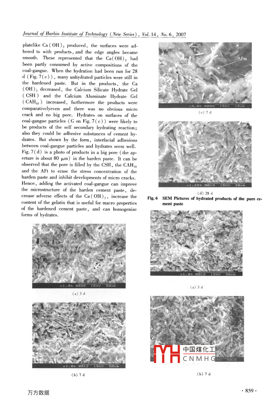 Journal of Harbin Institute of Technology( New Series),Vol. 14,No6,2007tudy on activity evaluation of activated coal-gangue andthe hydration processZHANG Hong-tao, DENG Hong-wei, FENG Qi., WANG Pei-ming張洪濤,鄧宏衛(wèi),馮奇王培銘(1. HIT University Science Park Co., Itd., Harbin 150001, China; 2. School of Materials Science and Engineering, Harbin Institute of TechnologyHarbin 150006, China; 3. School of Municipal and Environmental Engineering, Harbin Institute of Technology, Harbin 150090, China4. School of Science and Engineering of Materials, Tongji University, Shanghai 200092,ChinaAbstract: Chemical compositions, mineral compositions and the activated mechanism of the coalwere analyzed. And pozzolana activities of the coal-gangue were evaluated after activated. Moreover, hydrationheat and hydration compositions of activated coal-gangue-calcium oxide system, as well as hydration degree andhardened paste microstructures of activated coal-gangue-cement system were studied. Results show that pozzola-1a activities of the activated coal-gangue root in amorphous Sio, and activated Al2O,. With the exciting of gyp-sum, the reaction of activated coal-gangue and Ca( OH)2 would produce hydration products as ettringite, calci-um silicate hydrate, and calcium aluminate. The relationship between the curing age and the content of Ca(OH)2 in coal-gangue-cement system was ascertained. Unhydrated particles in the coal-gangue-cement pastewere more than that in the neat cement paste at the same hydration periods, and even existed at the laterof hydration. Furthermore, the activated coal-gangue could inhibit growth and gathering of the calciumcrystal, and improve the structure of hardened cement paste.ey words: activated coal-gangue; cement; pozzolana activity; hydration; function mechanismCLC number: TB321Document code: AArticle ID:10059113(2007)060855-06Coal-gangue is a solid waste produced in thecoal production, and the discharge amount is up to 1 Analysis on the Coal-gangueabout 10% of the output of coal In China, with coalexploitation the coal-gangue has discharged increasing 1. 1 Compositions and the Mechanism of Activanumbers; However, the current comprehensivetion of the Coal-ganguelization is less than 15%121. and effectiveness of itsThe coal-gangue was produced from Xuzhou.Itsilization is also inapparent. Abroad people pay atten- main chemical compositions are shown in Tab. 1,andtion to the utilization of coal-gangue. Starting the study its XRD is shown in Fig. 1. The coal-gangue was com-very early, they have logged up a remarkable series of posed of siallite minerals. Its mineral compositions weregains in the usage of coal-gangue, and the utilization as follows: Kaolinite, Quartz, Siderite,Orthoclaseratio remains ahead of chinaStudy on the com- Muscovite, Calcite and othersprehensive utilization of the coal-gangue could betraced in 1950 in China5). Coal-gangue has beenTab 1 Chemical composition of coal-ganguenow used in the field such as agriculture, chemical inAl2O, Fe203 MgO Cao K20 50, TiOdustry,environment, contracture, engineering, etc6-9149.914.912.20.93Despite this, compared with other solid wastes such asslag and fly ash, theoretical investigations and applicaKaolinite(AL2O3·2SiO2·2H2O) in the coaltions of the coal-gangue are very limited in China. gangue is a phyllosilicate mineral of the 1: I typSo, for accelerating development and utilization in which is composed of a Silicon-Oxygen tetrahedron laythe construction industry, this paper took the study re- er and an Aluminum-Oxygen octahedron layer. Itslated with the coal-gangue, i. e. compositions and acti- structural minelayers are absolutely the same, hydrogenvated mechanism of the coal-gangue were analyzed bonds are connectors of layers, and there's nopozzolana activity was evaluated as well as hydration moleIn the Kaolinite coordinprocess and the effect on cement hydration were illumnatedYH中國煤化工ely4and6. HydroxCNMHGthe temperature roseReceived 2005-11-15ponsored by the National Basic Reasearch Program of China( Grant No. 2001CB610704)855Journal of Harbin Institute of Technology( New Series), Vol. 14, No 6, 2007Fig 1 XRD patterns of the coal-gangueto 400-600 C. After this, the kaolinite remained the acid at 80 C for 2 h, under the condition of uniformlyinherent layer structure, but major dislocations had oc- agitating. Relative mass of the digested Al2O,curred among atoms, so the Kaolinite varied to be the measured as the content of the activated Al,O,, in theMetakaolinite(Al, O3. 2SiO2)which had a bad crys- filtrated liquor by ICP. Results represented that thetallinity 10, Il.The atom arangement in the Metaka- content of the activated AL, O, in the activated coalalinite is irregular; the Metakaolinite is in a thermo dy- gangue was 9. 24 %. The crystallinity is represented bynamical metastable condition and it is a mineral which the percentage, the crystalline gross of the mineralhas pozzolana activities.gross. The crystallinity can be worked out in twoActivation of the coal-gangue, i. e. removing ways 6: a) by the integral area of the diffractionhydroxide radicals from the Aluminum-Oxygen octahed- curve. For that any phase, no matter in what stateron, makes the coordination number of Al vary from 6 has a diffraction characteristic curve corresponding to4 or 5. Simultaneously, the Kaolinite with a regular the corresponding state. The rystallinity is the area ra-structure varies to be the Metakaolinite which has an ir- tio that the integral area of the crystalline phase be diregular structure. The heat treatment of calcinating was vided by the total integral area; b)by other methodschose as the activation mode heresuch as the FWHM of the diffraction peak. Five-finger1.2 Pozzolana Activities of the Activated Coal-gangue peak in the Quartz Crystal is a characteristic diffractionK. Takemoto and H. Uchikawa defined the peak; its morphology reflects crystal statuspozzolana activity or chemical activity a criterion