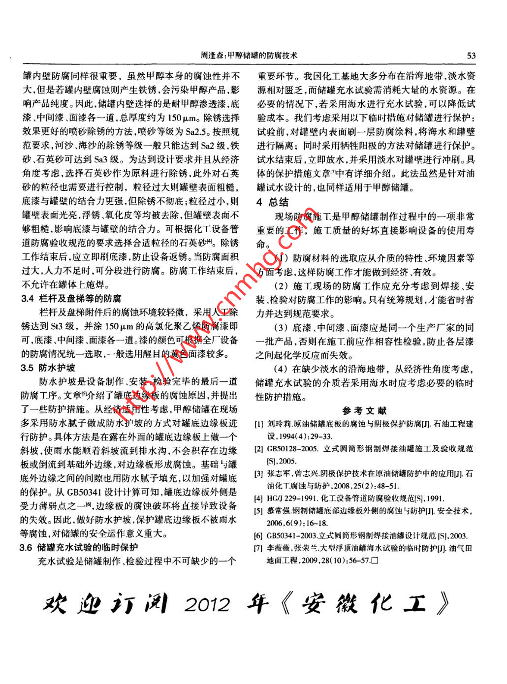 52第37卷,第6期安徽化工Vol.37 ,No.62011年12月ANHUI CHEMICAL INDUSTRYDec.2011●化工設備與自動化.甲醇儲罐的防腐技術周逢森(東華T.程科技股份有限公司設備室,安徽合肥230024)摘要:根據(jù)甲醇儲罐的特點,介紹了其防腐材料的選擇及施I要求。結合施T.現(xiàn)場.提出儲罐在充水試驗過程中應采取的臨時性保護措關鍵詞:甲醇;大型儲罐;防腐;選材;施工doi: 0.3969/j.ssn. 1008 -553X.2011.06.018中圖分類號: TQ223.12*1文獻標識碼:B文章編號 : 1008 -553X(2011 )06- -0052-021引言修費用,延長設備的使用壽命。本文根據(jù)甲醇儲罐的特近年來,隨著煤化工產業(yè)的發(fā)展,煤制甲醇項目的點,以某甲醇項目中1萬m'的甲醇儲罐為例,介紹其在產能不斷擴大,對甲醇儲罐的性能要求也越來越高。在現(xiàn)場制作過程中的防腐技術。實際生產中,儲罐的損壞失效大多由腐蝕而引起"。對儲2甲醇儲罐的特點罐進行有效地防腐,可提高設備的安全可靠性,堿少維甲醇儲罐的參數(shù)見表1。表1甲醇儲罐參數(shù)項介質直徑(m)公稱容積(m)操作溫度(C) 操作樂力 MPa)結構甲醇儲罐甲醇310000常溫0錐底、內浮盤_由表1可以看出.甲醇儲罐直徑大、耗材多,其儲存接熱量不僅會破壞焊道周邊的瀝青漆,同時可能引起瀝的介質甲醇毒性為中度,并且易揮發(fā)。因此,甲醇儲罐的青漆著火,反而導致底板下表面更多區(qū)域未能進行有效防腐工作不僅可以減少鋼材使用,帶來經(jīng)濟效益,而且地防腐。在條件苛刻一些的地方,則可以增加陰極保護對于設備長周期安全運轉及操作人員人身安全也極具防腐的措施對焊道周邊進行防腐凹,具體做法已有報道意義。同。漆膜厚度等其干了以后用測厚儀測量即可,在漆未完3防腐材料的選擇及施工全干透時測量漆膜厚度-般數(shù)值都會偏小- -些。根據(jù)防腐的日的不同,甲醇儲罐的防腐主要分為罐3.2罐體外壁防腐底板下表面防腐、罐體外表面防腐罐體內表面防腐.盤儲罐外壁的防腐施T.在儲罐制作過程中即可進行,梯等附件的防腐等。需注意的是,罐體焊道附近不要刷漆,這是為了方便在充3.1罐底板下表面防腐水試驗過程中檢查儲罐焊縫的嚴密性。因罐體外壁受大罐底板與基礎接觸,為了減少基礎不均勻沉降對罐氣腐蝕,采用人工除銹達St3級即可,選用的漆為屏蔽隔底的破壞,一般基礎采用承臺表面鋪瀝青砂的結構或者熱漆,底漆兩道,中間漆兩道,面漆- ~道, 總厚度約為環(huán)墻結構。由于底板做成向上錐底的型式,底板不易接250 pun。面漆為為色,其余為紅色。屏蔽隔熱漆的作用一觸到雨水等腐蝕性物質,且基礎上的瀝青砂也不具有腐是防止大氣等對罐體的腐蝕,二是避免太陽照射造成罐蝕性。底板下表面的腐蝕環(huán)境較輕微,采用人工除銹達體溫度過高,甲醇大量揮發(fā),也就是既減少了甲醇揮發(fā)造到St3級,并涂300μm厚漿型的瀝青漆。在罐底板下好成的經(jīng)濟損失,又減小了因甲醇揮發(fā)帶來的危險性。在充料后即可對罐底邊緣板及中幅板的下表面進行除銹、刷水試驗合格后,即可對焊道附近的罐體進行防腐。漆。要注意的是,在底板對接及搭接的焊縫周闈需留3.3罐體內壁防腐50mm左右的寬度不刷漆,這是防止在焊接過程中,焊.儲罐的內壁防腐是在設備充水試驗合格后進行的。收稿日期:2011-05-30作者簡介:周逢蘇( 1982-).男,碩士研究生.主要從事化T.設備的設計工作, 15155199863 ,0551-3696847 .zhoufengen@chinacc com。