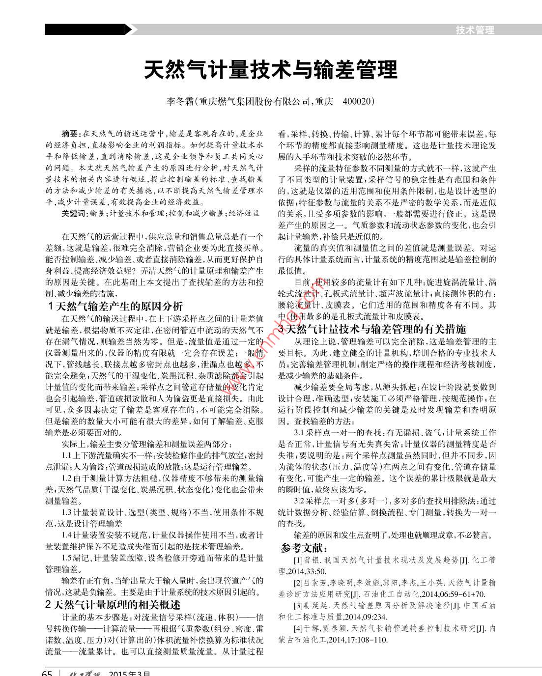 技術(shù)管理天然氣計量技術(shù)與輸差管理李冬霜(重慶燃?xì)饧瘓F(tuán)股份有限公司,重慶400020)摘要:在天然氣的輸送運營中,輸差是客觀存在的,是企業(yè)看, 采樣.轉(zhuǎn)換、傳輸、計算、累計每個環(huán)節(jié)都可能帶來誤差,每的經(jīng)濟負(fù)擔(dān),直接影響企業(yè)的利潤指標(biāo)。如何提高計量技術(shù)水個環(huán)節(jié)的精度都直接影響測量精度。這也是計量技術(shù)理論發(fā)平和降低輸差,直到消除輸差,這是企業(yè)領(lǐng)導(dǎo)和員工共同關(guān)心展的入 手環(huán)節(jié)和技術(shù)突破的必然環(huán)節(jié)。的問題。本文就天然氣輸差產(chǎn)生的原因進(jìn)行分析,對天然氣計采樣的流量特征參數(shù)不同測量的方式就不一樣,這就產(chǎn)生量技術(shù)的相關(guān)內(nèi)容進(jìn)行概述,提出控制輸差的標(biāo)準(zhǔn)、查找輸差了不同類型的計量裝置;采樣信號的穩(wěn)定性是有范圍和條件的方法和減少輸差的有關(guān)措施,以不斷提高天然氣輸差管理水的,這就是儀器的適用范圍和使用條件限制,也是設(shè)計選型的平,減少計量誤差,有效提高企業(yè)的經(jīng)濟效益。依據(jù);特征參數(shù)與流量的關(guān)系不是嚴(yán)密的數(shù)學(xué)關(guān)系,而是近似關(guān)鍵詞:輸差;計量技術(shù)和管理;控制和減少輸差;經(jīng)濟效益的關(guān)系,且受多項參數(shù)的影響,一般 都需要進(jìn)行修正。這是誤差產(chǎn)生的原因之一-。 氣質(zhì)參數(shù)和流動狀態(tài)參數(shù)的變化,也會引在天然氣的運營過程中,供應(yīng)總量和銷售總量總是有一個起計量輸差,補償只是近似的。差額,這就是輸差,很難完全消除,營銷企業(yè)要為此直接買單。流量的真實值和測量值之間的差值就是測量誤差。對運能否控制輸差、減少輸差.或者直接消除輸差,從而更好保護(hù)自行的具體計量系統(tǒng)而言,計量系統(tǒng)的精度范圍就是輸差控制的身利益、提高經(jīng)濟效益呢?弄清天然氣的計量原理和輸差產(chǎn)生最低值。的原因是關(guān)鍵。在此基礎(chǔ)上本文提出了查找輸差的方法和控目前,使用較多的流量計有如下幾種:旋進(jìn)旋渦流量計、渦制、減少輸差的措施,輪式流量計、孔板式流量計、超聲波流量計;直接測體積的有:1天然氣輸差產(chǎn)生的原因分析腰輪流量計、皮膜表。它們適用的范圍和精度各有不同。其在天然氣的輸送過程中,在上下游采樣點之間的計量差值中,使 用最多的是孔板式流最計和皮膜表。就是輸差,根據(jù)物質(zhì)不滅定律,在密閉管道中流動的天然氣不3天然(計量技術(shù)與輸差管理的有關(guān)措施存在漏氣情況,則輸差當(dāng)然為零。但是,流量值是通過-一定的從理論上說,管理輸差可以完全消除,這是輸差管理的主儀器測量出來的,儀器的精度有限就一-定會存在誤差;-般情要目標(biāo)。為此,建立健全的計量機構(gòu),培訓(xùn)合格的專業(yè)技術(shù)人況下,管線越長、聯(lián)接點越多密封點也越多,泄漏點也越多,不員;完善輸差管理機制;制定嚴(yán)格的操作規(guī)程和經(jīng)濟考核制度,能完全避免;天然氣的干濕變化、炭黑沉積、雜質(zhì)濾除都會引起是減 少輸差的基礎(chǔ)條件。計量值的變化而帶來輸差;采樣點之間管道存儲量的變化肯定減少輸差要全局考慮,從源頭抓起:在設(shè)計階段就要做到也會引起輸差,管道破損放散和人為偷盜更是直接損失。由此設(shè)計合理,準(zhǔn)確選型;安裝施I必須嚴(yán)格管理,按規(guī)范操作;在可見,眾多因素決定了輸差是客觀存在的,不可能完全消除。運行階段控制和減少輸差的關(guān)鍵是及時發(fā)現(xiàn)輸差和查明原但是輸差的數(shù)量大小可能有很大的差異,如何了解輸差、克服因。查找輸差的方法:.輸差是必須要面對的。3.1采樣點一對一的查找:有無漏損、盜氣;計量系統(tǒng)工作實際上,輸差主要分管理輸差和測量誤差兩部分:是否正常,計量信號有無失真失常;計量儀器的測量精度是否1.1上下游流量確實不一樣:安裝檢修作業(yè)的排氣放空;密封失準(zhǔn);要說明的是:兩個采樣點測量雖然同時,但并不同步,因點泄漏;人為偷盜;管道破損造成的放散;這是運行管理輸差。為流體的狀態(tài)(壓力、溫度等)在兩點之間有變化、管道存儲量1.2由于測量計算方法粗糙,儀器精度不夠帶來的測量輸有變化, 可能產(chǎn)生一-定的輸差。 這個誤差的累計極限就是最大差;天然氣品質(zhì)(干濕變化.炭黑沉積、狀態(tài)變化)變化也會帶來的瞬時值, 最終應(yīng)該為零。測量輸差。3.2采樣點-對多(多對一),多對多的查找用排除法:通過1.3計量裝置設(shè)計、 選型(類型、規(guī)格)不當(dāng),使用條件不規(guī)統(tǒng)計數(shù)據(jù) 分析、經(jīng)驗估算、倒換流程、專門測量,轉(zhuǎn)換為一-對一范,這是設(shè)計管理輸差的查找。1.4計量裝置安裝不規(guī)范,計量儀器操作使用不當(dāng),或者計輸差的原因和發(fā)生點查明了,處理也就順理成章,不必贅言。量裝置維護(hù)保養(yǎng)不足造成失準(zhǔn)而引起的是技術(shù)管理輸差。參考文獻(xiàn):1.5漏記、計量裝置故障.設(shè)備檢修開旁通而帶來的是計量[1]曾銀. 我國天然氣計量技術(shù)現(xiàn)狀及發(fā)展趨勢[].化工管管理輸差。理,2014.33:50.輸差有正有負(fù),當(dāng)輸出量大