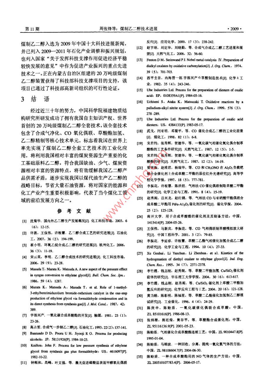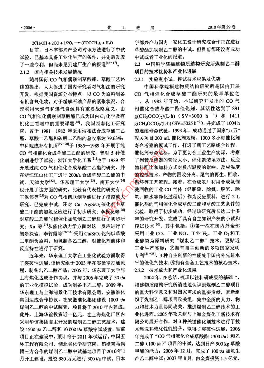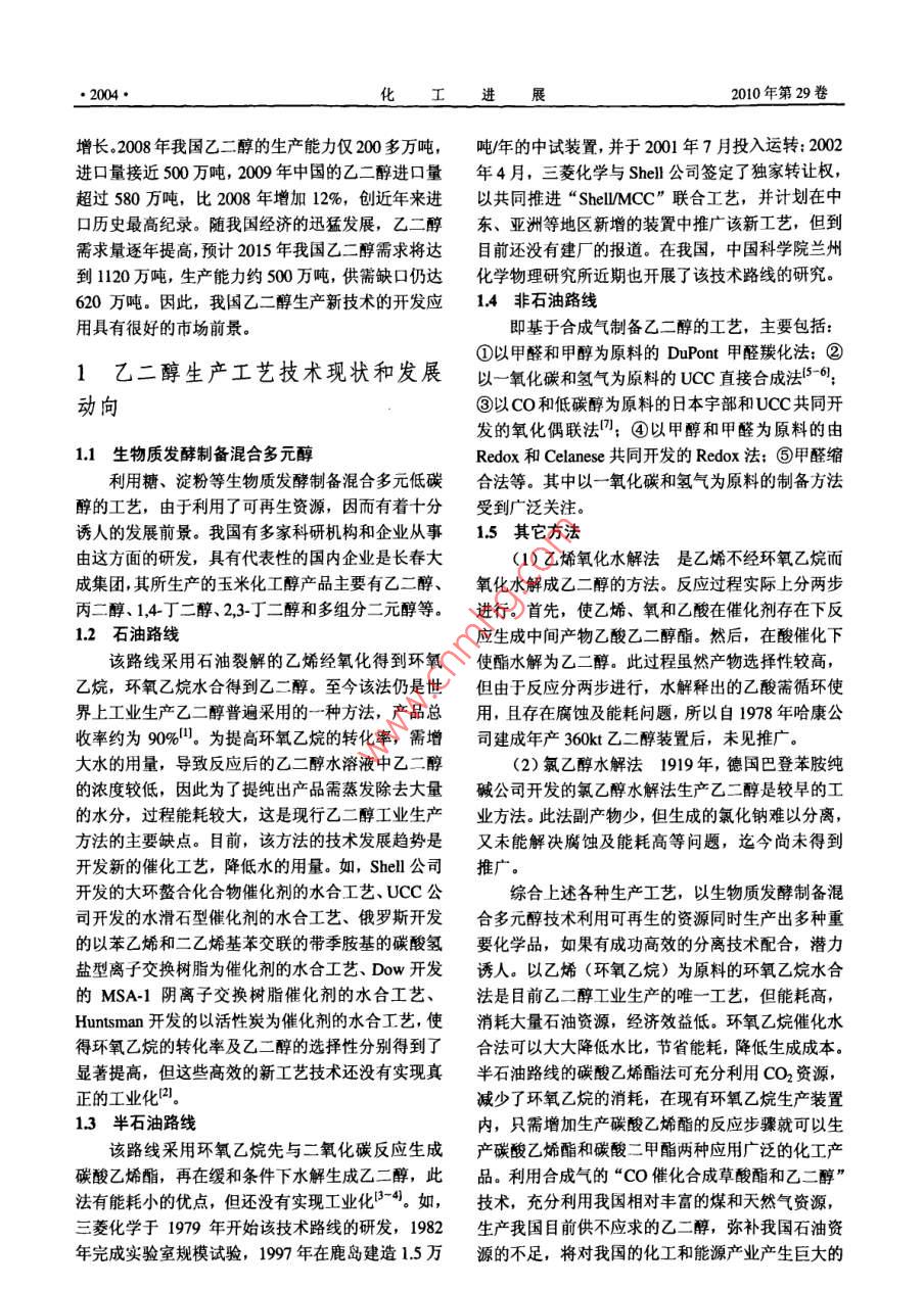 化進(jìn)展2010年第29卷第l1期 CHEMICAL INDUSTRY AND ENGINEERING PROGRESS特約評(píng)述煤制乙二醇技術(shù)進(jìn)展周張鋒,李兆基,潘鹛斌,林凌,覃業(yè)燕,姚元根(中國(guó)科學(xué)院福建物質(zhì)結(jié)構(gòu)研究所,福建福州350002)摘要:綜述了目前乙二醇生產(chǎn)工藝技術(shù)的現(xiàn)狀和發(fā)展動(dòng)向,指出了石油乙烯路線是目前乙二醉工業(yè)生產(chǎn)的主要工藝。同時(shí),著重介紹了中國(guó)科學(xué)院福建物質(zhì)結(jié)構(gòu)研究所與企業(yè)合作,率先在國(guó)內(nèi)外實(shí)現(xiàn)工業(yè)化的煤制乙二醇的成套技術(shù)。該技術(shù)符合我國(guó)缺油、少氣、煤炭資源相對(duì)豐富的資源特點(diǎn),可利用煤炭資源生產(chǎn)乙二醇,代替目前的石油乙烯路線,將有效緩解我國(guó)乙二醇產(chǎn)品供需矛盾,逐步實(shí)現(xiàn)我國(guó)以煤代油生產(chǎn)乙二醇的戰(zhàn)略目標(biāo),節(jié)省大量石油資源,對(duì)國(guó)家的能源和化工產(chǎn)業(yè)產(chǎn)生重要積極影響,代表了當(dāng)今煤化工領(lǐng)域的前沿發(fā)展方向之一關(guān)鍵詞:煤制乙二醇;羰基合成;自主知識(shí)產(chǎn)權(quán);工業(yè)化中圖分類號(hào):TQ53文獻(xiàn)標(biāo)志碼:A文章編號(hào):1000-6613(2010)11-2003-0Progress in technologies of coal-based ethylene glycol synthesisZHOU Zhangfeng LI Zhaoji, PAN Pengbin, LIN Ling, QIN Yeyan, YAO YuangenFujian Institute of Research on the Structure of Matter, Chinese Academy of Sciences, Fuzhou 350002, Fujian, China)Abstract: The present status and development trends of ethylene glycol (EG)production technologyare summarized. The oil ethylene route is currently the main process for producing EG in chemicalustry While, the technology of EG from coal meets the energy character of China with higheconomic efficiency, which would take the advantage of coal resource that is relatively rich in China.After nearly 30 years of research, with the cooperation of enterprises, Fujian Institute of Research onthe Structure of Matter, CAS, have completed the first industrialization set of EG from coal in theworldKey words: coal-based ethylene glycol synthesis; set of technologies; industrial materials; independentintellectual property rights; industrialization乙二醇( Ethylene Glycol,簡(jiǎn)作EG),又名甘50%以上,PET瓶子占25%,抗凍劑占12%,工業(yè)醇、亞乙基二醇,分子式HOCH2CH2OH,分子量用乙二醇占5%,PET薄膜占4%,其它產(chǎn)品占3‰%。6207,凝固點(diǎn)一15℃,沸點(diǎn)197.6℃,相對(duì)密度以中國(guó)為首的亞洲地區(qū)需求增長(zhǎng)尤其迅猛。根據(jù)最11135(204℃),折光率143063,是無色澄清、新統(tǒng)計(jì),在20002008年期間,我國(guó)乙二醇消費(fèi)量略帶甜味的黏稠液體。年均增長(zhǎng)率為184%;同期國(guó)內(nèi)乙二醇供給量年均乙二醇是最簡(jiǎn)單和最重要的脂肪族二元醇、重增長(zhǎng)率為12.3%,國(guó)內(nèi)產(chǎn)量增長(zhǎng)遠(yuǎn)不足以滿足需求要的有機(jī)化工原料,主要用于生產(chǎn)聚酯和各類抗凍劑,前者用于制造纖維、薄膜和聚對(duì)苯二甲酸乙二收榛日期:2010421改稿日期:201001基金項(xiàng)目:國(guó)家重點(diǎn)基礎(chǔ)研究發(fā)展計(jì)劃(20098939803)、中國(guó)科學(xué)醇酯(PET)樹脂,其它用途則包括解凍液、表面院知識(shí)創(chuàng)新[程重要方向項(xiàng)目( CX2 YW3. KJICX2.YWM0涂層、照像顯影液、水力制動(dòng)用液體以及油墨等行福建省自然科學(xué)基金資助項(xiàng)目(20900)及福建省納米材料重點(diǎn)業(yè)。高純乙二醇可用做過硼酸銨的溶劑和介質(zhì),還實(shí)驗(yàn)室基金(200005助項(xiàng)目可用于生產(chǎn)特種溶劑乙二醇醚。據(jù)統(tǒng)計(jì),目前全球第一作者簡(jiǎn)介:周張鋒(197—-),男,博士,助理研究員。電話0591-83705141; E-mail zizhou@ firsmaccn,聯(lián)系人:姚元根,研究乙二醇總消費(fèi)量為2200噸,其中用于聚酯纖維占員,電話091.83112 mail yyg@firsm ac cn化工進(jìn)展20年第29卷增長(zhǎng)。2008年我國(guó)乙二醇的生產(chǎn)能力僅200多萬噸,噸年的中試裝置,并于2001年7月投入運(yùn)轉(zhuǎn):2002進(jìn)口量接近500萬噸,200年中國(guó)的乙二醇進(jìn)口量年4月,三菱化學(xué)與Shel公司簽定了獨(dú)家轉(zhuǎn)讓權(quán),超過580萬噸,比208年增加12%,創(chuàng)近年來進(jìn)以共同推進(jìn)“ Shell/MCC”聯(lián)合工藝,并計(jì)劃在中口歷史最高紀(jì)錄。隨我國(guó)經(jīng)濟(jì)的迅猛發(fā)展,乙二醇東、亞洲等地區(qū)新增的裝置中推廣該新工藝,但到需求量逐年提高,預(yù)計(jì)205年我國(guó)乙二醇需求將達(dá)目前還沒有建廠的報(bào)道。在我國(guó),中國(guó)科學(xué)院蘭州到1120萬噸,生產(chǎn)能力約500萬噸,供需缺口仍達(dá)化學(xué)物理研究所近期也開展了該技術(shù)路線的研究。620萬噸。因此,我國(guó)乙二醇生產(chǎn)新技術(shù)的開發(fā)應(yīng)14非石油路線用具有很好的市場(chǎng)前景。即基于合成氣制備乙二醇的工藝,主要包括:①以甲醛和甲醇為原料的 DuPont甲醛羰化法:②1乙二醇生產(chǎn)工藝技術(shù)現(xiàn)狀和發(fā)展以一氧化碳和氫氣為原料的UCc直接合成法動(dòng)向③以CO和低碳醇為原料的日本宇部和UC共同開發(fā)的氧化偶聯(lián)法四;④以甲醇和甲醛為原料的由11生物質(zhì)發(fā)酵制備混合多元醇Redox和 Celanese共同開發(fā)的 Redox法;⑤甲醛縮利用糖、淀粉等生物質(zhì)發(fā)酵制備混合多元低碳合法