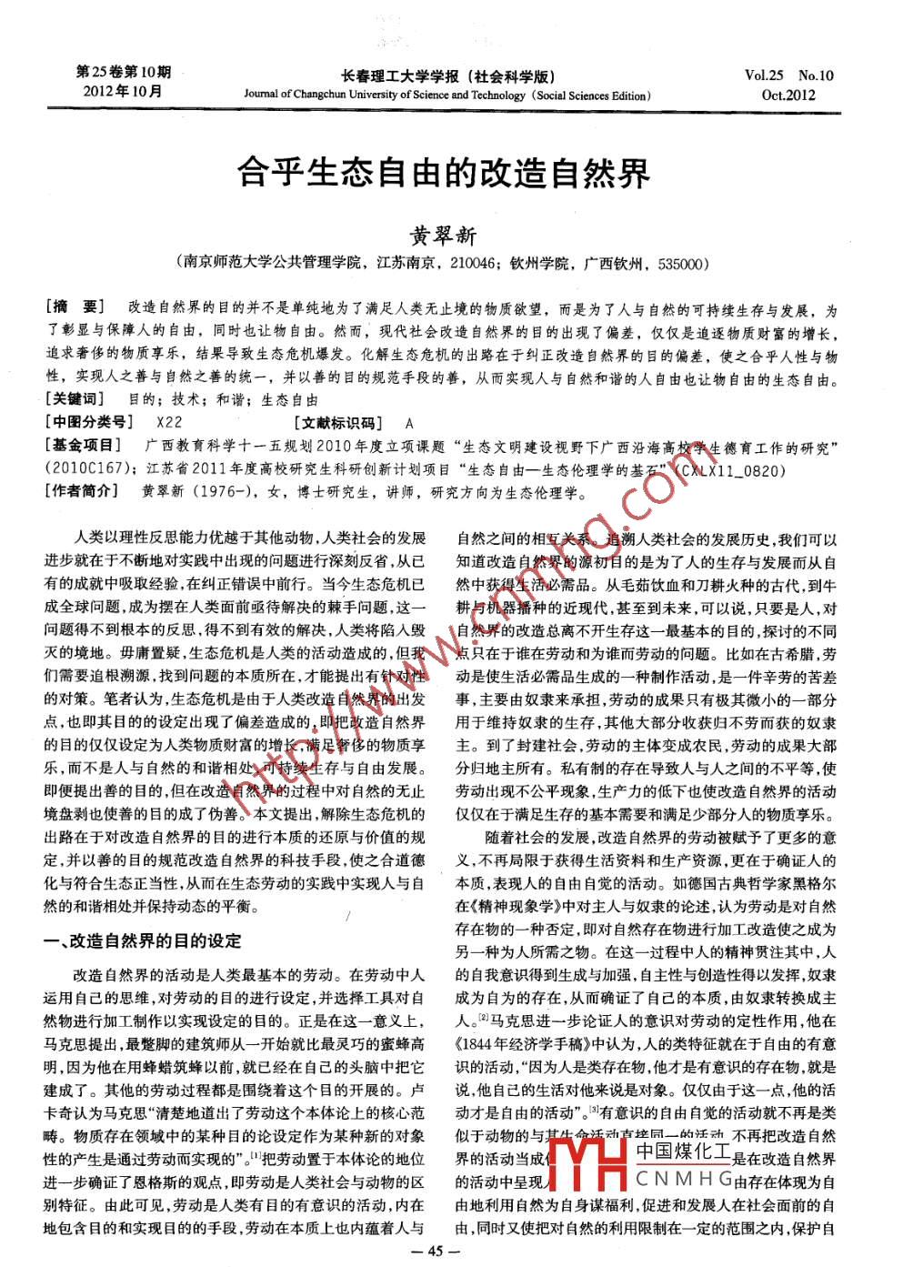第25卷第10期長春理工大學學報(社會科學版)Vol 25 No 102012年10月Joumal of Changchun University of Science and Technology(Social Sciences Edition)Oct 2012合乎生態(tài)自由的改造自然界黃翠新(南京師范大學公共管理學院,江蘇南京,210046;欽州學院,廣西欽州,535000[摘要]改造自然界的目的并不是單純地為了滿足人類無止境的物質欲望,而是為了人與自然的可持續(xù)生存與發(fā)展,為了彰顯與保障人的自由,同時也讓物自由。然而,現(xiàn)代社會改造自然界的目的出現(xiàn)了偏差,僅僅是追逐物質財富的增長,追求奢侈的物質享樂,結果導致生態(tài)危機爆發(fā)?;馍鷳B(tài)危機的出路在于糾正改造自然界的目的偏差,使之合乎人性與物性,實現(xiàn)人之善與自然之善的統(tǒng)一,并以善的目的規(guī)范手段的善,從而實現(xiàn)人與自然和諧的人自由也讓物自由的生態(tài)自由。[關鍵詞]目的;技術;和諧;生態(tài)自由[中圖分類號]X22[文獻標識碼]A[基金項目]廣西教育科學十一五規(guī)劃2010年度立項課題“生態(tài)文明建設視野下廣西沿海高校學生德育工作的研究”(2010C167);江蘇省2011年度高校研究生科研創(chuàng)新計劃項目“生態(tài)自由一生態(tài)倫理學的基石”(CXLX110820)[作者簡介]黃翠新(1976-),女,博士研究生,講師,研究方向為生態(tài)倫理學人類以理性反思能力優(yōu)越于其他動物,人類社會的發(fā)展自然之間的相互關系。追溯人類社會的發(fā)展歷史,我們可以進步就在于不斷地對實踐中出現(xiàn)的問題進行深刻反省,從已知道改造自然界的源初目的是為了人的生存與發(fā)展而從自有的成就中吸取經(jīng)驗在糾正錯誤中前行。當今生態(tài)危機已然中獲得生活必需品。從毛茹飲血和刀耕火種的古代,到牛成全球問題,成為擺在人類面前亟待解決的棘手問題,這一耕與機器播種的近現(xiàn)代,甚至到未來,可以說,只要是人,對問題得不到根本的反思,得不到有效的解決,人類將陷入毀自然界的改造總離不開生存這一最基本的目的,探討的不同滅的境地。毋庸置疑,生態(tài)危機是人類的活動造成的,但我點只在于誰在勞動和為誰而勞動的問題。比如在古希臘,勞們需要追根溯源找到問題的本質所在,才能提出有針對性動是使生活必需品生成的一種制作活動,是一件辛勞的苦差的對策。筆者認為,生態(tài)危機是由于人類改造自然界的出發(fā)事,主要由奴隸來承擔,勞動的成果只有極其微小的一部分點,也即其目的的設定出現(xiàn)了偏差造成的,即把改造自然界用于維持奴隸的生存,其他大部分收獲歸不勞而獲的奴隸的目的僅僅設定為人類物質財富的增長,滿足奢侈的物質享主。到了封建社會,勞動的主體變成農(nóng)民,勞動的成果大部樂,而不是人與自然的和諧相處,可持續(xù)生存與自由發(fā)展。分歸地主所有。私有制的存在導致人與人之間的不平等,使即便提出善的目的但在改造自然界的過程中對自然的無止勞動出現(xiàn)不公平現(xiàn)象,生產(chǎn)力的低下也使改造自然界的活動境盤剝也使善的目的成了偽善。本文提出,解除生態(tài)危機的僅僅在于滿足生存的基本需要和滿足少部分人的物質享樂。出路在于對改造自然界的目的進行本質的還原與價值的規(guī)隨著社會的發(fā)展,改造自然界的勞動被賦予了更多的意定,并以善的目的規(guī)范改造自然界的科技手段,使之合道德義,不再局限于獲得生活資料和生產(chǎn)資源,更在于確證人的化與符合生態(tài)正當性,從而在生態(tài)勞動的實踐中實現(xiàn)人與自本質,表現(xiàn)人的自由自覺的活動。如德國古典哲學家黑格爾然的和諧相處并保持動態(tài)的平衡。在《精神現(xiàn)象學》中對主人與奴隸的論述,認為勞動是對自然改造自然界的目的設定存在物的一種否定,即對自然存在物進行加工改造使之成為另一種為人所需之物。在這一過程中人的精神貫注其中,人改造自然界的活動是人類最基本的勞動。在勞動中人的自我意識得到生成與加強,自主性與創(chuàng)造性得以發(fā)揮,奴隸運用自己的思維,對勞動的目的進行設定,并選擇工具對自成為自為的存在,從而確證了自己的本質,由奴隸轉換成主然物進行加工制作以實現(xiàn)設定的目的。正是在這一意義上,人。馬克思進一步論證人的意識對勞動的定性作用,他在馬克思提出,最蹩腳的建筑師從一開始就比最靈巧的蜜蜂高《1844年經(jīng)濟學手稿》中認為,人的類特征就在于自由的有意明,因為他在用蜂蠟筑蜂以前,就已經(jīng)在自己的頭腦中把它識的活動,“因為人是類存在物,他才是有意識的存在物,就是建成了。其他的勞動過程都是圍繞著這個目的開展的。盧說,他自己的生活對他來說是對象。僅僅由于這一點,他的活卡奇認為馬克思“清楚地道出了勞動這個本體論上的核心范動才是自由的活動”。有意識的自由自覺的活動就不再是類疇。物質存在領域中的某種目的論設定作為某種新的對象似于動物的與動控同一的活動不再把改造自然性的產(chǎn)生是通過勞動而實現(xiàn)的”。把勞動置于本體論的地位界的活動當成中國煤化工是在改造自然界進一步確證了恩格斯的觀點,即勞動是人類社會與動物的區(qū)的活動中呈現(xiàn)CNMHG由存在體現(xiàn)為自別特征。由此可見,勞動是人類有目的有意識的活動,內在由地利用自然為自身謀福利,促進和發(fā)展人