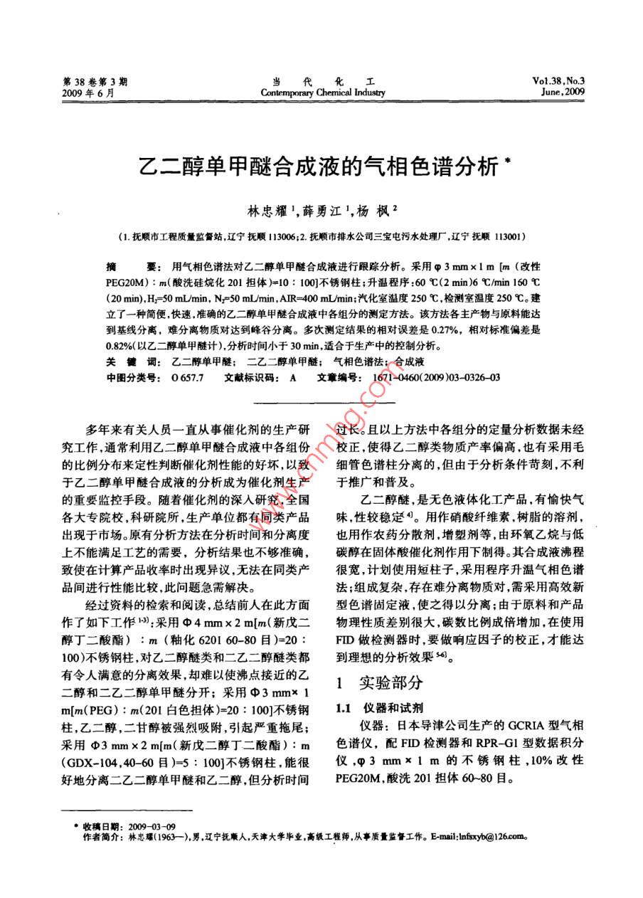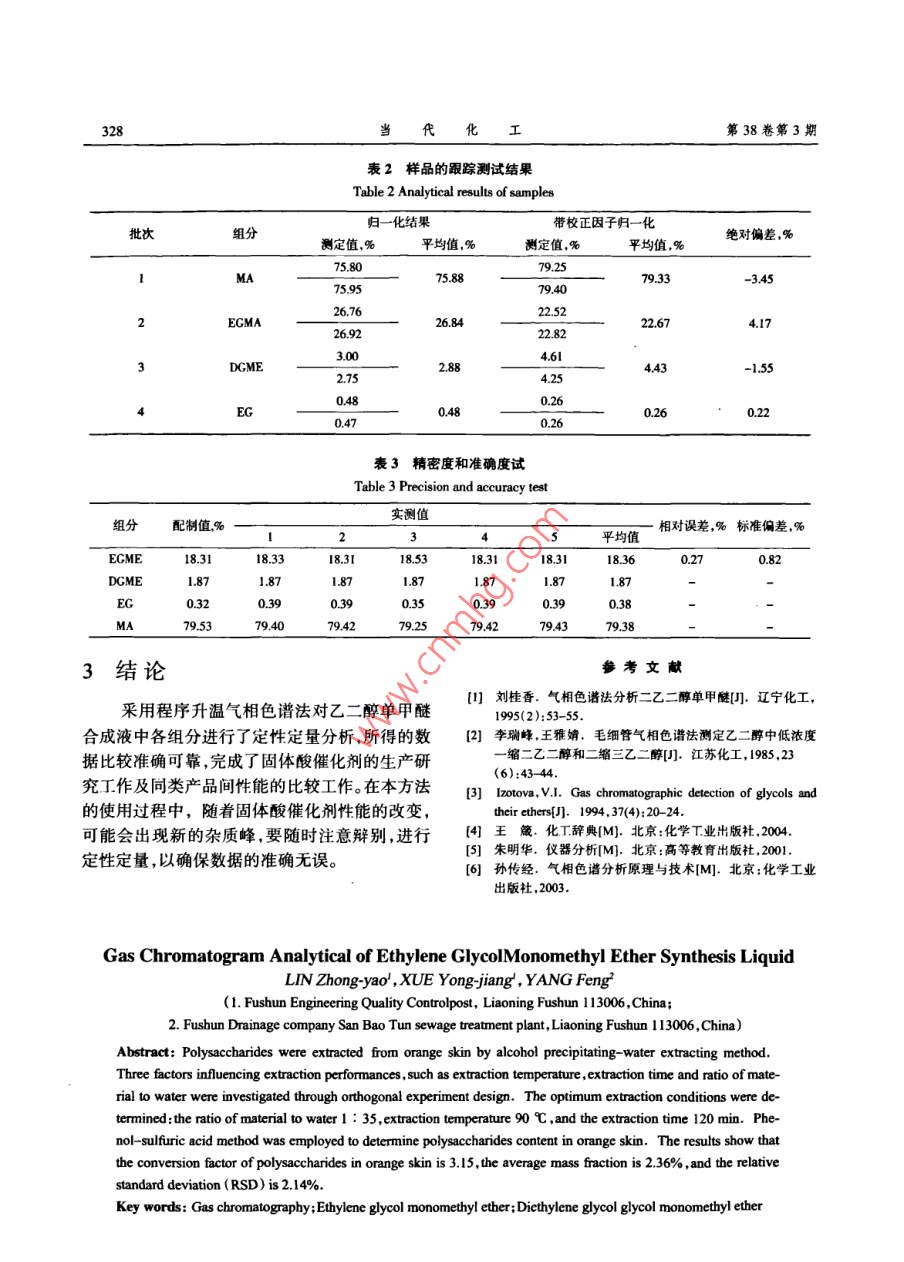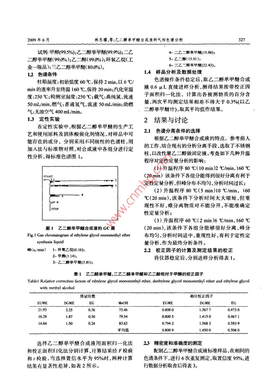 第38卷第3期當(dāng)代化工vo1.38.no.32009年6月 Contemporary Chemical Industryne,2009乙二醇單甲醚合成液的氣相色譜分析林忠耀1薛勇江1楊楓2(1.撫順市工程質(zhì)量監(jiān)督站,遼寧撫順113006;2撫順市排水公司三寶污水處理廠,遼寧撫順113001)摘要:用氣相色譜法對(duì)乙二醇單甲醚合成液進(jìn)行跟蹤分析。采用甲3mm×1m[m(改性PEG20M):m(酸洗硅烷化201擔(dān)體)=10:100]銹鋼柱;升溫程序:60℃(2min)6℃/min150℃(20min),h2=50m/min,n50ml/min,air-00mL/min;汽化室溫度250℃,檢測(cè)室溫度250℃建立了一種簡(jiǎn)便,快速,準(zhǔn)確的乙二醇單甲醚合成液中各組分的測(cè)定方法。該方法各主產(chǎn)物與原料能達(dá)到基線(xiàn)分離,難分離物質(zhì)對(duì)達(dá)到峰谷分離。多次測(cè)定結(jié)果的相對(duì)誤差是0.27%,相對(duì)標(biāo)準(zhǔn)偏差是0.82%(以乙二醇單甲醚計(jì)),分析時(shí)間小于30min,適合于生產(chǎn)中的控制分析。關(guān)鍵詞:乙二醇單甲醚;二乙二醇單甲醚;氣相色譜法;合成液中圖分類(lèi)號(hào):0657.7文獻(xiàn)標(biāo)識(shí)碼:A文章編號(hào):1671-0460(2009)03-0326-03多年來(lái)有關(guān)人員一直從事催化劑的生產(chǎn)研過(guò)長(zhǎng)。且以上方法中各組分的定量分析數(shù)據(jù)未經(jīng)究工作通常利用乙二醇單甲醚合成液中各組份校正,使得乙二醇類(lèi)物質(zhì)產(chǎn)率偏高,也有采用毛的比例分布來(lái)定性判斷催化劑性能的好壞,以致細(xì)管色譜柱分離的,但由于分析條件苛刻,不利于乙二醇單甲醚合成液的分析成為催化劑生產(chǎn)于推廣和普及。的重要監(jiān)控手段。隨著催化劑的深入研究,全國(guó)乙二醇醚,是無(wú)色液體化工產(chǎn)品,有愉快氣各大專(zhuān)院校,科研院所,生產(chǎn)單位都有同類(lèi)產(chǎn)品味,性較穩(wěn)定4。用作硝酸纖維素,樹(shù)脂的溶劑,出現(xiàn)于市場(chǎng)。原有分析方法在分析時(shí)間和分離度也用作農(nóng)藥分散劑增塑劑等,由環(huán)氧乙烷與低上不能滿(mǎn)足工藝的需要,分析結(jié)果也不夠準(zhǔn)確,碳醇在固體酸催化劑作用下制得。其合成液沸程致使在計(jì)算產(chǎn)品收率時(shí)出現(xiàn)異議無(wú)法在同類(lèi)產(chǎn)很寬,計(jì)劃使用短柱子,采用程序升溫氣相色譜品間進(jìn)行性能比較,此問(wèn)題急需解決。法;組成復(fù)雜,存在難分離物質(zhì)對(duì),需采用高效新經(jīng)過(guò)資料的檢索和閱讀,總結(jié)前人在此方面型色譜固定液,使之得以分離;由于原料和產(chǎn)品作了如下工作:采用中4mm×2m[m(新戊二物理性質(zhì)差別很大,碳數(shù)比例成倍增加,在使用醇丁二酸酯):m(釉化620160-80目)=20:FD做檢測(cè)器時(shí),要做響應(yīng)因子的校正,才能達(dá)100)不銹鋼柱,對(duì)乙二醇醚類(lèi)和二乙二醇醚類(lèi)都到理想的分析效果有令人滿(mǎn)意的分離效果,卻難以使沸點(diǎn)接近的乙二醇和二乙二醇單甲醚分開(kāi);采用中3mm×11實(shí)驗(yàn)部分m[m(PEG):m(201白色擔(dān)體)=20:100]不銹鋼1.1儀器和試劑柱,乙二醇,二甘醇被強(qiáng)烈吸附,引起嚴(yán)重拖尾;儀器:日本導(dǎo)津公司生產(chǎn)的 GCRIA型氣相采用Φ3mm×2m[m(新戊二醇丁二酸酯):m色譜儀,配FD檢測(cè)器和RPR-G1型數(shù)據(jù)積分(GDX-104,40-60目)=5:100]不銹鋼柱,能很儀,3mm×1m的不銹鋼柱,10%改性好地分離二乙二醇單甲醚和乙二醇,但分析時(shí)間PE20M,酸洗201擔(dān)體60~80目收稿日期:2009-03-099-03-0作者簡(jiǎn)介:林忠耀(1963),男,遼寧撫順人,天津大學(xué)畢業(yè),高級(jí)工程師,從事質(zhì)量監(jiān)督工作。-mail: (163), e-mail: Infsxyb@126.com.@126.com2009年6月林忠耀等:乙二醇單甲醚合成液的氣相色譜分析327試劑:甲醇(99.5%);乙二醇單甲醚(99.9%);二乙4二乙二醇單甲醚(15.06);二醇單甲醚(99.0%);乙二醇(990%);環(huán)氧乙烷(工5-乙二醇(15.91)業(yè)一級(jí)品);三乙二醇單甲醚(80.0%)6-三乙二醇單甲醚(22.43)。12色譜條件1.4樣品分析及數(shù)據(jù)處理柱箱溫度:初始溫度60℃,保持2min,以6℃/色譜操作條件穩(wěn)定后,取乙二醇單甲醚合成min的速率升至終溫160℃,保持20min;汽化室溫液0.6μL直接進(jìn)樣分析,測(cè)得結(jié)果按帶校正因度:250℃;檢測(cè)室溫度:250℃;載氣:高純氮,流速子面積歸一化法,計(jì)算出各被測(cè)物質(zhì)的百分含50mL/min,燃?xì)?普通氫氣,流速50mL/min;助燃量,兩次平均測(cè)定結(jié)果相差不得大于0.3%(以乙氣:無(wú)油空氣400 mLmin二醇單甲醚計(jì)),取其平均值作結(jié)果。13定性實(shí)驗(yàn)2結(jié)果與討論在定性實(shí)驗(yàn)中,根據(jù)乙二醇單甲醚的生產(chǎn)工藝和使用原料及固體酸催化劑情況,對(duì)樣品中可2.1色譜分離條件的選擇能存在的成分,分別采用不同極性的色譜柱,用根據(jù)乙二醇單甲醚合成液的特點(diǎn),參考前人加入法與標(biāo)準(zhǔn)物對(duì)照,對(duì)合成液中各組分進(jìn)行定的工作結(jié)合現(xiàn)有的分析分離手段,選取了不銹鋼性分析,得標(biāo)準(zhǔn)色譜圖1柱,以改性聚乙二醇做固定液,考查如下幾種升溫程序?qū)Χㄐ远糠治龅挠绊?(1)升溫程序80℃(10min)2℃/min,160℃(20min)該條件下各組分能得到很好分離有利于定性定量分析,但峰分布不均勻,分析時(shí)間過(guò)長(zhǎng);(2)升溫程序80℃(5min)10℃/min,160℃(20min),該條件下分析時(shí)間大大縮短,但重現(xiàn)性不好,難分離物質(zhì)對(duì)不能分開(kāi),不能準(zh