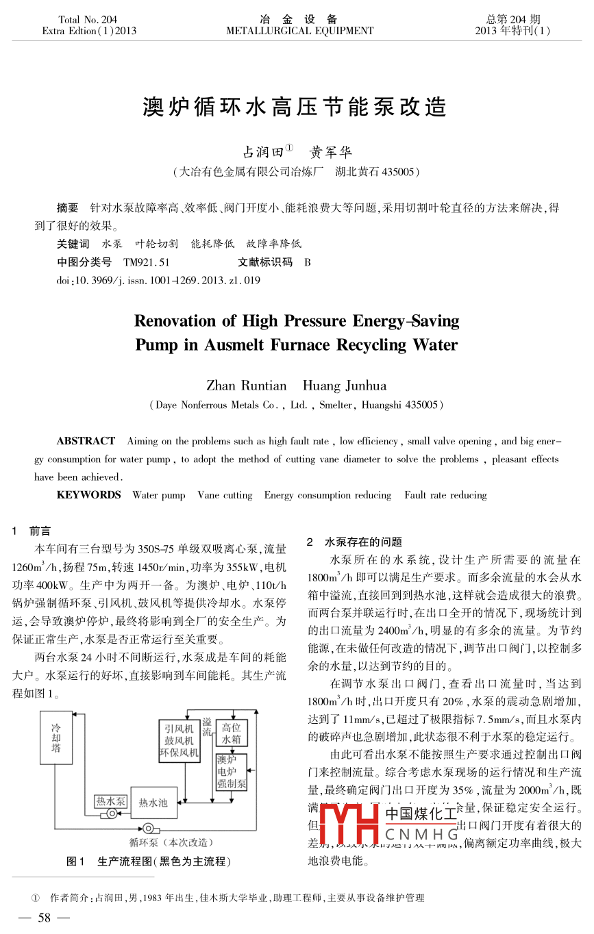 Extra Edtion(1)2013METALLURGICAL EQUIPMENT2013年特刊(1)澳爐循環(huán)水高壓節(jié)能泵改造占潤田黃軍華(大冶有色金屬有限公司冶煉廠湖北黃石435005)摘要針對水泵故障率高、效率低、閥門開度小、能耗浪費(fèi)大等冋題,采用切割葉輪直徑的方法來解決,得到了很好的效果。關(guān)鍵詞水泵葉輪切割能耗降低故障率降低中圖分類號TM921.51文獻(xiàn)標(biāo)識碼Bdoi:10.3969/j.issn.1001-269.2013.z1.019Renovation of High Pressure Energy -SavingPump in Ausmelt Furnace Recycling WaterZhan Runtian Huang JunhuaDaye Nonferrous Metals Co, Ltd, Smelter, Huangshi 435005)ABSTRACT Aiming on the problems such as high fault rate, low efficiency, small valve opening, and big energy consumption for water pump, to adopt the method of cutting vane diameter to solve the problems, pleasant effectshave been achievedKEYWORDS Water pump Vane cutting Energy consumption reducing Fault rate reducing1前言本車間有三臺型號為35075單級雙吸離心泵,流量2水泵存在的問題1260m3/h,揚(yáng)程75m,轉(zhuǎn)速1450r/mn,功率為355kW,電機(jī)水泵所在的水系統(tǒng),設(shè)計(jì)生產(chǎn)所需要的流量在功率4kW。生產(chǎn)中為兩開一備。為澳爐、電爐、110h1800m3h即可以滿足生產(chǎn)要求。而多余流量的水會從水鍋爐強(qiáng)制循環(huán)泵、引風(fēng)機(jī)、鼓風(fēng)機(jī)等提供冷卻水。水泵停箱中溢流,直接回到到熱水池,這樣就會造成很大的浪費(fèi)。運(yùn),會導(dǎo)致澳爐停爐,最終將影響到全廠的安全生產(chǎn)。為而兩臺泵并聯(lián)運(yùn)行時,在出口全開的情況下,現(xiàn)場統(tǒng)計(jì)到保證正常生產(chǎn),水泵是否正常運(yùn)行至關(guān)重要。的出口流量為2400mh,明顯的有多余的流量。為節(jié)約能源,在未做任何改造的情況下,調(diào)節(jié)出口閥門,以控制多兩臺水泵24小時不間斷運(yùn)行,水泵成是車間的耗能余的水量,以達(dá)到節(jié)約的目的。大戶。水泵運(yùn)行的好壞,直接影響到車間能耗。其生產(chǎn)流在調(diào)節(jié)水泵出口閥門,查看出口流量時,當(dāng)達(dá)到程如圖1。l800m/h時,出口開度只有20%,水泵的震動急劇增加,達(dá)到了1lmm/s,已超過了極限指標(biāo)7.5mm/s,而且水泵內(nèi)冷卻塔引風(fēng)機(jī)流」高位的破碎聲也急劇增加,此狀態(tài)很不利于水泵的穩(wěn)定運(yùn)行環(huán)保風(fēng)機(jī)由此可看出水泵不能按照生產(chǎn)要求通過控制出口閥電爐門來控制流量。綜合考慮水泵現(xiàn)場的運(yùn)行情況和生產(chǎn)流量,最終確定閥門出口開度為35%,流量為200m3/h,既熱水梨熱水池中國煤化工量保證穩(wěn)定安全運(yùn)行出口閥門開度有著很大的循環(huán)泵(本次改造滿但差CNMHG而以,偏離額定功率曲線,極大圖1生產(chǎn)流程圖(黑色為主流程)地浪費(fèi)電能①作者簡介:占潤田,男,1983年出生,佳木斯大學(xué)畢業(yè),助理工程師,主要從事設(shè)備維護(hù)管理占潤田等:澳爐循環(huán)水高壓節(jié)能泵改造2013年特刊(1)水泵在非額定情況下運(yùn)行,會加速水泵的磨損,提高資料,水泵葉輪切割前后,其流量、揚(yáng)程、軸功率之比等故障率。同時水泵的振動值很高,1#泵3.7mms、2#泵4.5切割前后外徑的一次方、二次方和三次方mm/s3#泵7.4mm/s,這種工況對水泵的穩(wěn)定運(yùn)行有著很車間內(nèi)的水泵為兩臺并聯(lián)運(yùn)行,其運(yùn)行曲線已經(jīng)發(fā)生壞的影響。車間對運(yùn)行的第一年的故障進(jìn)行了統(tǒng)計(jì),情況了變化,其流量隨裝置特性曲線變陡而減小,總的合成流如表1量小于單獨(dú)的兩倍。水泵外徑切割之后,破壞了幾何相似表12011年高壓泵故障統(tǒng)計(jì)條件,葉輪的切割應(yīng)分兩次或幾次逐漸切割,每次切割后序號日期故障備件費(fèi)用/元必須進(jìn)行試驗(yàn)。通常切割后,效率有所變化,一般是效率11.19軸損壞軸120降低。一般來說,切割量不大時,可認(rèn)為效率相等。水泵3.16葉輪根氣蝕嚴(yán)重總成18000的運(yùn)行效果,最終需要事實(shí)數(shù)據(jù)來確定。因生產(chǎn)需要,采軸承位跑內(nèi)圈,葉輪腐集水泵數(shù)據(jù)的同時,水泵的供水不能停止,即不能停產(chǎn)試蝕嚴(yán)重總成18000驗(yàn)。綜合安全穩(wěn)定等因素,最終確定將第一次切割葉輪的46.22葉輪根氣蝕嚴(yán)重總成1800直徑由原來的503m,改為480mm。即能節(jié)約電量提高58.17軸套損壞,葉輪腐蝕總成1800泵的運(yùn)行效率,同時也能滿足安全生產(chǎn)、多次切割的要求。根據(jù)公式計(jì)算,更改后的功率為308.49kW。單臺單日節(jié)610.8軸承位跑內(nèi)圈,葉輪腐約功率為1128kW。蝕嚴(yán)重總成180004現(xiàn)場的更新及數(shù)據(jù)統(tǒng)計(jì)712.29葉輪根氣蝕嚴(yán)重總成18000同廠家進(jìn)行了聯(lián)系,確認(rèn)更改對泵的整體不會有影響120000后,購置直徑480mm葉輪,并于2012年3月31日更換1#高壓泵葉輪,在滿足生產(chǎn)的條件下,對水泵的各個數(shù)據(jù)進(jìn)從表1可以開出,水泵的故障率極高,除去簡單的軸行了計(jì)量。因水泵的重要性,適當(dāng)延長下一步改造時間。承等消耗材料,非常規(guī)備件費(fèi)達(dá)到了120000此費(fèi)用足水泵運(yùn)行一段時間后,對水泵葉輪進(jìn)行了開蓋檢查,以確夠更換所有的泵頭,這對備件的成本造成了極大的壓力。定水泵的完好。在確定此次方案滿足生產(chǎn)的情況下,于8同時,水泵故障率高,對于系統(tǒng)的穩(wěn)