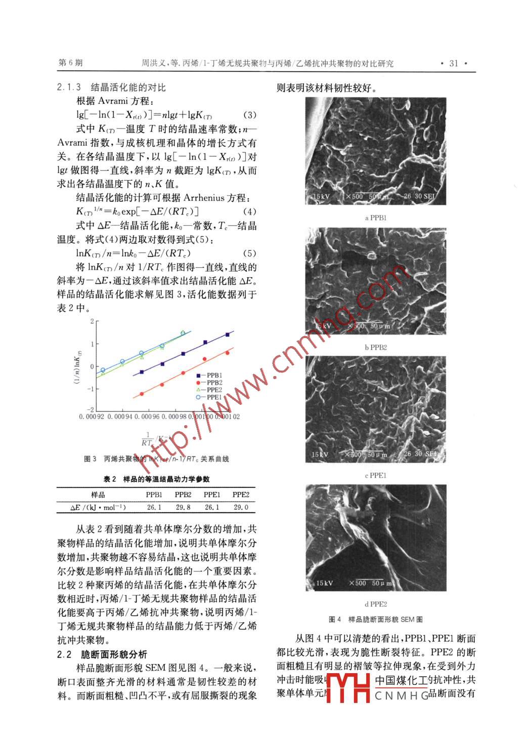 科研開發(fā)化工科技,2012,20(6):29~32scienCe TECHNOLOGY IN CHEMICAL INDUSTRY丙烯/1-丁烯無(wú)規(guī)共聚物與丙烯/乙烯抗沖共聚物的對(duì)比研究周洪義,李潤(rùn)富,劉立新2(1.中石油遼河油田錦州采油廠,遼寧凌海121209;2東北石油大學(xué)化學(xué)化工學(xué)院,黑龍江大慶163318)摘要:對(duì)丙烯/1丁烯無(wú)規(guī)共聚物(PPB)與丙烯/乙烯抗沖共聚物(PPE)的結(jié)晶行為進(jìn)行對(duì)比,在等溫結(jié)晶時(shí),通過相對(duì)結(jié)晶度隨時(shí)間的變化關(guān)系、等溫結(jié)晶曲線等研究,表明丙烯/1-丁烯無(wú)規(guī)共聚物結(jié)晶速率明顯低于丙烯/乙烯抗沖共聚物,同時(shí)丙烯/乙烯抗沖共聚物的等溫結(jié)晶速率隨乙烯單元含量增加沒有明顯降低。根據(jù) Avram方程計(jì)算了共聚物的鮚晶活化能,證明丙烯/l-丁烯無(wú)規(guī)共聚物的結(jié)晶能力較丙烯/乙烯抗沖共聚物低。掃描電鏡分析丙烯/-丁烯無(wú)規(guī)共聚物在丁烯單元摩爾分?jǐn)?shù)2.39%時(shí)沒有韌性拉伸,而丙烯/乙烯抗沖共聚物在乙烯單元摩爾分?jǐn)?shù)3%時(shí)出現(xiàn)韌性拉伸,關(guān)鍵詞:丙烯/1-丁烯無(wú)規(guī)共聚物;丙烯/乙烯抗沖共聚物;結(jié)晶性能;斷面形貌中圖分類號(hào):TQ325.1文獻(xiàn)標(biāo)識(shí)碼:A文章編號(hào):1008-0511(2012)06-0029-04聚丙烯是當(dāng)今最具發(fā)展?jié)摿Φ臉渲?共法合成。共單體單元摩爾分?jǐn)?shù)見表1。聚反應(yīng)是提高聚丙烯樹脂性能的一條重要途徑衰1實(shí)驗(yàn)聚丙烯樣品的廉爾分?jǐn)?shù)丙烯/1-丁烯無(wú)規(guī)共聚物(PPB)與常見的丙烯/乙烯共聚物(PPE)相比,具有二甲苯可溶物含量低樣品編號(hào)PPE1 PPE2 PPB1 PPB2剛韌平衡性好、低霧度持續(xù)性等優(yōu)點(diǎn),并可充分利x(共單體)/%用我國(guó)豐富的1丁烯資源。1.2儀器設(shè)備國(guó)內(nèi)外丙烯/1-丁烯無(wú)規(guī)共聚物的研究主要聚合釜:JGF5/40,中國(guó)石油化工股份有限是針對(duì)合成以及對(duì)分子量、結(jié)晶度等的分析[~5公司北京化工研究院;塑料壓片機(jī):PHI75,美國(guó)而應(yīng)用研究在國(guó)內(nèi)較少,對(duì)聚合物結(jié)晶行為的研PH公司;差式掃描量熱儀(DSC): PYRISI,美究可用來(lái)指導(dǎo)產(chǎn)品的加工過程和應(yīng)用,目前對(duì)丙國(guó)PE公司;掃描電鏡:JSM6360LA,日本電子公烯/1-丁烯共聚物結(jié)晶性能有少量的研究報(bào)道,將丙烯/1-丁烯無(wú)規(guī)共聚物與丙烯/乙烯司。1.3DSc測(cè)試方法抗沖共聚物的結(jié)晶行為對(duì)比的研究還未見報(bào)道等溫結(jié)晶實(shí)驗(yàn)方法:在№保護(hù)下將約5mg樣作者主要是將2種共聚物結(jié)晶性能進(jìn)行對(duì)品先以4℃/mn的升溫速率從室溫加熱至200℃,比,并分析了2種共聚物的脆斷面形貌,以期為丙烯/1-丁烯共聚物的應(yīng)用提供參考。并恒溫5min以消除熱歷史,再以100℃/min的降溫速率快速降溫至設(shè)定溫度進(jìn)行等溫結(jié)晶,設(shè)定1實(shí)驗(yàn)部分的等溫結(jié)晶溫度分別為122、124和126℃。結(jié)晶完成后降溫至30℃,再以10℃/min升溫至200℃。1.1主要原料丙烯/1-丁烯無(wú)規(guī)共聚物、丙烯/乙烯抗沖結(jié)晶度按式(1)計(jì)算聚物,均為實(shí)驗(yàn)室采用ZN催化劑,本體聚合方X(1)收稿日期:2012-07-29式中:X—結(jié)晶度;△Hn-試樣的熔融熱;介粱游瞿,主要油人:拖延△F—試樣結(jié)晶度達(dá)到100%時(shí)的熔融熱,按△HB=165J/g計(jì)算。氣股份有限公司科學(xué)研究與技術(shù)開發(fā)項(xiàng)2008wX05)中國(guó)煤化工CNMHG化工科技第20卷1.4掃描電鏡分析近時(shí),丙烯/1-丁烯無(wú)規(guī)共聚物的結(jié)晶時(shí)間要明顯試樣均為模壓成型,樣品厚度1mm,液氮溫長(zhǎng)于丙烯/乙烯抗沖共聚物的結(jié)晶時(shí)間,結(jié)晶速率度下脆斷,斷面噴金,觀察形貌。明顯較低,結(jié)晶溫度為124、126℃時(shí)也有相同的規(guī)律。2結(jié)果與討論2.1.2等溫結(jié)晶過程的對(duì)比2.1無(wú)規(guī)共聚聚丙烯結(jié)晶行為對(duì)比分析丙烯/1-丁烯無(wú)規(guī)共聚物、丙烯/乙烯抗沖共21.1等溫結(jié)晶過程中相對(duì)結(jié)晶度隨時(shí)間的變化聚物等溫結(jié)晶曲線見圖2。某時(shí)刻的相對(duì)結(jié)晶度用Xm表示:dHud。dndtPPB2式中,X及X∞分別表示t時(shí)刻及結(jié)晶終了的結(jié)晶度。dHa/d為t時(shí)刻結(jié)晶熱流率(放熱)。利用式(2)分別計(jì)算丙烯/1-丁烯共聚物樣品PPB1、PPB2和丙烯/乙烯抗沖共聚物樣品PPE1、PPE2在不同的結(jié)晶溫度下t時(shí)刻的相對(duì)結(jié)晶度X,并用X對(duì)結(jié)晶時(shí)間作圖。共單體單元摩爾分?jǐn)?shù)相近的丙烯/1-丁烯無(wú)規(guī)共聚物和丙烯/乙烯抗沖共聚物在122℃時(shí)的OPEl相對(duì)結(jié)晶度隨時(shí)間的變化曲線見圖1。PEl PPEI PPEl PPB1 PPB1 PPB1122℃124℃126℃22℃124℃126℃0.11.512.012.513.013.514.014.515.015.516.00.60.4PPE1:x(乙烯)=0.94%圖2樣品在122℃時(shí)的等溫結(jié)品過程對(duì)比PPB1:x(丁烯)=0.68%在同一結(jié)晶溫度下,隨1-丁烯單元摩爾分?jǐn)?shù)0.0的增加,共聚物的結(jié)晶峰明顯變寬,并且結(jié)晶峰的位置明顯向右移動(dòng),表明達(dá)到結(jié)晶終了所需要的時(shí)間長(zhǎng),結(jié)晶速率下降。而隨乙烯單元摩爾分?jǐn)?shù)PPE2的增加,丙烯/乙烯抗沖共聚物的結(jié)晶峰形狀沒有22℃PPB2PPB2PPB2太大的變化,這與丙烯/1-丁烯無(wú)