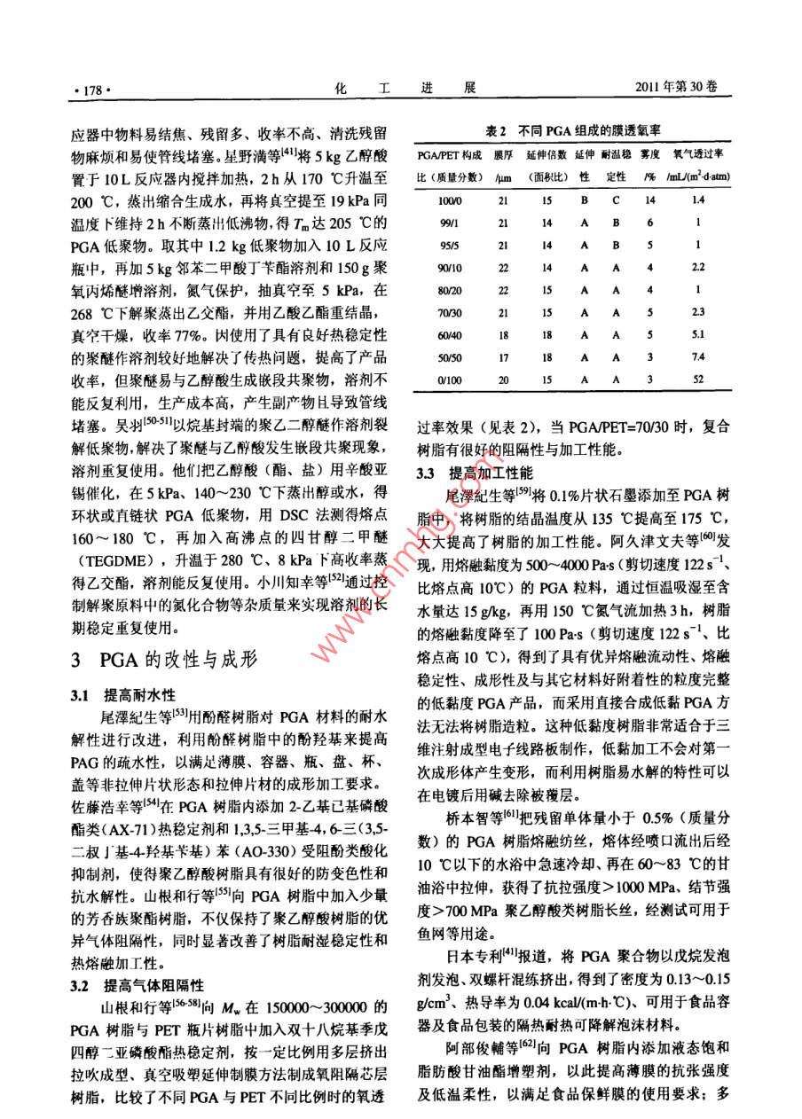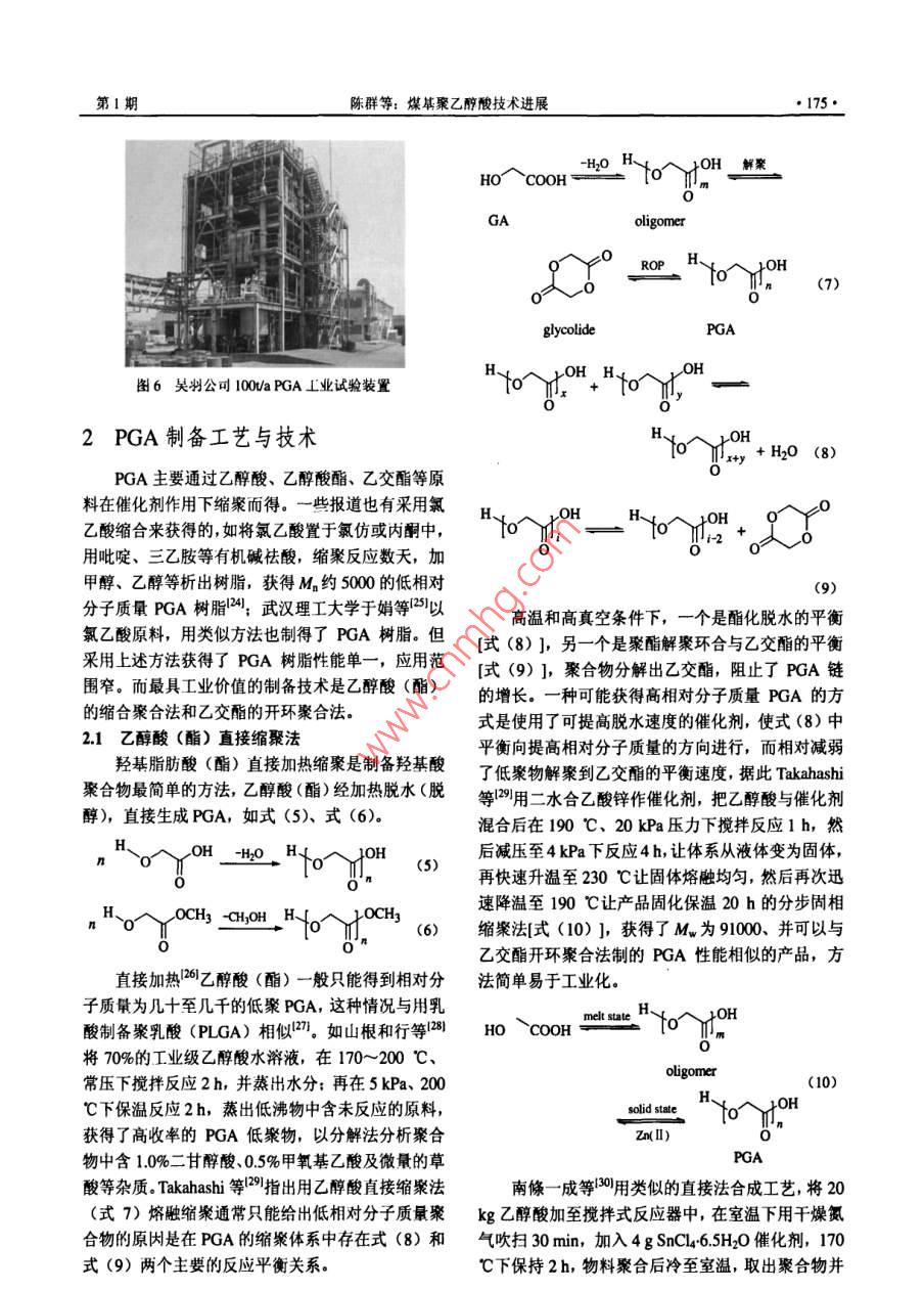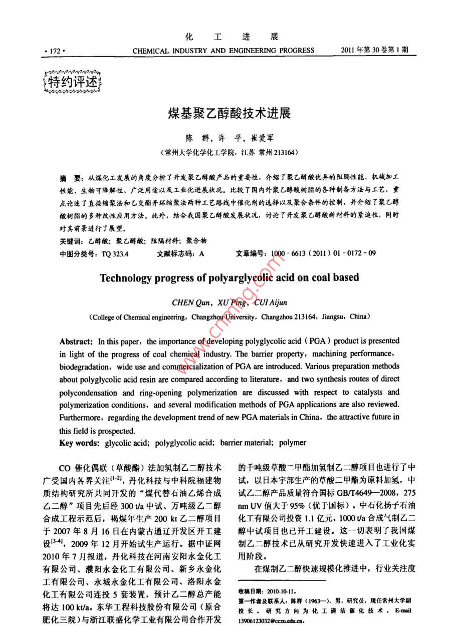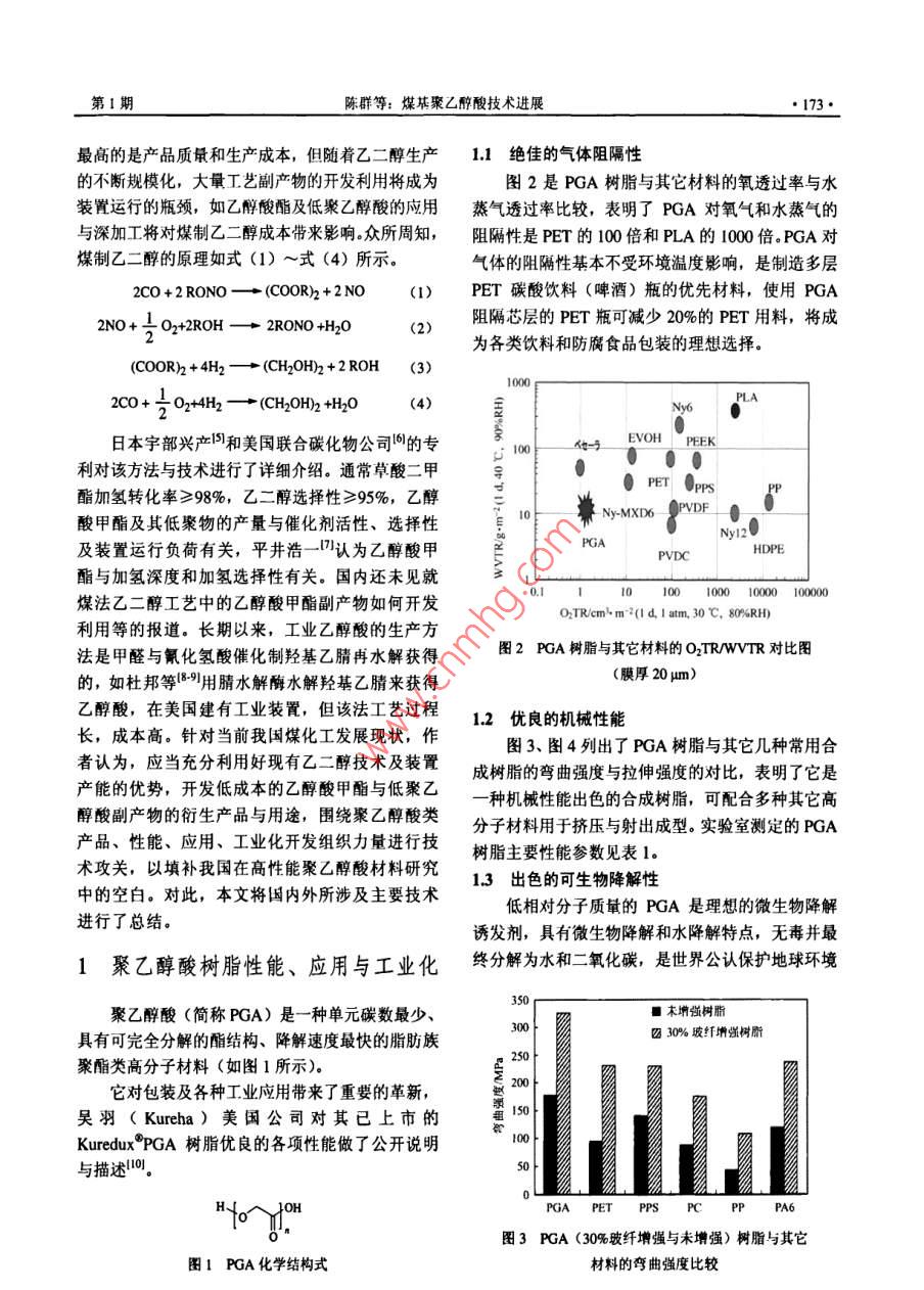 化工進·172CHEMICAL INDUSTRY AND ENGINEERING PROGRESS2011年第30卷第1特約評述煤基聚乙醇酸技術(shù)進展陳群,許平,崔愛軍(常州大學(xué)化學(xué)化工學(xué)院,江蘇常州213164)要:從煤化工發(fā)展的角度分析了開發(fā)聚乙醇酸產(chǎn)品的重要性,介紹了聚乙醇酸優(yōu)異的阻隔性能、機槭加工生物可降解性、廣泛用途以及工業(yè)化進展狀況。比較了國內(nèi)外聚乙醇酸樹脂的各種制備方法與工藝,重點論述了直接縮聚法和乙交酯開環(huán)縮聚法兩種工藝路線中催化劑的選擇以及聚合條件的控制,并介紹了聚乙醇酸樹脂的多種改性應(yīng)用方法。此外,結(jié)合我國聚乙醇酸發(fā)展狀況,討論了開發(fā)聚乙醇酸新材桿的緊迫性,同時對其前景進行了展望。關(guān)鍵詞:乙醇酸;聚乙醇酸;阻隔材料;聚合物中圖分類號:TQ3234文獻標志碼:A文章編號:1000-6613(2011)01-0172-09Technology progress of polyarglycolic acid on coal basedCHEN Qun, XU Ping, CUl AijunCollege of Chemical engineering, Changzhou University, Changzhou 213164, Jiangsu, China)Abstract: In this paper, the importance of developing polyglycolic acid(PGA)product is presentedin light of the progress of coal chemical industry. The barrier property, machining performancebiodegradation,wide use and commercialization of PGa are introduced. Various preparation methodsabout polyglycolic acid resin are compared according to literature, and two synthesis routes of directco d iti ns od seve al modification meth ods o pga applications are also reviewedFurthermore, regarding the development trend of new PGA materials in China, the attractive future inthis field is prospectedKey words: glycolic acid; polyglycolic acid; barrier material; polymerco催化偶聯(lián)(草酸酯)法加氫制乙二醇技術(shù)的千噸級草酸二甲酯加氫制乙二醇項目也進行了中廣受國內(nèi)各界關(guān)注12,丹化科技與中科院福建物試,以日本宇部生產(chǎn)的草酸二甲酯為原料加氫,中質(zhì)結(jié)構(gòu)研究所共同開發(fā)的“煤代替石油乙烯合成試乙二醇產(chǎn)品質(zhì)量符合國標GB/T46492008,275乙二醇”項目先后經(jīng)300如a中試、萬噸級乙二醇mUV值大于95%(優(yōu)于國標)。中石化揚子石油合成工程示范后,褐煤年生產(chǎn)200kt乙二醇項目化工有限公司投資11億元,1000a合成氣制乙二于2007年8月16日在內(nèi)蒙占通遼開發(fā)區(qū)開工建醇中試項目也已開工建設(shè)。這一切表明了我國煤設(shè)14,2009年12月開始試生產(chǎn)運行。據(jù)中證網(wǎng)制乙二醇技術(shù)已從研究開發(fā)快速進入了工業(yè)化實2010年7月報道,丹化科技在河南安陽永金化工用階段。有限公司、濮陽永金化工有限公司、新鄉(xiāng)永金化在煤制乙二醇快速規(guī)?;七M中,行業(yè)關(guān)注度工有限公司、永城永金化工有限公司、洛陽永金化工有限公司連投5套裝置,預(yù)計乙二醇總產(chǎn)能收福日:20010第一作者及聯(lián)系人:陳群(1963-),男,研究員,現(xiàn)任常州大學(xué)副將達100kUa,東華工程科技股份有限公司(原合長,研究方向為化工清清催化技.Em肥化三院)與浙江聯(lián)盛化學(xué)工業(yè)有限公司合作開發(fā)19∞61232@ccu.edu.cn第1期陳群等:煤林聚乙醉酸技術(shù)進展最高的是產(chǎn)品質(zhì)量和生產(chǎn)成本,但隨著乙二醇生產(chǎn)11絕佳的氣體阻隔性的不斷規(guī)?;?大量工藝副產(chǎn)物的開發(fā)利用將成為圖2是PGA樹脂與其它材料的氧透過率與水裝置運行的瓶頸,如乙醇酸酯及低聚乙醇酸的應(yīng)用蒸氣透過率比較,表明了PGA對氧氣和水蒸氣的與深加工將對煤制乙二醇成本帶來影響眾所周知,阻隔性是PET的100倍和PLA的10倍。PGA對煤制乙二醇的原理如式(1)~式(4)所示。氣體的阻隔性基本不受環(huán)境溫度影響,是制造多層Co+2RONO→(C00R)2+2NO(1)PET碳酸飲料(啤酒)瓶的優(yōu)先材料,使用PGA2NO+O2+2ROH 2RONO +H20 (2)阻隔芯層的PET瓶可減少20%的PET用料,將成為各類飲料和防腐食品包裝的理想選擇(COORh +4H2 -(CH2OH)+2 ROH (3)2c0+方O2+4H2(CH2OH2+H20(日本宇部興產(chǎn)和美國聯(lián)合碳化物公司的專利對該方法與技術(shù)進行了詳細介紹。通常草酸二甲酯加氫轉(zhuǎn)化率≥98%,乙二醇選擇性≥95%,乙醇酸甲酯及其低聚物的產(chǎn)量與催化劑活性、選擇性王導(dǎo)二E,EVOHˇrFKNy-MXD PVDF及裝置運行負荷有關(guān),平井浩一認為乙醇酸甲PVDCHDPE酯與加氫深度和加氫選擇性有關(guān)。國內(nèi)還未見就煤法乙二醇工藝中的乙醇酸甲酯副產(chǎn)物如何開發(fā)00|00010000100000OTR/cm'. m"( d, I atm, 30 C, 80%RH利用等的報道。長期以來,工業(yè)乙醇酸的生產(chǎn)方法是甲醛與氰化氫酸催化制羥基乙腈冉水解獲得圖2PGA樹脂與其它材料的O2TR/wVTR對比圖的,如杜邦等用腈水解酶水解羥基乙腈來獲得膜厚20)乙醇酸,在美國建有工業(yè)裝置,但該法工藝過程1.2優(yōu)良的機械性能長,成本高。針對當前我國煤化工發(fā)展現(xiàn)狀,作圖3、圖4列出了PGA樹脂與其它幾種常用合者認為,應(yīng)當充分利用好現(xiàn)有乙二醉技術(shù)及裝置成樹脂的彎曲強度與拉伸強度的對比,表明了它是產(chǎn)能的優(yōu)勢,開發(fā)低成本的乙醇酸甲酯與低聚乙種機械性能出色的合成樹脂,可配合多種其它高醇酸副產(chǎn)物的衍生產(chǎn)品與用途,圍繞聚乙醇酸類分子材料用于擠壓與射出成型。實驗室測定的PGA產(chǎn)品、性能、應(yīng)用、工業(yè)化開發(fā)組織力量進行技術(shù)攻關(guān),以填補我國在高性