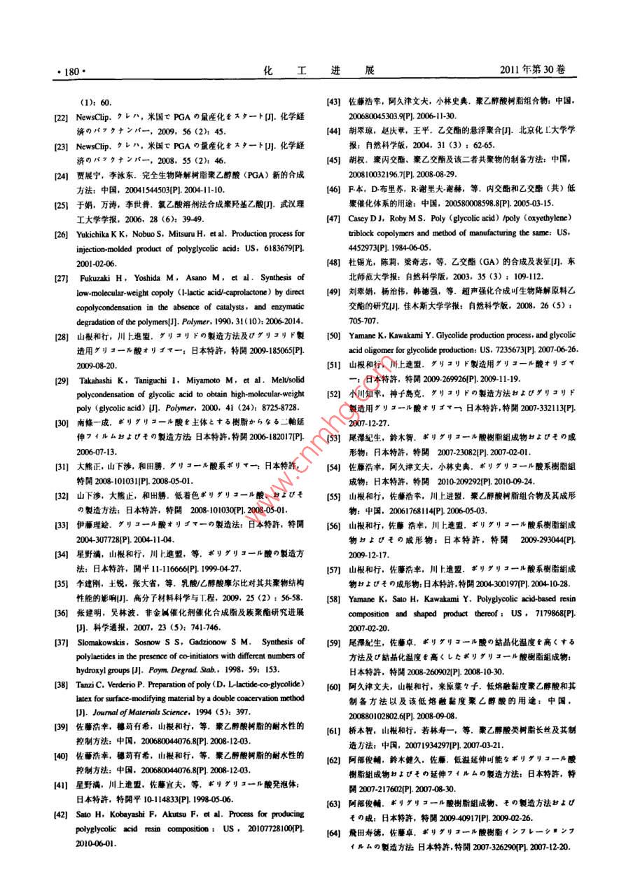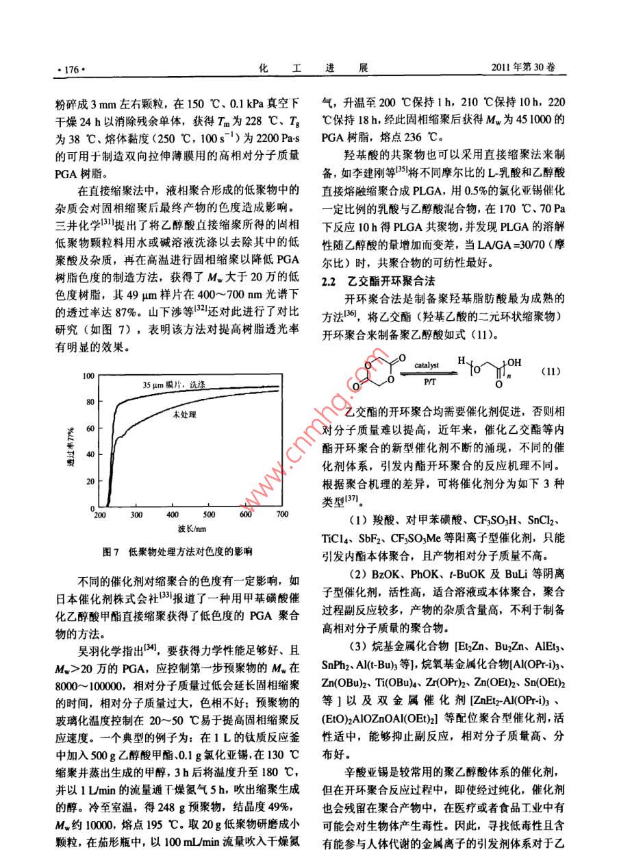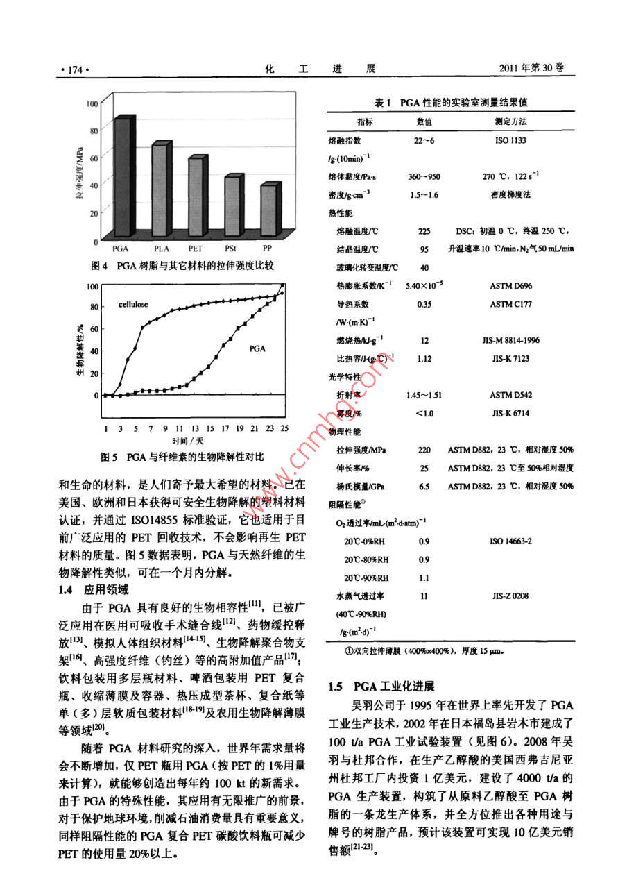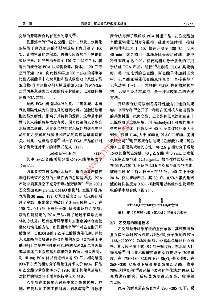 化工進·172CHEMICAL INDUSTRY AND ENGINEERING PROGRESS2011年第30卷第1特約評述煤基聚乙醇酸技術(shù)進展陳群,許平,崔愛軍(常州大學(xué)化學(xué)化工學(xué)院,江蘇常州213164)要:從煤化工發(fā)展的角度分析了開發(fā)聚乙醇酸產(chǎn)品的重要性,介紹了聚乙醇酸優(yōu)異的阻隔性能、機槭加工生物可降解性、廣泛用途以及工業(yè)化進展狀況。比較了國內(nèi)外聚乙醇酸樹脂的各種制備方法與工藝,重點論述了直接縮聚法和乙交酯開環(huán)縮聚法兩種工藝路線中催化劑的選擇以及聚合條件的控制,并介紹了聚乙醇酸樹脂的多種改性應(yīng)用方法。此外,結(jié)合我國聚乙醇酸發(fā)展狀況,討論了開發(fā)聚乙醇酸新材桿的緊迫性,同時對其前景進行了展望。關(guān)鍵詞:乙醇酸;聚乙醇酸;阻隔材料;聚合物中圖分類號:TQ3234文獻標志碼:A文章編號:1000-6613(2011)01-0172-09Technology progress of polyarglycolic acid on coal basedCHEN Qun, XU Ping, CUl AijunCollege of Chemical engineering, Changzhou University, Changzhou 213164, Jiangsu, China)Abstract: In this paper, the importance of developing polyglycolic acid(PGA)product is presentedin light of the progress of coal chemical industry. The barrier property, machining performancebiodegradation,wide use and commercialization of PGa are introduced. Various preparation methodsabout polyglycolic acid resin are compared according to literature, and two synthesis routes of directco d iti ns od seve al modification meth ods o pga applications are also reviewedFurthermore, regarding the development trend of new PGA materials in China, the attractive future inthis field is prospectedKey words: glycolic acid; polyglycolic acid; barrier material; polymerco催化偶聯(lián)(草酸酯)法加氫制乙二醇技術(shù)的千噸級草酸二甲酯加氫制乙二醇項目也進行了中廣受國內(nèi)各界關(guān)注12,丹化科技與中科院福建物試,以日本宇部生產(chǎn)的草酸二甲酯為原料加氫,中質(zhì)結(jié)構(gòu)研究所共同開發(fā)的“煤代替石油乙烯合成試乙二醇產(chǎn)品質(zhì)量符合國標GB/T46492008,275乙二醇”項目先后經(jīng)300如a中試、萬噸級乙二醇mUV值大于95%(優(yōu)于國標)。中石化揚子石油合成工程示范后,褐煤年生產(chǎn)200kt乙二醇項目化工有限公司投資11億元,1000a合成氣制乙二于2007年8月16日在內(nèi)蒙占通遼開發(fā)區(qū)開工建醇中試項目也已開工建設(shè)。這一切表明了我國煤設(shè)14,2009年12月開始試生產(chǎn)運行。據(jù)中證網(wǎng)制乙二醇技術(shù)已從研究開發(fā)快速進入了工業(yè)化實2010年7月報道,丹化科技在河南安陽永金化工用階段。有限公司、濮陽永金化工有限公司、新鄉(xiāng)永金化在煤制乙二醇快速規(guī)?;七M中,行業(yè)關(guān)注度工有限公司、永城永金化工有限公司、洛陽永金化工有限公司連投5套裝置,預(yù)計乙二醇總產(chǎn)能收福日:20010第一作者及聯(lián)系人:陳群(1963-),男,研究員,現(xiàn)任常州大學(xué)副將達100kUa,東華工程科技股份有限公司(原合長,研究方向為化工清清催化技.Em肥化三院)與浙江聯(lián)盛化學(xué)工業(yè)有限公司合作開發(fā)19∞61232@ccu.edu.cn第1期陳群等:煤林聚乙醉酸技術(shù)進展最高的是產(chǎn)品質(zhì)量和生產(chǎn)成本,但隨著乙二醇生產(chǎn)11絕佳的氣體阻隔性的不斷規(guī)?;?大量工藝副產(chǎn)物的開發(fā)利用將成為圖2是PGA樹脂與其它材料的氧透過率與水裝置運行的瓶頸,如乙醇酸酯及低聚乙醇酸的應(yīng)用蒸氣透過率比較,表明了PGA對氧氣和水蒸氣的與深加工將對煤制乙二醇成本帶來影響眾所周知,阻隔性是PET的100倍和PLA的10倍。PGA對煤制乙二醇的原理如式(1)~式(4)所示。氣體的阻隔性基本不受環(huán)境溫度影響,是制造多層Co+2RONO→(C00R)2+2NO(1)PET碳酸飲料(啤酒)瓶的優(yōu)先材料,使用PGA2NO+O2+2ROH 2RONO +H20 (2)阻隔芯層的PET瓶可減少20%的PET用料,將成為各類飲料和防腐食品包裝的理想選擇(COORh +4H2 -(CH2OH)+2 ROH (3)2c0+方O2+4H2(CH2OH2+H20(日本宇部興產(chǎn)和美國聯(lián)合碳化物公司的專利對該方法與技術(shù)進行了詳細介紹。通常草酸二甲酯加氫轉(zhuǎn)化率≥98%,乙二醇選擇性≥95%,乙醇酸甲酯及其低聚物的產(chǎn)量與催化劑活性、選擇性王導(dǎo)二E,EVOHˇrFKNy-MXD PVDF及裝置運行負荷有關(guān),平井浩一認為乙醇酸甲PVDCHDPE酯與加氫深度和加氫選擇性有關(guān)。國內(nèi)還未見就煤法乙二醇工藝中的乙醇酸甲酯副產(chǎn)物如何開發(fā)00|00010000100000OTR/cm'. m"( d, I atm, 30 C, 80%RH利用等的報道。長期以來,工業(yè)乙醇酸的生產(chǎn)方法是甲醛與氰化氫酸催化制羥基乙腈冉水解獲得圖2PGA樹脂與其它材料的O2TR/wVTR對比圖的,如杜邦等用腈水解酶水解羥基乙腈來獲得膜厚20)乙醇酸,在美國建有工業(yè)裝置,但該法工藝過程1.2優(yōu)良的機械性能長,成本高。針對當前我國煤化工發(fā)展現(xiàn)狀,作圖3、圖4列出了PGA樹脂與其它幾種常用合者認為,應(yīng)當充分利用好現(xiàn)有乙二醉技術(shù)及裝置成樹脂的彎曲強度與拉伸強度的對比,表明了它是產(chǎn)能的優(yōu)勢,開發(fā)低成本的乙醇酸甲酯與低聚乙種機械性能出色的合成樹脂,可配合多種其它高醇酸副產(chǎn)物的衍生產(chǎn)品與用途,圍繞聚乙醇酸類分子材料用于擠壓與射出成型。實驗室測定的PGA產(chǎn)品、性能、應(yīng)用、工業(yè)化開發(fā)組織力量進行技術(shù)攻關(guān),以填補我國在高性