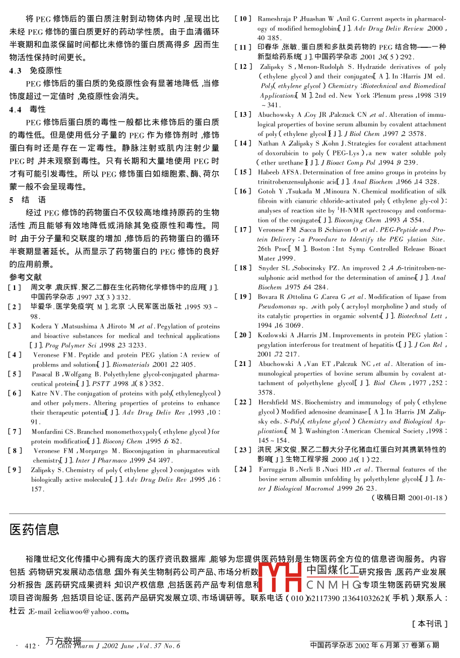離子替代等相結(jié)合的方法。另外還可結(jié)合胞內(nèi)代謝產(chǎn)物扣[7] Bertaso F, Hendry BM, Donohoe p. Alterations in out ward K制的方法進(jìn)行通道分離和鑒別。再有就是基因篩選克隆并currents on removal of extemal Ca2+ in human atrial my[J]. Biochem Biophys Res Commun 2000 273 1 ):10表達(dá)不同通道亞基的方法能夠達(dá)到分離通道的目的如卵母[8] Koumi s. Backer CL, Arentzen CE. Characterization of in wardly細(xì)胞或人工質(zhì)膜表達(dá)可以作為膜片鉗技術(shù)的輔助手段。隨rectifying Knel in human cardiac myocytes. Alterations in著對離子通道門控特性和調(diào)控機(jī)理認(rèn)識的深入將有更多分channel behavior in myocytes isolated from patients with idio.離和鑒定方法得到應(yīng)用。thie dilated cardiomyopathy[ J ] Circulation, 1995, 92(2)8結(jié)語[9] Frazier CJ, George EG Jones SW. Apparent changes in ion selec膜片鉗技術(shù)以其實(shí)用、快速、靈敏、準(zhǔn)確及重復(fù)性好等技tivity caused by changes in intracellular K during whole-cellrecording J]. Biophys J 784): 1872術(shù)優(yōu)勢已經(jīng)在大量的研究中得到證實(shí)。這一技術(shù)發(fā)明至今[10] Zhou WG, Fontenot j, Liu s,et. Modulation of cardiac calcium已有20多年歷史國外20世紀(jì)80年代中期用此技術(shù)進(jìn)行hannels by propofo[ J ] Anesthesiology 1997 86 670研究并推廣國內(nèi)20世紀(jì)90年代初引進(jìn)這一技術(shù)。但國內(nèi)[11 Nygren A, Fiset C, Firek jw,n. Mathematical model ofatrial cell the role of K currents in repolarization目前由于多種原因用此技術(shù)進(jìn)行心血管藥物與心肌細(xì)胞離. Circ res,l9988x1)為3子通道的研究相對還多停留在動物細(xì)胞階段。種屬及組織[12] Priebe l, Beuckelmann DJ. Simulation study of cellar electric差異使得實(shí)驗(yàn)數(shù)據(jù)與人或臨床的聯(lián)系上還有一段距離亟待[13]ha¥, trom JA, Furukawa T Charact采用人體細(xì)胞進(jìn)行大量的研究這也是今后藥物研究(包括the sodium current in single human atrial myocyte J ]. Cric Res麻醉藥物舶一個熱點(diǎn)領(lǐng)域。隨著在分子水平上對心臟離子199271(3)535通道門控動力學(xué)及調(diào)控機(jī)制的認(rèn)識,也將使進(jìn)一步揭示心肌[14] Schneider M Proebstle T Hombach V,et al. Characterization ofthe sodium currents in isolated human cardiocyte J]. Pfuegers細(xì)胞的生理和病理生理過程成為可能。Arch 1994 428 84參考文獻(xiàn)15 Renate H Frank S Stephan H et al. Single-channel properties of[1]方福德周呂,丁濂等.現(xiàn)代醫(yī)學(xué)實(shí)驗(yàn)技巧全書(下冊IM]L-type calcium channels from failing human ventricle[ J ].Car-北京北京醫(yī)科大學(xué)中國協(xié)和醫(yī)科大學(xué)聯(lián)合出版社,1995[16] Mewes T, Ursula R L-type calcium currents of human[2] Kitamura H Yokoyama M Akita H et al. Tertiapin potently andfrom ventricle of non-failing and failing hearts and from[J]. J Mol Cell Cardiol 1994 26: 130selectively blocks muscarinic K' channels in rabbit cardiac my- 17] Quadid H, Albat B, Nargeot J Calcium currents in diseased hiocyte[ J]. J Pharmacol Exp Ther 2000 293(1): 196[3 J Nenov NI, Crumb WJ, Pigott JD , et al. Quinidine interactionman cardiac cell J]. J Cardiovasc Pharmaco!, 1995 25282with human atrial potassium channels-developmental aspect[J]. [18] Li GR Feng JL, Wang ZG et al. Comparative mechanisms of 4.Circ res,998428):1224ninopyridine-resistant Ito in human and rabbit atrial myocyt[4]趙穎胡大一楊新春等肽類血管緊張素Ⅱ受體拮抗劑對心[J]. Am J Physiol, 1995 26 38 ): H463肌細(xì)胞離子通道的影響J中華心血管病雜志2008X1):[19] Li GR,Feng JN, Yue Lx et al. Transmural heterogeneity of adion potentials and Itol in myocytes isolated from the human rightventricl J]. Am J Physiol, 1998 275 2 Pt 2 ) H369[5] Hamill OP, Martty A, Neher E, et al. Improved patch-caI 20] Amos GJ, Wettwer E, Metzger F et al. Differences bet ween out-echniques for high-resolution current recording from cells andcell-free membrane patched J ]. Pfluegers Arch 981 39185ocyte[ J ] J Physiol. Lond ),1996A91 31electropharmacological studie[ J]. Pharmacol Res 2000 Ax 1): [21 Noma A ATP-regulate K' channels in cardiac muscle J ]. Notrel983305147(收稿日期2001-0305)藥物蛋白的聚乙二醇修飾姜忠義高蓉許松偉王艷強(qiáng)(天津大學(xué)化工學(xué)院天津30002)摘要淚目的較為系統(tǒng)地了解藥物蛋白的聚乙二醇修飾過程。方法根據(jù)現(xiàn)有文獻(xiàn)就聚乙二醇類修飾劑選擇、修飾反應(yīng)原理與操作祭件、過程設(shè)計(jì)與產(chǎn)品純化、生物化學(xué)和生物學(xué)分析定性等問題作出簡要論述。結(jié)果與結(jié)論聚乙二醇修飾后的蛋白質(zhì)被賦予了許多新的物理化學(xué)和生物學(xué)特性以及臨床效果得到了明顯改善顯示了藥物蛋白的聚乙二醇修飾的良好應(yīng)用前景中國煤化工關(guān)鍵詞聚乙二醇沘學(xué)修飾藥物蛋白CNMHG中圖分類號TQ464.7R977.6文獻(xiàn)標(biāo)識碼文章編號J2人作者簡介姜忠義男博士副教授Tel(022)27890882Fax(022)3513454E-mailzhijiang@mail.zdnet.com.中國藥學(xué)泰握6月第37卷第6Chin Pharm /,2002 June, Vol, 37 No. 6.409蛋白質(zhì)藥物主要有蛋白質(zhì)激素和干擾素、血漿蛋白質(zhì)蛋白質(zhì)類生長調(diào)節(jié)因子和神經(jīng)營養(yǎng)因子、黏蛋白、膠原蛋白mPbG-O-COCH: 000-N琥珀酰膠類CH oc堿性蛋白、蛋白酶抑制劑和植物凝集素、白細(xì)胞介素、集落刺激因子等1。蛋白質(zhì)藥物由于具有作用專一、高效等特點(diǎn)PEG--O-C-N-C-C-OH而在人類健康中發(fā)揮著日益