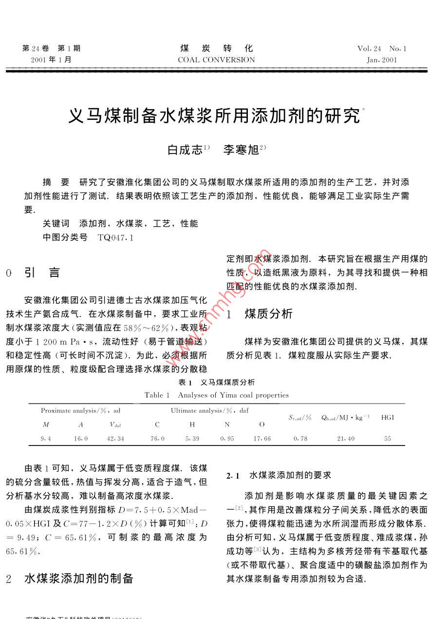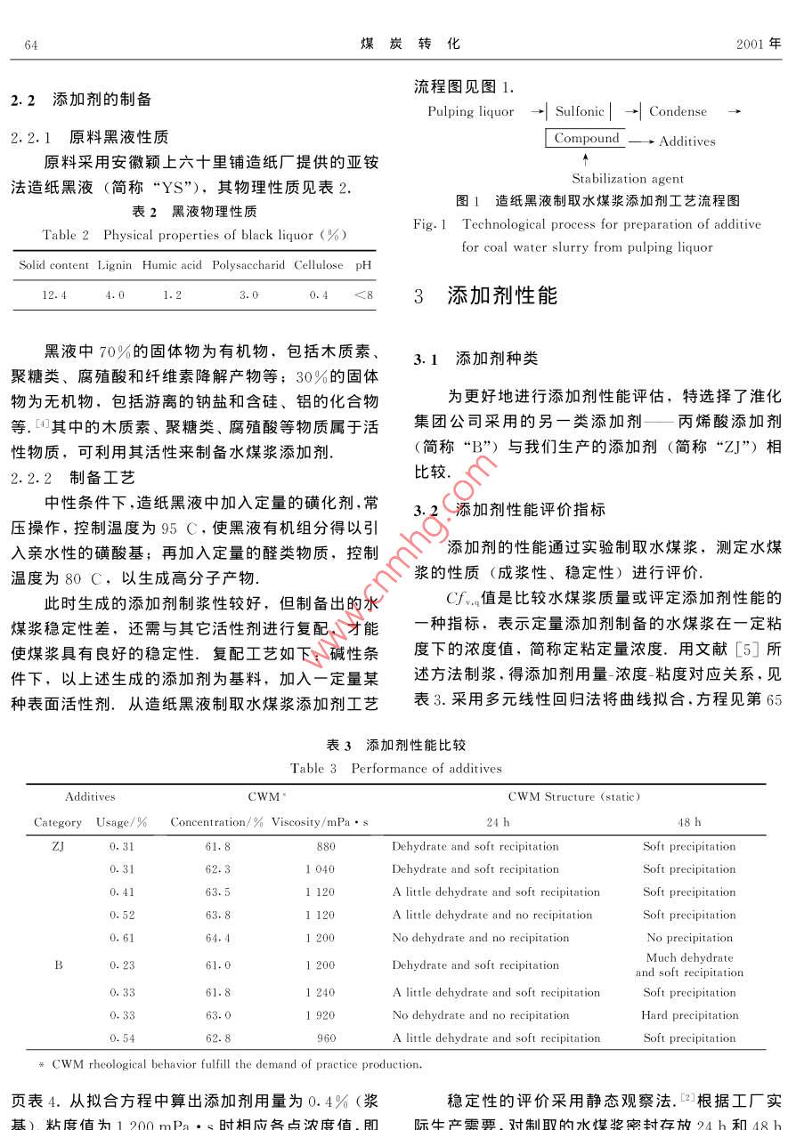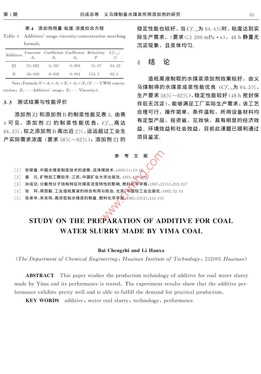 第第1期煤炭轉(zhuǎn)化Vol 24 No. 1年1月COAL CONVERSION義馬煤制備水煤漿所用添加劑的研究白成志1)李寒旭?摘要研究了安徽淮化集團(tuán)公司的義馬煤制取水煤漿所適用的添加劑的生產(chǎn)工藝,并對(duì)添加劑性能進(jìn)行了測(cè)試.結(jié)果表明依照該工藝生產(chǎn)的添加劑,性能優(yōu)良,能夠滿足工業(yè)實(shí)際生產(chǎn)需要關(guān)鍵詞添加劑,水煤漿,工藝,性能中圖分類號(hào)TQ047.1定劑即水煤漿添加劑.本研究旨在根據(jù)生產(chǎn)用煤的引言性質(zhì),以造紙黑液為原料,為其尋找和提供一種相匹配的性能優(yōu)良的水煤漿添加劑.安徽淮化集團(tuán)公司引進(jìn)德士古水煤漿加壓氣化技術(shù)生產(chǎn)氨合成氣.在水煤漿制備中,要求工業(yè)所1煤質(zhì)分析制水煤漿濃度大(實(shí)測(cè)值應(yīng)在58%~62%),表觀粘度小于1200mPa·s,流動(dòng)性好(易于管道輸送煤樣為安徽淮化集團(tuán)公司提供的義馬煤,其煤和穩(wěn)定性高(可長時(shí)間不沉淀).為此,必須根據(jù)所質(zhì)分析見表1.煤粒度服從實(shí)際生產(chǎn)要求用原煤的性質(zhì)、粒度級(jí)配合理選擇水煤漿的分散穩(wěn)表1義馬煤煤質(zhì)分析Table 1 Analyses of Yima coal propertiesS,,ad/% Qb ad/MJ kg1 HGIN16.042.3476.017.660.7821.40由表1可知,義馬煤屬于低變質(zhì)程度煤.該煤的硫分含量較低.熱值與揮發(fā)分高,適合于造氣,但2.1水煤漿添加劑的要求分析基水分較高,難以制備高濃度水煤漿添加劑是影響水煤漿質(zhì)量的最關(guān)鍵因素之由煤炭成漿性判別指標(biāo)D=7.5+0.5×Mad--,其作用是改善煤粒分子間關(guān)系,降低水的表面0.05×H(I及C=77-1.2×D(%)計(jì)算可知口:D張力,使得煤粒能迅速為水所潤濕而形成分散體系9.49;C=65.61%,可制漿的最高濃度為由分析可知,義馬煤屬于低變質(zhì)程度、難成漿煤,孫65.61%成功等③認(rèn)為,主結(jié)構(gòu)為多核芳烴帶有芐基取代基(或不帶取代基)、聚合度適中的磺酸鹽添加劑作為水煤漿添加劑的制備其水煤漿制備專用添加劑較為合適煤炭轉(zhuǎn)化2001年2.2添加劑的制備流程圖見圖1Pulping liquorCondense2.2.1原料黑液性質(zhì)dditives原料采用安徽穎上六十里鋪造紙廠提供的亞銨法造紙黑液(簡(jiǎn)稱“YS”),其物理性質(zhì)見表2Stabilization agent圖1造紙黑液制取水煤漿添加劑工藝流程圖表2黑液物理性質(zhì)Fig 1 Technological process for preparation of additiveTable 2 Physical properties of black liquor (%)for coal water slurry from pulping liquorSolid content Lignin Humic acid Polysaccharid Cellulose pH12.4401-23.00.4<83添加劑性能黑液中70%的固體物為有機(jī)物,包括木質(zhì)素1添加劑種類聚糖類、腐殖酸和纖維素降解產(chǎn)物等;30%的固體物為無機(jī)物,包括游離的鈉鹽和含硅、鋁的化合物為更好地進(jìn)行添加劑性能評(píng)估,特選擇了淮化等.其中的木質(zhì)素、聚糖類、腐殖酸等物質(zhì)屬于活集團(tuán)公司采用的另一類添加劑丙烯酸添加劑性物質(zhì),可利用其活性來制備水煤漿添加劑.(簡(jiǎn)稱“B”)與我們生產(chǎn)的添加劑(簡(jiǎn)稱“幻J”)相2.2.2制備工藝比較中性條件下造紙黑液中加入定量的磺化劑常3.2添加劑性能評(píng)價(jià)指標(biāo)壓操作,控制溫度為95C,使黑液有機(jī)組分得以引入親水性的磺酸基;再加入定量的醛類物質(zhì),控制添加劑的性能通過實(shí)驗(yàn)制取水煤漿,測(cè)定水煤溫度為80C,以生成高分子產(chǎn)物漿的性質(zhì)(成漿性、穩(wěn)定性)進(jìn)行評(píng)價(jià).此時(shí)生成的添加劑制漿性較好,但制備出的水C∫、值是比較水煤漿質(zhì)量或評(píng)定添加劑性能的煤漿穩(wěn)定性差,還需與其它活性劑進(jìn)行復(fù)配,才能種指標(biāo),表示定量添加劑制備的水煤漿在一定粘使煤漿具有良好的穩(wěn)定性.復(fù)配工藝如下:堿性條度下的濃度值,簡(jiǎn)稱定粘定量濃度.用文獻(xiàn)[5所件下,以上述生成的添加劑為基料,加入一定量某述方法制漿,得添加劑用量濃度粘度對(duì)應(yīng)關(guān)系,見種表面活性劑.從造紙黑液制取水煤漿添加劑工藝表3.采用多元線性回歸法將曲線擬合,方程見第65表3添加劑性能比較Table 3 Performance of additivesCWM Structure (staticCategory Usage/% Concentration/% Viscosity/mPa.s24h48h0.3161.8Dehydrate and soft recipitationSoft precipitation0.31Soft precipitation0.411120A little dehydrate and no recipitation0.6164,4No dehydrate and no recipitationN120Dehydrate and soft recipitatMuch dehydraA little dehydrate and soft recipitation Soft precipitation1920No dehydrate and no recipitationHard precipitation62.8A little dehydrate and soft recipitationSoft precipitationCWM rheological behavior fulfill the demand of practice production.頁表4.從擬合方程中算出添加劑用量為0.4%(漿穩(wěn)定性的評(píng)價(jià)采用靜態(tài)觀察法.2根據(jù)工廠實(shí)第1期白成志等義馬煤制備水煤漿所用添加劑的研究65表4添加劑用量-粘度-濃度擬合方程穩(wěn)定性能也較好,當(dāng)Cf。為64.4%時(shí),粘度達(dá)到實(shí)Table4 Additives usage-viscosity-concentration matching際生產(chǎn)需求,(要求≤1200mPa·s),48h靜置無沉淀現(xiàn)象,且漿體均勻Constant Coefficient Coefficient Relativity C/va/Additives AcZJ55.6823.5870.00655,0764.324結(jié)論58.0286.6680.001153.3造紙黑液制取的水煤漿添加劑效果較好,由義Note: Formula y=Aa+A1×X1+A2×x2(Y— CWM concen-tration: XIAdditives'usage: X2- Viscosity馬煤制得的水煤漿成漿性能優(yōu)良(Cf