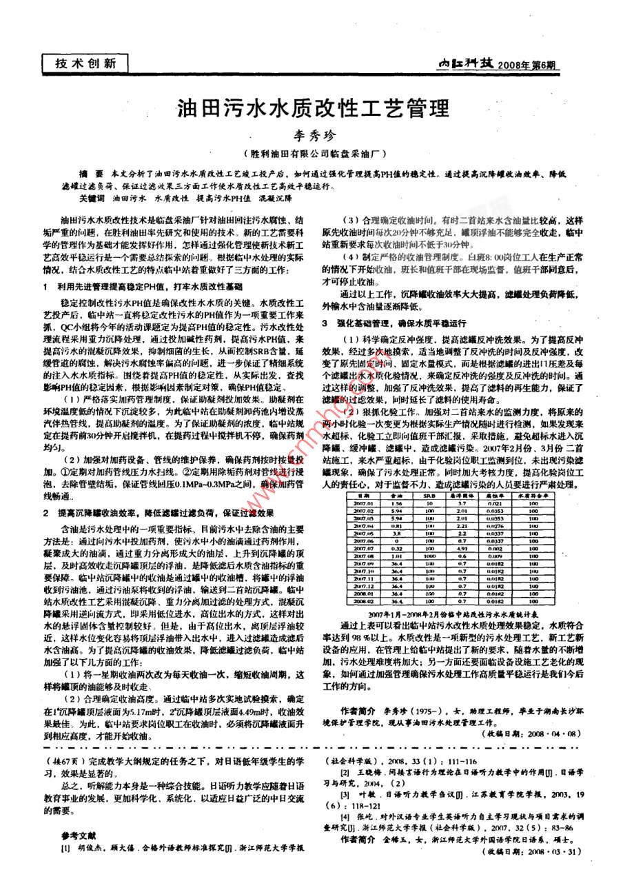 技術(shù)創(chuàng)新科技2008年第6期油田污水水質(zhì)改性工藝管理李秀珍(勝利油田有限公司臨盤采油廠)擠要本文分析了油田污水水質(zhì)改性工藝竣工投產(chǎn)后,如何通過強(qiáng)化管理提高PH值的穗定性。通過提高沉降罐收油效、降低濾罐過濾負(fù)荷、保證過濾收罘三方面工作使水質(zhì)改性工藝高效平穩(wěn)運(yùn)行關(guān)鍵詞油田污水水質(zhì)改性提高污水PH值混凝沉降油田污水水質(zhì)改性技術(shù)是臨盤采油廠針對(duì)油出回注污水腐蝕、結(jié)(3)合理確定收油時(shí)間。有時(shí)二首站來水含油量比較高,這樣垢嚴(yán)重的問題,在勝利油出率先研究和使用的技術(shù)。新的工藝需要科原先收油時(shí)間每次20分鐘不夠充足,罐頂浮油不能夠完全收走,臨中學(xué)的管理作為基礎(chǔ)才能發(fā)揮好作用,怎樣通過強(qiáng)化管理使新技術(shù)新工站重新要求每次收油時(shí)間不低于30分鐘藝高效平穩(wěn)運(yùn)行是一個(gè)需要總結(jié)探索的問題。根據(jù)臨屮水處理的實(shí)際4)制定嚴(yán)格的收油管理制度。白班8:00崗位工人在生產(chǎn)正常情況,結(jié)合水質(zhì)改性工藝的特點(diǎn)臨屮站著重做好了三方面的工作:的情況下開始收油,班長和值班干部在現(xiàn)場(chǎng)監(jiān)督,值班干部同意后,1利用先進(jìn)管理提高穩(wěn)定PH值,打牢水質(zhì)改性基礎(chǔ)才可停止收油通過以上工作,沉降罐收油效率大大提高,濾罐處理負(fù)荷降低穩(wěn)定控制改性污水PH值是確保改性水水質(zhì)的關(guān)鍵。水質(zhì)改性工外輸水中含油量逐漸降低藝投產(chǎn)后,臨中站一直將穩(wěn)定改性污水的PH值作為一項(xiàng)重要工作來抓,QC小組將今年的活動(dòng)課題定為提高PH值的穩(wěn)定性。污水改性處3強(qiáng)化基礎(chǔ)管理,確保水質(zhì)平穩(wěn)運(yùn)行理流程采用重力沉降處理,通過投加堿性藥劑,提高污水PH值,來1)科學(xué)確定反沖強(qiáng)度,提高濾罐反沖洗效果。為了提高反沖提高污水的混凝沉降效果,抑制細(xì)菌的生長,從而控制SRB含量,延效果,經(jīng)過多次地摸素,適當(dāng)?shù)卣{(diào)整了反沖洗的時(shí)間及反沖強(qiáng)度,改的注入水水質(zhì)指標(biāo)。圍繞著提高PH值的穩(wěn)定性,從實(shí)際出發(fā),查找個(gè)濾罐出水水質(zhì)化驗(yàn)情況,來確定反沖洗的度及反沖洗的時(shí)間。通影響PH值的穩(wěn)定因素,根據(jù)影響因素制定對(duì)策,確保PH值穩(wěn)定過這樣的調(diào)整,加強(qiáng)了反沖洗效果,提高了濾料的再生能力,保證了(1)嚴(yán)格落實(shí)加藥管理制度,保證助凝劑投加效果。助凝劑在濾罐的過慮效果,同時(shí)延長了濾料的使用壽命。汽伴熱管線,提高助凝劑的溫度。為了保證助凝劑的濃度,臨中站規(guī)(2)張抓化驗(yàn)工作。加強(qiáng)對(duì)二首站來水的監(jiān)測(cè)力度將原來的環(huán)境溫度低的情況下沉淀較多,為此臨屮站在助凝劑卸藥池內(nèi)增設(shè)蒸時(shí)化驗(yàn)一次變更為根據(jù)實(shí)際生產(chǎn)情況隨時(shí)進(jìn)行檢測(cè),如果發(fā)現(xiàn)來定在提藥前3分鐘開啟攪拌機(jī),在提藥過程屮攪拌機(jī)不停,確保藥劑水超標(biāo),化險(xiǎn)工立即向值班干部匯報(bào),采取措施,避免超標(biāo)水進(jìn)入沉降罐、緩沖齷、濾罐屮,造成濾罐污染。2007年2月份、3月份二首(2)加強(qiáng)對(duì)加藥設(shè)備、管線的維護(hù)保養(yǎng),確保藥劑按時(shí)按量投站施工,來水嚴(yán)重超標(biāo),由于化驗(yàn)崗位職工監(jiān)測(cè)到位,未出現(xiàn)污染濾加。①定期對(duì)加藥管線壓力水擋線。②定期用除垢藥劑對(duì)管線進(jìn)行浸罐現(xiàn)象,確保了污水處理正常。同時(shí)加大考核力度,提高化驗(yàn)崗位工泡,去除管壁結(jié)垢,保證管線回壓0MPa0MPa之間,確保加藥管人的責(zé)任心,對(duì)于監(jiān)督不力線暢通2提高沉降罐收油效率,降低濾罐過濾負(fù)荷,保證過濾效果含油是污水處理中的一項(xiàng)重要指標(biāo),目前污水中去除含油的主要方法是:通過向污水中投加藥劑,使污水中小的油滴通過藥劑作用凝聚成大的油滴,通過重力分離形成大的油層,上升到沉降罐的頂層,及時(shí)高效收走沉降罐頂層的浮油,是降低濾后水質(zhì)含油指標(biāo)的重要保障。臨屮站沉降罐屮的收油是通過罐屮的收油槽.將罐屮的浮油收到污油池,通過污油泵將收到的浮油,輸送到二首站沉降罐。蚯屮站水質(zhì)改性工藝采用混凝沉降、重力分離加過濾的處理方式,混凝沉降罐采用逆向流方式,即采用低位進(jìn)水,高位出水的方式,這樣對(duì)出307年1月-20年2月份臨中站改性污水水質(zhì)計(jì)表水的懸評(píng)圉體含量控制較好,但是,由于高位出水,離頂層浮油較上表可以看出臨屮站污水改性水質(zhì)處理效果穩(wěn)定,水質(zhì)符合近,這樣水位變化容易將頂層浮油帶入出水中,進(jìn)入過濾罐造成濾后率達(dá)到98%以上。水質(zhì)改性是一項(xiàng)新型的污水處理工藝,新工藝新水含油高。為了提高沉降罐的收油效果,降低濾罐過濾負(fù)荷,臨屮站設(shè)備的應(yīng)用,在管理上給臨中站提出了新的要求,隨著水量的不斷增強(qiáng)了以下兒方面的工作加,污水處理難度將加大;另一方面還要面臨設(shè)備設(shè)施工藝?yán)匣默F(xiàn)(1)將一星期收油兩次改為每天收油一