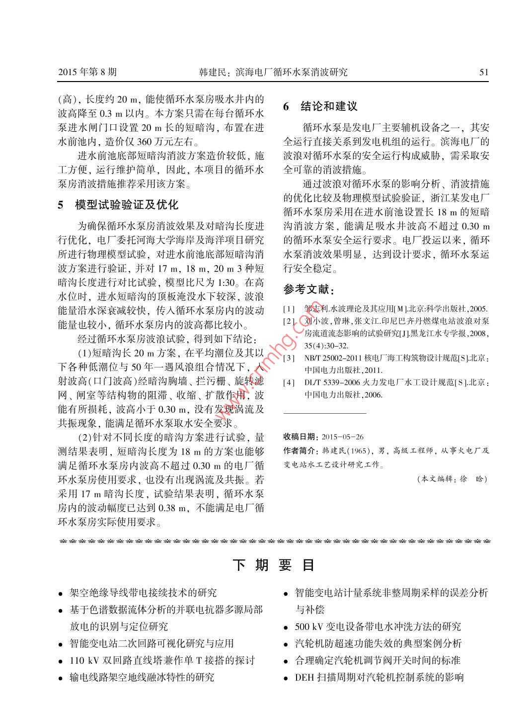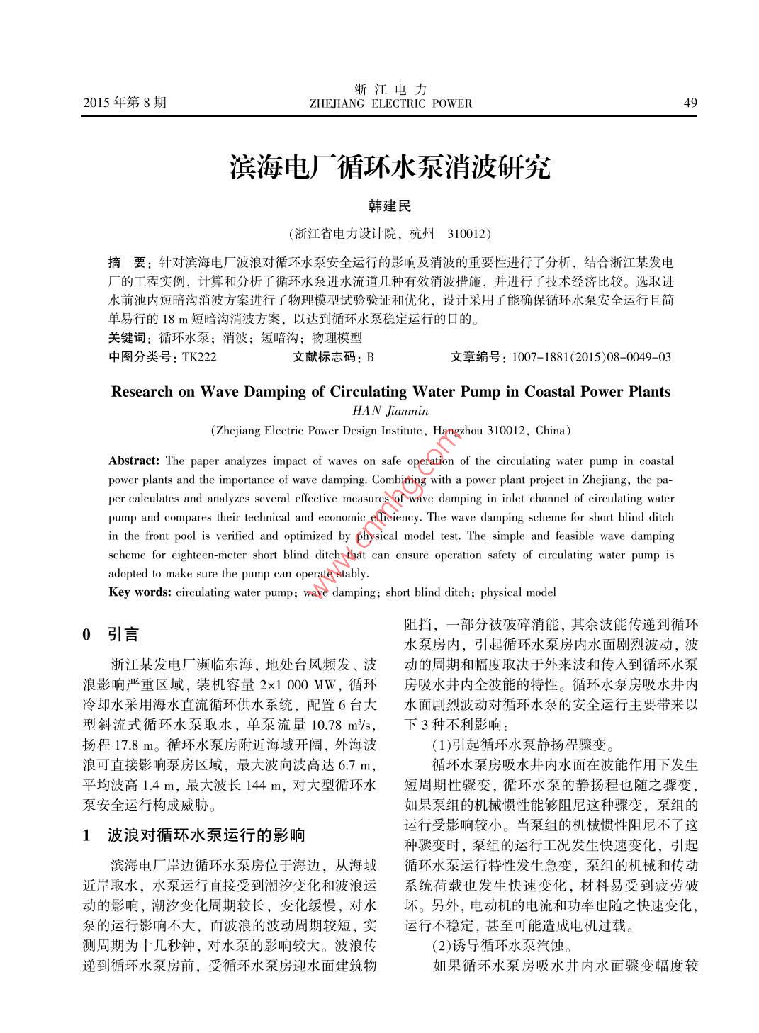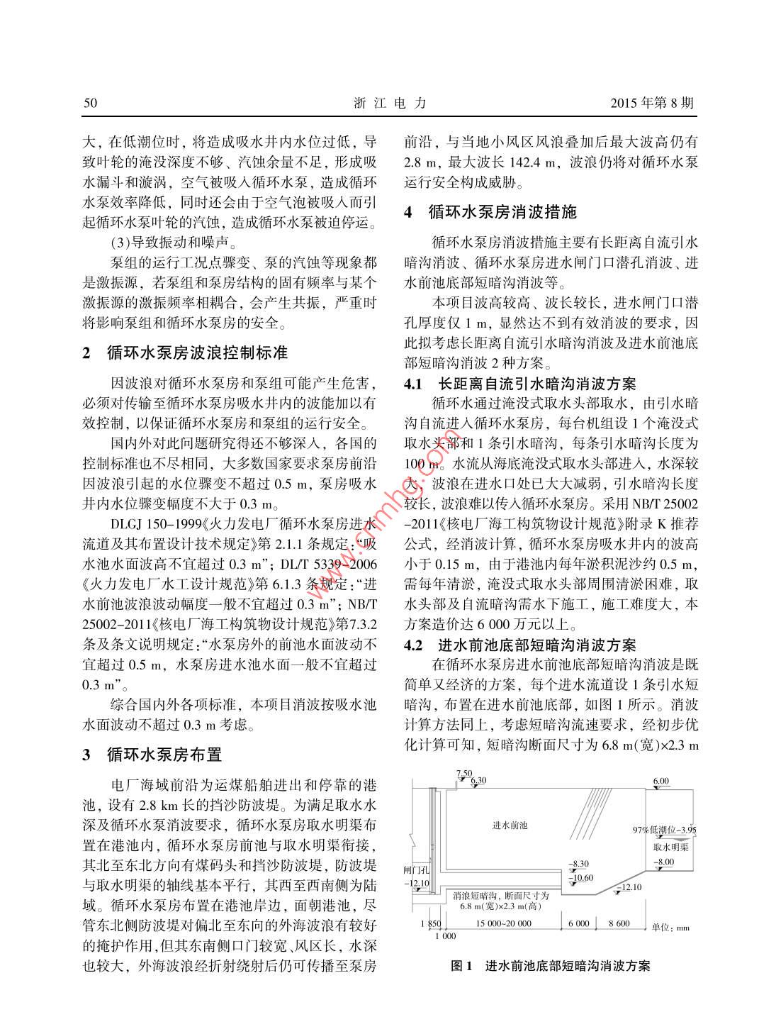 浙江電力2015年第8期ZHEJIANG ELECTRIC POWER49濱海電廠循環(huán)水泵消波研究韓建民(浙江省電力設(shè)計院,杭州310012)摘要:針對濱海電廠波浪對循環(huán)水泵安全運行的影響及消波的重要性進行了分析,結(jié)合浙江某發(fā)電廠的工程實例,計算和分析了循環(huán)水泵進水流道幾種有效消波措施,并進行了技術(shù)經(jīng)濟比較。選取進水前池內(nèi)短暗溝消波方案進行了物理模型試驗驗證和優(yōu)化,設(shè)計采用了能確保循環(huán)水泵安全運行且簡單易行的18m短暗溝消波方案,以達到循環(huán)水泵穩(wěn)定運行的目的關(guān)鍵詞:循環(huán)水泵;消波;短暗溝;物理模型中圖分類號:TK22文獻標志碼:B文章編號:1007-1881(2015)08-004903Research on Wave Damping of Circulating Water Pump in Coastal Power PlantsHAN JianminZhejiang Electric Power Design Institute, Hangzhou 310012, China)Abstract: The paper analyzes impact of waves on safe operation of the circulating water pump in coastalpower plants and the importance of wave damping. Combining with a power plant project in Zhejiang, the paper calculates and analyzes several effective measures of wave damping in inlet channel of circulating waterpump and compares their technical and economic efficiency. The wave damping scheme for short blind ditchin the front pool is verified and optimized by physical model test. The simple and feasible wave dampingscheme for eighteen- meter short blind ditch that can ensure operation safety of circulating water pump isadopted to make sure the pump can operate stablyKey words: circulating water pump; wave damping; short blind ditch; physical model引言阻擋,一部分被破碎消能,其余波能傳遞到循環(huán)水泵房內(nèi),引起循環(huán)水泵房內(nèi)水面劇烈波動,波浙江某發(fā)電廠瀕臨東海,地處臺風頻發(fā)、波動的周期和幅度取決于外來波和傳入到循環(huán)水泵浪影響嚴重區(qū)域,裝機容量2×l000Mw,循環(huán)房吸水井內(nèi)全波能的特性。循環(huán)水泵房吸水井內(nèi)冷卻水采用海水直流循環(huán)供水系統(tǒng),配置6臺大水面劇烈波動對循環(huán)水泵的安全運行主要帶來以型斜流式循環(huán)水泵取水,單泵流量10.78ms,下3種不利影響:揚程17.8m。循環(huán)水泵房附近海域開闊,外海波(1)引起循環(huán)水泵靜揚程驟變。浪可直接影響泵房區(qū)域,最大波向波高達6.7m,循環(huán)水泵房吸水井內(nèi)水面在波能作用下發(fā)生平均波高1.4m,最大波長14m,對大型循環(huán)水短周期性驟變,循環(huán)水泵的靜揚程也隨之驟變泵安全運行構(gòu)成威脅。如果泵組的機械慣性能夠阻尼這種驟變,泵組的1波浪對循環(huán)水泵運行的影響運行受影響較小。當泵組的機械慣性阻尼不了這種驟變時,泵組的運行工況發(fā)生快速變化,引起濱海電廠岸邊循環(huán)水泵房位于海邊,從海域循環(huán)水泵運行特性發(fā)生急變,泵組的機械和傳動近岸取水,水泵運行直接受到潮汐變化和波浪運系統(tǒng)荷載也發(fā)生快速變化,材料易受到疲勞破動的影響,潮汐變化周期較長,變化緩慢,對水壞。另外,電動機的電流和功率也隨之快速變化泵的運行影響不大,而波浪的波動周期較短,實運行不穩(wěn)定,甚至可能造成電機過載。測周期為十幾秒鐘,對水泵的影響較大。波浪傳(2)誘導循環(huán)水泵汽蝕。遞到循環(huán)水泵房前,受循環(huán)水泵房迎水面建筑物如果循環(huán)水泵房吸水井內(nèi)水面驟變幅度較50浙江電力2015年第8期大,在低潮位時,將造成吸水井內(nèi)水位過低,導前沿,與當?shù)匦★L區(qū)風浪疊加后最大波高仍有致葉輪的淹沒深度不夠、汽蝕余量不足,形成吸2.8m,最大波長142.4m,波浪仍將對循環(huán)水泵水漏斗和漩渦,空氣被吸入循環(huán)水泵,造成循環(huán)運行安全構(gòu)成威脅水泵效率降低,同時還會由于空氣泡被吸入而引起循環(huán)水泵葉輪的汽蝕,造成循環(huán)水泵被迫停運。循環(huán)水泵房消波措施(3)導致振動和噪聲。循環(huán)水泵房消波措施主要有長距離自流引水泵組的運行工況點驟變、泵的汽蝕等現(xiàn)象都暗溝消波、循環(huán)水泵房進水閘門口潛孔消波、進是激振源,若泵組和泵房結(jié)構(gòu)的固有頻率與某個水前池底部短暗溝消波等,激振源的激振頻率相耦合,會產(chǎn)生共振,嚴重時本項目波高較高、波長較長,進水閘門口潛將影響泵組和循環(huán)水泵房的安全??缀穸葍H1m,顯然達不到有效消波的要求,因2循環(huán)水泵房波浪控制標準此擬考慮長距離自流引水暗溝消波及進水前池底部短暗溝消波2種方案。因波浪對循環(huán)水泵房和泵組可能產(chǎn)生危害,41長距離自流引水暗溝消波方案必須對傳輸至循環(huán)水泵房吸水井內(nèi)的波能加以有循環(huán)水通過淹沒式取水頭部取水,由引水暗效控制,以保證循環(huán)水泵房和泵組的運行安全。溝自流進入循環(huán)水泵房,每臺機組設(shè)1個淹沒式國內(nèi)外對此問題研究得還不夠深入,各國的取水頭部和1條引水暗溝,每條引水暗溝長度為控制標準也不盡相同,大多數(shù)國家要求泵房前沿100m。水流從海底淹沒式取水頭部進入,水深較因波浪引起的水位驟變不超過0.5m,泵房吸水大,波浪在進水口處已大大減弱,引水暗溝長度井內(nèi)水位驟變幅度不大于0.3m較長,波浪難以傳人循環(huán)水泵房。采用NBT25002DIGJ150-l99火力發(fā)電廠循環(huán)水泵房進水-2011《核電廠海工構(gòu)筑物設(shè)計規(guī)范》附錄K推薦