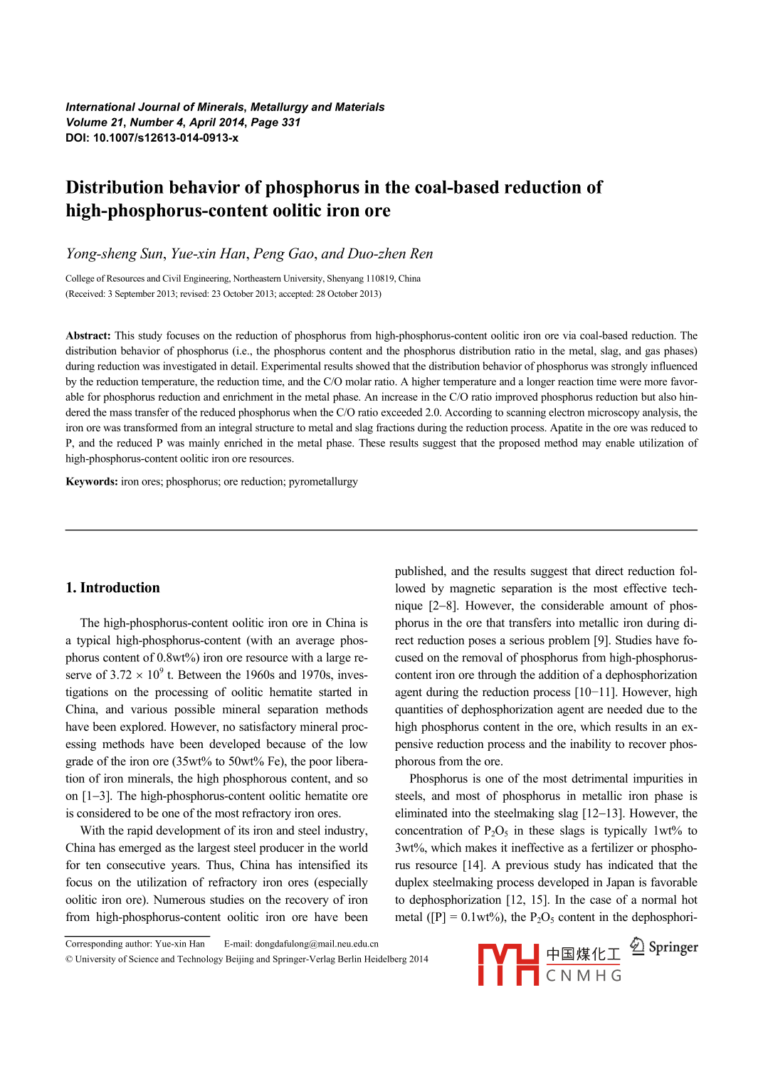 International Journal of Minerals, Metallurgy and MaterialsVolume 21, Number 4, April 2014, Page 331DO|:10.1007/s12613-0140913-XDistribution behavior of phosphorus in the coal-based reduction ofhigh-phosphorus-content oolitic iron oreYong-sheng Sun, Yue-xin Han, Peng Gao, and Duo-zhen RenCollege of Resources and Civil Engineering, Northeastern University, Shenyang 110819, China(Received: 3 September 2013; revised: 23 October 2013: accepted: 28 October 2013)Abstract: This study focuses on the reduction of phosphorus from high-phosphorus-content oolitic iron ore via coal-based reduction. Thedistribution behavior of phosphorus (i.e, the phosphorus content and the phosphorus distribution ratio in the metal, slag, and gas phases)during reduction was investigated in detail. Experimental results showed that the distribution behavior of phosphorus was strongly influencedby the reduction temperature, the reduction time, and the c/o molar ratio. a higher temperature and a longer reaction time were more favorable for phosphorus reduction and enrichment in the metal phase. An increase in the C/O ratio improved phosphorus reduction but also hindered the mass transfer of the reduced phosphorus when the C/O ratio exceeded 2.0. According to scanning electron microscopy analysis, theiron ore was transformed from an integral structure to metal and slag fractions during the reduction process. Apatite in the ore was reduced toP, and the reduced P was mainly enriched in the metal phase. These results suggest that the proposed method may enable utilization ofhigh-phosphorus-content oolitic iron ore resourcesKeywords: iron ores; phosphorus; ore reduction; pyrometallurgypublished, and the results suggest that direct reduction fol1 Introductionlowed by magnetic separation is the most effective technique [2-8]. However, the considerable amount of phosThe high-phosphorus-content oolitic iron ore in China is phorus in the ore that transfers into metallic iron during ditypical high-phosphorus-content(with an average phos- rect reduction poses a serious problem [9]. Studies have fo-phorus content of 0.8wt%)iron ore resource with a large re- cused on the removal of phosphorus from high-phosphorus-serve of 3. 72 x 10 t. Between the 1960s and 1970s, inves- content iron ore through the addition of a dephosphorizationigations on the processing of oolitic hematite started in agent during the reduction process [10-11]. However, highChina, and various possible mineral separation methods quantes oof dephosphorization agent are needed due to thehave been explored. However, no satisfactory mineral proc- high phosphorus content in the ore, which results in an exessing methods have been developed because of the low pensive reduction process and the inability to recover phosgrade of the iron ore (35wt% to 5Owt% Fe), the poor libera- phorous from the oretion of iron minerals, the high phosphorous content, and soPhosphorus is one of the most detrimental impurities inon [1-3]. The high-phosphorus-content oolitic hematite ore steels, and most of phosphorus in metallic iron phase isis considered to be one of the most refractory iron oreseliminated into the steelmaking slag [12-13]. However, theWith the rapid development of its iron and steel industry, concentration of P2O5 in these slags is typically lwt%toChina has emerged as the largest steel producer in the world 3wt%, which makes it ineffective as a fertilizer or phospho-for ten consecutive years. Thus, China has intensified its rus resource [14]. a previous study has indicated that thefocus on the utilization of refractory iron ores(especially duplex steelmaking process developed in Japan is favorableoolitic iron ore). Numerous studies on the recovery of iron to dephosphorization [12, 15]. In the case of a normal hotigh-phosphorus-content oolitic iron ore have been metal([P]=0.lwt%), the P2Os content in the dephosphori-Corresponding author: Yue-xin Han E中國煤化工2 Sprringero University of Science and Technology Beijing and Springer-Verlag Berlin Heidelberg 2014CNMHG332Int. J. Miner. Metall. Mater., Vol. 21, No. 4, Apr. 2014zation slag is approximately 5wt%. When the phosphorus (4)are exhibited in Fig. I to reflect the relationship betweerconcentratIondjusted to between the standard Gibbs energies(AG )and the temperature0. 15wt% and 0. 25wt%, the P2O5 content in the slag exceeds The initial temperatures at atmospheric pressure at which10wt%[12]. Hence, we proposed a new method that enables reactions(1),(2),(3), and (4) will occur are 1495, 1224,the possible comprehensive exploitation of high-phosphorus- 1269, and 1287C, respectively. In addition, the standardcontent oolitic iron ore. Phosphorus in the iron ore will be Gibbs free energies of these reactions significantly decreaseforced to migrate into the metallic iron phase during the re- with increasing temperature, which demonstrates that calduction process, which allows the collection of reduced iron cium phosphate is more easily reduced at high temperaturesder with high phosphorus content by1000tion. The high-phosphorus reduced iron powder is then re-Reaction(1).- Reaction(2)fined by a duplex steelmaking process. Afterward, molterReaction (3)steel is produced, and high-phosphorus-content steelmakingslag that can be used as a phosphate fertilizer is also obtained. The migration characteristics of phosphorus and thephosphorus content in the metallic iron phase are the keypoints to this methodWith this background, we here report the results of our-200research into the distribution behavior of phosphorus (i.e-400the phosphorus content in the slag and metal phases as well8001000120014001600as the phosphorus distribution ratio in the metal, slag, andgas phases). In addition, the microstructure and compositionFig. 1. Correlation between AG and temperature for reac-characteristics of reduced products were studied. The pre-tions(1)to(4sent study aims to provide a basis for the rational utilizationIn this study, the reduction tempe