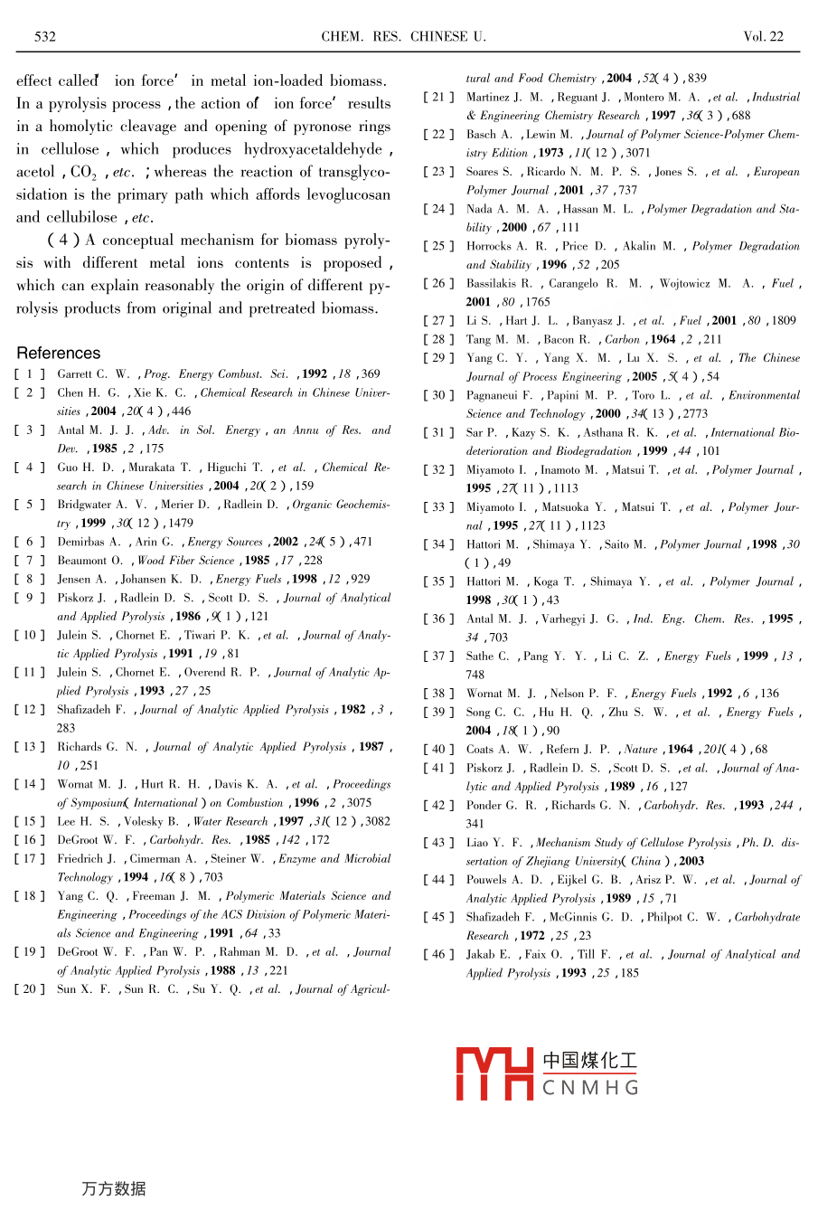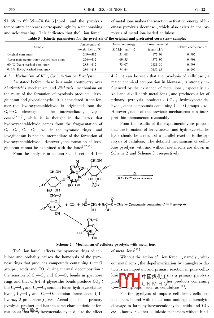 Available online at www.sciencedirect.comSCIENCEdoinnor.CHEM. RES. CHINESE U.2006 ,22( 4),524- -532TG-FTIR Study on Corn Straw Pyrolysis. influence of Minerals'YANG Chang-yan'2** ,LU Xue-song' ,LIN Wei-gang' . ,YANG Xue-ming' and YAO Jian-zhong'1. Multiphase Reaction Lab , Institute of Process Engineering , Chinese Academy of Sciences ,Beijing 100080 ,P. R. China ;2. Graduate School of the Chinese Academy of Sciences , Bejing 100039 ,P. R. ChinaReceived April 5 , 2005In order to study the effect of minerals on biomass pyrolysis , experiments on pyrolysis of corn straw with differentpretreatment methods were performed by using a thermogravimetric analyze( TGA ) coupled with a Fourier transforminfrared( FTIR ) spectrometer. The pretreatment methods included water washing and acid washing. The experimentalresults show that acid washing can remove almost all K* and 78% of Cat+ , while water washing only removes most ofK+. 'The existence of K + and Ca2+ obviously favors the formation of compounds containing carbonyI groups and CO2 ,but it will decrease the yields of compounds containing C- -0- -C groups. However , the formation of H2O , CO andCH4 are slightly affected by the removal of inorganic ions. With regard to the structure of the metal ions-adsorbed cel-lulose characterized by IR analysis , it can be considered that there is an”ion force" between metal ions and cellulos-ic biomass. The results of thermal kinetic analysis show that this force can make the reaction activation energy of thebiomass pyrolysis decrease. A new mechanism is proposed for explaining the efct of inorganic ions on cellulose py-rolysis.Keywords Biomass ; TG-FTIR ; Pretreatment ; Minerals ; Pyrolysis mechanismArticle ID 1005 -9040( 2006 )-04-524-09Introductioncellulose pyrolysis , and phenols of lignin pyrolyis7I.Recently , concern about emission of greenhouseThe pyrolysis behavior of lignocellulosic biomassgases from combustion of fossil fuels has prompted a re-and cellulose is significantly influenced by ash andnewable interest in the combustion of biofuels due toexisted inorganic ions,Inorganic ions favor ththeir CO2 neutrality 121. Pyrolysis of biomass( celluloseformation of gas , char , and hydroxyacetaldehyde butand lignocellulose materials , etc. ) is of great interestthey cause the total liquid yield to decrease and inhibitin the production of chemicals and fuel5'3- 6].the formation of levoglucosan.There have been many mechanisms proposed forBiomass is comprised of hemicellulose , cellulose,lignin ,a lttle of extract and ash. These componentsthe pyrolysis of cellulose or lignocellulosic bioresult in different pyrolysis products because of differentmass'[9,12 13]to interpret the above phenomena , of whichmechanisms of thermal decomposition. The volatiletwo are important. One is Shafizadeh's mechanism'products of cellulose pyrolysis are mainly comprised ofin which levoglucosan is first produced in cellulose pylevoglucosan,hydroxyacetaldehyde ,acetol ( Schemerolysis , yielding glucose , and then glucose undergoes a1 ) ,etc. Acetic acid and furfural are products of hemi-C2-C3 cleavage to form hydroxylacetaldehyde( Glycol-aldehyde ) ; the other is Richard' s mechanism that the0、HO-HOOHhydroxyacetaldehyde formation must involve the diver-sion of reaction, channels prior to the formation of levo-LevoglucosanHydroxyacetaldehydeAcetolgluc中國煤化工Scheme 1 Structures of levoglucosan , hydroxyacetal-TY H. CN M H Gaim at the pyrolysis ofdehyde and acetol.biomass , and the pyrolysis mechanisms focus on the* Supported by the National High Technology Research and Development Program of China( No. 2003AA514023 ) and the Na-tional Basic Research Program of Chind( No. 2004CB719700 ).* *百商數(shù)據(jù)rrespondence should be addressed. E-mail : eyyang@ home. ipe. ac. cn .No. 4YANG Chang-yan et al.525formation paths of pyrolysis products , especially forExperimentalthose of levogancosan and hydroxylacetaldehyde. How-1 Materialsever , the mechanism of metal ions acting on biomassCorn straw was pretreated by washing with roompyrolysis is not clear. Little information is available re-temperature water ,60 C water and a0. 5% nitric acidgarding the relationship between the formation of CO2 ,solution. All the washing processes were performed byH20 and that of the primary pyrolytic products such asmeans of soaking and churning each sample of 1 g inlevoglucosan , hydroxyacetaldehyde and acids etc. inthe above washings( 100 mL for each washing ) forinterpreting the pyrolytic mechanism of cellulose loaded12 h. After washing , the corn straw samples were fil-with inorganic ions.tered ,and then dried at 105 C for 10 h. The acid-In order to clarify the relationship between thewashed corn straw sample was washed with distilled wa-yield of pyrolysis liquid and the existence of inorganicter until it was neutral , then filtered and dried at 105ons , and to understand the mechanism of the effect olC for 10 h. Before the experiments , the pretreatedinorganic ions on biomass pyrolysis , we investigated thecorn straw samples were finely ground into powder( lesseffect of pretreatment methods including water washingthan 100 meshes ) in order to minimize the heat-transferand acid washing on corn straw pyrolysis by using a resis-tance and decrease the influence of vapor-solidthermogravimetric analyzer coupled with a Fourierand secondary reactions. The properties of the materialstransform infrared analyzer.are listed in Tables 1 and 2.Table 1 Chemical compositions and proximate analyses of the samples with different pretreatment methodsComponent analysi( % , mass fraction )Proximate analysis( % , mass fraction )Corn straw sampleHono-celluloseLigninExtract *MoistureV olatile matterAshOriginal74. 9013.412.343.5870.585.77Room temperature water-washed7.4713.231.883.2777.134.1560 C aler-washed77.4314. 011.7278.283.810.5% HNO3 -washed79. 2512. 88.2.902.3780. 592. 60* Benzene-ethanol extractable( 2: 1 , volume ratio ).Table 2 Ultimate and K , 