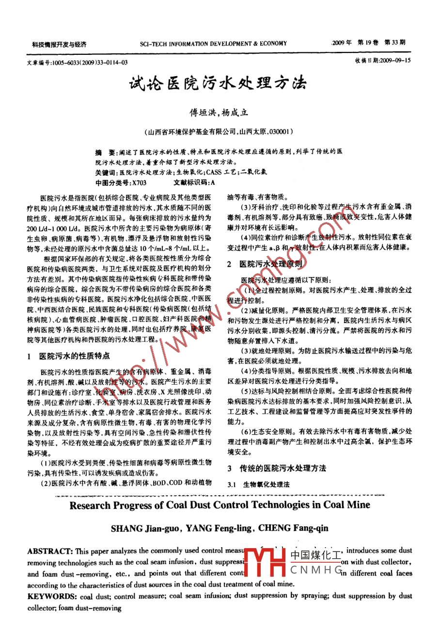 科技情報(bào)開發(fā)與經(jīng)濟(jì)SCI-TECH INFORMATION DEVELOPMENT & ECONOMY.2009年第19卷第33期文章編號(hào):1005- 63009)330114-03收稿日期:2009-09-15試論醫(yī)院污水處理方法傅垣洪,楊成立(山西省環(huán)境保護(hù)基金有限公司.山西太原030001)摘要:闡述了醫(yī)院污水的性質(zhì) 、特點(diǎn)和醫(yī)院污水處理應(yīng)遵循的原則,列舉了傳統(tǒng)的醫(yī)院污水處理方法,著重介紹了新型污水處理方法。關(guān)鍵詞:醫(yī)院污水處理方法;生物氧化;CASS工藝;二氧化氯中圖分類號(hào):X703文獻(xiàn)標(biāo)識(shí)碼:A醫(yī)院污水是指醫(yī)院(包括綜合醫(yī)院專業(yè)病院及其他類型醫(yī)油等有毒、有害物質(zhì)。療機(jī)構(gòu))向自然環(huán)境或城市管道排放的污水,其水質(zhì)隨不同的醫(yī)(3)牙科治療洗印和化驗(yàn)等過程產(chǎn)生污水含有重金屬、消院性質(zhì)、規(guī)模和其所在地區(qū)而異。每張病床排放的污水量約為毒劑、有札溶劑等,部分具有致癌致畸或致突變性.危害人體健200 Ud~1 000 Ud。醫(yī)院污水中所含的主要污染物為病原體(寄康并對(duì)環(huán)境有長遠(yuǎn)影響。生蟲卵、病原菌、病毒等).有機(jī)物.漂浮及懸浮物和放射性污染(4)同位素治療和診斷產(chǎn)生放射性污水。放射性同位素在衰物等.未經(jīng)處理的原污水中含菌總量達(dá)10個(gè)/mL~8個(gè)/mL以上。變過程中產(chǎn)生a、β和r放射性,在人體內(nèi)積累而傖害人體健康。根據(jù)國家環(huán)保部的有關(guān)規(guī)定,將各類醫(yī)院按性質(zhì)分為綜合2醫(yī)院污水處理原則醫(yī)院和傳染病醫(yī)院兩類,與衛(wèi)生系統(tǒng)對(duì)醫(yī)院及醫(yī)療機(jī)構(gòu)的劃分方法有差別。其中傳染病醫(yī)院指傳染性疾病|科醫(yī)院和帶傳染醫(yī)院污水處理應(yīng)遵循以下原則:病房的綜合醫(yī)院,綜合醫(yī)院為不帶傳染病房的綜合醫(yī)院和各類(1)全過程控制原則。對(duì)醫(yī)院污水產(chǎn)生、處理、排放的全過非傳染性疾病的??漆t(yī)院。醫(yī)院污水凈化包括綜合醫(yī)院、中醫(yī)醫(yī)程進(jìn)行控制。院、中西醫(yī)結(jié)合醫(yī)院.民族醫(yī)院和??漆t(yī)院(傳染病醫(yī)院(包括結(jié)(2 )堿量化原則。嚴(yán)格醫(yī)院內(nèi)部衛(wèi)生安全管理體系.在污水核病院)、心血管病醫(yī)院、腫瘤醫(yī)院.口腔醫(yī)院、婦產(chǎn)科醫(yī)院和精和污物發(fā)生源處進(jìn)行嚴(yán)格控制和分離,醫(yī)院內(nèi)生活污水與病區(qū)神病醫(yī)院等)各類醫(yī)院污水的處理.同時(shí)也包括療養(yǎng)院、康復(fù)醫(yī)污水分別收集.即源頭控制、清污分流。嚴(yán)禁將醫(yī)院的污水和污院等其他醫(yī)療機(jī)構(gòu)和典醫(yī)院的污水處理工程。物隨意棄置排入下水道。(3. )就地處理原則。為防止醫(yī)院污水輸送過程中的污染與危1醫(yī)院污水的性質(zhì)特點(diǎn)害,在醫(yī)院必須就地處理。醫(yī)院污水的性質(zhì)指醫(yī)院產(chǎn)生的含有病原體、重金屬、消毒(4)分類指導(dǎo)原則。根據(jù)醫(yī)院性質(zhì)規(guī)模、污水排放去向和地劑有機(jī)溶劑、酸、堿以及放射性等的污水。醫(yī)院產(chǎn)生污水的主要區(qū)差異對(duì)醫(yī)院污水處理進(jìn)行分類指導(dǎo)。部門和設(shè)施有:診療窒.化驗(yàn)室、病房.洗衣房.X光照像洗印、動(dòng)(5 )達(dá)標(biāo)與風(fēng)險(xiǎn)控制相結(jié)合原則。全面考慮綜合性醫(yī)院和傳物房、同位素治療診斷、手術(shù)室等排水以及醫(yī)院行政管理和醫(yī)務(wù)染病醫(yī)院污水達(dá)標(biāo)排放的基本要求,同時(shí)加強(qiáng)風(fēng)險(xiǎn)控制意識(shí),從人員排放的生活污水、食堂.單身宿舍、家屬宿舍排水。醫(yī)院污水工藝技術(shù)、工程建設(shè)和監(jiān)督管理等方面提商應(yīng)對(duì)突發(fā)性事件的來源及成分復(fù)雜,含有病原性微生物.有毒.有害的物理化學(xué)污.能力。染物.以及放射性污染等.具有空間污染.急性傳染和潛伏性傳(6)生態(tài)安全原則。有效去除污水中有毒有害物質(zhì).減少處染等特征,不經(jīng)有效處理會(huì)成為疫病擴(kuò)散的重要途徑并嚴(yán)重污理過程中消毒副產(chǎn)物產(chǎn)生和控制出水中過高余氣,保護(hù)生態(tài)環(huán)染環(huán)境。境安全。(1 )醫(yī)院污水受到類便.傳染性細(xì)菌和病毒等病原性微生物3傳統(tǒng)的醫(yī) 院污水處理方法污染,具有傳染性.可以誘發(fā)疾病或造成傷害。(2)醫(yī)院污水中含有酸.賊、懸浮固體、BOD、COD和動(dòng)植物3.1 生物氧化處理法Research Progress of Coal Dust Control Technologies in Coal MineSHANG Jian-guo, YANG Feng-ling, CHENG Fang-qinABSTRACT: This paper analyzes the commonly used control measu中國煤化工introduces some dustremoving technologies such as the coal seam infusion, dust suppressiMYH-on with dust collector,and foam dust -removing, etc., and points out that different contCN M H Gn dfferent coal facesaccording to the characteristics of dust sources in the coal dust treatment of coal mine.KEYWORDS: coal dust; control measure; coal seam infusion; dust suppression by spraying; dust suppression by dustcollector, foam dust- -removing114傅垣洪,楊威立試論醫(yī)院污水 處理方法本刊E-mail:bjh@sxinfo.net綜 述生物氧化處理法是最為常用的傳統(tǒng)處理方法。其基本原理4.2二氧化氯消毒是利用鼓風(fēng)曝