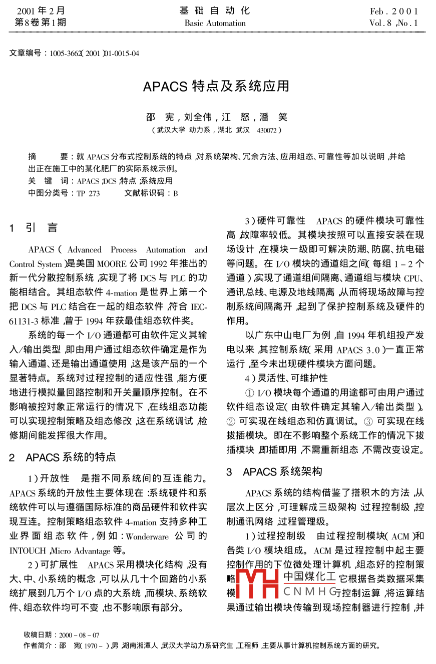 2001年2月基礎(chǔ)自動化Feb.2001第8卷第1期Basic automationVol 8, No. 1文章編號:105-366x2001m1-0015-04APACS特點(diǎn)及系統(tǒng)應(yīng)用邵憲,劉全偉,江怒,潘笑武漢大學(xué)動力系,湖北武漢430072)摘要:就 APACS分布式控制系統(tǒng)的特點(diǎn)對系統(tǒng)架構(gòu)、冗余方法、應(yīng)用組態(tài)、可靠性等加以說明并給出正在施工中的某化肥廠的實(shí)際系統(tǒng)示例關(guān)鍵詞: APACS DCS特點(diǎn)系統(tǒng)應(yīng)用中圖分類號:TP273文獻(xiàn)標(biāo)識碼1引言3〕硬件可靠性 APACS的硬件模塊可靠性高故障率較低。其模塊按照可以直接安裝在現(xiàn)APACS( Advanced h' ocess Automation and場設(shè)計(jì)在模塊一級即可解決防潮、防腐、抗電磁Control System是美國 MOORE公司1992年推出的等問題。在1/O模塊的通道組之間每組1-2個(gè)新一代分散控制系統(tǒng)實(shí)現(xiàn)了將υ?S與PC的功通道)實(shí)現(xiàn)了通道組間隔離、通道組與模塊CPU、能相結(jié)合。其組態(tài)軟件4- mation是世界上第一個(gè)通訊總線、電源及地線隔離從而將現(xiàn)場故障與控把DCS與PC結(jié)合在一起的組態(tài)軟件符合IEC-制系統(tǒng)間隔離開起到了保護(hù)控制系統(tǒng)及硬件的61131-3標(biāo)準(zhǔn)曾于1994年獲最佳組態(tài)軟件獎。作用。系統(tǒng)的每一個(gè)LO通道都可由軟件定義其輸以廣東中山電廠為例自1994年機(jī)組投產(chǎn)發(fā)入/輸出類型即由用戶通過組態(tài)軟件確定是作為電以來其控制系統(tǒng)(采用 APACS3.0)一直正常輸入通道、還是輸岀通道使用這是該產(chǎn)品的一個(gè)運(yùn)行至今未岀現(xiàn)硬件模塊方面問題。顯著特點(diǎn)。系統(tǒng)對過程控制的適應(yīng)性強(qiáng)能方便4)靈活性、可維護(hù)性地進(jìn)行模擬量回路控制和開關(guān)量順序控制。在不①LO模塊每個(gè)通道的用途都可由用戶通過影響被控對象正常運(yùn)行的情況下在線組態(tài)功能軟件組態(tài)設(shè)定(由軟件確定其輸入/輸岀類型可以實(shí)現(xiàn)控制策略及組態(tài)修改這在系統(tǒng)調(diào)試檢②可實(shí)現(xiàn)在線組態(tài)和仿真調(diào)試。③可實(shí)現(xiàn)在線修期間能發(fā)揮很大作用。拔插模塊。即在不影響整個(gè)系統(tǒng)工作的情況下拔2 APACS系統(tǒng)的特點(diǎn)插模塊即插即用不需重新組態(tài)不需改變設(shè)定。1)開放性是指不同系統(tǒng)間的互連能力3 APACS系統(tǒng)架構(gòu)APACS系統(tǒng)的開放性主要體現(xiàn)在:系統(tǒng)硬件和系A(chǔ)PACS系統(tǒng)的結(jié)構(gòu)借鑒了搭積木的方法從統(tǒng)軟件可以與遵循國際標(biāo)準(zhǔn)的商品硬件和軟件實(shí)層次上區(qū)分可理解成三級架構(gòu)過程控制級控現(xiàn)互連??刂撇呗越M態(tài)軟件4-πaio支持多種工制通訊網(wǎng)絡(luò)過程管理級。業(yè)界面組態(tài)軟件,例如: Wonderware公司的1)過程控制級由過程控制模塊(ACM廂和INTOUCH Micro Advantage等。各類ⅠO模塊組成。ACM是過程控制中起主要2)可擴(kuò)展性APA(S采用模塊化結(jié)構(gòu)沒有控制作用的下位微處理計(jì)算機(jī)組態(tài)好的控制策大、中、小系統(tǒng)的概念可以從幾十個(gè)回路的小系略中國煤化工它根據(jù)各類數(shù)據(jù)采集統(tǒng)擴(kuò)展到幾萬個(gè)υ點(diǎn)的大系統(tǒng)而模塊、系統(tǒng)軟?!骸?CNMHG控制運(yùn)算將運(yùn)算結(jié)件、組態(tài)軟件均可不變也不影響原有部分。果通過輸岀模埉傳輸?shù)浆F(xiàn)場控制器進(jìn)行控制并收稿日期:2000-08-07作者簡介邵策1970-)男湖南湘潭人武漢大學(xué)動力系研究生工程師主要從事計(jì)算機(jī)控制系統(tǒng)方面的研究。基礎(chǔ)自動化第8卷將必要的數(shù)據(jù)上傳過程管理計(jì)算機(jī)。環(huán)令牌繞邏輯環(huán)傳送。因?yàn)橹挥辛钆频某钟姓卟琶繅KACM最多支持39塊LO模塊即最多能發(fā)送數(shù)據(jù)而任一時(shí)刻M-BUS上都只產(chǎn)生1個(gè)可支持624-1248個(gè)LO點(diǎn)令牌所以不會產(chǎn)生沖突。每塊LO模塊都是一臺功能完備的微處理計(jì)一個(gè)局部的M-BUS最多支持32個(gè)ACM或算機(jī)包含了16或32個(gè)數(shù)據(jù)通道負(fù)責(zé)將現(xiàn)場傳MB卡局部M-BUS可通過總線擴(kuò)展模塊(MBX)感器傳來的模擬信號進(jìn)行數(shù)字化處理后傳遞給擴(kuò)展成一個(gè)多區(qū)域網(wǎng)絡(luò)每個(gè)區(qū)域都是一個(gè)局部ACM或?qū)CM的計(jì)算結(jié)果處理后輸出到現(xiàn)場執(zhí)的M-BUS這就形成了M-NET。行機(jī)構(gòu)。所有的LO掃描、非線性補(bǔ)償、標(biāo)度變3)過程管理級由操作員站和工程師站組換、通道故障診斷、硬件地址標(biāo)定都由ⅠO模塊完成主要完成顯示操作、人工干預(yù)生產(chǎn)過程和在線成組態(tài)兩項(xiàng)功能。操作員站把過程參量的信息集中ACM與LO模塊之間通過oBUS通訊。Ⅰ′化收集現(xiàn)場數(shù)據(jù)進(jìn)行過程量、工藝流程圖、趨勢OBUS遵循RS485通訊協(xié)議通訊速率為1Mbs,曲線的顯示提供友好的人機(jī)界面并可由操作員標(biāo)準(zhǔn)長度914m,可延長至457.2m一塊ACM修改過程參數(shù)。 MOORE公司未開發(fā)專用的界面下的 VOBUS可掛接39塊LO模塊組態(tài)軟件而是采用一些通用的工業(yè)控制軟件如2)控制通訊網(wǎng)絡(luò)-MBUS/MNET用于控 NTOUCH AIMAX等。制模塊ACM之間、控制模塊與操作員站/工程