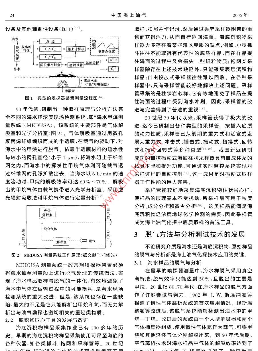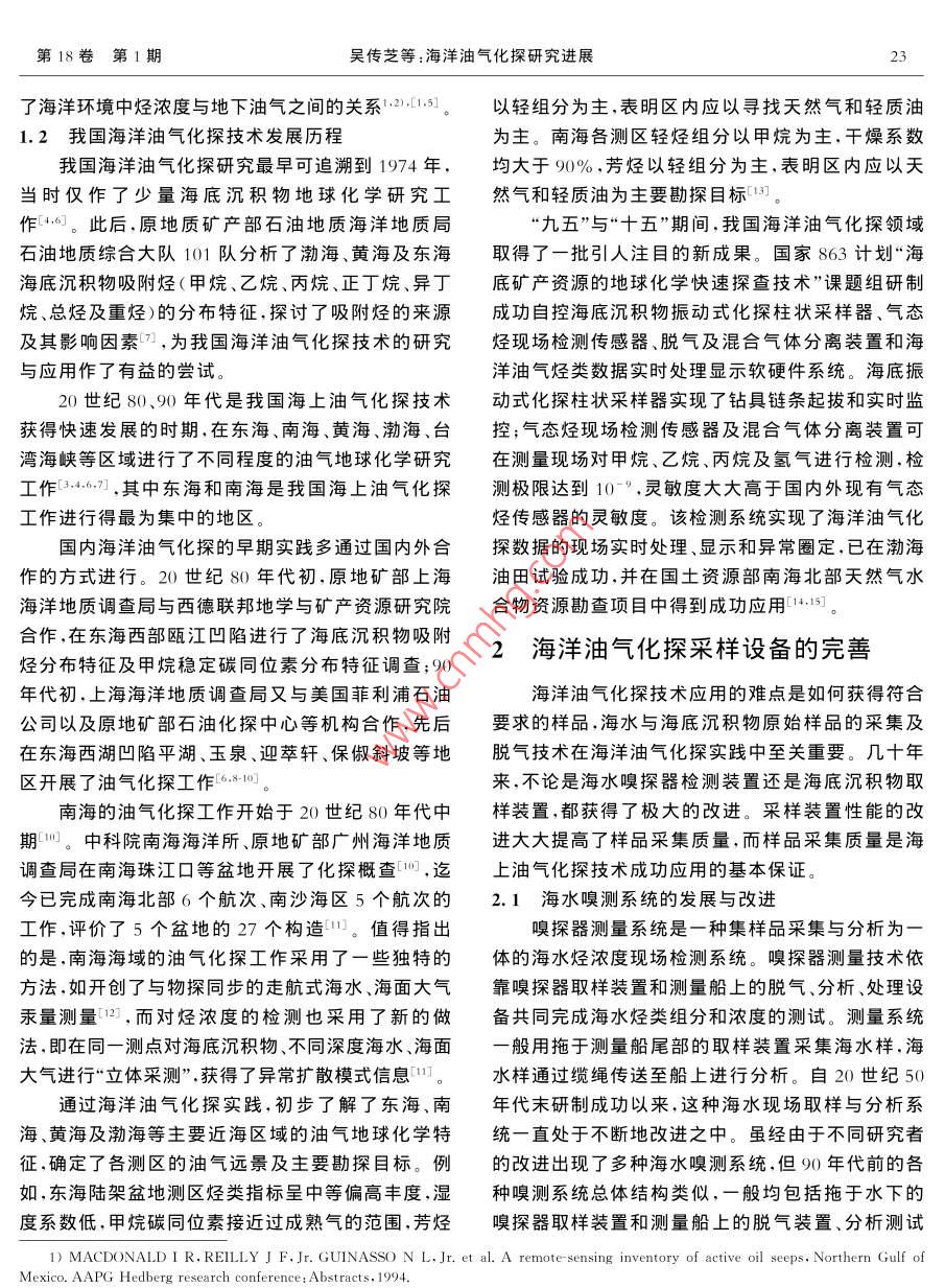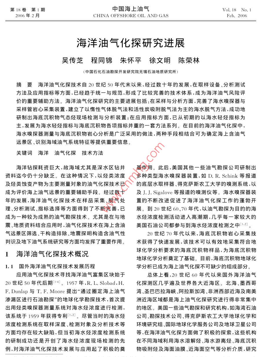 第18卷第1期中國海上油氣Vol.18 No. 12006年2月CHINA OFFSHORE OIL AND GASFeb. 2006 ,海洋油氣化探研究進(jìn)展吳傳芝程同錦朱懷平徐文明.陳榮林(中國石化石油勘探開發(fā)研究院無錫石油地質(zhì)研究所)摘要海洋油氣化探技術(shù)自20世紀(jì)50年代末以來,經(jīng)過數(shù)十年的發(fā)展,在取樣設(shè)備、分析測(cè)試方法及應(yīng)用指標(biāo)等方面,已經(jīng)趨于統(tǒng)一與規(guī)范,形成了比較完善的技術(shù)體系,成為海洋油氣風(fēng)險(xiǎn)評(píng)價(jià)的重要輔助方法。海洋油氣化探研究的主要進(jìn)展包括:在采樣與分析方面,完善了海水嗅探器與采樣管巖心采集裝置.建立了以惰性氣體脫氣法和活性炭吸附脫氣法為主的海水脫氣方法,成功地研制出海底沉積物氣態(tài)烴現(xiàn)場檢測(cè)與分析裝置;在應(yīng)用指標(biāo)方面,已從初期的以海水輕烴指標(biāo)為主,發(fā)展為海水輕烴指標(biāo)與海底沉積物各項(xiàng)指標(biāo)并重的一套方法系列。在目前的海洋油氣化探中,海水嗅探器測(cè)量與海底沉積物巖心分析是廣泛采用的做法,兩種手段相結(jié)合可為確定海上含油氣遠(yuǎn)景區(qū)、識(shí)別海域油氣系統(tǒng)特征等提供重要信息。關(guān)鍵詞海洋油氣化探 技術(shù)方法海洋鉆探耗資巨大,故海域尤其是深水區(qū)鉆井基作用。此后,美國其他一些油氣勘探公司研制出資料迄今仍十分缺乏。在這種情況下,以烴類濃度多種類型海水嗅探器裝置,如D. R. Schink等報(bào)道及烴類蝕變產(chǎn)物為主要測(cè)量對(duì)象的油氣化探技術(shù)已的底層水取樣器、得克薩斯農(nóng)工大學(xué)的嗅測(cè)系統(tǒng).以成為評(píng)價(jià)海.上油氣遠(yuǎn)景的重要輔助手段。經(jīng)過數(shù)十及J.J.Sigalove等報(bào)道的嗅測(cè)儀等。海水嗅探器裝年的發(fā)展.海洋油氣化探技術(shù)在樣品采集、脫氣處置的不斷改進(jìn)促進(jìn)了海洋油氣化探工作的蓬勃開理、分析測(cè)試、指標(biāo)選擇等方面得到了不斷完善,已展。到20世紀(jì)60、70年代以油氣勘探為目的的海成為-種較為成熟的油氣勘探技術(shù)。尤其是在與地水烴濃度檢測(cè)活動(dòng)進(jìn)入高潮期,幾乎每-家較大的震、地質(zhì)資料結(jié)合應(yīng)用時(shí),油氣化探技術(shù)在海上含油美國石油公司都參與到海水烴濃度檢測(cè)之中1.2]。氣遠(yuǎn)景區(qū)篩選、干構(gòu)造排除、地震探明構(gòu)造含油氣性20世紀(jì)70年代以來,海底沉積物巖心采集技判識(shí)及地下油氣系統(tǒng)研究等方面均發(fā)揮了重要作用。術(shù)獲得了快速發(fā)展,該技術(shù)可以有效地采集符合地球化學(xué)分析要求的海底沉積物樣品,為海底沉積物.1海洋油氣化探技術(shù)概況地球化學(xué)分析奠定了基礎(chǔ)。目前,海底沉積物地球化1.1國外海洋油氣化探技術(shù)發(fā)展歷程學(xué)分析已成為海上油氣化探不可缺少的組成部分。應(yīng)用油氣化探技術(shù)尋找海洋油氣富集區(qū)塊始于總體上看,20世紀(jì)60年代以來國外海洋油氣20世紀(jì)50年代后期14。1957 年,R. L. Slobad,H.化探測(cè)區(qū)幾乎遍及世界各大近海區(qū)。北海、墨西哥F.Dunlap與T.F.Moore提出“通過圈定海上油氣灣、圣巴巴拉海峽、阿拉斯加灣、非洲西部近海及南美滲漏區(qū)進(jìn)行石油勘探”的地球化學(xué)勘探技術(shù),首次提洲近海區(qū)域都是海上油氣化探研究進(jìn)行得非常集中出用烴類嗅探器測(cè)量系統(tǒng)對(duì)海水烴濃度進(jìn)行檢測(cè),的地區(qū)。美國一些油氣勘探和研究機(jī)構(gòu),如海灣石油該系統(tǒng)于1959年獲得專利[1.2。盡管當(dāng)時(shí)的海水烴公司、勘探技術(shù)公司、得克薩斯農(nóng)工大學(xué)地球化學(xué)和濃度檢測(cè)系統(tǒng)在取樣深度、檢測(cè)對(duì)象及分析技術(shù)等環(huán)境研究組、國際地球化學(xué)服務(wù)公司及地球衛(wèi)星公司方面均存在較大缺陷.但當(dāng)初海水烴濃度檢測(cè)系統(tǒng)等,在海洋油氣化探方面做了積極的探索,這些機(jī)構(gòu)的研制成功還是開創(chuàng)了海水烴濃度現(xiàn)場檢測(cè)的先在不同海域利用海水溶解烴、海水游離烴、海底沉積例,對(duì)海洋油氣化探技術(shù)發(fā)展與應(yīng)用起了積極的奠物吸附烴及海面油膜近海面空氣等分析介質(zhì),研究第18卷第1期吳傳芝等:海洋油氣化探研究進(jìn)展23了海洋環(huán)境中烴濃度與地下油氣之間的關(guān)系1.2)[1.51。以輕組分為主,表明區(qū)內(nèi)應(yīng)以尋找天然氣和輕質(zhì)油1.2 我國海洋油氣化探技術(shù)發(fā)展歷程為主。南海各測(cè)區(qū)輕烴組分以甲烷為主.干燥系數(shù)我國海洋油氣化探研究最早可追溯到1974年,均大于90%,芳烴以輕組分為主,表明區(qū)內(nèi)應(yīng)以天當(dāng)時(shí)僅作了少量海底沉積物地球化學(xué)研究工然氣和輕質(zhì)油為主要勘探目標(biāo)[13]。作[46]。此后,原地質(zhì)礦產(chǎn)部石油地質(zhì)海洋地質(zhì)局“九五”與“十五”期間,我國海洋油氣化探領(lǐng)域石油地質(zhì)綜合大隊(duì)101隊(duì)分析了渤海、黃海及東海取得了一批引人注目的新成果。國家863計(jì)劃“海海底沉積物吸附烴(甲烷、乙烷、丙烷、正丁烷、異丁底礦產(chǎn)資源的地球化學(xué)快速探查技術(shù)”課題組研制烷總烴及重?zé)N)
