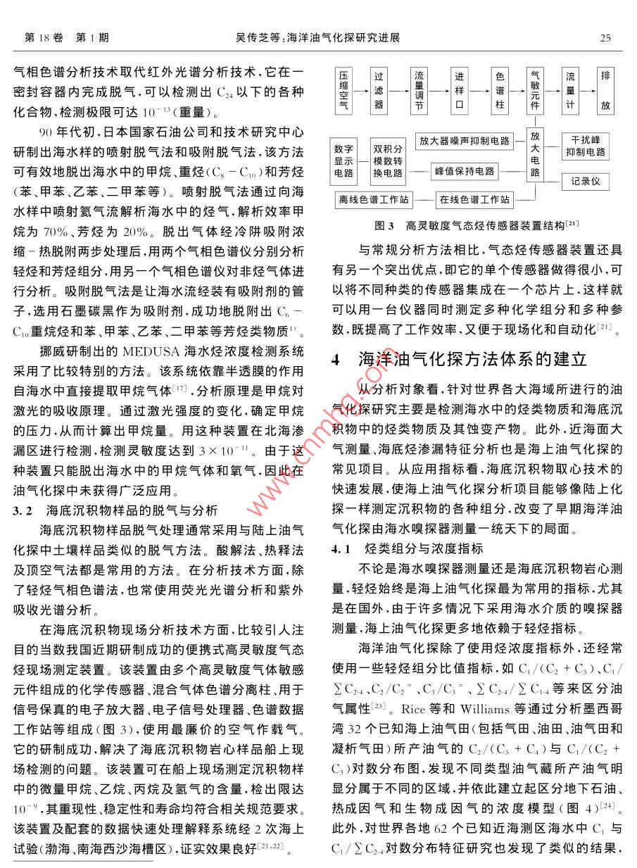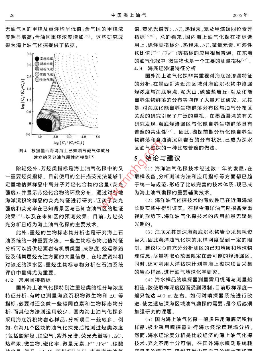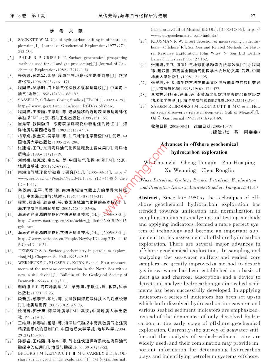 第18卷第1期中國海上油氣Vol.18 No. 12006年2月CHINA OFFSHORE OIL AND GASFeb. 2006 ,海洋油氣化探研究進(jìn)展吳傳芝程同錦朱懷平徐文明.陳榮林(中國石化石油勘探開發(fā)研究院無錫石油地質(zhì)研究所)摘要海洋油氣化探技術(shù)自20世紀(jì)50年代末以來,經(jīng)過數(shù)十年的發(fā)展,在取樣設(shè)備、分析測(cè)試方法及應(yīng)用指標(biāo)等方面,已經(jīng)趨于統(tǒng)一與規(guī)范,形成了比較完善的技術(shù)體系,成為海洋油氣風(fēng)險(xiǎn)評(píng)價(jià)的重要輔助方法。海洋油氣化探研究的主要進(jìn)展包括:在采樣與分析方面,完善了海水嗅探器與采樣管巖心采集裝置.建立了以惰性氣體脫氣法和活性炭吸附脫氣法為主的海水脫氣方法,成功地研制出海底沉積物氣態(tài)烴現(xiàn)場檢測(cè)與分析裝置;在應(yīng)用指標(biāo)方面,已從初期的以海水輕烴指標(biāo)為主,發(fā)展為海水輕烴指標(biāo)與海底沉積物各項(xiàng)指標(biāo)并重的一套方法系列。在目前的海洋油氣化探中,海水嗅探器測(cè)量與海底沉積物巖心分析是廣泛采用的做法,兩種手段相結(jié)合可為確定海上含油氣遠(yuǎn)景區(qū)、識(shí)別海域油氣系統(tǒng)特征等提供重要信息。關(guān)鍵詞海洋油氣化探 技術(shù)方法海洋鉆探耗資巨大,故海域尤其是深水區(qū)鉆井基作用。此后,美國其他一些油氣勘探公司研制出資料迄今仍十分缺乏。在這種情況下,以烴類濃度多種類型海水嗅探器裝置,如D. R. Schink等報(bào)道及烴類蝕變產(chǎn)物為主要測(cè)量對(duì)象的油氣化探技術(shù)已的底層水取樣器、得克薩斯農(nóng)工大學(xué)的嗅測(cè)系統(tǒng).以成為評(píng)價(jià)海.上油氣遠(yuǎn)景的重要輔助手段。經(jīng)過數(shù)十及J.J.Sigalove等報(bào)道的嗅測(cè)儀等。海水嗅探器裝年的發(fā)展.海洋油氣化探技術(shù)在樣品采集、脫氣處置的不斷改進(jìn)促進(jìn)了海洋油氣化探工作的蓬勃開理、分析測(cè)試、指標(biāo)選擇等方面得到了不斷完善,已展。到20世紀(jì)60、70年代以油氣勘探為目的的海成為-種較為成熟的油氣勘探技術(shù)。尤其是在與地水烴濃度檢測(cè)活動(dòng)進(jìn)入高潮期,幾乎每-家較大的震、地質(zhì)資料結(jié)合應(yīng)用時(shí),油氣化探技術(shù)在海上含油美國石油公司都參與到海水烴濃度檢測(cè)之中1.2]。氣遠(yuǎn)景區(qū)篩選、干構(gòu)造排除、地震探明構(gòu)造含油氣性20世紀(jì)70年代以來,海底沉積物巖心采集技判識(shí)及地下油氣系統(tǒng)研究等方面均發(fā)揮了重要作用。術(shù)獲得了快速發(fā)展,該技術(shù)可以有效地采集符合地球化學(xué)分析要求的海底沉積物樣品,為海底沉積物.1海洋油氣化探技術(shù)概況地球化學(xué)分析奠定了基礎(chǔ)。目前,海底沉積物地球化1.1國外海洋油氣化探技術(shù)發(fā)展歷程學(xué)分析已成為海上油氣化探不可缺少的組成部分。應(yīng)用油氣化探技術(shù)尋找海洋油氣富集區(qū)塊始于總體上看,20世紀(jì)60年代以來國外海洋油氣20世紀(jì)50年代后期14。1957 年,R. L. Slobad,H.化探測(cè)區(qū)幾乎遍及世界各大近海區(qū)。北海、墨西哥F.Dunlap與T.F.Moore提出“通過圈定海上油氣灣、圣巴巴拉海峽、阿拉斯加灣、非洲西部近海及南美滲漏區(qū)進(jìn)行石油勘探”的地球化學(xué)勘探技術(shù),首次提洲近海區(qū)域都是海上油氣化探研究進(jìn)行得非常集中出用烴類嗅探器測(cè)量系統(tǒng)對(duì)海水烴濃度進(jìn)行檢測(cè),的地區(qū)。美國一些油氣勘探和研究機(jī)構(gòu),如海灣石油該系統(tǒng)于1959年獲得專利[1.2。盡管當(dāng)時(shí)的海水烴公司、勘探技術(shù)公司、得克薩斯農(nóng)工大學(xué)地球化學(xué)和濃度檢測(cè)系統(tǒng)在取樣深度、檢測(cè)對(duì)象及分析技術(shù)等環(huán)境研究組、國際地球化學(xué)服務(wù)公司及地球衛(wèi)星公司方面均存在較大缺陷.但當(dāng)初海水烴濃度檢測(cè)系統(tǒng)等,在海洋油氣化探方面做了積極的探索,這些機(jī)構(gòu)的研制成功還是開創(chuàng)了海水烴濃度現(xiàn)場檢測(cè)的先在不同海域利用海水溶解烴、海水游離烴、海底沉積例,對(duì)海洋油氣化探技術(shù)發(fā)展與應(yīng)用起了積極的奠物吸附烴及海面油膜近海面空氣等分析介質(zhì),研究第18卷第1期吳傳芝等:海洋油氣化探研究進(jìn)展23了海洋環(huán)境中烴濃度與地下油氣之間的關(guān)系1.2)[1.51。以輕組分為主,表明區(qū)內(nèi)應(yīng)以尋找天然氣和輕質(zhì)油1.2 我國海洋油氣化探技術(shù)發(fā)展歷程為主。南海各測(cè)區(qū)輕烴組分以甲烷為主.干燥系數(shù)我國海洋油氣化探研究最早可追溯到1974年,均大于90%,芳烴以輕組分為主,表明區(qū)內(nèi)應(yīng)以天當(dāng)時(shí)僅作了少量海底沉積物地球化學(xué)研究工然氣和輕質(zhì)油為主要勘探目標(biāo)[13]。作[46]。此后,原地質(zhì)礦產(chǎn)部石油地質(zhì)海洋地質(zhì)局“九五”與“十五”期間,我國海洋油氣化探領(lǐng)域石油地質(zhì)綜合大隊(duì)101隊(duì)分析了渤海、黃海及東海取得了一批引人注目的新成果。國家863計(jì)劃“海海底沉積物吸附烴(甲烷、乙烷、丙烷、正丁烷、異丁底礦產(chǎn)資源的地球化學(xué)快速探查技術(shù)”課題組研制烷總烴及重?zé)N)