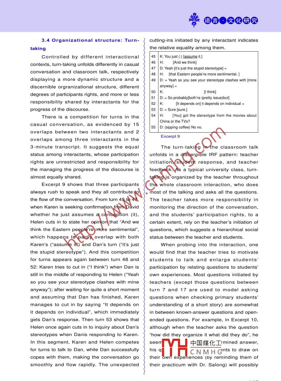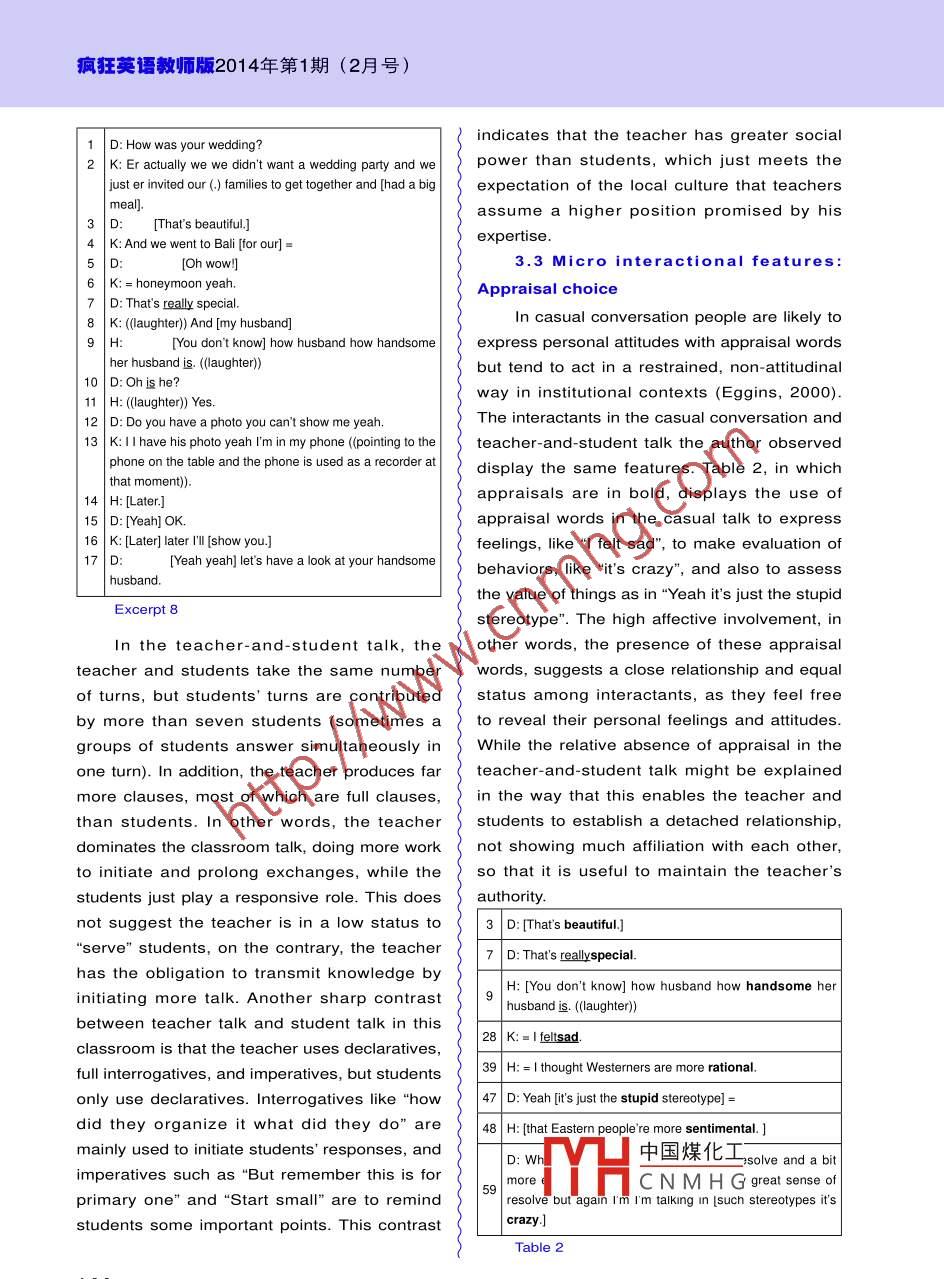 派語肯●文招研究A Comparative Analysis of CasualConversation and Institutional Talk王柯蘆(樂山師范學(xué)院外國語學(xué)院,四川樂山614000)Abstract: This article reflects on the process of transcribing spoken interaction and makes acomparative analysis of two different varieties of spoken interaction (casual conver-sation and institutional talk). By doing so, it reveals how the different purposes ofspeech result in their distinctive characteristics, and shows how language is struc-tured to construct ideational meanings (Field) and interpersonal meanings (Tenor)that define each context.Key words: transcription; comparative analysis; casual conversation; institutional talk|[中圖分類 號(hào)] H030| [文獻(xiàn)標(biāo)識(shí)碼] A[文章編號(hào)] 1006-2831 (2014)02-0139-9 doi:10.3969/j.issn. 1006-2831.2014.01 .0371. Introductionin particular makes salient their distinctiveTranscription is a valuable tool to“freeze-linguistic and non-linguistic features, showingframe a moment"(Rex & Schiller, 2009: 10).how these choices enact different social rightsIt offers“previously invisible choices" (Rex &and obligations of each role of the interactants.Schiller, 2009: 10) to probe into conversations,In addition, a close examination of thewhich would otherwise be evanescent in itscharacteristics of the two types of interactionoriginal form. Transcription examines bothhelps reveal the different purposes ofhow interactants employ different grammatical,interaction, as“the linguistic forms and patternslexical, discourse-organizational, prosodic, andof interaction between the teacher and studentsparalinguistic features to negotiate meaningswill be linked in some way to the pedagogicaland achieve particular purposes in differentpurposes which the teacher introduces ”domains of life, and how the interpersonal(Seedhouse,1996: 21),while casual talkrelationship is established, maintained orusually is not for a certain end, but sustainingchanged through the conversation. Despite theinterpersonal relationship.great value of transcription, it is not a faithfulThis article is based on the transcription ofor objective way in which talk can be written.a casual conversation and an institutional talk.Influenced by the purpose of transcribing,The casual talk is recorded when three friendspersonal language ideology, and the tensionare chatting on campus. The participantsbetween readability and accuracy, transcribersinclude one male native speaker (Dan) and twomay have different decisions in "what tofemale non-native speakers (Karen and Helen),transcribe and in how much detail" (Eggins,whose English proficiency is high and near2000: 148). Therefore, transcription itself is anativ中國煤化工an episode of akind of interpretation and representation (Green,tutorigiven to fourth-Franquiz & Dixon, 1997). A comparison ofyear:TYHCNMHGPore. A reflectioninstitutional talk with casual conversation wouldon the process of transcribing constitutes收稿日期: 2013-12-14; 修改稿: 2013-12-24Crazy English Teachers139瘋狂英語教師版2014年第1期(2月號(hào))the first part of the article, mainly focusing onalone are far from enough to reveal the hiddenhow the purposes of transcription affect themeaning and interpersonal relationship inauthor's transcribing process; then a detailedinteraction. Compared with the initial transcriptcomparative analysis of the casual conversation(Excerpt 1), stress in the final transcript (Excerptand teacher-and-student talk follows, showing1) of the same segment helps construct thehow their distinctive interactional purposescontent of interaction by highlighting someare enacted. However, characteristics andissues. The stressed and elongated wordpurposes of the two talks cannot be generalized"lo:t”highlights the amount of Karen's cry,to all casual conversations and classroomthe stressed phrase "felt sad" highlightstalks because transcription captures only oneKaren's sorrowful psychological state, and theinstance of each type of speech on the onestressed word "first" highlights how long thishand, and the recorded classroom talk is juststate has lasted. Thus, the final transcript witha sub-variety (seminar) of teacher-and-studentstress is better at showing Karen's reactiontalk in the educational setting on the otherto her husband's leaving. Stress also helpshand.represent participants' attitudes and uncoverthe interpersonal relationship: Dan's elongation2. Reflection of the transcribingof the exclamation“oh::" indicates his sympathytowards Karen; and Helen's purposefulprocessTranscription is an effective way tostressing and elongating the words "ba::ck" and"bring into focus the characteristics of spoken“cry:" at the end of her turns suggests that shediscourse, which are surprisingly obscure toseems to know more than what Karen is sayingmost people" (Cameron, 2001: 33). In otherand she is inviting more explanation, whichwords, analysts' attention is constantly drawndisplays an intimate relationship with Karen.Turn |Initial TranscriptFinal Transcriptto particular characteristics of spoken discourseduring transcribing, and this enables them to20| K: [and then] he returned to | K: [and then] he returnednotice what they might have neglected in theChina.to China.21 H: And he cried she cried.H: And he cried she cried.interaction, thus opening for them opportunities22 D:Oh.D: Oh::to see how one can communicate with others23 |H: Alot.H: Alo:. (laughter))more productively and get things done more24|K:NonotalotjustononthatK:Nonotalo:tjuston;| day when | was in the airport. on tha day when I was insmoothly. However, it is generally agreed thatthe airport.transcription cannot faithfully reproduce every25| H: And then later when you H: And then later whenaspect of talk (Eggins, 2000; Green, Franquizgot backyou gotba.;ck& Dixon, 1997; Roberts, 1997). It is possible for26 K: No, I didn't cry.K: No I didn't cry.a transcript to be delicate in one way but not27