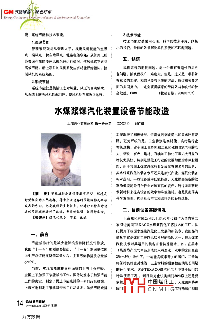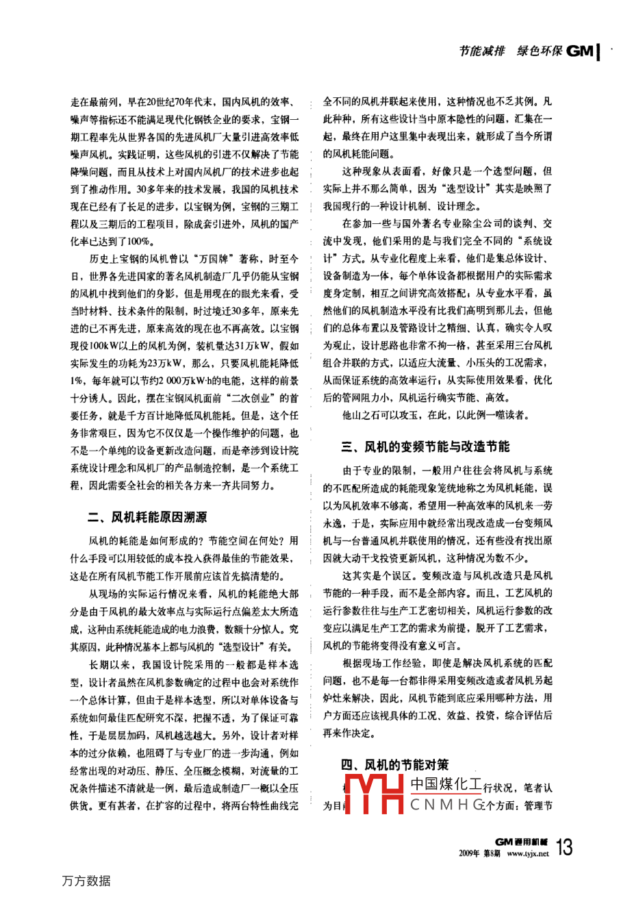 GM節(jié)能減排色環(huán)保Energy-Saving and Emission-reduction& L mironmentad ProtectiF能派綠色壞MM記者:邱明杰沈慶春專題篇編者按:節(jié)能減排,綠色環(huán)保作為可持續(xù)發(fā)展戰(zhàn)略中不可忽視的重要一環(huán),成為建設(shè)資源節(jié)約型和環(huán)境友好型社會的重要保障,設(shè)備的節(jié)能是用戶與制造業(yè)共同關(guān)注與關(guān)心的問題,而且通用機(jī)械的產(chǎn)品這方面有著巨大的潛力可挖,怎么能讓制造業(yè)與用戶之間實現(xiàn)很好的溝通,達(dá)到雙方利益最大化,是我們建立這個平臺的目的,同時,我們都在各自的能力范圍內(nèi)為社會的發(fā)展做出應(yīng)有的貢獻(xiàn)。本期從不同角度,不同行業(yè),貫穿了行業(yè)專家、企業(yè)中的設(shè)備專家及技術(shù)專家們在節(jié)能方面的看法、建議和措施,并提供了實際應(yīng)用案例和效果,雖然不能將節(jié)能這個話題全部囊括,但也為讀者展現(xiàn)了豐富多彩的內(nèi)容,希望這些內(nèi)客,那怕是一點點有價值的信息轉(zhuǎn)化為您們真正的生產(chǎn)力,也是我們努力工作的動力和信心。風(fēng)機(jī)節(jié)能淺析用戶篇寶鋼股份公司設(shè)備部(上海201900)胡照海擠要】節(jié)能減排是企業(yè)與用戶共同關(guān)注與關(guān)心的話題,通過實踐說明節(jié)能是個系統(tǒng)工程,應(yīng)全面考慮,以達(dá)到實際效果。【關(guān)鍵詞】風(fēng)機(jī)節(jié)能原因?qū)嶋H效果能源環(huán)保問題是21世紀(jì)的熱門話題,作為通用機(jī)械的風(fēng)機(jī)行業(yè),特別是在當(dāng)前金融危機(jī)的形勢下,如何提高效率,減少能耗是每一個與風(fēng)機(jī)相關(guān)的人所關(guān)心的事。就目前節(jié)能降耗的方法而言,有主張變頻節(jié)能的,也有提倡風(fēng)機(jī)改造節(jié)能的,但是,究竟哪種方法合適,實際應(yīng)用過程中哪種方法能更勝一籌,各家所言各執(zhí)一詞,莫一而終。本文嘗試從用戶的角度對風(fēng)機(jī)節(jié)能作一淺析,希望起到拋磚引玉的作用,一孔之見,供大家參考。我們走過的F中國煤化工冶金行業(yè)歷來是令人YHCNMHG降耗上也一直是12cM用堿www.tvx.net2009年第8節(jié)能減排綠色環(huán)保GM走在最前列,早在20世紀(jì)70年代末,國內(nèi)風(fēng)機(jī)的效率,:全不同的風(fēng)機(jī)并聯(lián)起來使用,這種情況也不乏其例。噪聲等指標(biāo)還不能滿足現(xiàn)代化鋼鐵企業(yè)的要求,寶鋼此種種,所有這些設(shè)計當(dāng)中原本隱性的問題,匯集在期工程率先從世界各國的先進(jìn)風(fēng)機(jī)廠大量引進(jìn)高效率低起,最終在用戶這里集中表現(xiàn)出來,就形成了當(dāng)今所謂噪聲風(fēng)機(jī)。實踐證明,這些鳳機(jī)的引進(jìn)不僅解決了節(jié)能的風(fēng)機(jī)耗能問題。降噪問題,而且從技術(shù)上對國內(nèi)風(fēng)機(jī)廠的技術(shù)進(jìn)步也起這種現(xiàn)象從表面看,好像只是一個選型問題,但到了推動作用。30多年來的技術(shù)發(fā)展,我國的風(fēng)機(jī)技術(shù)實際上并不那么簡單,因為“選型設(shè)計”其實是映照了現(xiàn)在已經(jīng)有了長足的進(jìn)步,以寶鋼為例,寶鋼的三期工:我國現(xiàn)行的一種設(shè)計機(jī)制、設(shè)計理念。程以及三期后的工程項目,除成套引進(jìn)外,風(fēng)機(jī)的國產(chǎn)在參加一些與國外著名專業(yè)除塵公司的談判、交化率已達(dá)到了100%流中發(fā)現(xiàn),他們采用的是與我們完全不同的“系統(tǒng)設(shè)歷史上寶鋼的風(fēng)機(jī)曾以“萬國牌”著稱,時至今:計”方式。從專業(yè)化程度上來看,他們是集總體設(shè)計日,世界各先進(jìn)國家的著名風(fēng)機(jī)制造廠幾乎仍能從寶鋼設(shè)備制造為一體,每個單體設(shè)備都根據(jù)用戶的實際需求的風(fēng)機(jī)中找到他們的身影,但是用現(xiàn)在的眼光來看,受度身定制,相互之間講究高效搭配;從專業(yè)水平看,當(dāng)時材料、技術(shù)條件的限制,時過境遷30多年,原來先然他們的風(fēng)機(jī)制造水平?jīng)]有比我們高明到那兒去,但他進(jìn)的已不再先進(jìn),原來高效的現(xiàn)在也不再高效。以寶鋼;們的總體布置以及管路設(shè)計之精細(xì)、認(rèn)真,確實令人嘆現(xiàn)役100kW以上的鳳機(jī)為例,裝機(jī)量達(dá)31萬kW,假如為觀止,設(shè)計思路也非常不拘一格,甚至采用三臺風(fēng)機(jī)實際發(fā)生的功耗為23萬kW,那么,只要風(fēng)機(jī)能耗降低組合并聯(lián)的方式,以適應(yīng)大流量、小壓頭的工況需求1%,每年就可以節(jié)約2000萬kWh的電能,這樣的前景從而保證系統(tǒng)的高效率運行;從實際使用效果看,優(yōu)化十分誘人。因此,擺在寶鋼風(fēng)機(jī)面前“二次創(chuàng)業(yè)”的首后的管網(wǎng)阻力小,風(fēng)機(jī)運行確實節(jié)能、高效。要任務(wù),就是千方百計地降低風(fēng)機(jī)能耗。但是,這個任他山之石可以攻玉,在此,以此例一噬讀者。務(wù)非常艱巨,因為它不僅僅是一個操作維護(hù)的問題,也不是一個單純的設(shè)備更新改造問題,而是牽涉到設(shè)計院風(fēng)機(jī)的變頻節(jié)能與改造節(jié)能系統(tǒng)設(shè)計理念和風(fēng)機(jī)廠的產(chǎn)品制造控制,是一個系統(tǒng)工由于專業(yè)的限制,一般用戶往往會將風(fēng)機(jī)與系統(tǒng)程,因此需要全社會的相