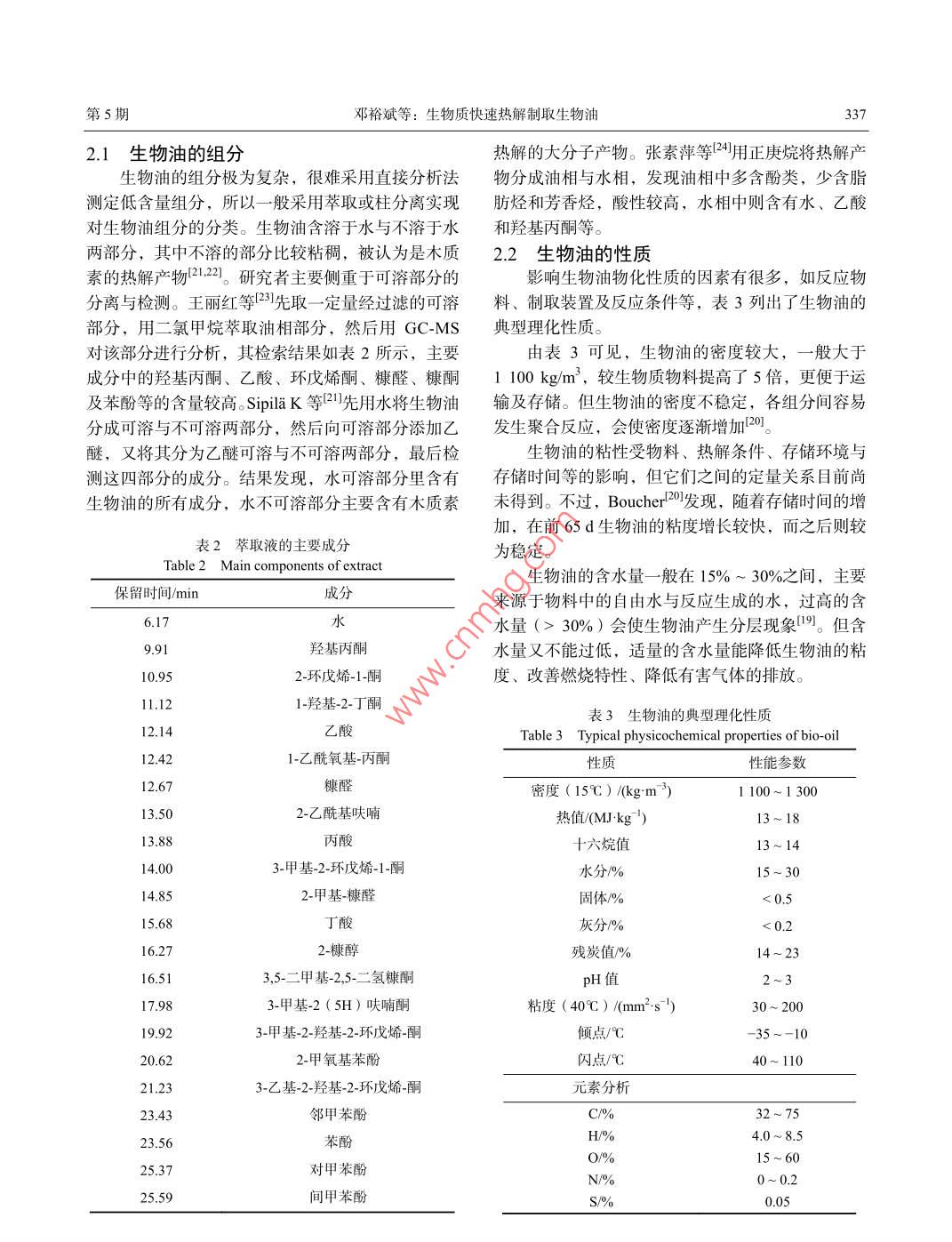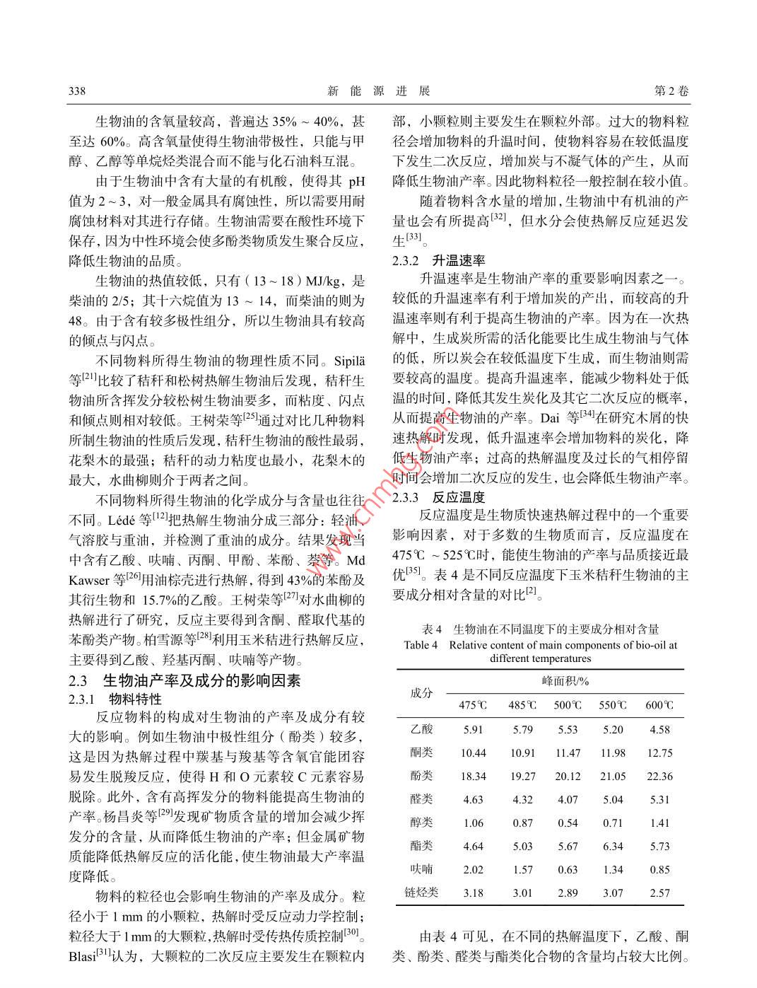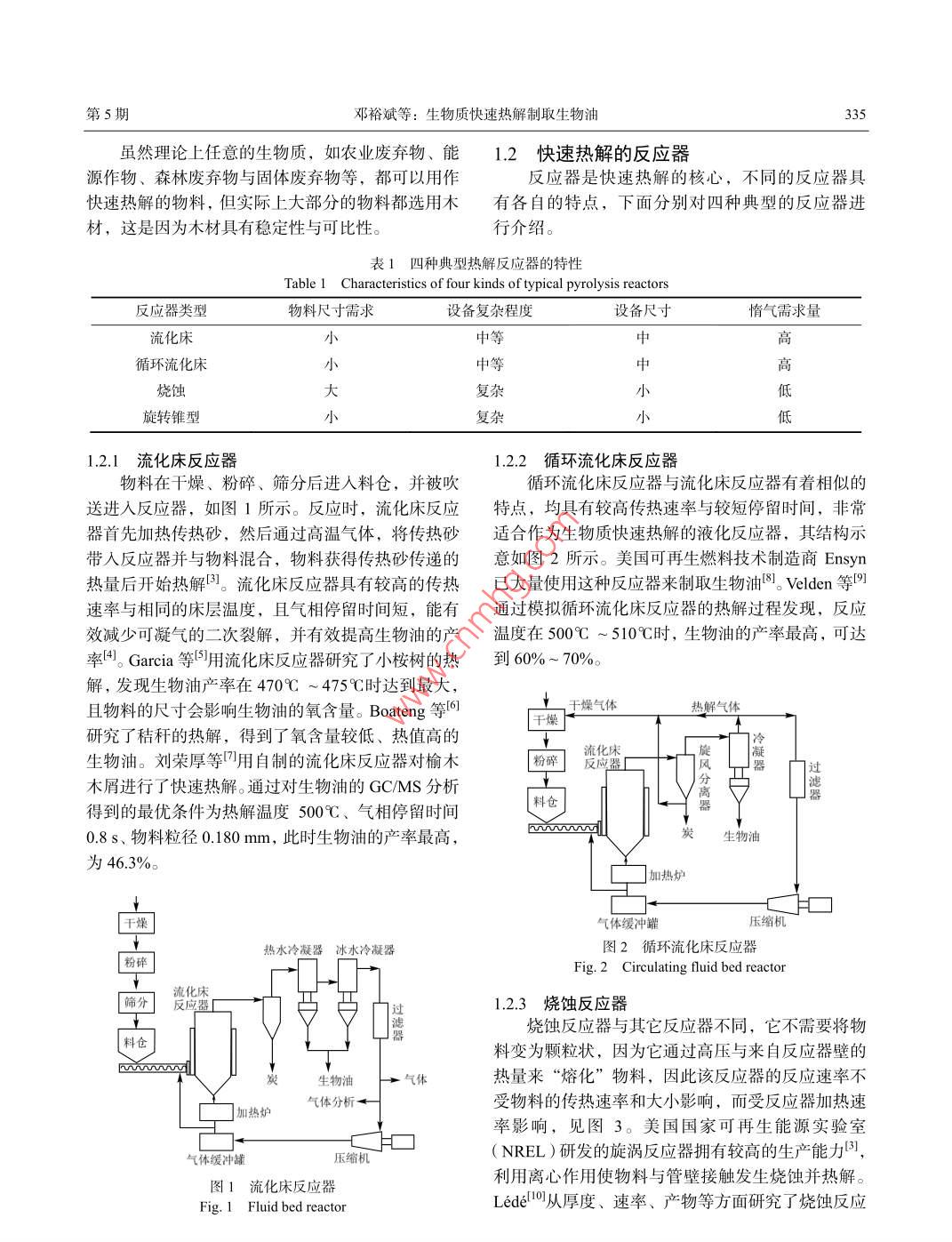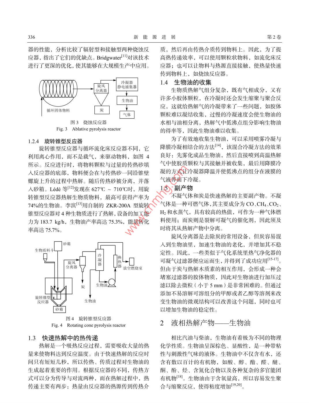 第2卷第5期新能源進(jìn)展Vol 2 No 52014年10月ADVANCES IN NEW AND RENEWABLE ENERGYOct.2014文章編號(hào):2095-560X(2014)05-0334-08生物質(zhì)快速熱解制取生物油”鄧裕斌,劉超,武書彬↑華南理工大學(xué)制漿造紙工程國(guó)家重點(diǎn)實(shí)驗(yàn)室,廣州510640)摘要:生物質(zhì)能源是可再生能源的重要組成部分,具有資源豐富和低污染的特點(diǎn),它的開發(fā)與利用已成為21世紀(jì)硏究的重要課題。本文概述了生物質(zhì)快速熱解的過程、設(shè)備及其產(chǎn)物,并對(duì)熱解的重要產(chǎn)物—生物油的組成、性質(zhì)、精制以及轉(zhuǎn)化利用進(jìn)行了詳細(xì)的闡述關(guān)鍵詞:生物質(zhì);快速熱解;生物油中圖分類號(hào):TK6文獻(xiàn)標(biāo)志碼:Adoi:10.3969/sn.2095-560X.2014.050A Review on Fast Pyrolysis of Biomass for Bio-oilDENG Yu-bin LIU Chao WU Shu-binState Key Laboratory of Pulp and Paper Engineering, South China University of Technology, Guangzhou 510640, China)Abstract: Biomass energy, with characteristics of abundant resources and low pollution, is an important part of renewableenergy. Its development and utilization has become an important research topic in the 2lst century. This paper providesoverview of biomass fast pyrolysis processes, equipment and products, and also expounds the compositions, propertiesrefining, conversion and utilization of bio-oil which is the important product of pyrolysis in detailKey words: biomass; fast pyrolysis; bio-oil0率(103~104)℃/min,將生物質(zhì)加熱至約500℃,隨著化石能源的日漸枯竭以及人類對(duì)能源需并讓氣相產(chǎn)物短暫停留(通常<1s),最終冷凝得求的日益增長(zhǎng),可再生能源越來越受到人們的關(guān)到液體(生物油)、固體(炭)和氣體產(chǎn)物的過程。注。生物質(zhì)作為地球上最為豐富與廉價(jià)的可再生資1快速熱解制備生物油源之一,具有很高的潛在利用價(jià)值。生物質(zhì)燃油及在快速熱解中,不同的生物質(zhì)種類及反應(yīng)條件殘余物可以通過熱轉(zhuǎn)化、生物轉(zhuǎn)化或機(jī)械轉(zhuǎn)化等形都會(huì)影響生物油的產(chǎn)率。因此,為能高效獲得生式轉(zhuǎn)變?yōu)楦袃r(jià)值的能源??焖贌峤馐菬峄瘜W(xué)轉(zhuǎn)化物油,在制備生物油時(shí)需要注意以下幾點(diǎn):方法的重要一員,誕生于20世紀(jì)70年代,是一種(1)物料需要細(xì)磨,以保證反應(yīng)的快速與充分;新型的轉(zhuǎn)化技術(shù),其重要產(chǎn)物之一—生物油既便(2)反應(yīng)溫度需要控制在500℃附近,因?yàn)檫@于儲(chǔ)存與運(yùn)輸,又能夠作為能源、化學(xué)品與能源載對(duì)大多數(shù)生物質(zhì)物料而言能增加生物油的產(chǎn)率;體叫。因此,通過快速熱解制備生物油是當(dāng)今研究(3)停留時(shí)間控制在2s以下,以減少二次反應(yīng)的一大熱點(diǎn)。的發(fā)生1快速熱解(4)反應(yīng)生成的炭必須快速除去,以減少產(chǎn)物裂解的可能快速熱解是指在沒有氧化劑(空氣、氧氣、水(5)需要快速冷卻熱解產(chǎn)物,以得到所需的生蒸汽等)存在的情況下,常壓下采用較高的升溫速物油。*收稿日期:2014-07-13修訂日期:201408-2基金項(xiàng)目:國(guó)家“973”計(jì)劃項(xiàng)目(2013CB228101);國(guó)家自然科學(xué)基金項(xiàng)目(31270635,21176095)十通信作者:武書彬,E-mail: shubinwulascut, edu. cn第5期鄧裕斌等:生物質(zhì)快速熱解制取生物油335雖然理論上任意的生物質(zhì),如農(nóng)業(yè)廢棄物、能1.2快速熱解的反應(yīng)器源作物、森林廢棄物與固體廢棄物等,都可以用作反應(yīng)器是快速熱解的核心,不同的反應(yīng)器具快速熱解的物料,但實(shí)際上大部分的物料都選用木有各自的特點(diǎn),下面分別對(duì)四種典型的反應(yīng)器進(jìn)材,這是因?yàn)槟静木哂蟹€(wěn)定性與可比性。行介紹表1四種典型熱解反應(yīng)器的特性Table I Characteristics of four kinds of typical pyrolysis reactors反應(yīng)器類型物料尺寸需求設(shè)備復(fù)雜程度設(shè)備尺寸惰氣需求量流化床中等循環(huán)流化床中等燒蝕旋轉(zhuǎn)錐型小大小復(fù)雜復(fù)雜高低低1.2.1流化床反應(yīng)器1.2.2循環(huán)流化床反應(yīng)器物料在干燥、粉碎、篩分后進(jìn)入料倉(cāng),并被吹循環(huán)流化床反應(yīng)器與流化床反應(yīng)器有著相似的送進(jìn)入反應(yīng)器,如圖1所示。反應(yīng)時(shí),流化床反應(yīng)特點(diǎn),均具有較高傳熱速率與較短停留時(shí)間,非常器首先加熱傳熱砂,然后通過高溫氣體,將傳熱砂適合作為生物質(zhì)快速熱解的液化反應(yīng)器,其結(jié)構(gòu)示帶入反應(yīng)器并與物料混合,物料獲得傳熱砂傳遞的意如圖2所示。美國(guó)可再生燃料技術(shù)制造商 Ensyn熱量后開始熱解。流化床反應(yīng)器具有較高的傳熱已大量使用這種反應(yīng)器來制取生物油。 Velden等速率與相同的床層溫度,且氣相停留時(shí)閫短,能有通過模擬循環(huán)流化床反應(yīng)器的熱解過程發(fā)現(xiàn),反應(yīng)效減少可凝氣的二次裂解,并有效提高生物油的產(chǎn)溫度在500℃~510℃時(shí),生物油的產(chǎn)率最高,可達(dá)Garcia等⑤用流化床反應(yīng)器研究了小桉樹的熱到60%~70%。解,發(fā)現(xiàn)生物油產(chǎn)率在470℃℃~475℃時(shí)達(dá)到最大且物料的尺寸會(huì)影響生物油的氧含量。 Boateng等向熱解氣體研究了秸稈的熱解,得到了氧含量較低、熱值高的生物油。劉榮厚等用自制的流