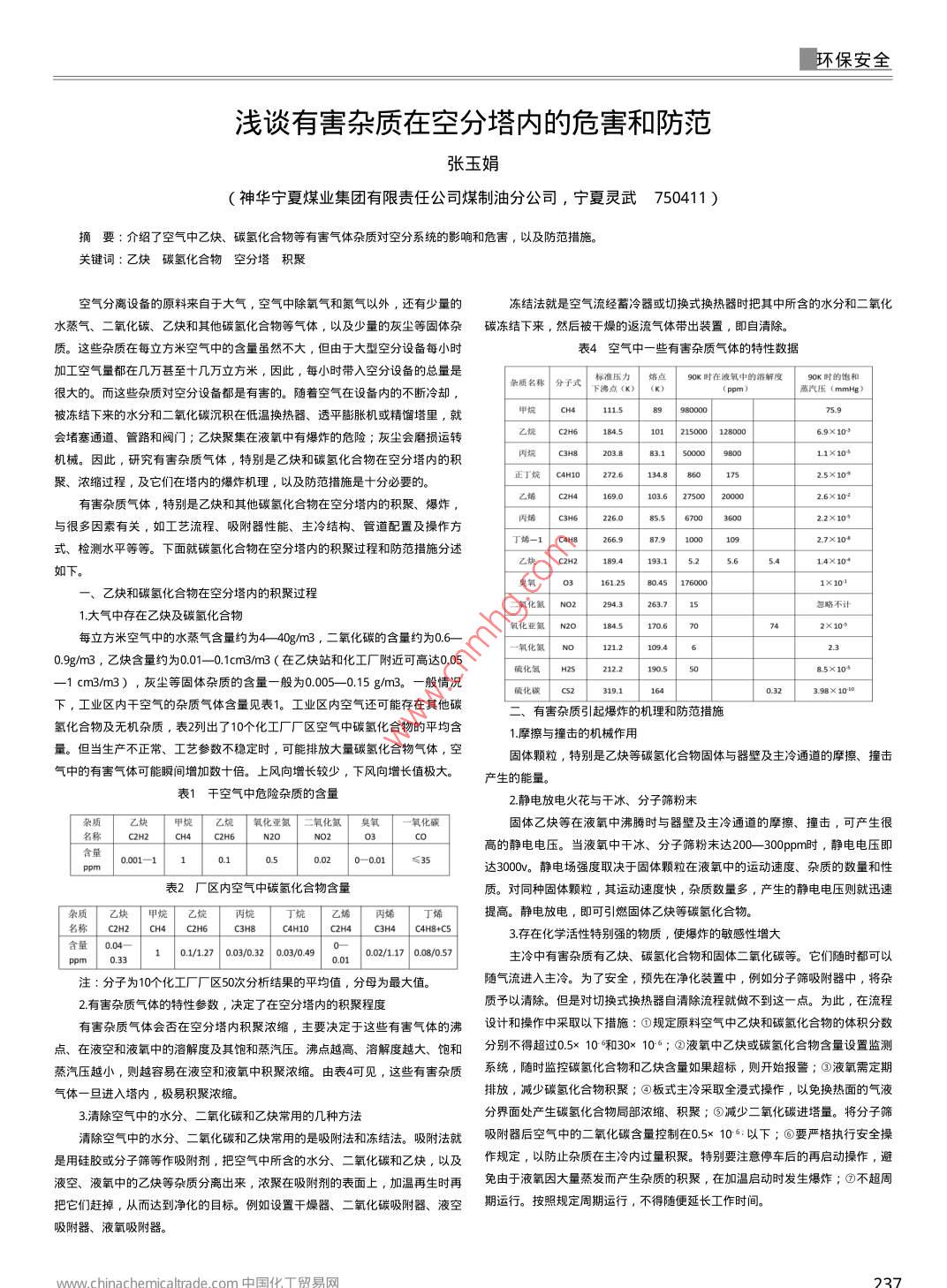 環(huán)保安全淺談有害雜質(zhì)在空分塔內(nèi)的危害和防范張玉娟神華寧夏煤業(yè)集團有限責任公司煤制油分公司,寧夏靈武750411)要:介紹了空氣中乙炔、碳氫化合物等有害氣體雜質(zhì)對空分系統(tǒng)的影響和危害,以及防范措施。關(guān)鍵詞:乙炔碳氫化合物空分塔空氣分離設(shè)備的原料來自于大氣,空氣中除氧氣和氮氣以外,還有少量的凍結(jié)法就是空氣流經(jīng)蓄冷器或切換式換熱器時把其中所含的水分和二氧化水蒸氣、二氧化碳、乙炔和其他碳氬化合物等氣體,以及少量的灰塵等固體雜碳凍結(jié)下來,然后被干燥的返流氣體帶出裝置,即自清除。質(zhì)。這些雜質(zhì)在每立方米空氣中的含量雖然不大,但由于大型空分設(shè)備每小時表4空氣中一些有害雜質(zhì)氣體的特性數(shù)據(jù)加工空氣量都在幾萬甚至十幾萬立方米,因此,每小時帶入空分設(shè)備的總量是很大的。而這些雜質(zhì)對空分設(shè)備都是有害的。隨著空氣在設(shè)備內(nèi)的不斷冷卻雜質(zhì)名稱分子式下沸點(x)(K)熔點90K時在液氧中的溶解度90K時的飽和蒸汽壓(mmHg)被凍結(jié)下來的水分和二氣化碳沉積在低溫換熱器、透平膨脹杋或精餾塔里,就1115會堵塞通道、管路和闖門;乙炔聚集在液氧中有爆炸的危險;灰塵會曆損運轉(zhuǎn)m-=機械。因此,研究有害雜質(zhì)氣體,特別是乙炔和碳氫化合物在空分塔內(nèi)的積丙烷c3H20388:so90o11×105聚、濃縮過程,及它們在塔內(nèi)的爆炸機理,以及防范措施是十分必要的。正丁烷cHoz76134886017525×10103.627500有害雜質(zhì)氣體,特別是乙炔和其他碳氫化合物在空分塔內(nèi)的積聚、爆炸2.6×10285567002.2×10與很多因素有關(guān),如工藝流程、吸附器性能、主冷結(jié)構(gòu)、管道配置及操作方2.7x104式、檢測水平等等。下面就碳氬化合物在空分塔內(nèi)的積聚過程和防范措施分述c4H82669879100乙炔cH189.4193.15.614X104如下1612580451760001×101乙炔和碳氫化合物在空分塔內(nèi)的積聚過程氧化氮2943263.715略不計1大氣中存在乙炔及碳氬化合物氧化亞氮N2o2×105每立方米空氣中的水蒸氣含量約為440gm3,二氧化碳的含量約為06一氧化氮No121.20.9gm3,乙炔含量約為001-—01cm3m3(在乙炔站和化工廠附近可高達0.05硫化氫H2521221905508.5×1051cm3/m3),灰塵等固體雜質(zhì)的含量一般為0.005-0.15g/m3。一般情況儀化碳3.98×1010下,工業(yè)區(qū)內(nèi)干空氣的雜質(zhì)氣體含量見表1。工業(yè)區(qū)內(nèi)空氣還可能存在其他碳二、有害雜質(zhì)引起爆炸的機理和防范措施氫化合物及無機雜質(zhì),表2列出了10個化工廠「區(qū)空氣中碳氫化合物的平均含1摩擦與撞擊的機械作用量。但當生產(chǎn)不正常、工藝參數(shù)不穩(wěn)定時,可能排放大量碳氫化合物氣體,空固體顆粒,特別是乙炔等碳氫化合物固體與器壁及主冷通道的摩擦、撞擊氣中的有害氣體可能瞬間增加數(shù)十倍。上風向增長較少,下風向增長值極大。產(chǎn)生的能量。表1干空氣中危險雜質(zhì)的含量2靜電放電火花與干冰、分子篩粉末雜質(zhì)乙炔甲烷乙烷氧化亞氮二氧化氮臭氧一氧化碳固體乙炔等在液氧中沸騰時與器璧及主冷通道的摩擦、撞擊,可產(chǎn)生很名稱C2H6含量高的靜電電壓。當液氧中干冰、分子篩粉末達200300m時,靜電電壓即0001-1020001≤35達3000√。靜電場強度取決于固體顆粒在液氧中的運動速度、雜質(zhì)的數(shù)量和性表2「區(qū)內(nèi)空氣中碳氫化合物含量質(zhì)。對同種固體顆粒,其運動速度快,雜質(zhì)數(shù)量多,產(chǎn)生的靜電電壓則就迅速雜質(zhì)乙炔甲烷乙烷丁烷乙烯提高。靜電放電,即可引燃固體乙炔等碳氬化合物名稱c2H2cH4c2H6C3H84H10 C2H4 C3H4 C4H8+C53存在化學活性特別強的物質(zhì),使爆炸的敏感性增大101/1.270030.32003/049001100057主冷中有害雜質(zhì)有乙炔、碳氫化合物和固體二氧化碳等。它們隨時都可以注:分子為10個化工廠「廠區(qū)50次分析結(jié)果的平均值,分母為最大值隨氣流進入圭冷。為了安全,預先在凈化裝置中,例如分子篩吸附器中,將雜2有害雜質(zhì)氣體的特性參數(shù),決定了在空分塔內(nèi)的積聚程度質(zhì)予以清除。但是對切換式換熱器自清除流程就做不到這一點。為此,在流程有害雜質(zhì)氣體會否在空分塔內(nèi)積聚濃縮,主要決定于這些有害氣體的沸設(shè)計和操作中采取以下措施:①規(guī)定原料空氣中乙炔和碳氫化合物的體積分數(shù)點、在液空和液氧中的溶解度及其飽和蒸汽壓。沸點越高、溶解度越大、飽和分別不得超過05×10和30×106;②液氧中乙炔或碳氫化合物含量設(shè)置監(jiān)蒸汽壓越小,則越容易在液空和液氧中積聚濃縮。由表4可見,這些有害雜質(zhì)系統(tǒng),隨時監(jiān)控碳氨化合物和乙炔含量如果超標,則開始報警;③液氧需定期氣體一旦進入塔內(nèi),極易積聚濃縮。排放,減少碳氬化合物積聚;⑨板式主冷采取全浸式操作,以免換熱面的氣液3清除空氣中的水分、二氧化碳和乙炔常用的幾種方法分界面處產(chǎn)生碳氫化合物局部濃縮、積聚;③減少二氧化碳進塔量。將分子篩清除空氣中的水分、二氧化碳和乙炔常用的是吸附法和凍結(jié)法。吸附法就吸附器后空氣中的二氧化碳含量控制在05×106以下;⑥要嚴格執(zhí)行安全操是用硅膠或分子篩等作吸附劑,把空氣中所含的水分、二氧化碳和乙炔,以及作規(guī