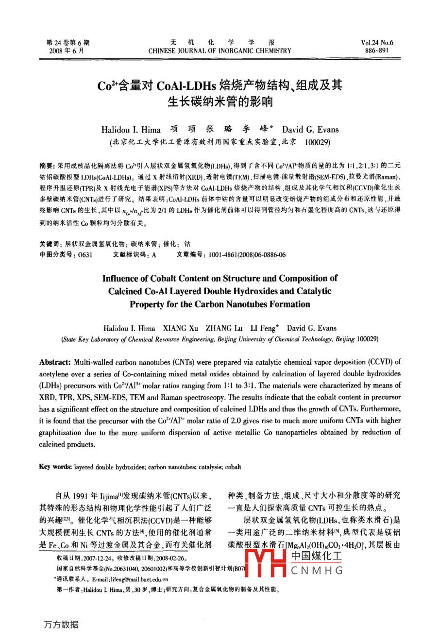 第24卷第6期無機(jī)化學(xué)學(xué)報(bào)Vol, 24 No 62008年6月CHINESE JOURNAL, OF INORGANIC CHEMISTRY886~891Co3含量對(duì) COAl-LDHs焙燒產(chǎn)物結(jié)構(gòu)、組成及其生長(zhǎng)碳納米管的影響Halidou I.Hima項(xiàng)頊張璐李峰* David g. Evans(北京化工大學(xué)化工資源有效利用國(guó)家重點(diǎn)實(shí)驗(yàn)室,北京1009)摘要:采用成核晶化隔離法將C2引人層狀雙金屬氫氧化物1DHs),得到了含不同Co2AP物質(zhì)的量的比為1:1,2:1,3:1的二元鈷鋁碳酸根型1DHs( CoAl-LDHs。通過x射線衍射(XRD)、透射電鏡(TM掃描電鏡能早散射譜 (SEM-EDS),拉曼光譜( Raman)、程序升溫還原TPR)及X射線光電子能譜XPS等方法對(duì) CoAL-LDHs焙燒產(chǎn)物的結(jié)構(gòu)、組成及其化學(xué)氣相沉積CCVD催化生長(zhǎng)多壁碳納米管(CNTs進(jìn)行了研究。結(jié)果表明:CoA-LDHs前體中鈷的含量可以明顯改變爝燒產(chǎn)物的組成分布和還原性能,并最終影響CNTs的生長(zhǎng),其中以nh,比為2/的LDHs作為催化劑前體可以得到管徑均勻和石墨化程度高的CNTs,這與還原得到的納米活性Co顆粒均勻分散有關(guān)。關(guān)鍵詞:層狀雙金屬氫氧化物;碳納米管;催化;鈷中圖分類號(hào):0631文獻(xiàn)標(biāo)識(shí)碼:A文章編號(hào):10014861(2008060886-06Influence of Cobalt Content on Structure and Composition ofCalcined Co-Al Layered Double Hydroxides and CatalyticProperty for the Carbon Nanotubes FormationHalidou L Hima XIANG Xu ZHANG Lu LI Feng* David G. Evans(State Key Laboratory of Chemical Resource Engineering, Beiing University of Chemical Technology, Beying 100029)Abstract: Multi-walled carbon nanotubes(CNTs)were prepared via catalytic chemical vapor deposition(CCVD)ofene over a serlesof Co-containing mixed metal oxides obtained by calcination of layered double hydroxides(LDHs) precursors with Co*/AI*molar ratios ranging from 1: I to 3: 1. The materials were characterized by means ofXRD, TPR, XPS, SEM-EDS, TEM and Raman spectroscopy. The results indicate that the cobalt content in precursorhas a significant effect on the structure and composition of calcined LDHs and thus the growth of CNTs. Furthermore,it is found that the precursor with the co?"/AP*molar ratio of 2.0 gives rise to much more uniform CNTs with highergraphitization due to the more uniform dispersion of active metallic Co nanoparticles obtained by reduction ofcalcined products.Key words: layered double hydroxides; carbon nanotubes; catalysis; cobalt自從1991年 iijima發(fā)現(xiàn)碳納米管(CNTs)以來,種類、制備方法、組成、尺寸大小和分散度等的研究其特殊的形態(tài)結(jié)構(gòu)和物理化學(xué)性能引起了人們廣泛一直是人們探索高質(zhì)量CNTs可控生長(zhǎng)的熱點(diǎn)。的興趣叫。催化化學(xué)氣相沉積法CCVD)是一種能夠?qū)訝铍p金屬氫氧化物①LDHs,也稱類水滑石)是大規(guī)模便利生長(zhǎng)CNTs的方法,使用的催化劑通常類用途廣泛的二維納米材料門,典型代表是鎂鋁是FeCo和N等過渡金屬及其合金,面有關(guān)催化劑碳酸根型水滑石 MgAL(oh, co:4H,其層板由收稿日期:2007-1224。收修改稿期:20080226中國(guó)煤化工國(guó)家自然科學(xué)基企N0630.06020和高等學(xué)校創(chuàng)新引智計(jì)劃B07CNMHG通訊聯(lián)系人。Email:lifeng@mail.buct.edu.cn作者: Halidou I.Him,男,30歲,博士;研究方向:復(fù)合金屬氧化物的制備及其性能第6期Halidou I.Hima等:Co32含量對(duì)CoAl-DHs焙燒產(chǎn)物結(jié)構(gòu)、組成及其生長(zhǎng)碳納米管的影響MgO八面體共用棱邊構(gòu)成,LDHs中部分位于層板將其置于石英管中部。隨后管式爐中通入氮?dú)?流量上的Mg2被半徑相似的A同晶取代后,使層板帶60 mL min),并以5℃·min3的升溫速率逐漸將爐正電荷,層間可交換的陰離子CO2與層板上正電荷溫升至200℃后通人氫氣(流量6mmin),繼續(xù)升平衡。層板中的Mg2和AP可以被半徑相近的陽離溫至500℃后保溫45min。然后關(guān)閉氫氣繼續(xù)以子如Ni,Fe',Co3*,Zn3,Cu2等二價(jià)金屬陽離子和5℃·min-的速率將爐溫升至700℃保溫。此時(shí)向石Cr,Fe,A,Sc3等三價(jià)金屬陽離子部分或全部同英管中通入90min的乙炔(流量6mL·min),保溫晶取代,層間可交換CO3可以被NO3,Cl,OH,結(jié)束后將乙炔氣體關(guān)閉,繼續(xù)通氮?dú)?待管式爐自然SO2,PO2,CH4OO)27等無機(jī)和有機(jī)離子以及配冷卻至室溫后關(guān)閉氮?dú)?取出瓷舟中黑色產(chǎn)物于密離子取代。一般情況下,分子式中MM“物質(zhì)的量封袋中保存。的比介于2~5之間時(shí)能得到結(jié)構(gòu)完整的LDHs。層13結(jié)構(gòu)表征板組分由于受品格能最低效應(yīng)、晶格定位效應(yīng)和組采用口本島津XRD-6000型X射線粉末衍射儀分間共價(jià)作用的影響,LDHs中金屬元索具有在分XRD)表征樣品晶體結(jié)構(gòu)(石墨單色器濾波,Cu靶,子水平上組成和結(jié)構(gòu)均勻性的特征,因此其在高溫Kal輻射,A=0.15406mm,管電壓40kV,管電流處理后失去層狀結(jié)構(gòu)可以形成具有組分均勻分散的30mA,閃爍計(jì)數(shù)器計(jì)數(shù),掃描范圍(20:3°~70°);采復(fù)合金屬氧化物圍。用 Philips公司的 FEI TECNAI20型透射電子顯微本工作利用LDHs層板元素可調(diào)控性特點(diǎn),采鏡(TEM電壓120kV)進(jìn)行形貌分析;采用日立用成核晶化隔離法將Co2引人LDHs,合成得到了S4700型掃描電子顯微鏡(SEM,工作電壓20kV)和含不同Co3AP物質(zhì)的量的比的二元鈷鋁碳酸根型能量散射能譜(EDS, Oxford INCA)進(jìn)行元素分析;采LDHs( CoAl-LDHs),目的是通過結(jié)構(gòu)規(guī)整和組元分布用 