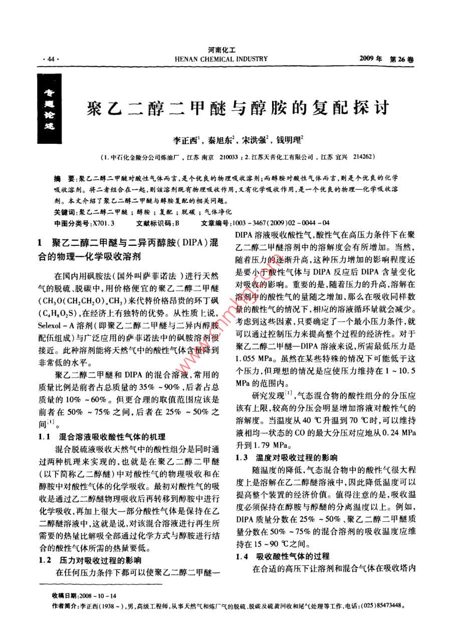 河南化工HENAN CHEMICAL INDUSTRY2009年第26卷聚乙二醇二甲醚與醇胺的復(fù)配探討李正西,秦旭東,宋洪強(qiáng),錢明理(1.中石化金陵分公司煉油廠,江蘇南京21003;2.江蘇天音化工有限公司,江蘇宜興214262)摘要:聚乙二醇二甲醚對酸性氣體而言,是個(gè)優(yōu)良的物理吸收溶劑;而醇胺對酸性氣體而言,則是個(gè)優(yōu)良的化學(xué)吸收溶劑。將二者組合在一起,則該溶劑既有物理吸收作用,又有化學(xué)吸收作用,是一個(gè)優(yōu)良的物理一化學(xué)吸收溶劑。本文介紹了聚乙二醇二甲醚與醇胺復(fù)配的相關(guān)問題。關(guān)鍵詞:聚乙二醇二甲醚;醇胺;復(fù)配;脫碳;氣體凈化中圖分類號:X701.3文獻(xiàn)標(biāo)識碼:B文章編號:1003-3467(2009)02-0044-041聚乙二醇二甲醚與二異丙醇胺(DPA)混乙二醇二甲醚溶劑中的溶解度會有所增加。當(dāng)然,隨著壓力的逐漸升高,這種壓力增加的影響程度還在國內(nèi)用砜胺法(國外叫薩菲諾法)進(jìn)行天然是要小于酸性氣體與DPA反應(yīng)后DPA含量變化氣的脫硫、脫碳中,用價(jià)格便宜的聚乙二醇二甲醚對吸收的影響。重要的是隨著壓力的升高溶解在(cH1O(CH2CH2O),CH1)來代替價(jià)格昂貴的環(huán)丁砜溶劑中的酸性氣的量隨之增加,那么在吸收同樣數(shù)量的酸性氣的情況下,相應(yīng)的溶液循環(huán)量就會減少seod-A溶劑(即聚乙二醇二甲醚與二異內(nèi)醇胺考慮到這些因素只要確定了一個(gè)最小壓力條件就配伍組成)與廣泛應(yīng)用的薩菲諾法中的砜胺溶劑很可以通過控制壓力來提高整個(gè)過程的經(jīng)濟(jì)性。對于接近。此種溶劑能將天然氣中的酸性氣體含量降到聚乙二醇二甲醚一DPA溶液來說所需最低壓力是非常低的水平。1.055MPa。雖然在某些特殊的情況下可能低于這聚乙二醇二甲醚和DPA的混合溶液,常用的個(gè)壓力但理想的情況是應(yīng)使壓力維持在1-10.5質(zhì)量比例是前者占總質(zhì)量的35%~90%,后者占總HPa的范圍內(nèi)。質(zhì)量的10%~60%。但更合理的取值范圍應(yīng)該是研究發(fā)現(xiàn)",氣態(tài)混合物的酸性組分的分壓應(yīng)前者在50%~75%之間,后者在25%-50%之該有上限較高的分壓會明顯增加溶液對酸性氣的溶解度。當(dāng)溫度從40℃升溫到70℃時(shí),可以維持1.1混合溶液吸收酸性氣體的機(jī)理液相均一狀態(tài)的CO的最大分壓對應(yīng)地從0.24MPa混合脫硫液吸收大然氣中的酸性組分是同時(shí)通升到1.79MPa過兩種機(jī)理來實(shí)現(xiàn)的,也就是在聚乙二醇二甲醚1.3溫度對吸收過程的影響(以下簡稱乙二醇醚)中對酸性氣的物理吸收和在隨溫度的降低,氣態(tài)混合物中的酸性氣很大程醇胺中對酸性氣體的化學(xué)吸收。最初對酸性氣的吸度上是溶解在乙二醇醚溶液中,因此降低溫度可以收是通過乙二醇醚物理吸收后再轉(zhuǎn)移到醉胺中進(jìn)行提高整個(gè)裝置的經(jīng)濟(jì)價(jià)值。值得注意的是,吸收溫化學(xué)吸收再加上很大一部分酸性氣體是保持在乙度必須保持在醇胺與醇醚的分離溫度以上。例如,二醇醚溶液中這就是說對該混合溶液進(jìn)行再生所DPA質(zhì)量分?jǐn)?shù)在25%-50%、聚乙二醇二甲醚質(zhì)需要的熱量比解吸全部通過化學(xué)方式與醇胺進(jìn)行結(jié)量分?jǐn)?shù)在50%-75%的混合溶劑的吸收溫度應(yīng)維合的酸性氣體所需的熱量要低。持在15~90℃之間1.2壓力對吸收過程的影響1.4吸收酸性氣體的過程在任何壓力條件下都可以使聚乙二醇二甲醚在合適的高壓下讓溶劑和混合氣體在吸收塔內(nèi)收稿日期:2008-10-14作者簡介:李正西(1938-),男,高級工程師,從事天然氣和煉廠氣的脫硫脫碳及硫黃問收和尾氣處理等工作電話:(025)8547348第2期李正西等聚乙二醇二甲醚與醇胺的復(fù)配探討接觸能有效地除去混合氣體中所含酸性氣體。然需要加熱,僅需將操作壓力從2.76MPa降到0.14后把含有酸性氣體的溶劑泵送到再生塔(再生塔的MPa,就可從溶劑解吸出至少60%所吸收的酸性氣壓力比吸收塔小)。溶劑在再生塔內(nèi)經(jīng)過酸性氣體體。溶劑每吸收1kgCO2所產(chǎn)生的反應(yīng)熱低于充分的解吸后返回吸收塔繼續(xù)吸收酸性氣體。溶劑1163kJ2在進(jìn)入再生塔之前先進(jìn)入閃蒸罐閃蒸,閃蒸罐的壓溶劑對CO2和CH4的溶解度至少應(yīng)為100:1,力介于吸收塔和再生塔之間,這樣可以先分離出除在吸收溫度下溶劑的粘度應(yīng)在15mPa·s以下,且了酸性氣體之外的其它少量氣體從而提高再生塔最好在1-10mPa·s之間。所應(yīng)用的三烷基醇胺中酸性氣體的濃度,達(dá)到回收酸性氣的目的含有至少2個(gè)羥基和烷基的組合基團(tuán),并且以氮原通過對從再生塔頂部離開的氣體中的蒸汽進(jìn)行子為中心。符合這種結(jié)構(gòu)的化合物包括甲基二乙醇冷凝以及將冷凝水作為回流再打回再生塔中,水分胺(MDEA)、乙基二乙醇胺、三乙醇胺、甲基乙醇丙可以基本保持在再生塔內(nèi)醇胺、乙基乙醇丙醇胺、甲基二丙醇胺。水分同時(shí)也是溶劑在吸收塔中循環(huán)的一部分該技術(shù)中的首選物理溶劑為聚乙二醇單甲醚的進(jìn)人吸收塔的溶劑中的水分的數(shù)量增多,則再生之同系物,通式為:后溶劑中留下的酸性氣體的數(shù)量就減少,但是水分R-0-(CH, CH,0)-H也會降低溶劑對酸性氣體的吸收能力。在這兩方面其中R1為含有1-4個(gè)碳原子的烷基基團(tuán),x中找到一個(gè)平