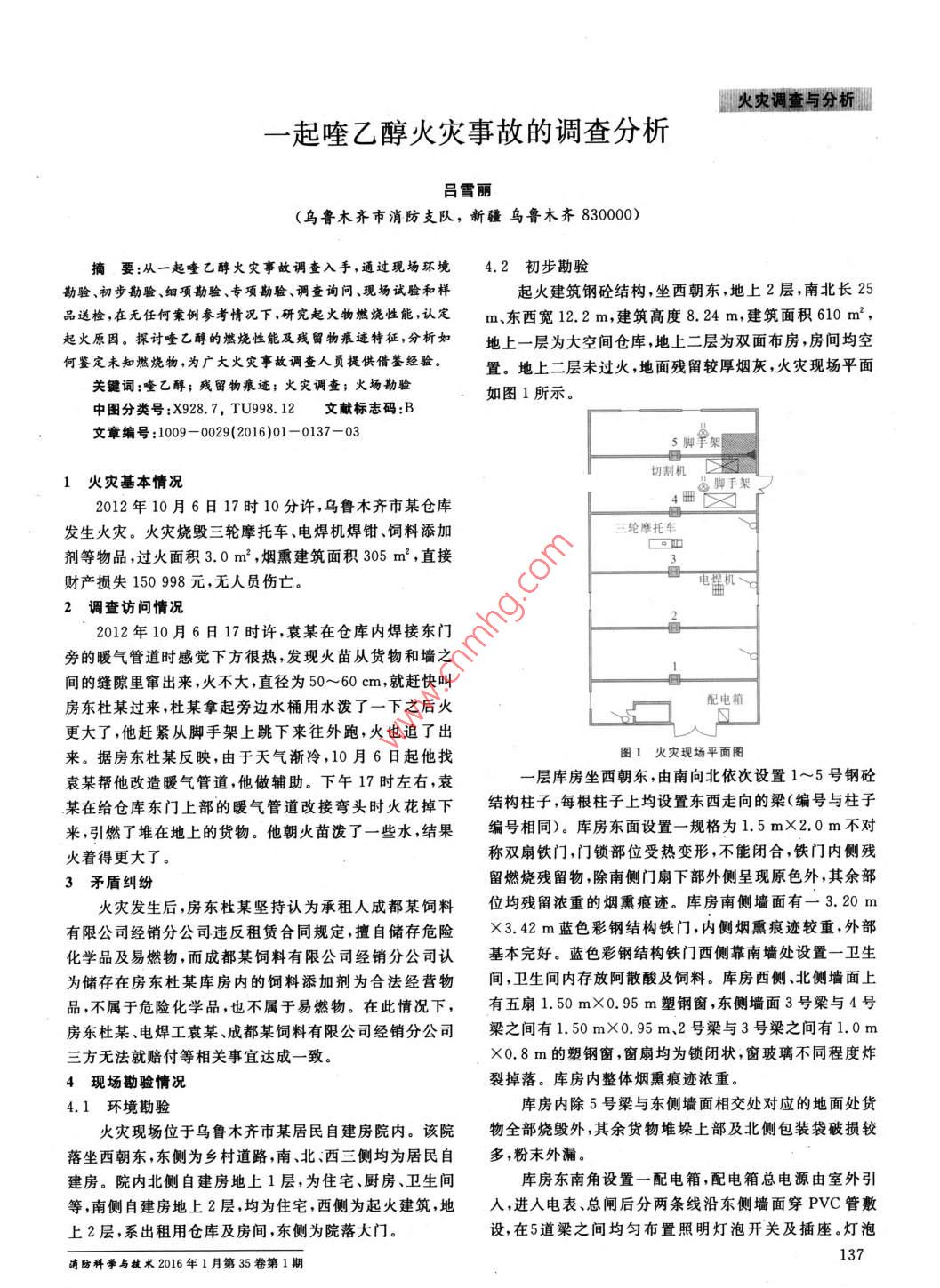 火災(zāi)調(diào)查與分析起喹乙醇火災(zāi)事故的調(diào)查分析呂雪麗(烏魯木齊市消防支隊(duì),新疆烏魯木齊830000摘要:從一起喹乙醇火災(zāi)事故調(diào)查入手,通過(guò)現(xiàn)場(chǎng)環(huán)境4.2初步勘驗(yàn)勘驗(yàn)、初步勘驗(yàn)、細(xì)項(xiàng)勘驗(yàn)、專項(xiàng)勘驗(yàn)、調(diào)查詢問(wèn)、現(xiàn)場(chǎng)試驗(yàn)和樣起火建筑鋼砼結(jié)構(gòu),坐西朝東地上2層,南北長(zhǎng)25品送檢,在無(wú)任何案例參考情況下,研究起火物燃燒性能,認(rèn)定m東西寬122m,建筑高度8.24m,建筑面積610m2,起火原因。探討喹乙醇的燃燒性能及殘留物痕跡特征,分析如地上一層為大空間倉(cāng)庫(kù),地上二層為雙面布房房間均空何鑒定未知燃燒物,為廣大火災(zāi)事故調(diào)查人頁(yè)提供借鑒經(jīng)驗(yàn)。置。地上二層未過(guò)火,地面殘留較厚煙灰,火災(zāi)現(xiàn)場(chǎng)平面關(guān)鍵詞:喹乙醇;殘留物痕跡;火災(zāi)調(diào)查;火場(chǎng)勤驗(yàn)如圖1所示。中圖分類號(hào):X928.7,TU998.12文獻(xiàn)標(biāo)志碼B文章編號(hào):1009-0029(2016)01-0137-03腳字架1火災(zāi)基本情況切割機(jī)腳手架2012年10月6日17時(shí)10分許,烏魯木齊市某倉(cāng)庫(kù)發(fā)生火災(zāi)?;馂?zāi)燒毀三輪摩托車、電焊機(jī)焊鉗、飼料添加三輪摩托車劑等物品,過(guò)火面積3.0m2,煙熏建筑面積305m2,直接財(cái)產(chǎn)損失150998元,無(wú)人員傷亡。2調(diào)查訪問(wèn)情況2012年10月6日17時(shí)許,袁某在倉(cāng)庫(kù)內(nèi)焊接?xùn)|門旁的暖氣管道時(shí)感覺(jué)下方很熱,發(fā)現(xiàn)火苗從貨物和墻之間的縫隙里竄出來(lái),火不大,直徑為50~60cm,就趕快叫房東杜某過(guò)來(lái),杜某拿起旁邊水桶用水潑了一下之后火配電箱更大了,他趕緊從腳手架上跳下來(lái)往外跑,火也追了出來(lái)。據(jù)房東杜某反映,由于天氣漸冷,10月6日起他找圖1火災(zāi)現(xiàn)場(chǎng)平面圖袁某幫他改造暖氣管道,他做輔助。下午17時(shí)左右,袁層庫(kù)房坐西朝東,由南向北依次設(shè)置1~5號(hào)鋼砼某在給倉(cāng)庫(kù)東門上部的暖氣管道改接彎頭時(shí)火花掉下結(jié)構(gòu)柱子,每根柱子上均設(shè)置東西走向的梁(編號(hào)與柱子來(lái),引燃了堆在地上的貨物。他朝火苗潑了一些水,結(jié)果編號(hào)相同)。庫(kù)房東面設(shè)置一規(guī)格為1.5m×2.0m不對(duì)火著得更大了。稱雙扇鐵門,門鎖部位受熱變形,不能閉合,鐵門內(nèi)側(cè)殘3矛盾糾紛留燃燒殘留物除南側(cè)門扇下部外側(cè)呈現(xiàn)原色外,其余部火災(zāi)發(fā)生后,房東杜某堅(jiān)持認(rèn)為承租人成都某飼料位均殘留濃重的煙熏痕跡。庫(kù)房南側(cè)墻面有一320有限公司經(jīng)銷分公司違反租賃合同規(guī)定擅自儲(chǔ)存危險(xiǎn)×342m藍(lán)色彩鋼結(jié)構(gòu)鐵門,內(nèi)側(cè)煙熏痕跡較重,外部化學(xué)品及易燃物,而成都某飼料有限公司經(jīng)銷分公司認(rèn)基本完好。藍(lán)色彩鋼結(jié)構(gòu)鐵門西側(cè)靠南墻處設(shè)置一衛(wèi)生為儲(chǔ)存在房東杜某庫(kù)房?jī)?nèi)的飼料添加劑為合法經(jīng)營(yíng)物間,衛(wèi)生間內(nèi)存放阿散酸及飼料。庫(kù)房西側(cè)、北側(cè)墻面上品,不屬于危險(xiǎn)化學(xué)品,也不屬于易燃物。在此情況下,有五扇1.50m×0.95m塑鋼窗,東側(cè)墻面3號(hào)梁與4號(hào)房東杜某、電焊工袁某、成都某飼料有限公司經(jīng)銷分公司梁之間有1.50m×0.95m、2號(hào)梁與3號(hào)梁之間有1.0m三方無(wú)法就賠付等相關(guān)事宜達(dá)成一致。×0.8m的塑鋼窗,窗扇均為鎖閉狀,窗玻璃不同程度炸現(xiàn)場(chǎng)勘驗(yàn)情況裂掉落。庫(kù)房?jī)?nèi)整體煙熏痕跡濃重。4.1環(huán)境勘驗(yàn)庫(kù)房?jī)?nèi)除5號(hào)梁與東側(cè)墻面相交處對(duì)應(yīng)的地面處貨火災(zāi)現(xiàn)場(chǎng)位于烏魯木齊市某居民自建房院內(nèi)。該院物全部燒毀外其余貨物堆垛上部及北側(cè)包裝袋破損較落坐西朝東,東側(cè)為鄉(xiāng)村道路南、北西三側(cè)均為居民自多,粉末外漏。建房。院內(nèi)北側(cè)自建房地上1層,為住宅、廚房、衛(wèi)生間庫(kù)房東南角設(shè)置一配電箱,配電箱總電源由室外引等,南側(cè)自建房地上2層,均為住宅西側(cè)為起火建筑,地,進(jìn)入電表、總閘后分兩條線沿東側(cè)墻面穿PvC管敷上2層,系出租用倉(cāng)庫(kù)及房間,東側(cè)為院落大門設(shè),在5道梁之間均勻布置照明燈泡開關(guān)及插座。燈泡滴防科學(xué)與披術(shù)2016年1月第35卷第1期137開關(guān)最北端位于5號(hào)梁下部,僅殘存多股銅芯線,開關(guān)全5.2現(xiàn)場(chǎng)勘查情況部燒毀。插座最北端位于腳手架北側(cè)墻面,塑料插座全經(jīng)現(xiàn)場(chǎng)勘查,庫(kù)房?jī)?nèi)除5號(hào)梁與東側(cè)墻面相交處對(duì)部燒毀,多股銅芯線自然下垂,連接沖擊鉆。5號(hào)柱子旁應(yīng)的地面處貨物全部燒毀外,其余貨物堆垛上部及北側(cè)邊放置一手推車,內(nèi)有尺子、沖擊鉆、焊條等。從配電箱包裝袋破損較多,粉末外漏。庫(kù)房?jī)?nèi)5號(hào)梁下有一雙層開關(guān)引出一多股銅芯線插座,連接電焊機(jī)、切割機(jī)等,開腳手架,腳手架下部殘存散開狀黑色塊狀炭化物,炭化物關(guān)呈斷開狀。3號(hào)與4號(hào)柱子之間三輪摩托車全部燒毀。